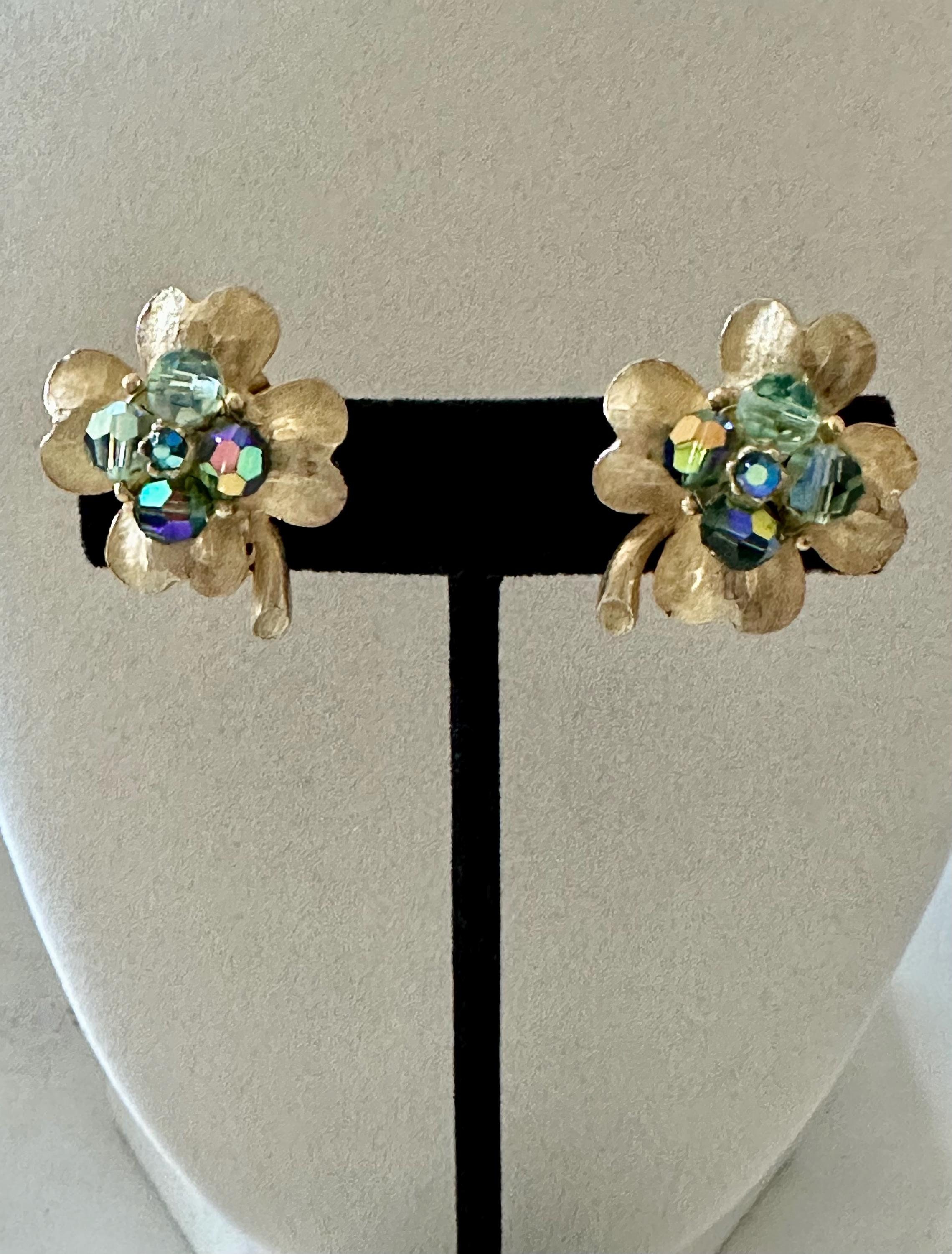 This listing is for a beautiful pair of unsigned vintage earrings. Measuring 1 1/8" high and 1" wide, the brushed gold tone 4-leaf clover design is super bright and is enhanced by AB crystals that take on green and blue hues. The clip backs are secure and they are, overall, in excellent, like new condition. A perfect gift!