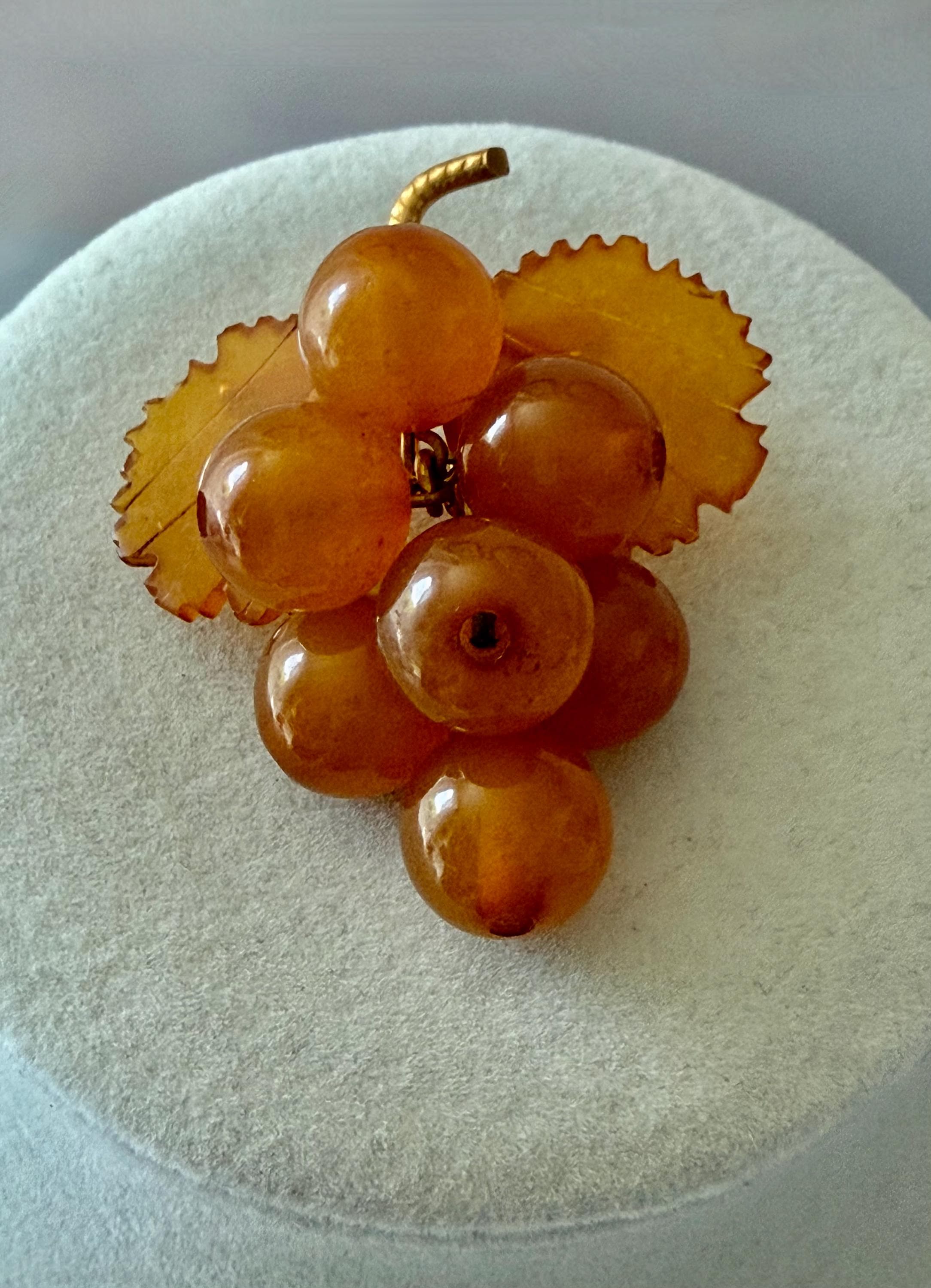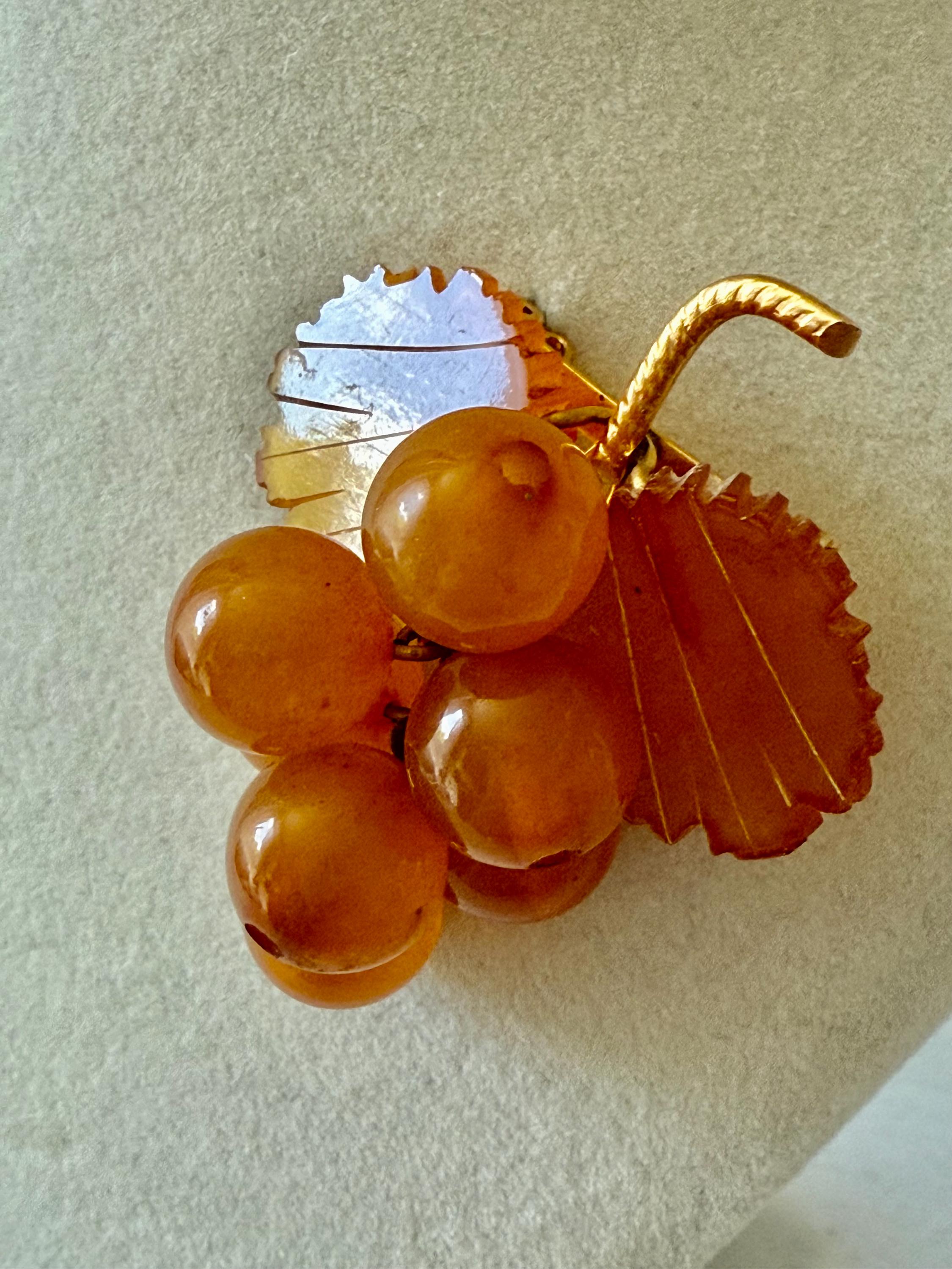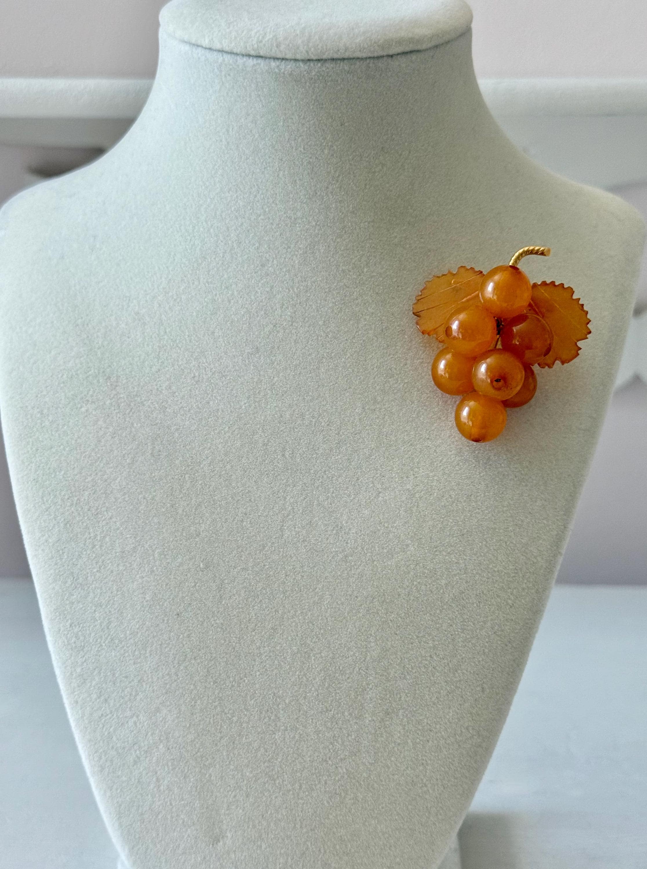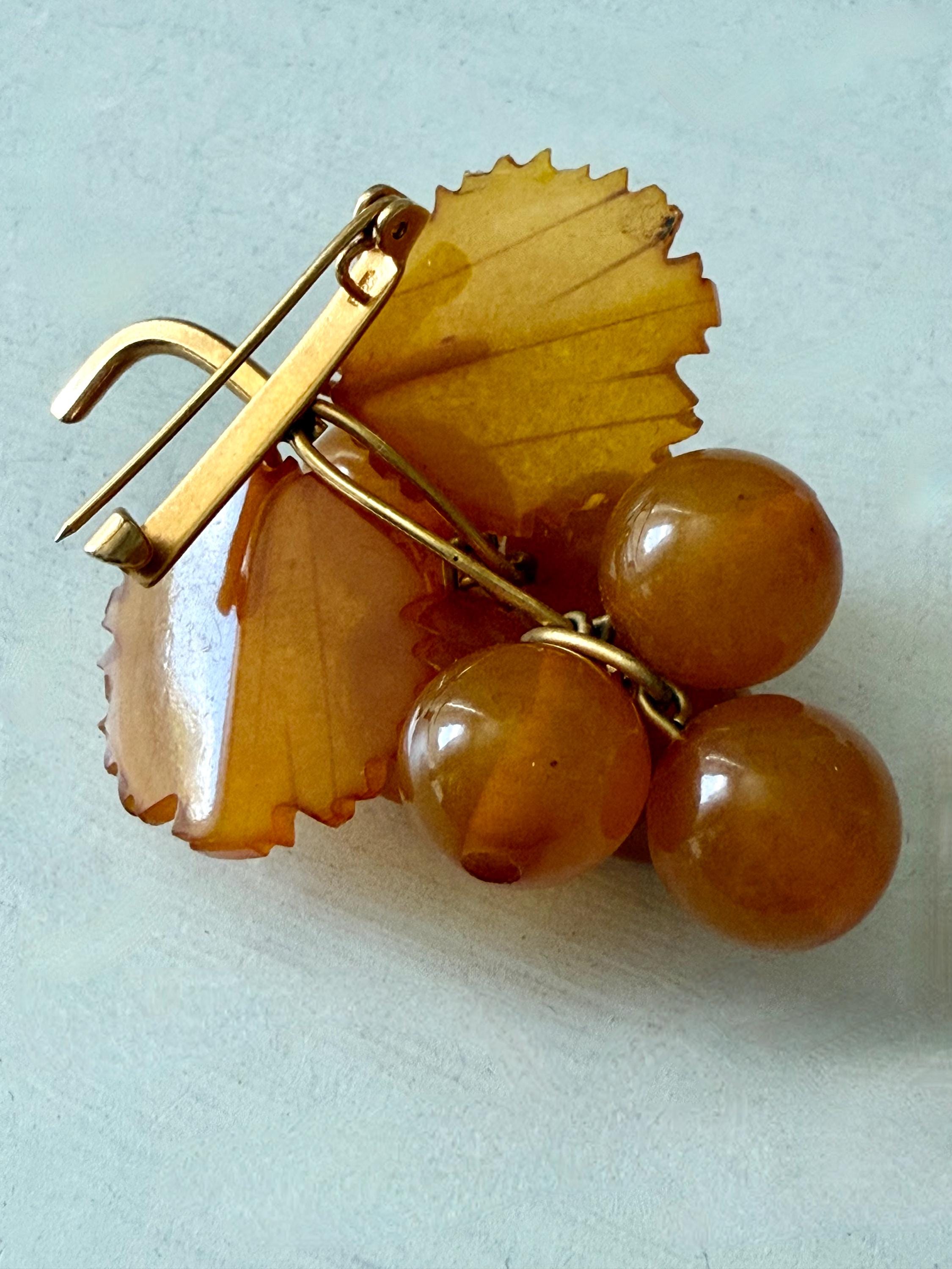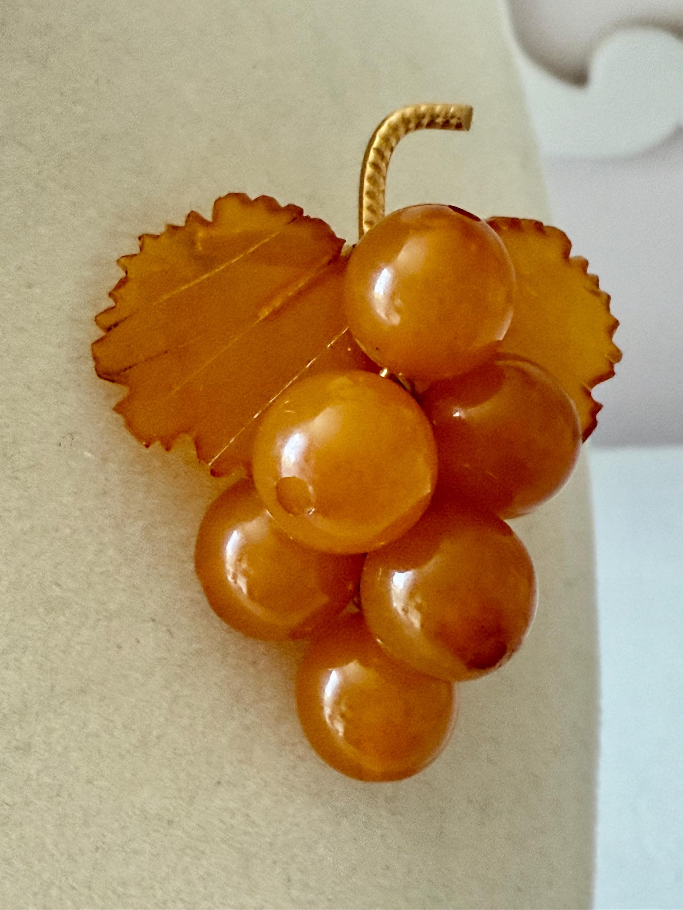 This listing is for a lovely vintage brooch of Baltic amber made in the Kaliningrad Amber Factory in Russia. It is marked but quite difficult to read, but it appears to be marked to indicate a date of 1980. It measures     1 7/8" long and 1 1/2" wide and features seven amber grape beads and two carved amber leaves. The clasp is secure and it is in very good condition. So lovely for your fall wardrobe!