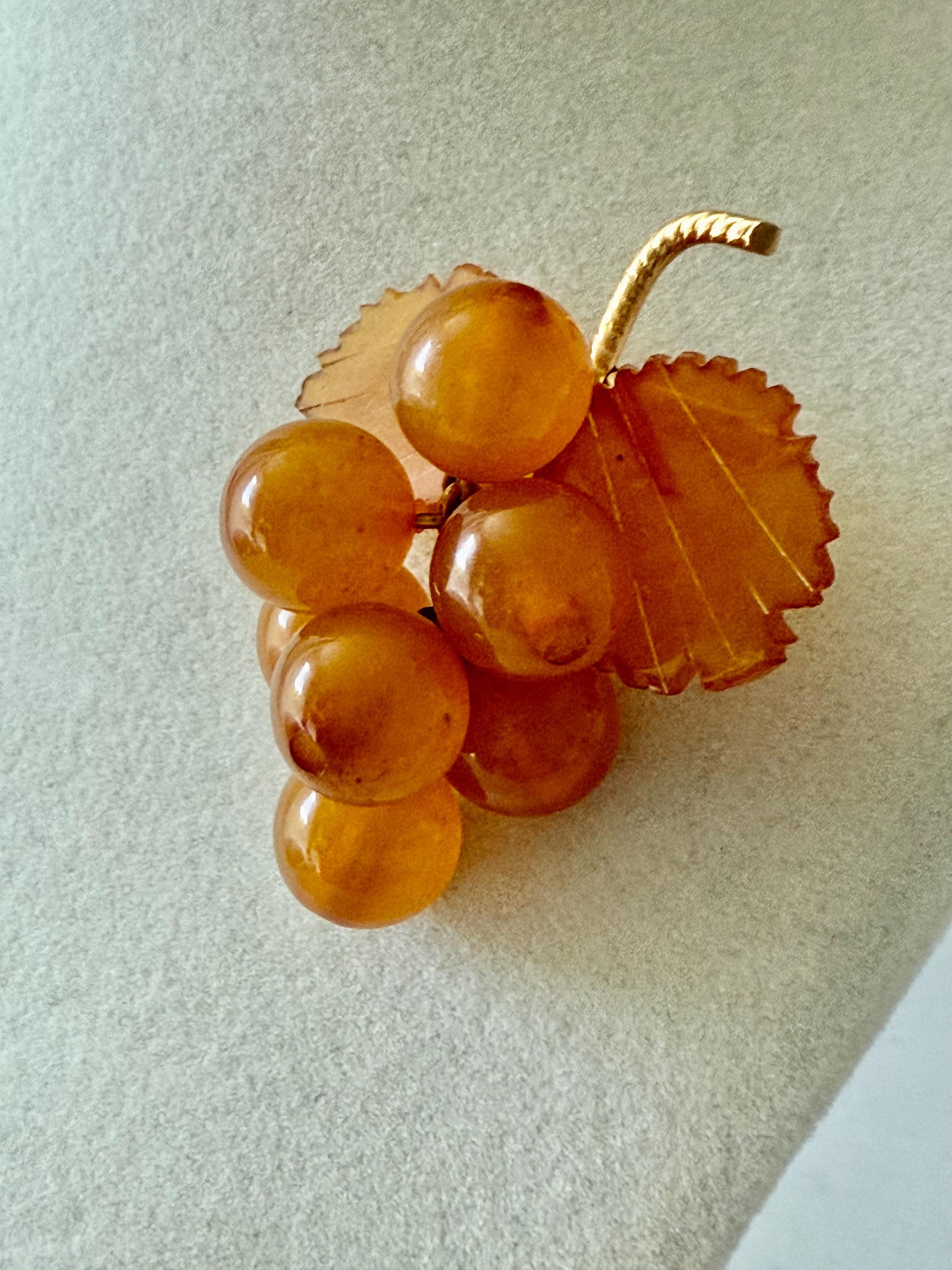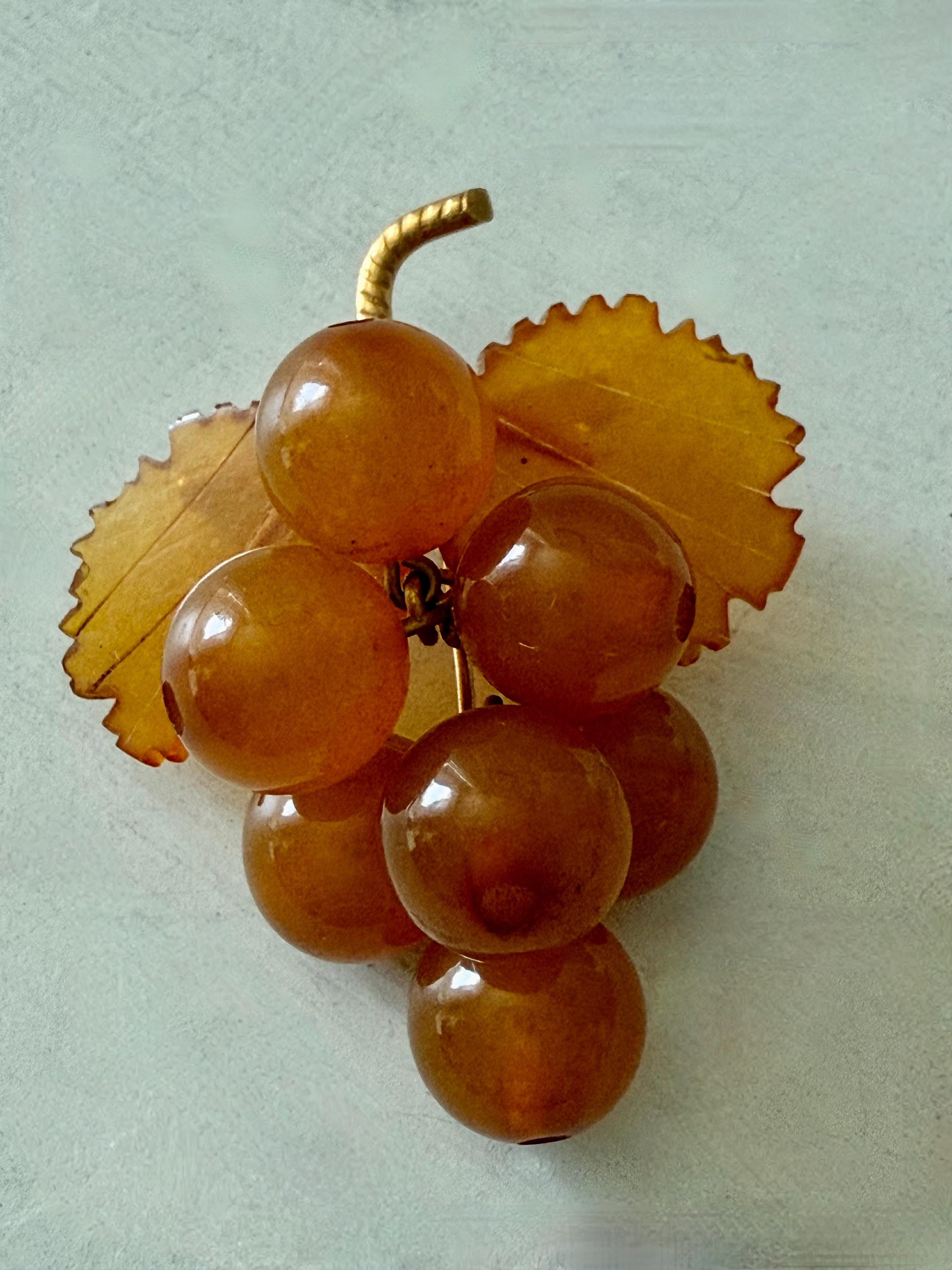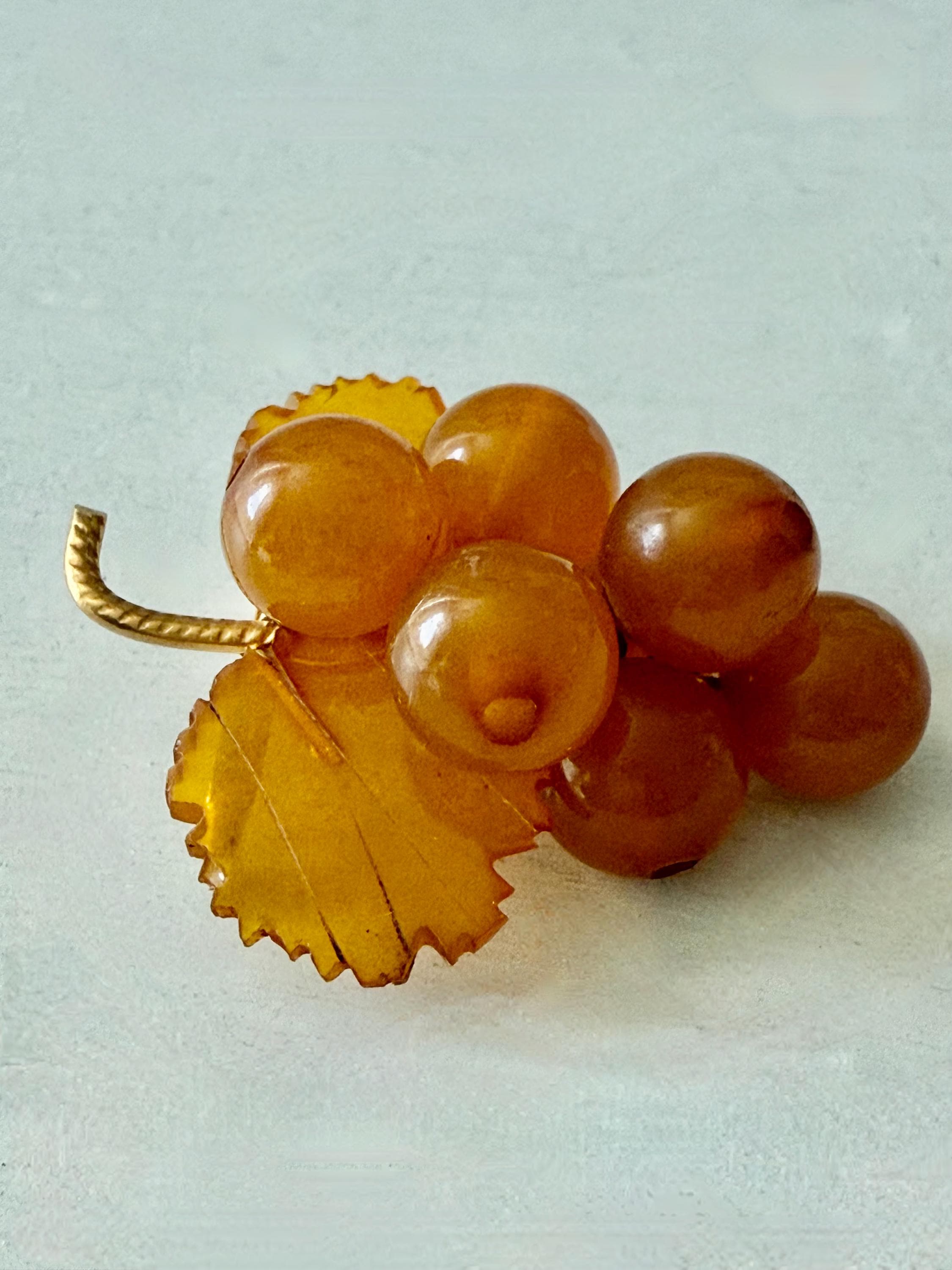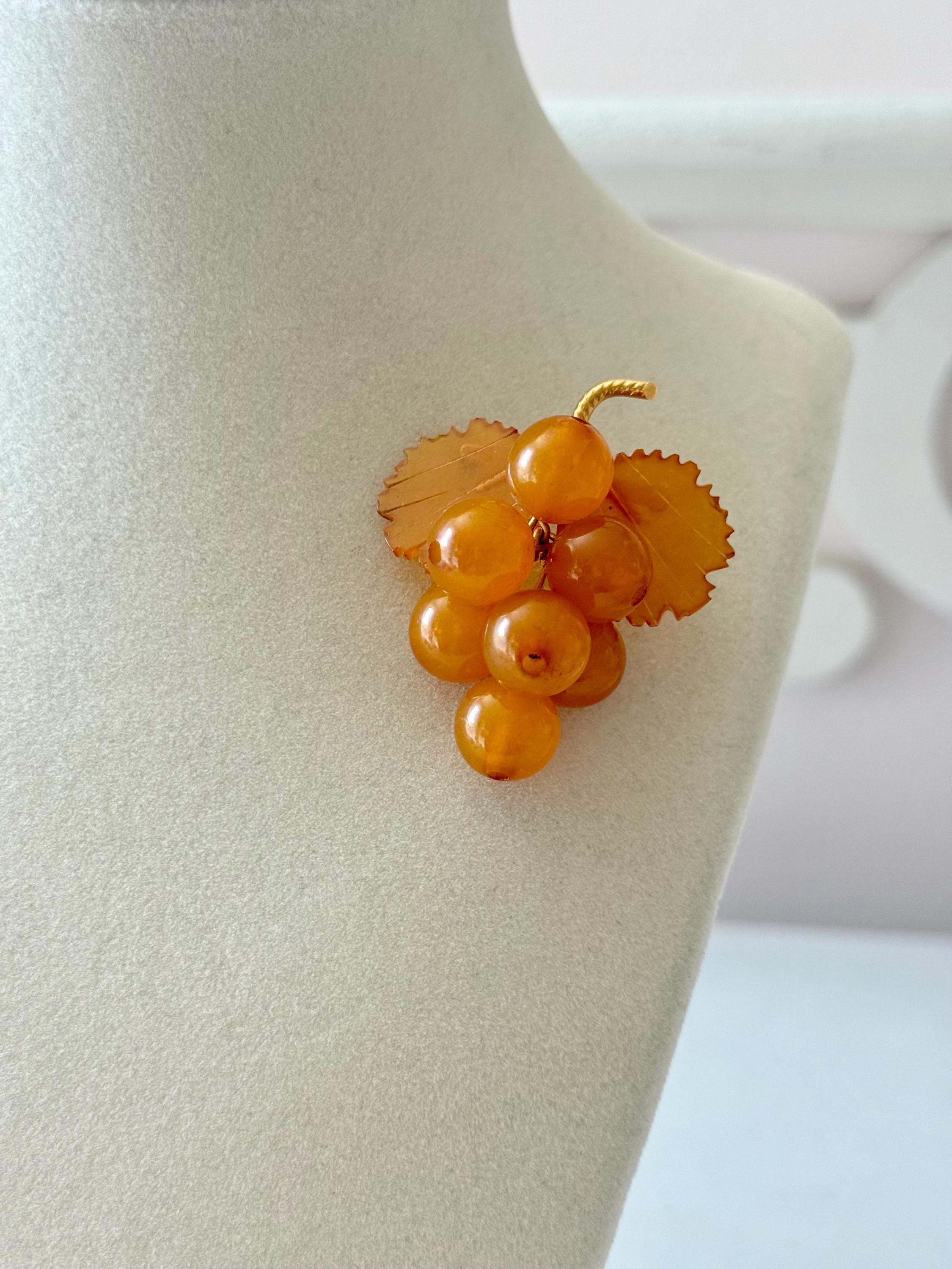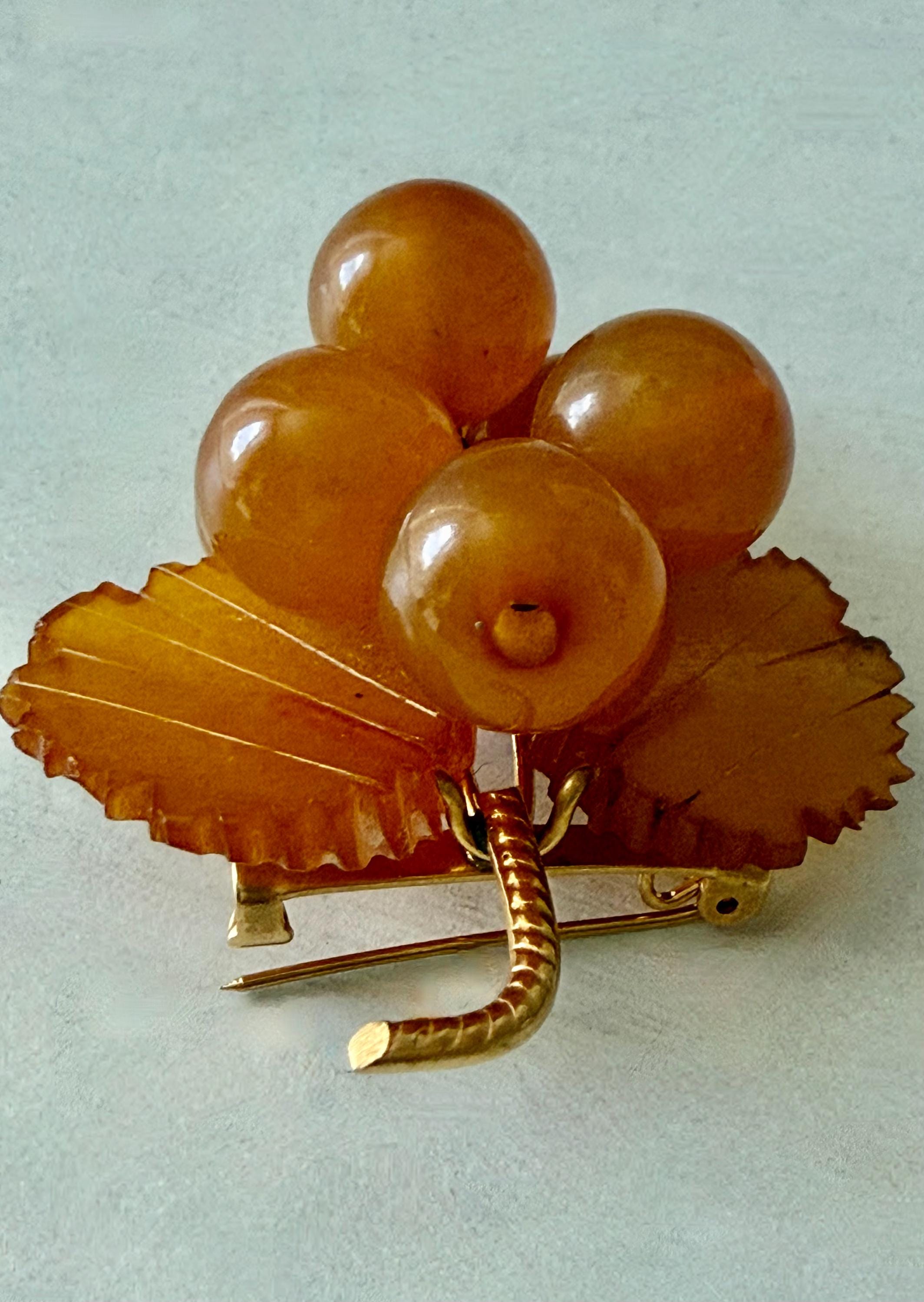 This listing is for a lovely vintage brooch of Baltic amber made in the Kaliningrad Amber Factory in Russia. It is marked but quite difficult to read, but it appears to be marked to indicate a date of 1980. It measures     1 7/8" long and 1 1/2" wide and features seven amber grape beads and two carved amber leaves. The clasp is secure and it is in very good condition. So lovely for your fall wardrobe!