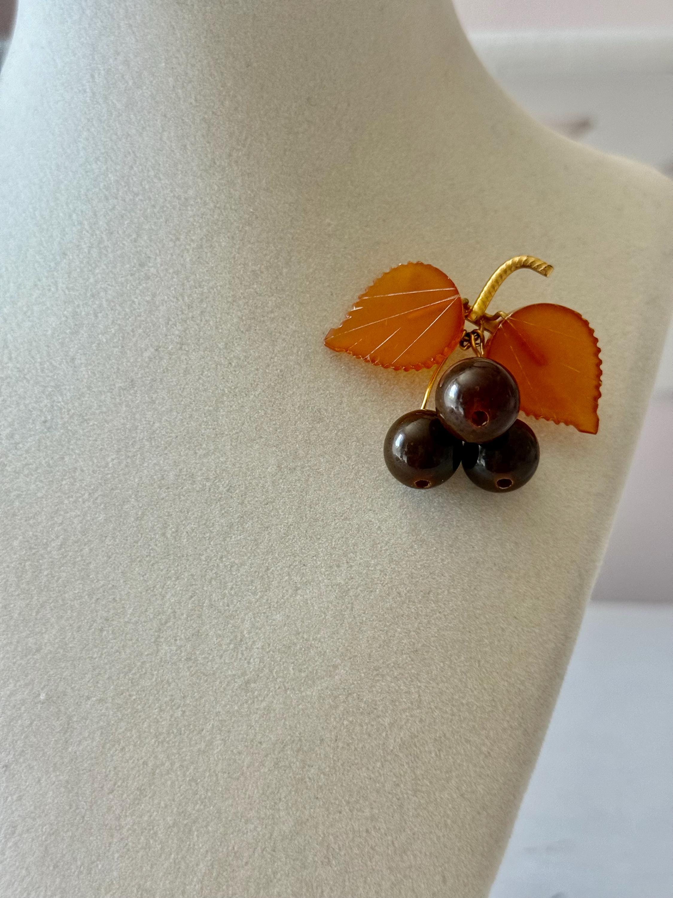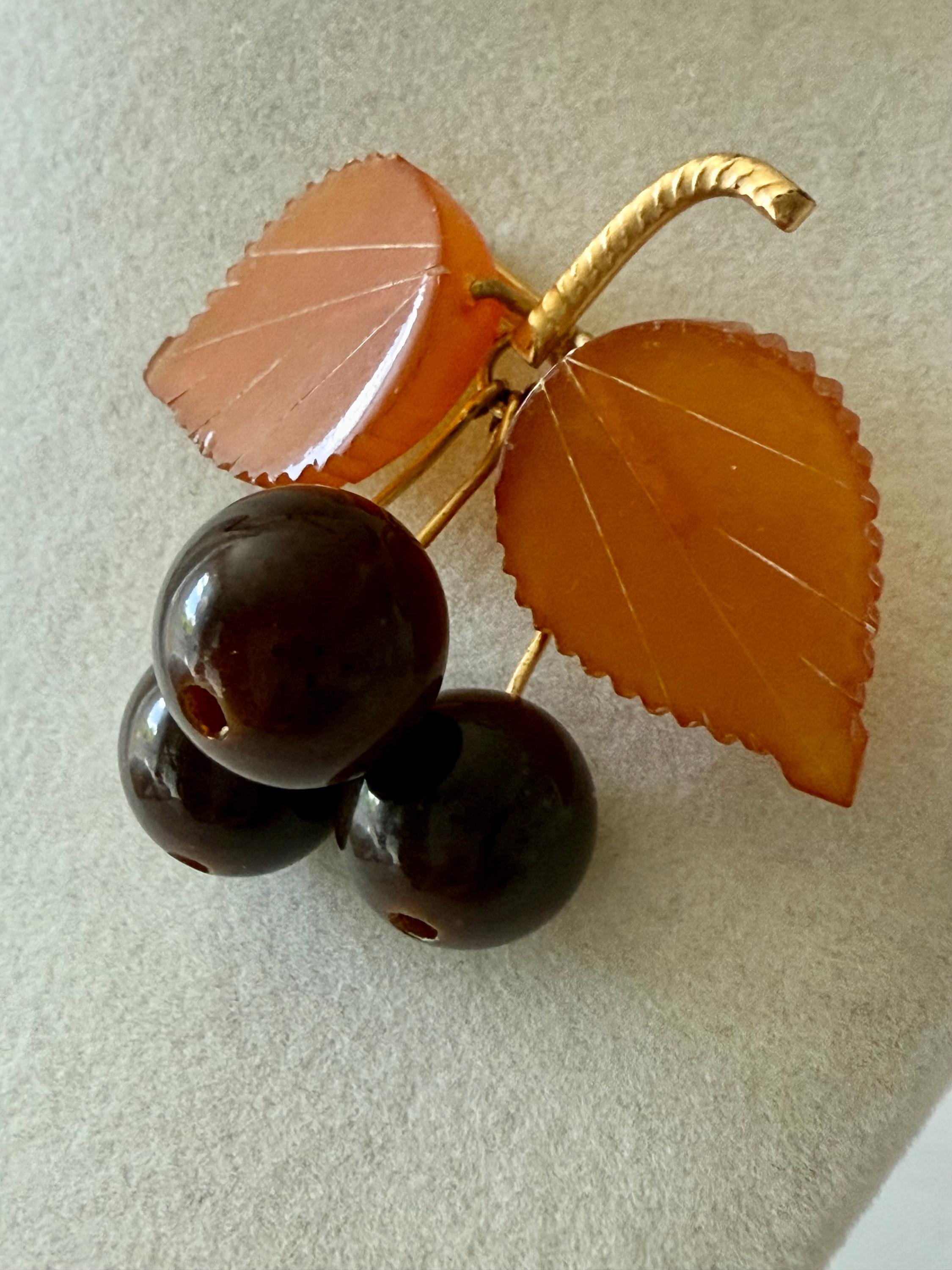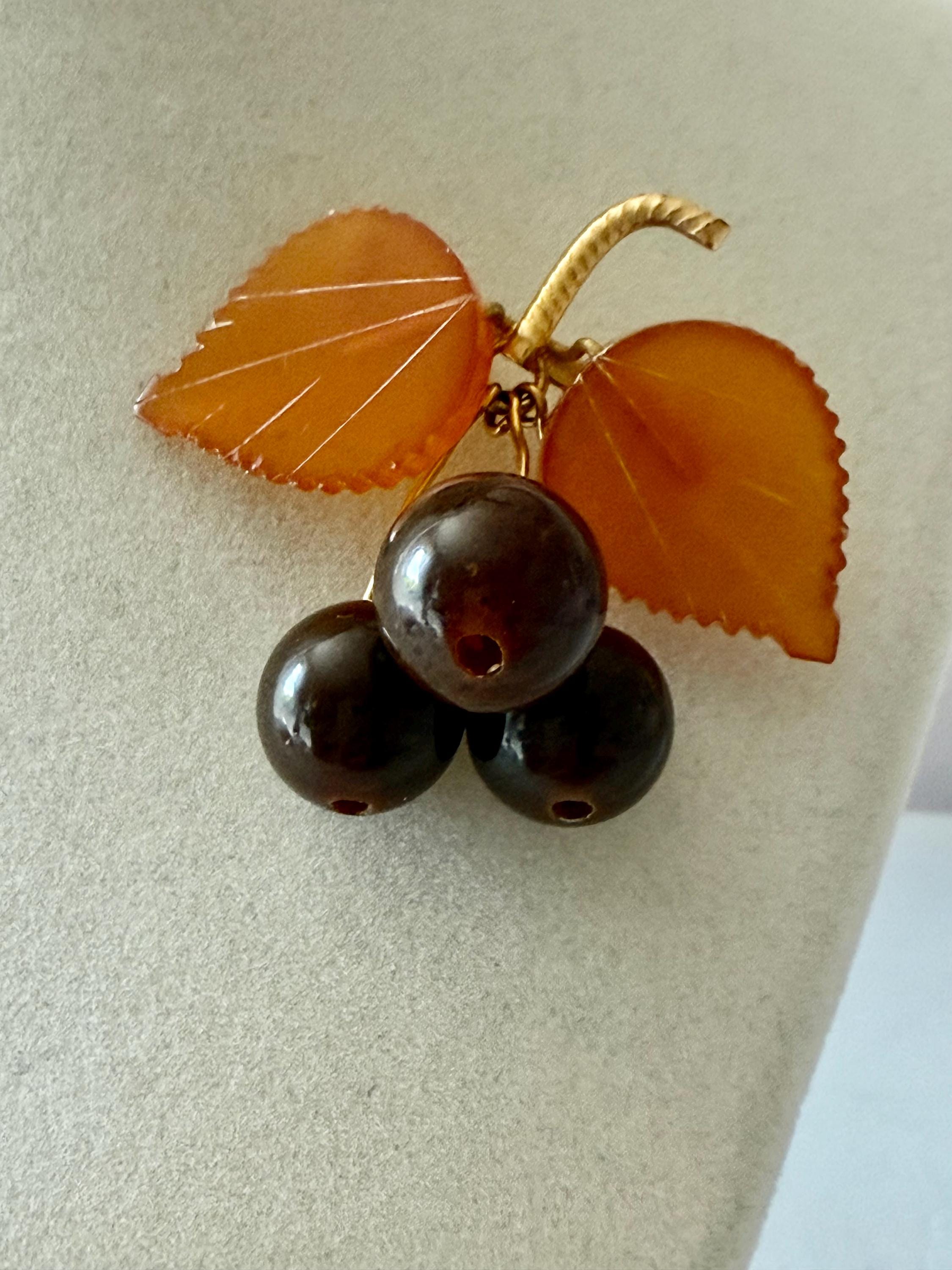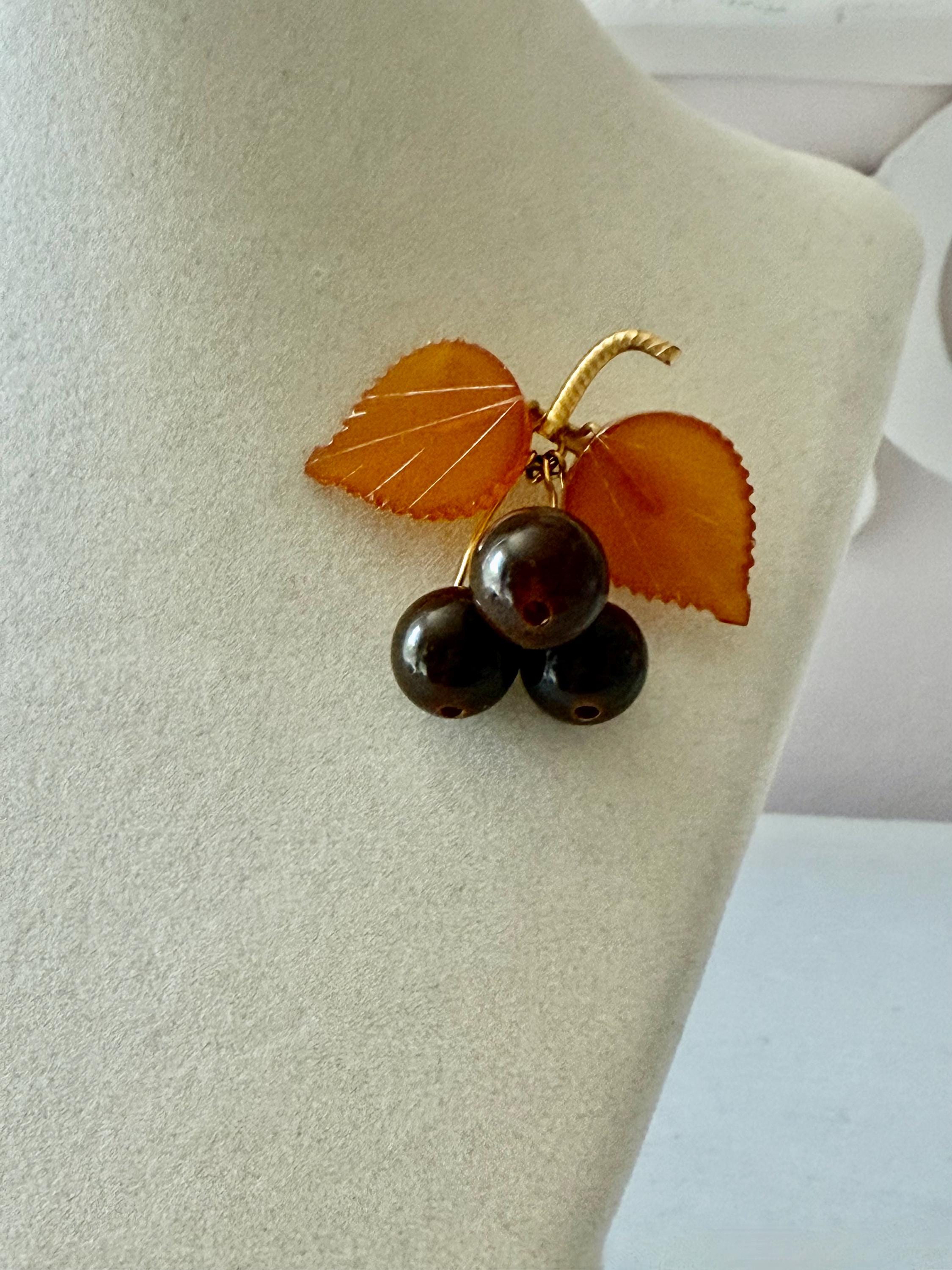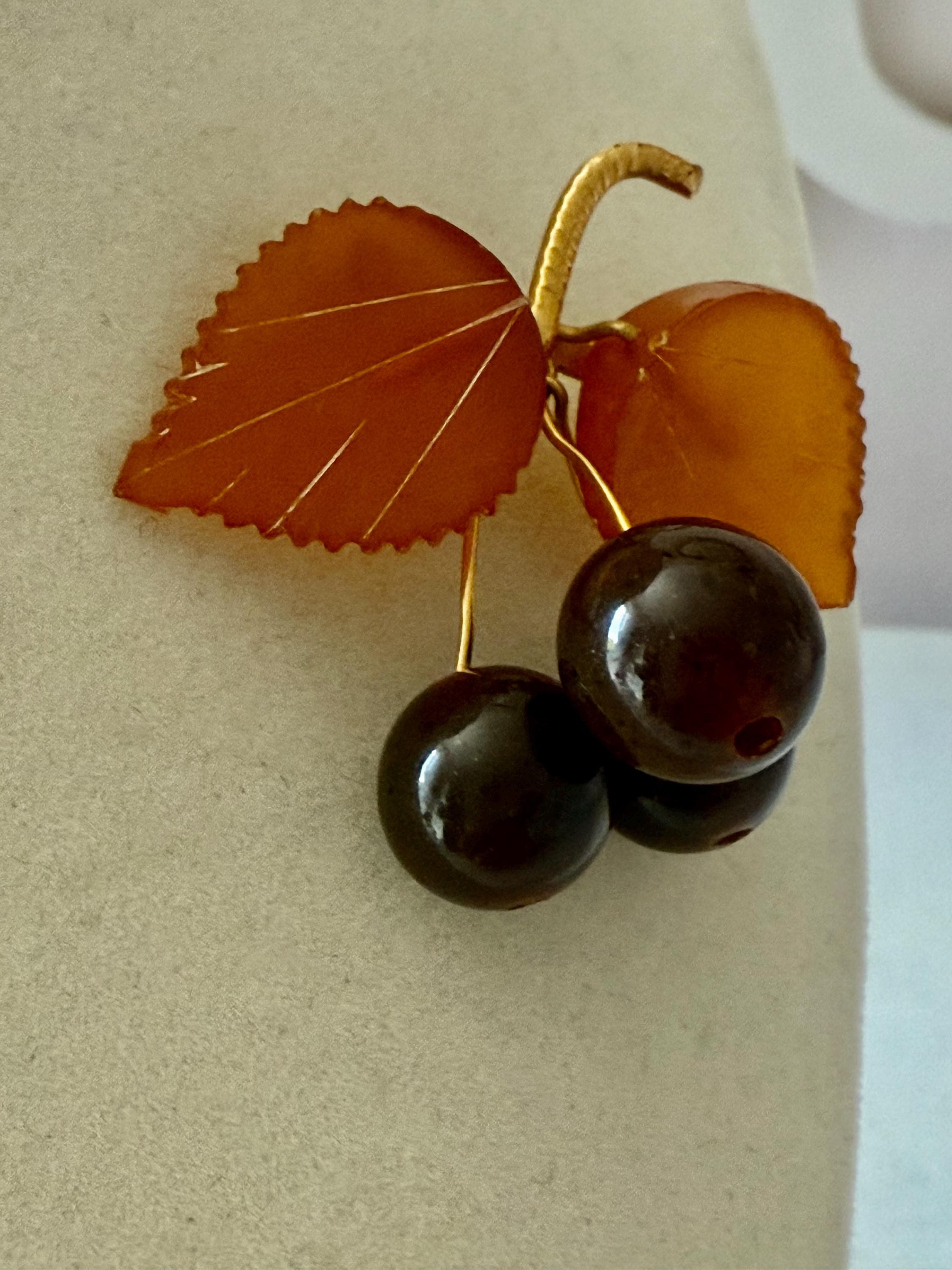 This listing is for a lovely vintage brooch of Baltic amber made in the Kaliningrad Amber Factory in Russia in 1964. It measures 1 3/4" long and 1 3/4" wide and features three cognac amber cherries and two carved honey amber leaves. The clasp is secure and it is in very good condition. So lovely for your fall wardrobe!