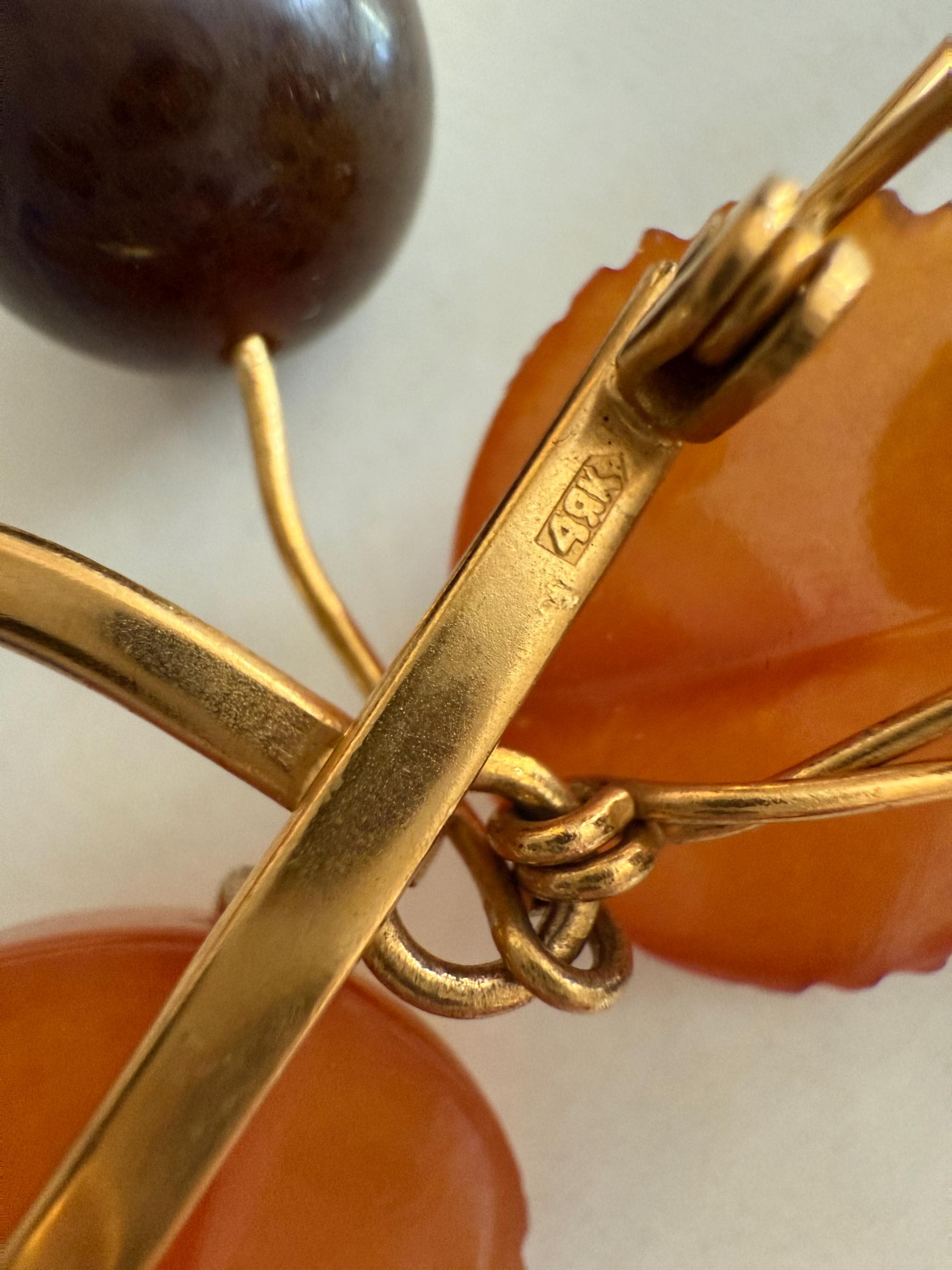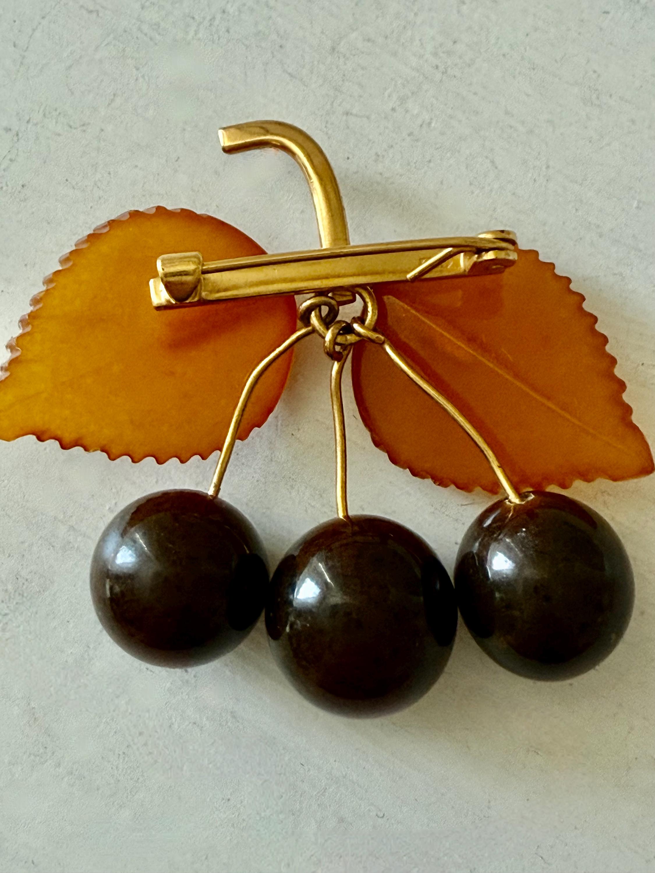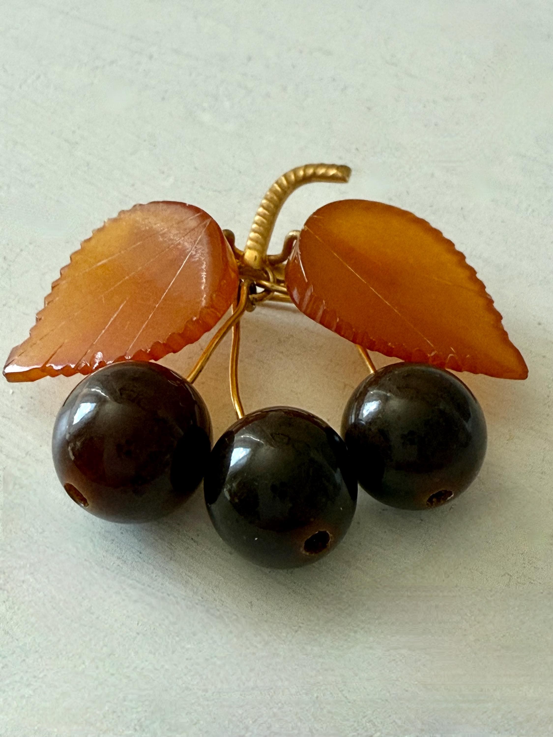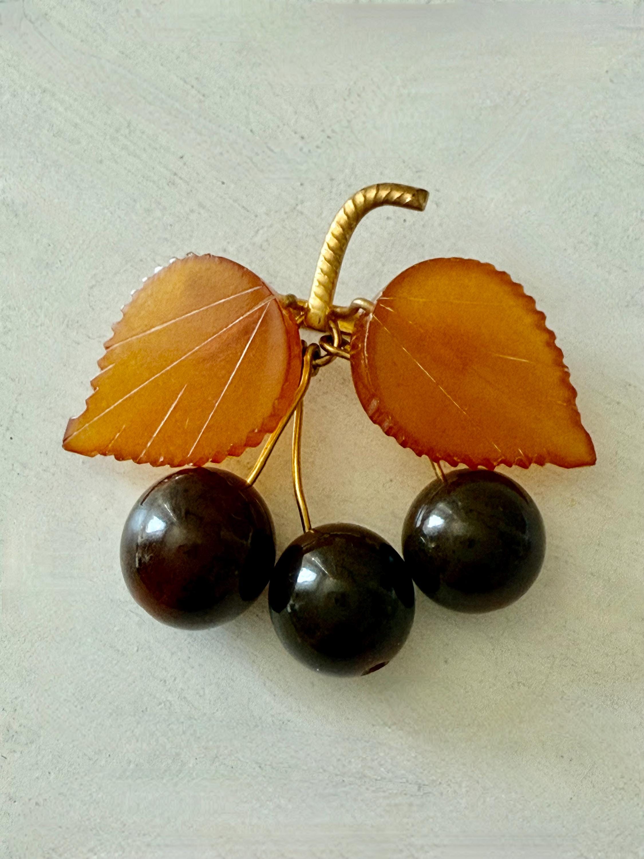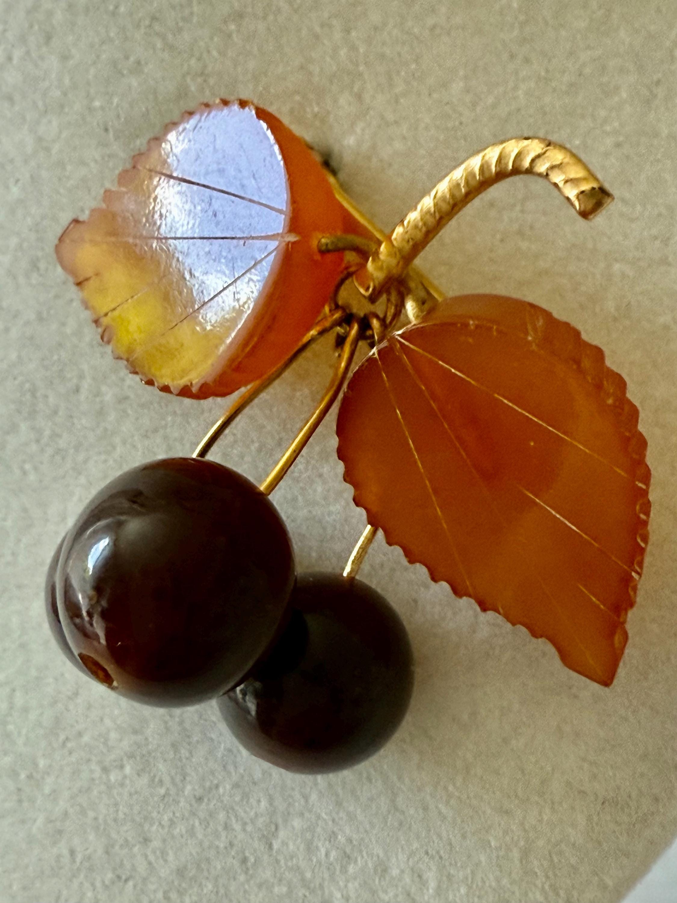 This listing is for a lovely vintage brooch of Baltic amber made in the Kaliningrad Amber Factory in Russia in 1964. It measures 1 3/4" long and 1 3/4" wide and features three cognac amber cherries and two carved honey amber leaves. The clasp is secure and it is in very good condition. So lovely for your fall wardrobe!