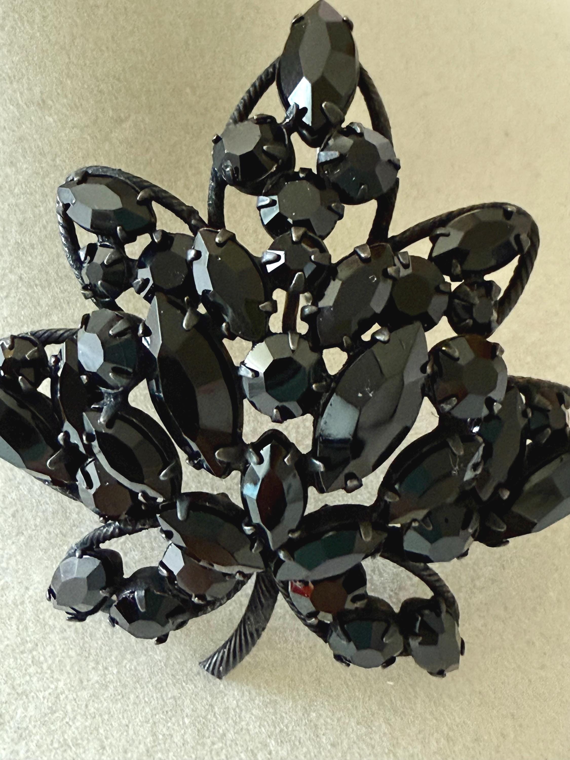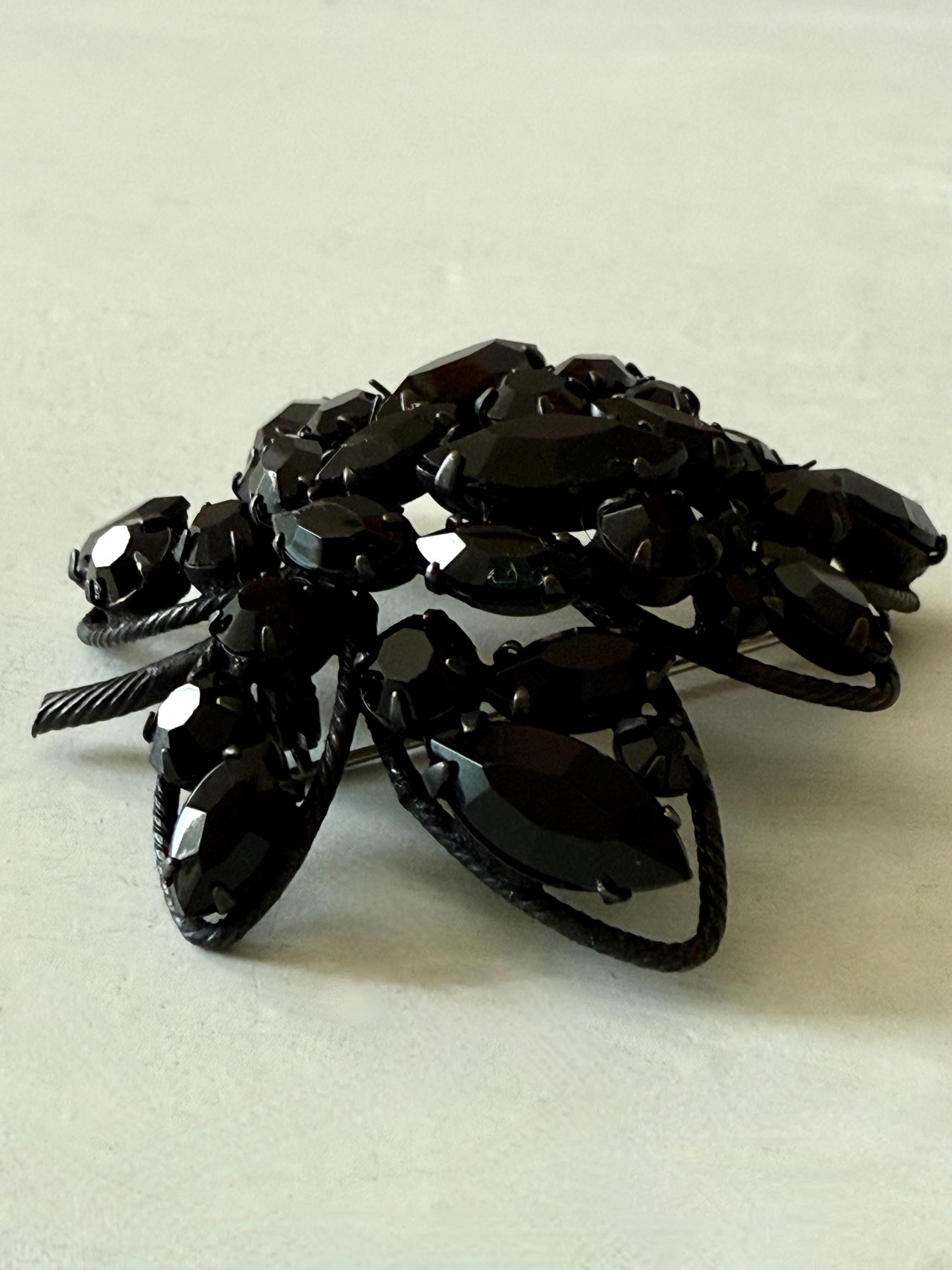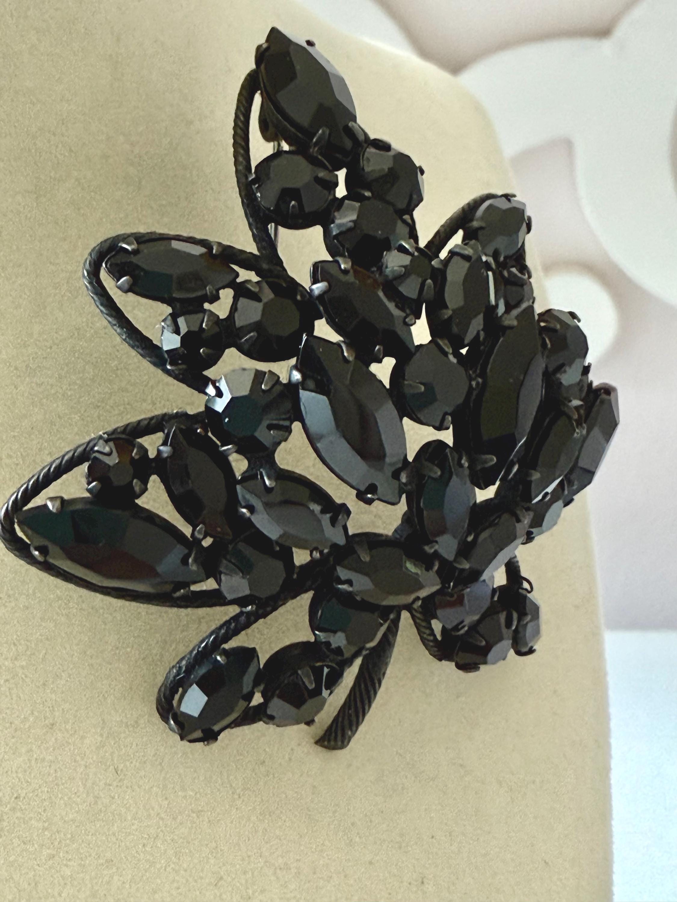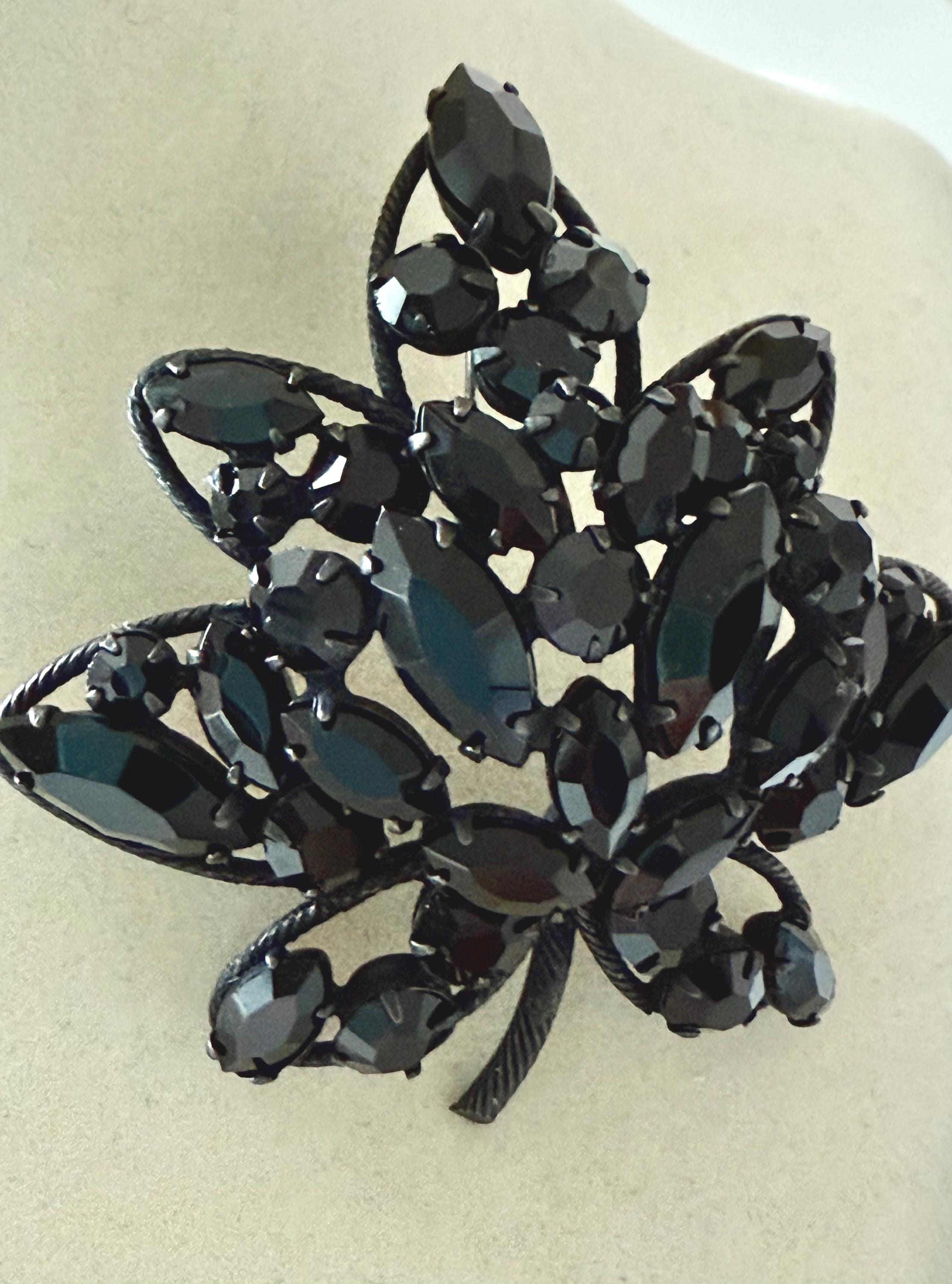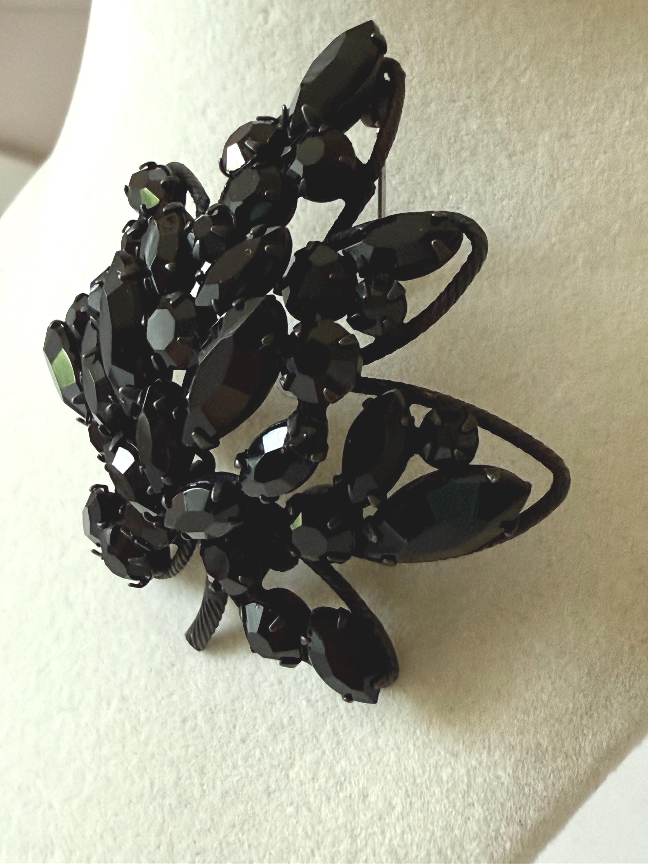 This listing is for a beautiful brooch by Regency Jewels. The highly domed, japanned metal brooch measures 2 1/4"" wide and 2 1/2" high and features sparkling black marquise and round stones. The clasp is secure, all stones are intact, and it is in excellent condition. Please note that there are complementary Regency earrings on my site as well.