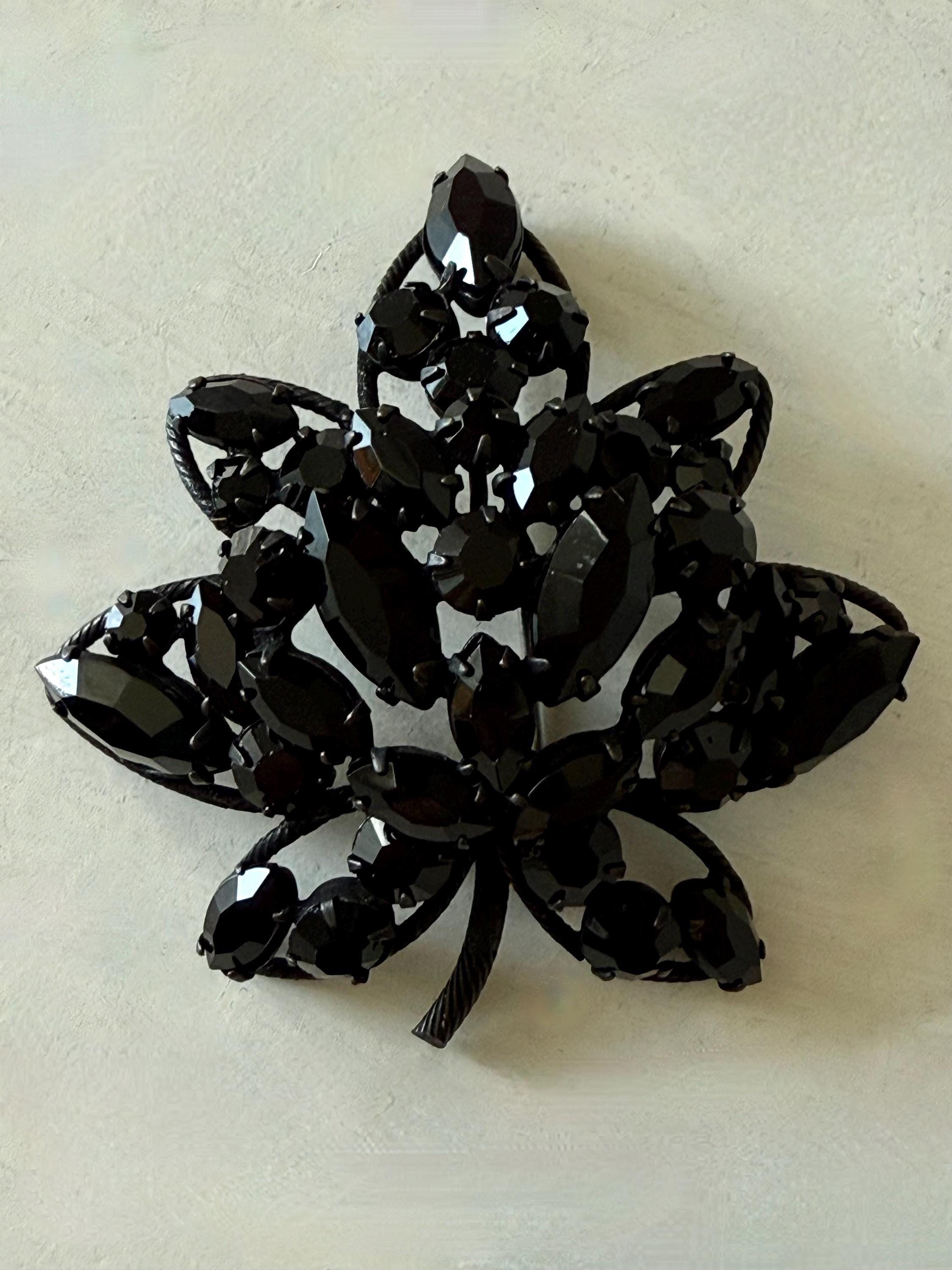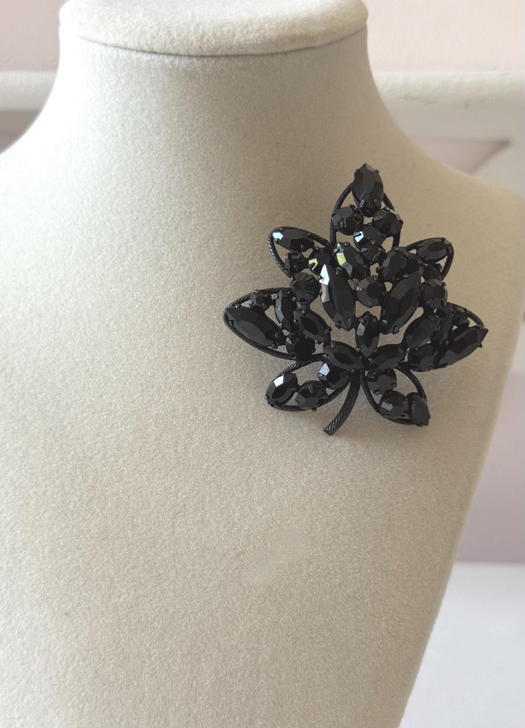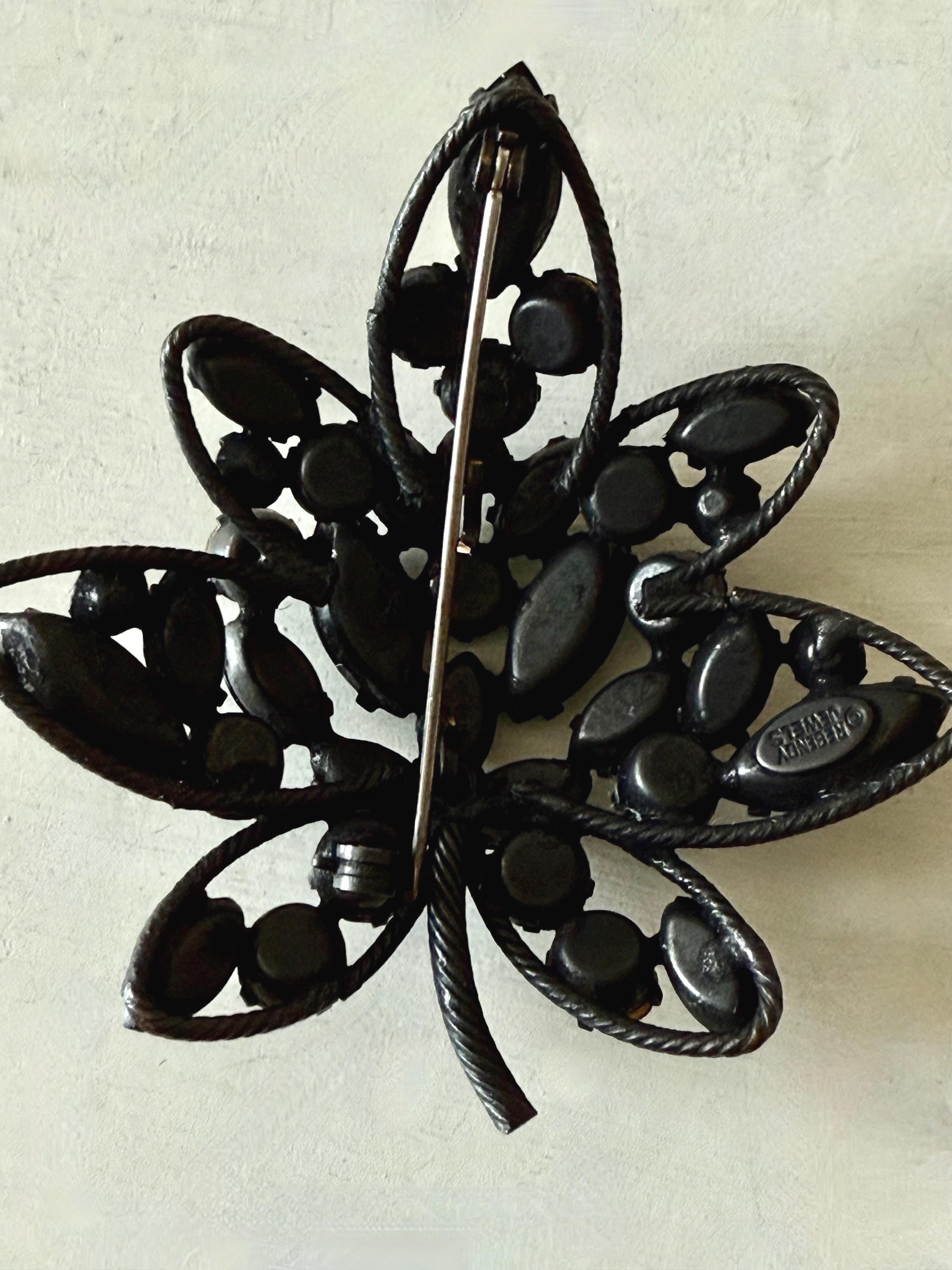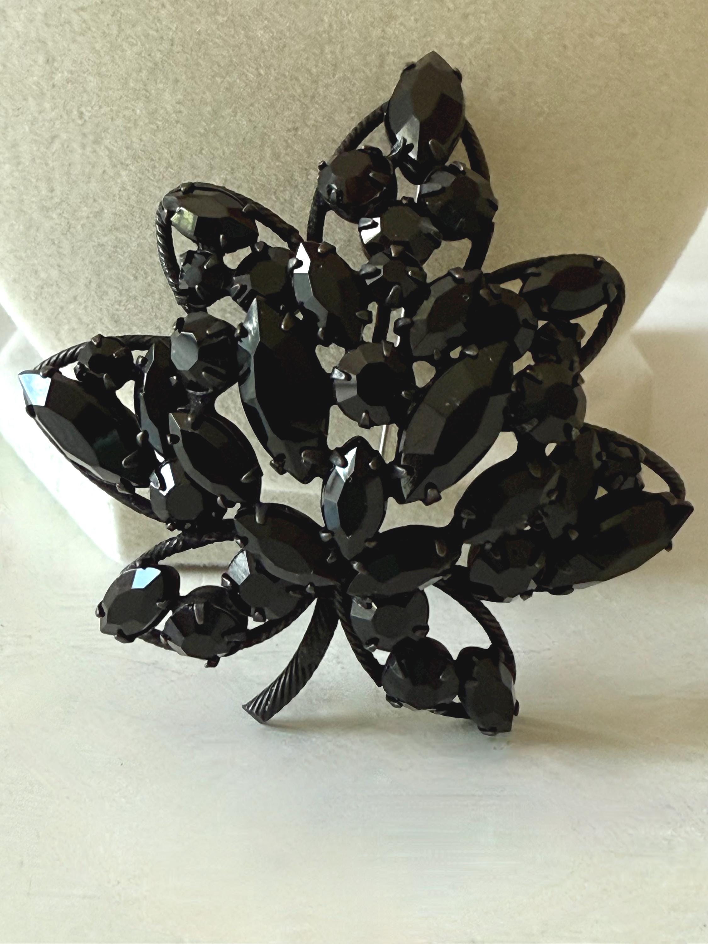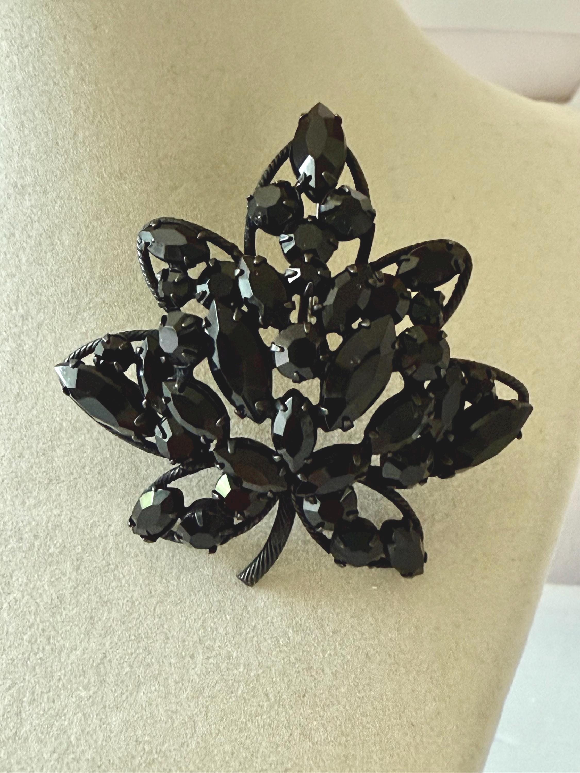 This listing is for a beautiful brooch by Regency Jewels. The highly domed, japanned metal brooch measures 2 1/4"" wide and 2 1/2" high and features sparkling black marquise and round stones. The clasp is secure, all stones are intact, and it is in excellent condition. Please note that there are complementary Regency earrings on my site as well.