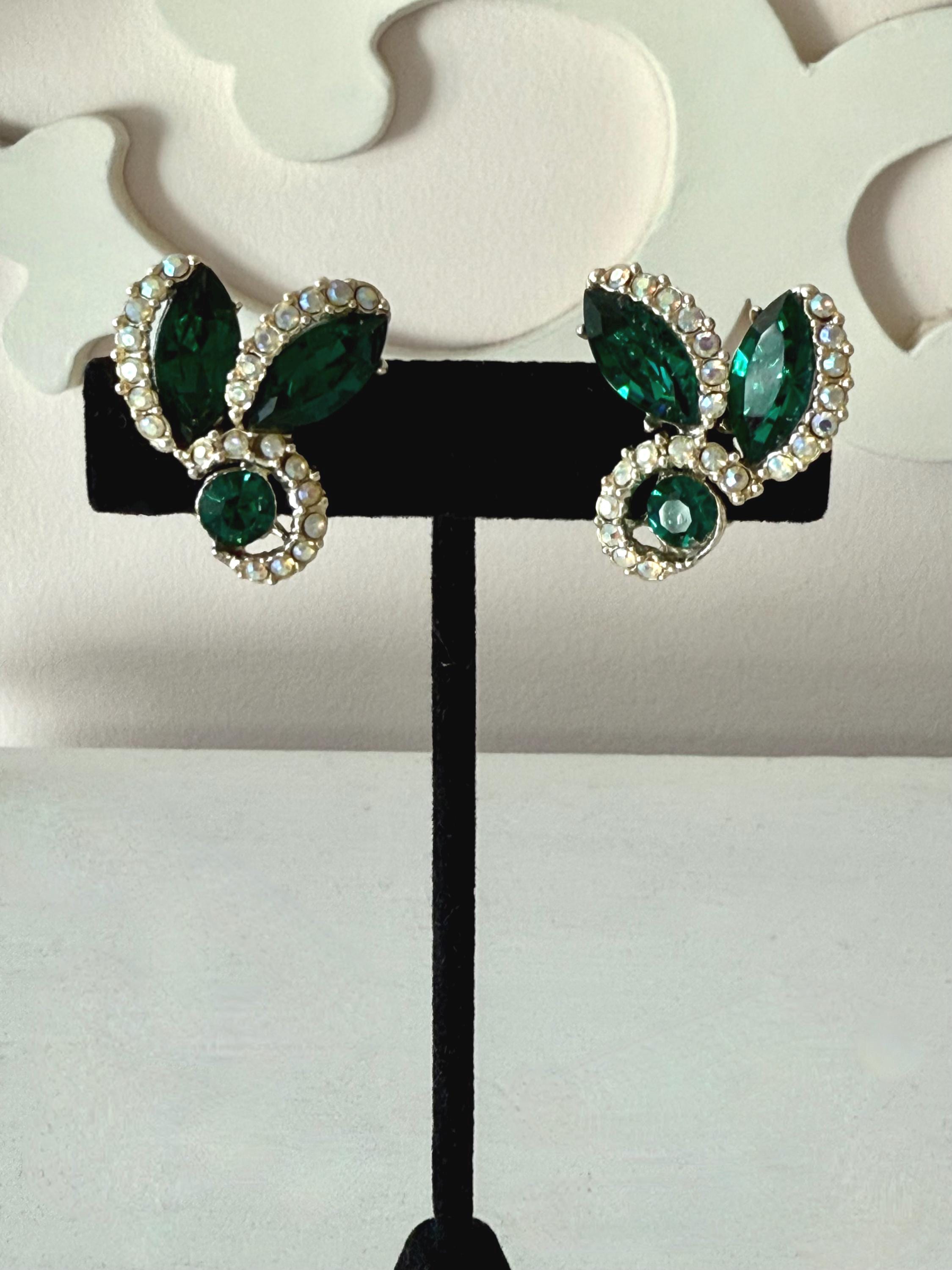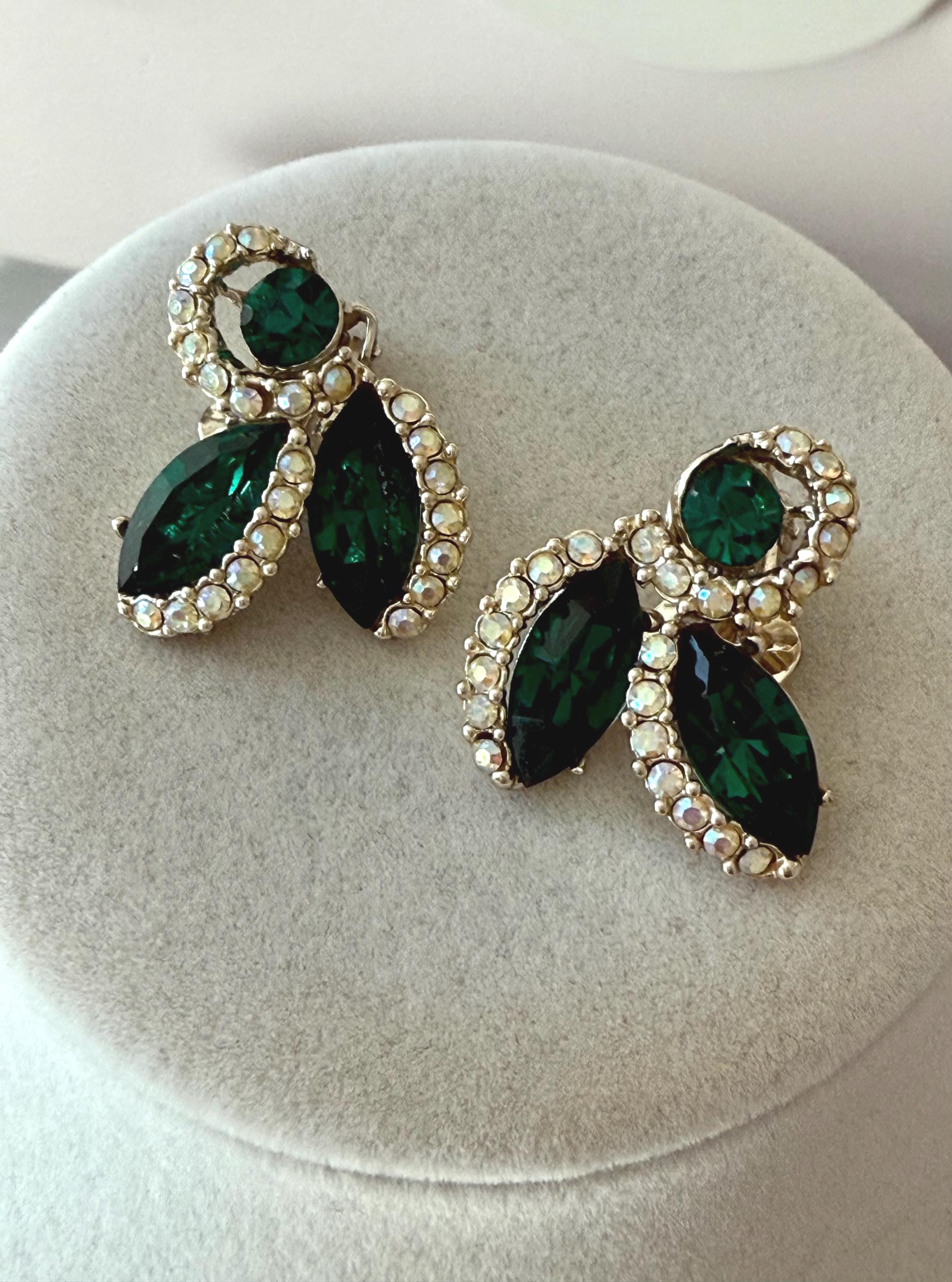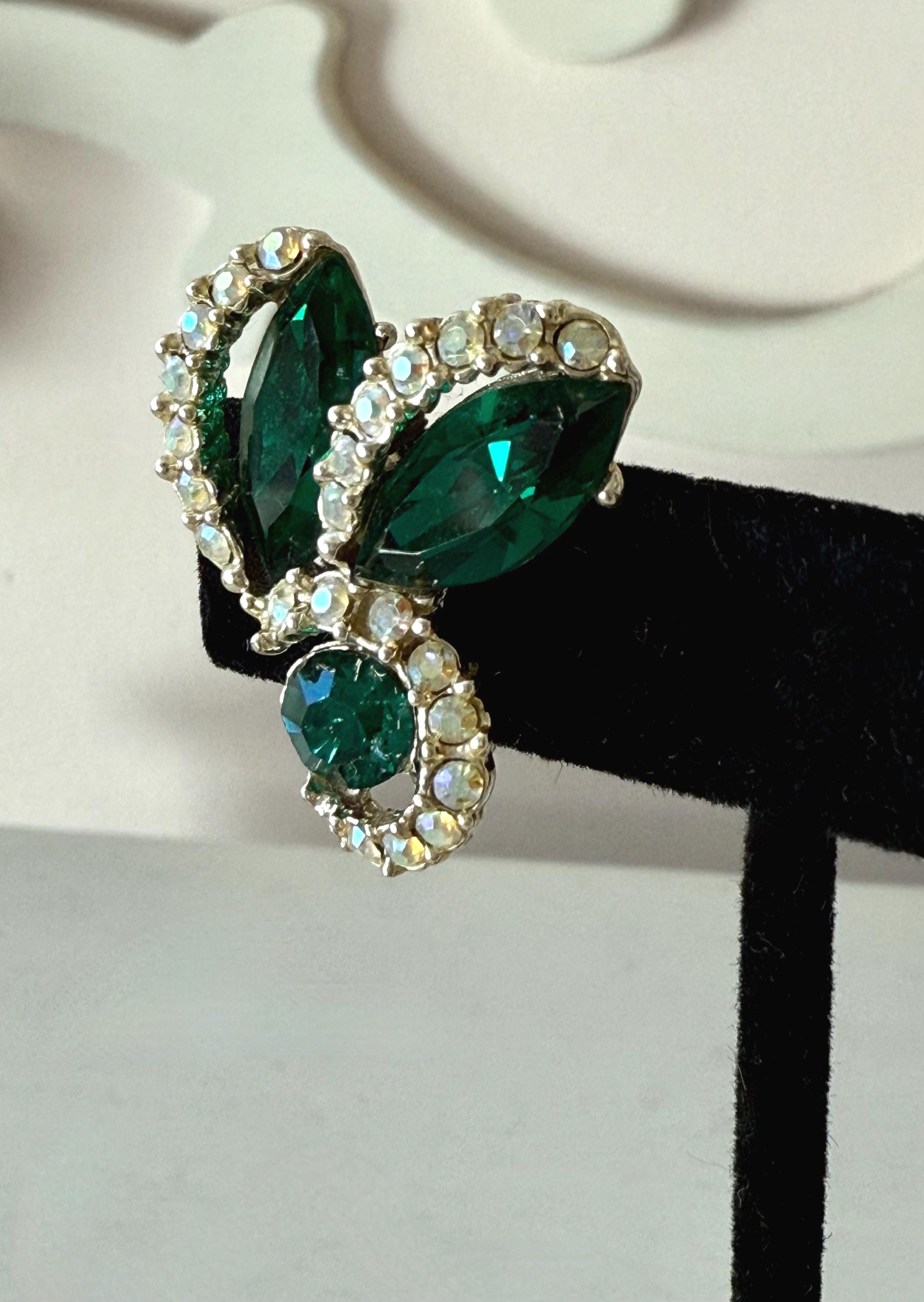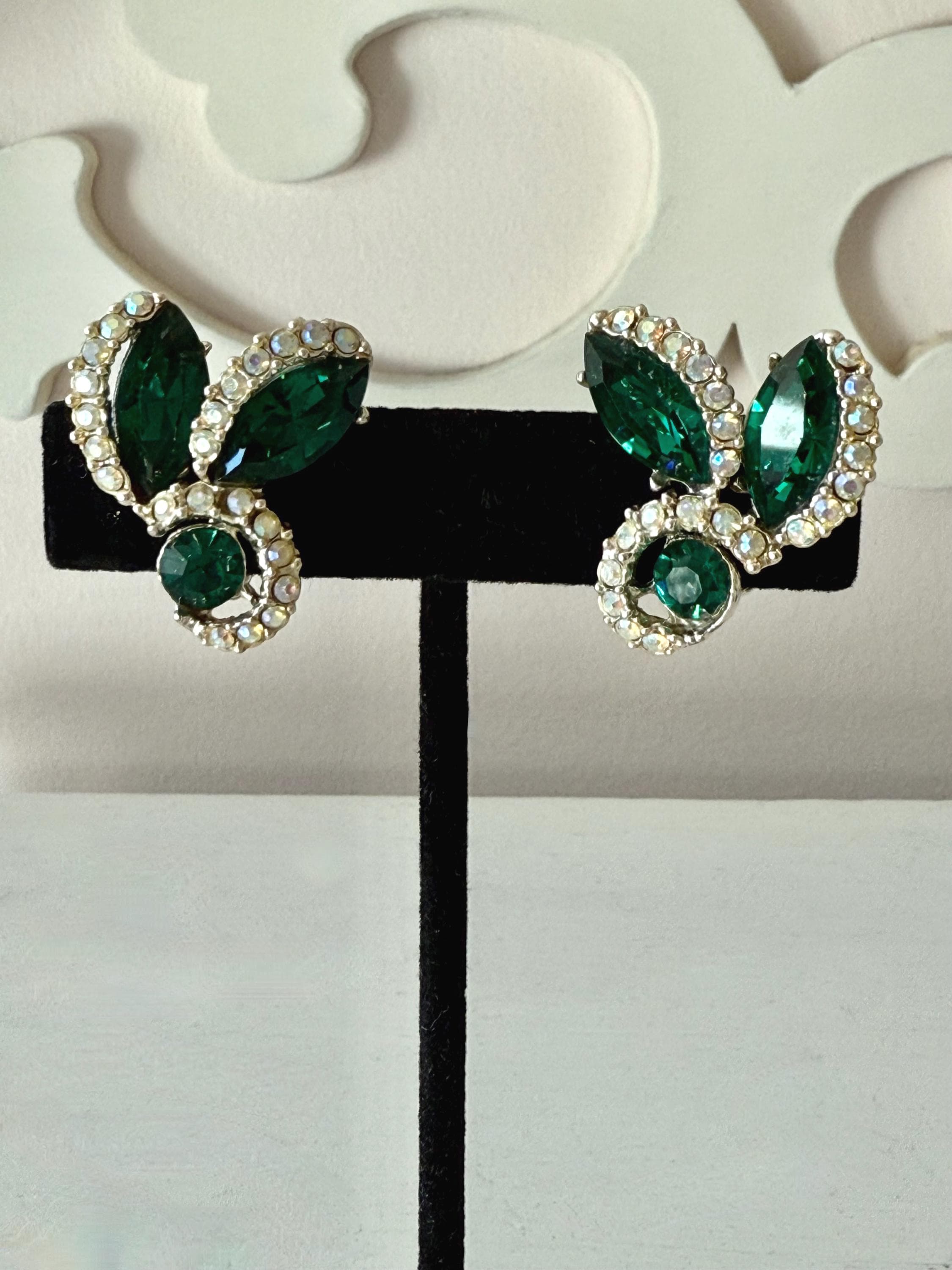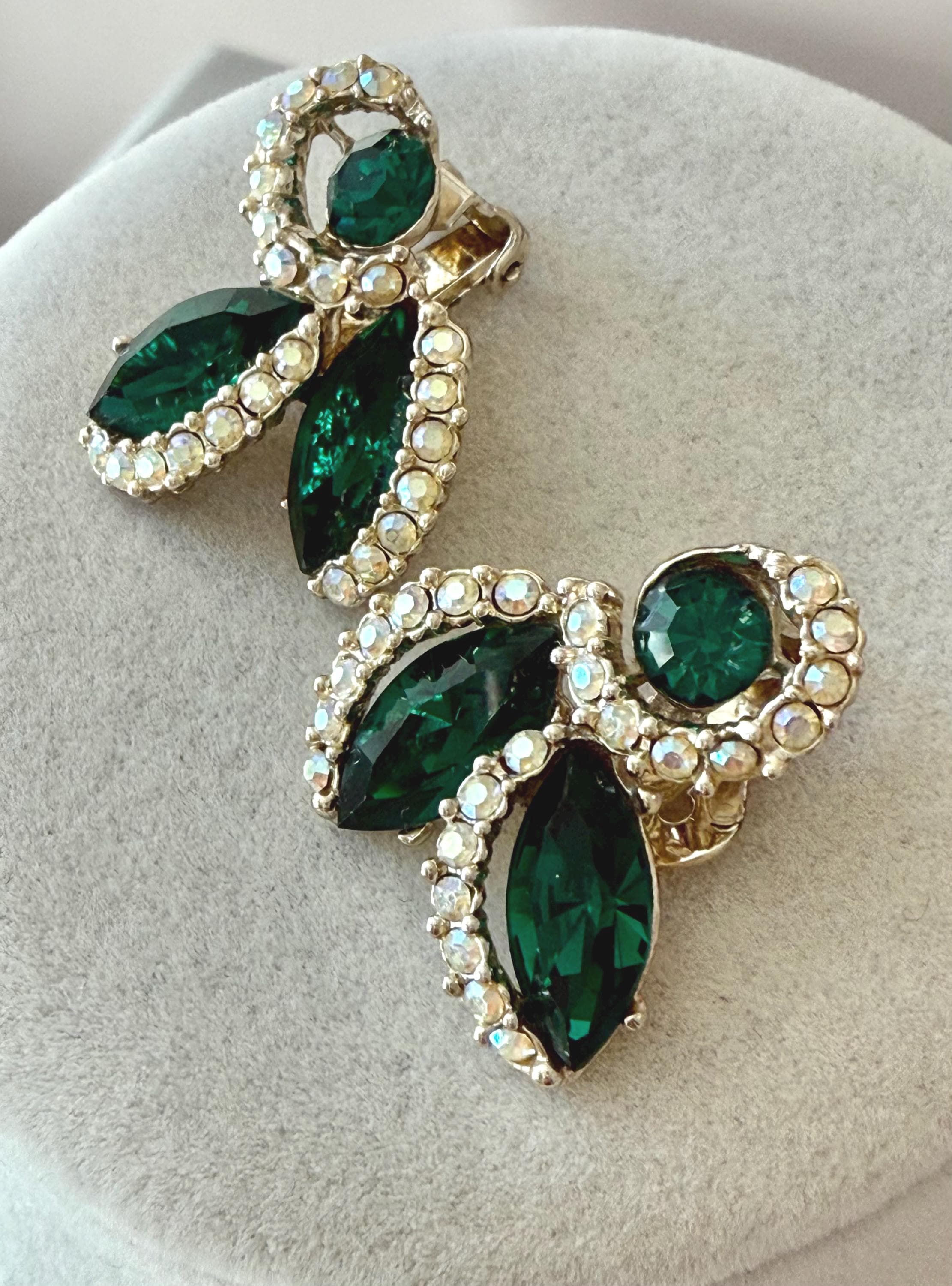 This listing is for a gorgeous pair of vintage earrings from Bogoff. Measuring 1 1/8" high and 7/8" wide, the silver tone earrings feature two large emerald green marquise and one round stone surrounded by tiny, sparkling AB stones. The curvy design and brilliance of the stones make these a showstopper! All stones are intact, the clip backs are secure and comfortable, and they are, overall, in excellent, like new condition.