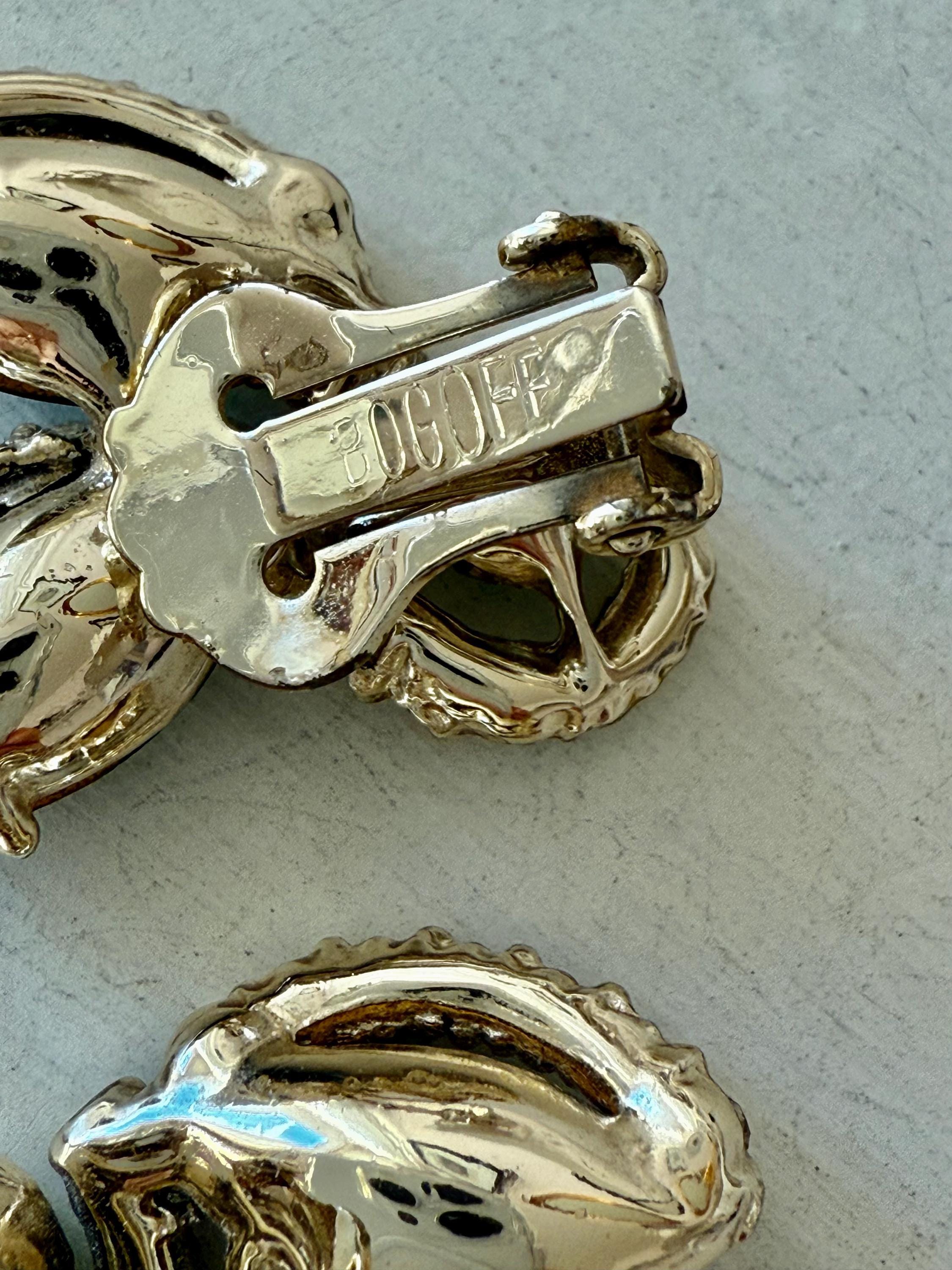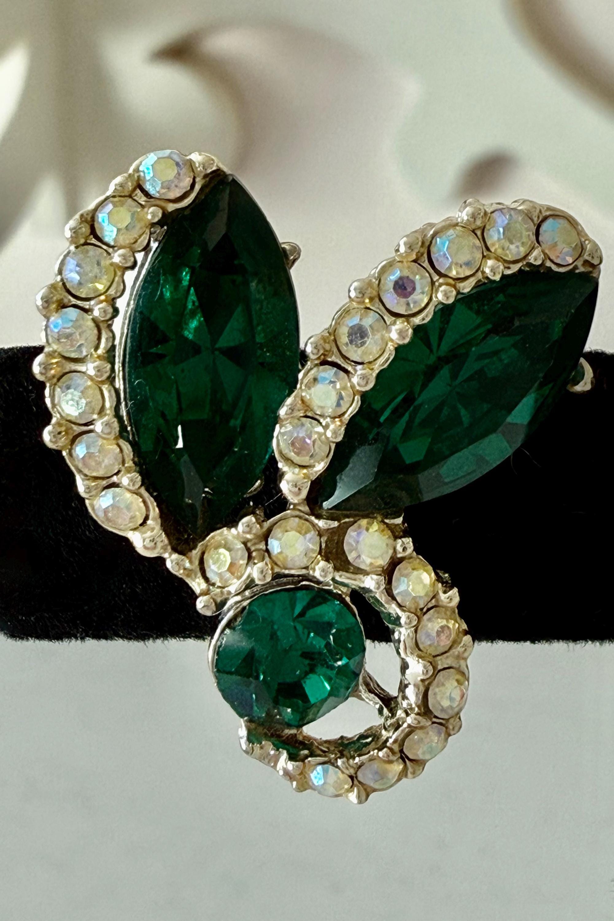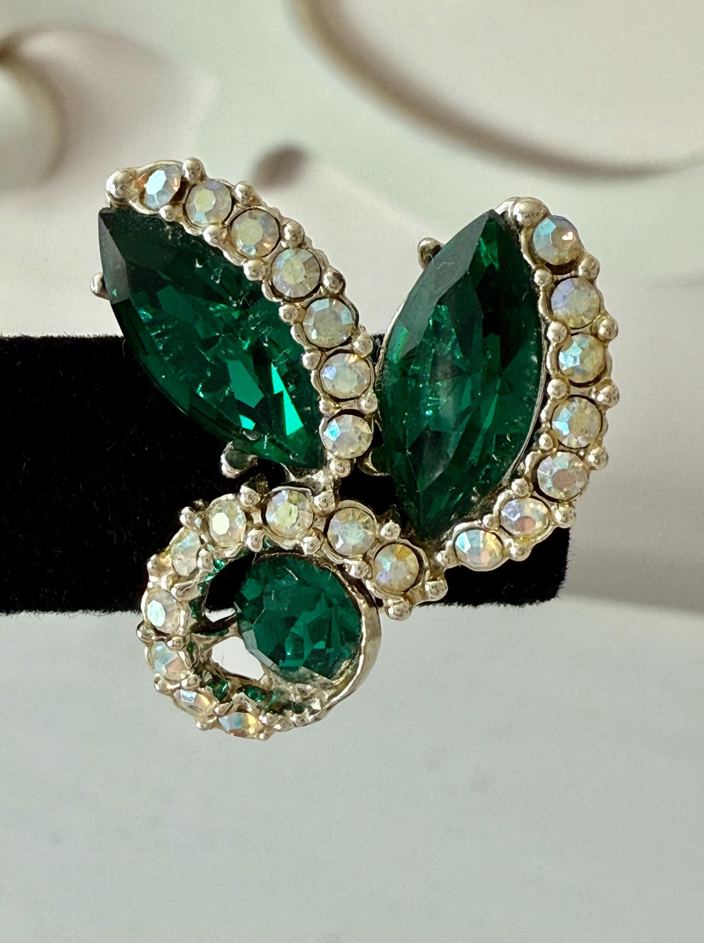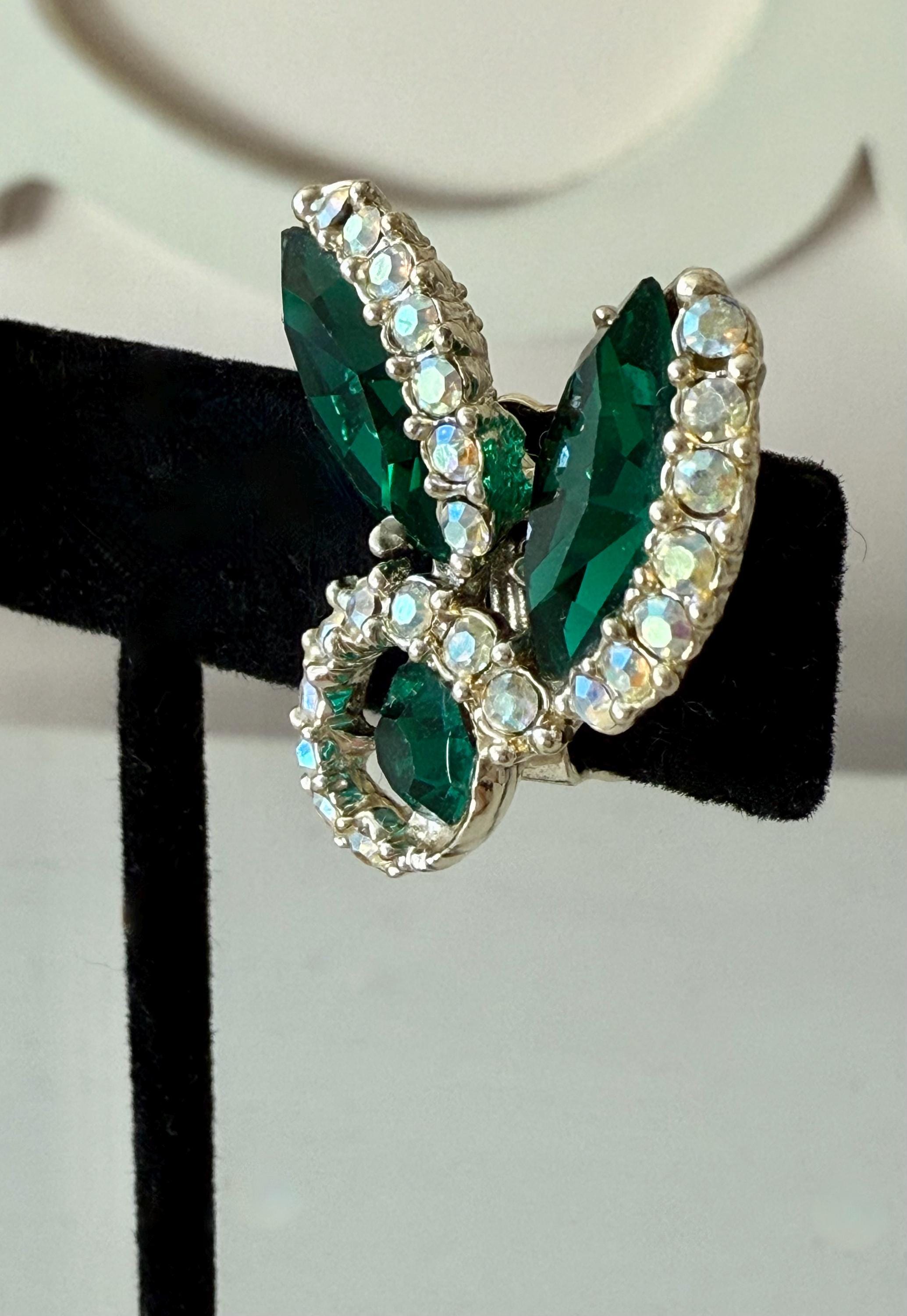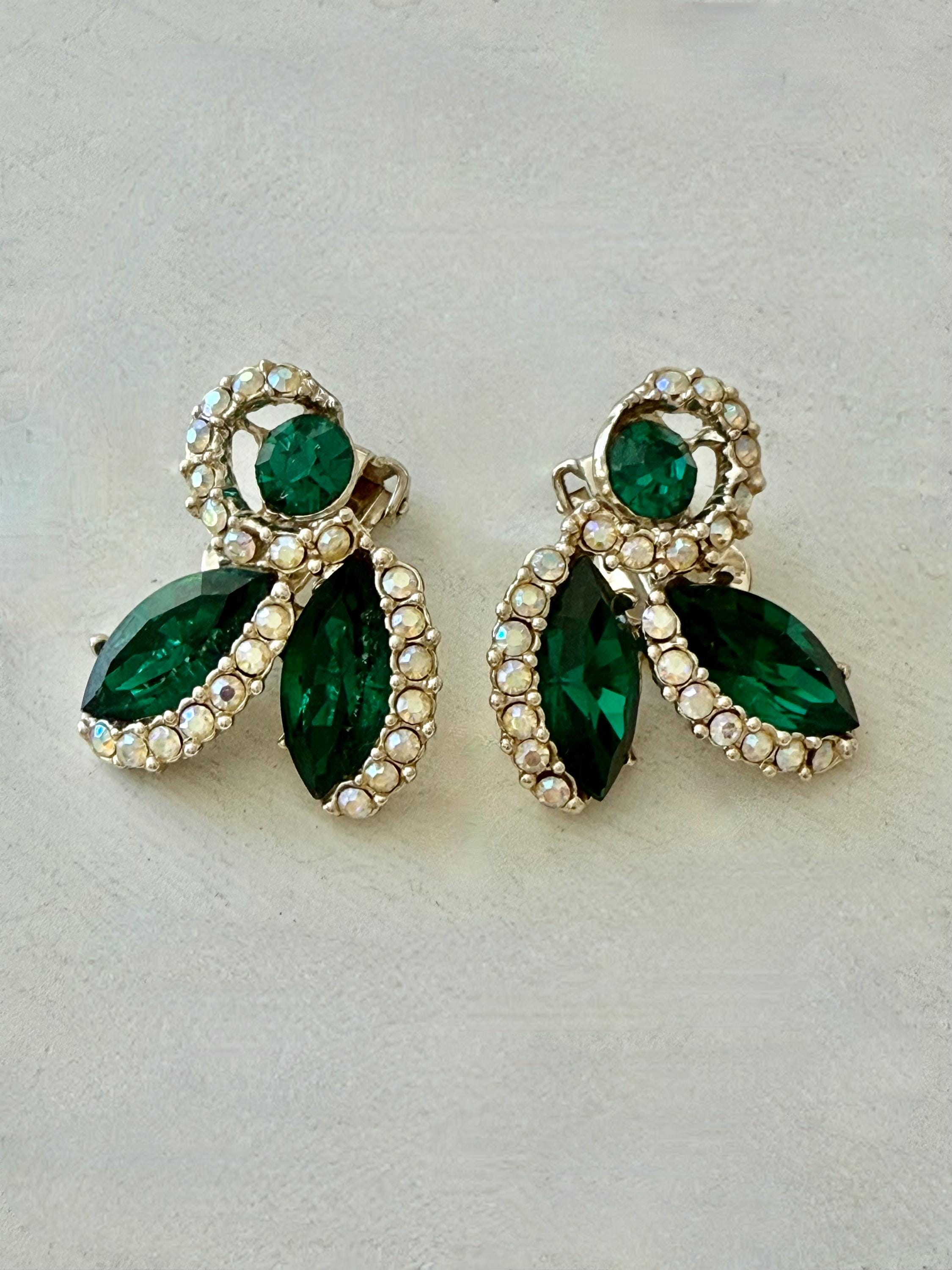 This listing is for a gorgeous pair of vintage earrings from Bogoff. Measuring 1 1/8" high and 7/8" wide, the silver tone earrings feature two large emerald green marquise and one round stone surrounded by tiny, sparkling AB stones. The curvy design and brilliance of the stones make these a showstopper! All stones are intact, the clip backs are secure and comfortable, and they are, overall, in excellent, like new condition.