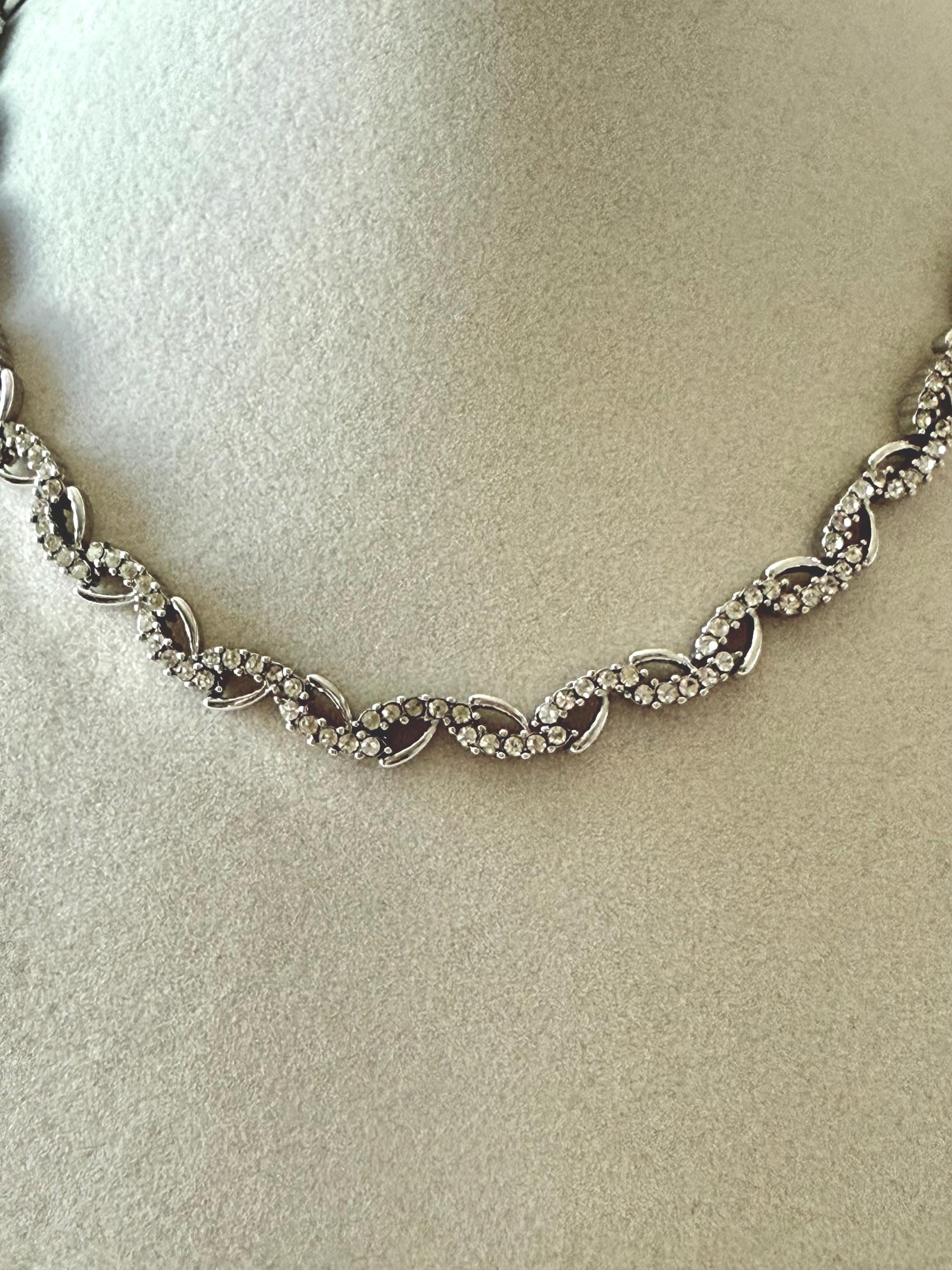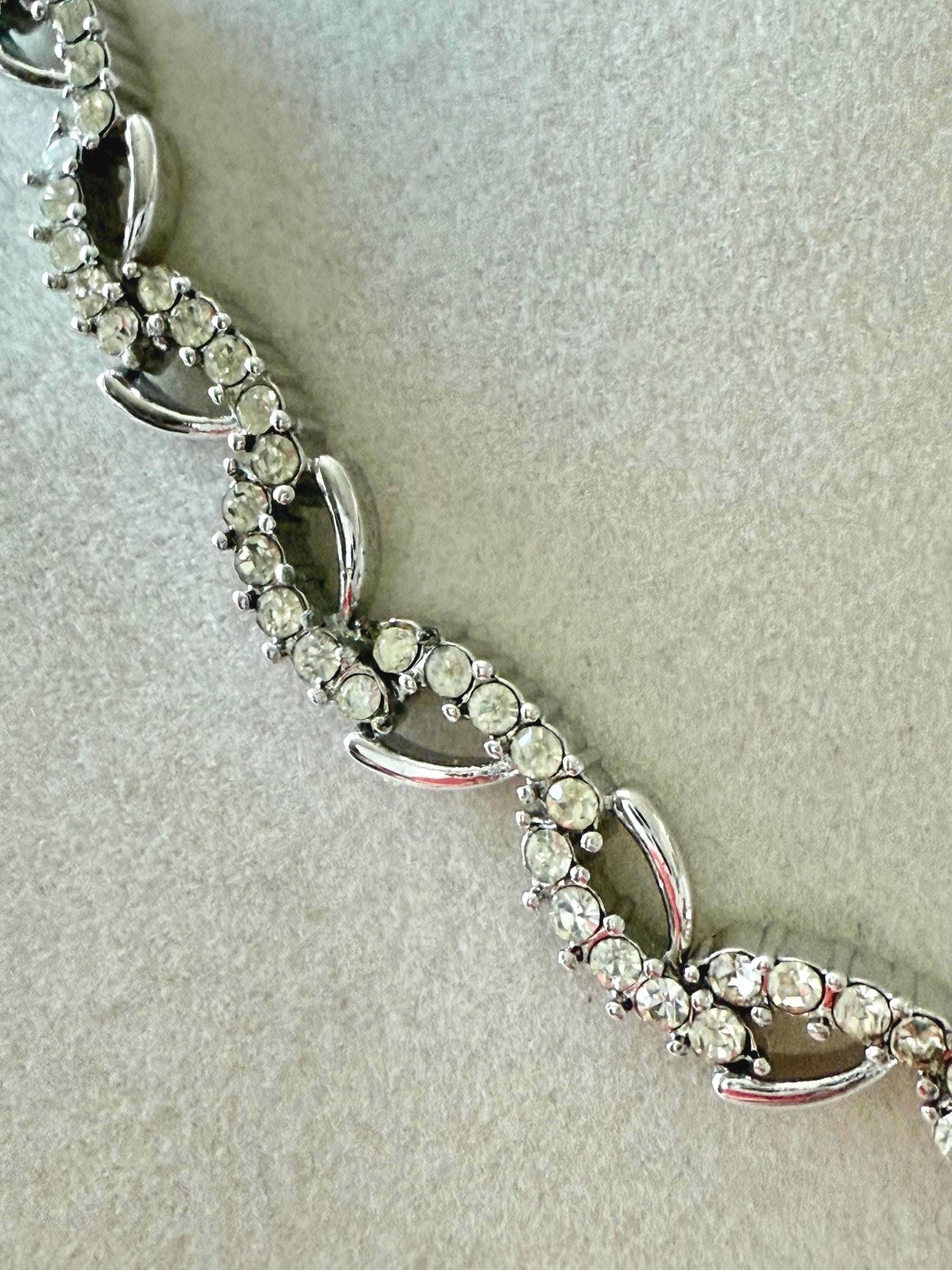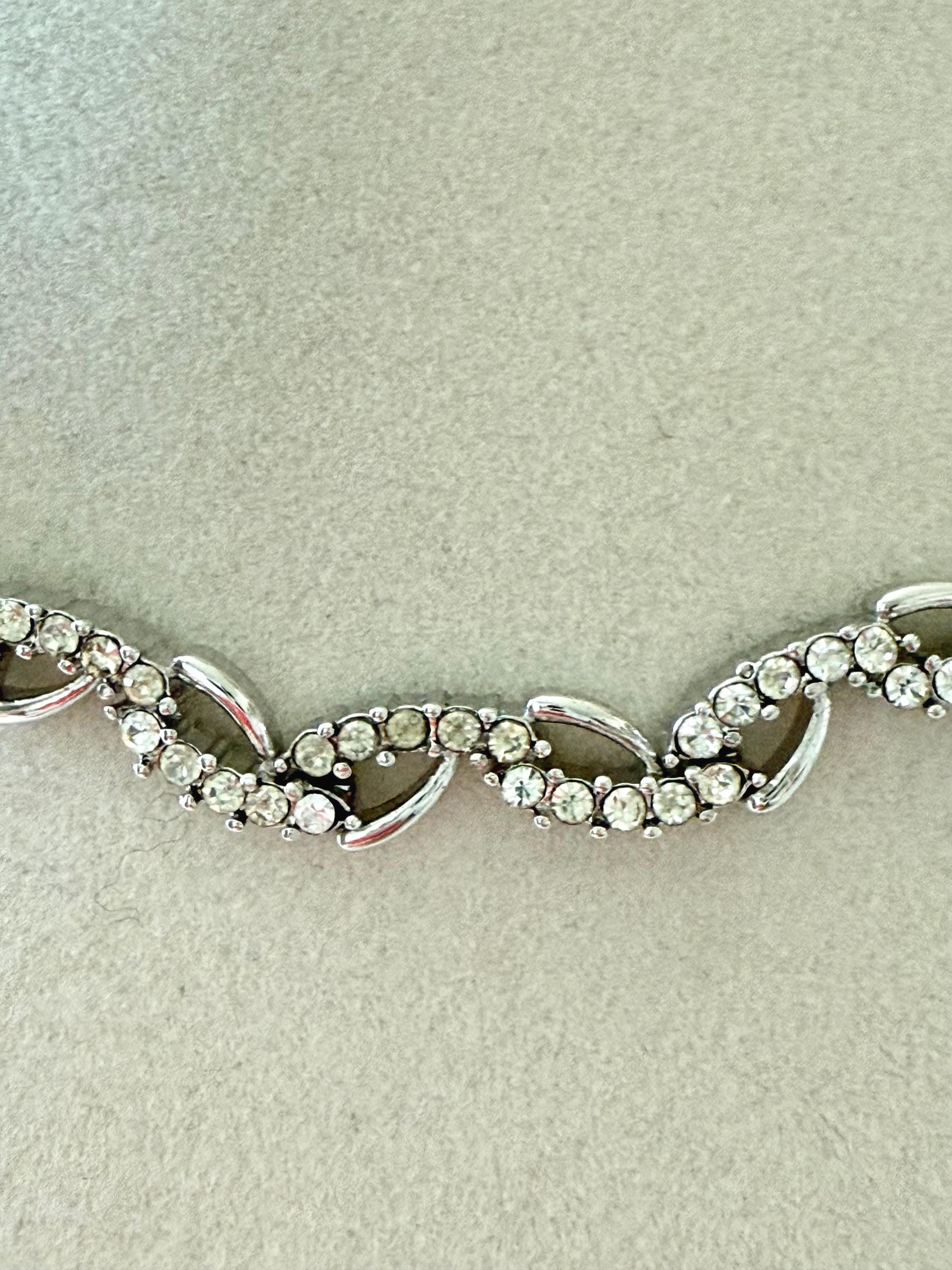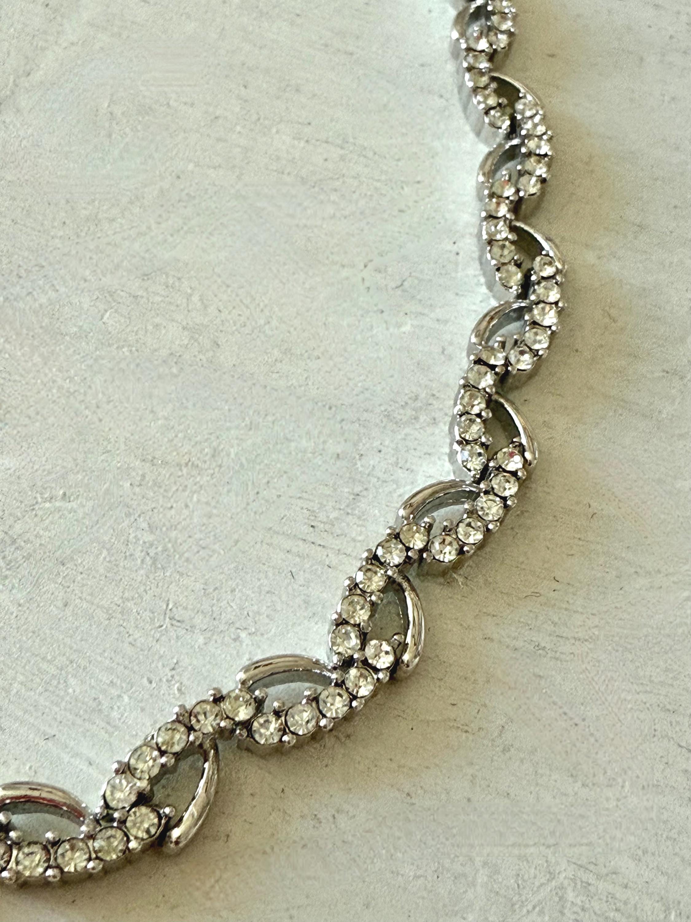This listing is for a lovely unsigned vintage necklace. Measuring 16.5" in length and just 3/16" wide, the choker necklace has a curvy design that really allows it to sparkle! It lays beautifully on the neck, all stones are present, and the clasp is secure. Perfect with a simple crew neck sweater!