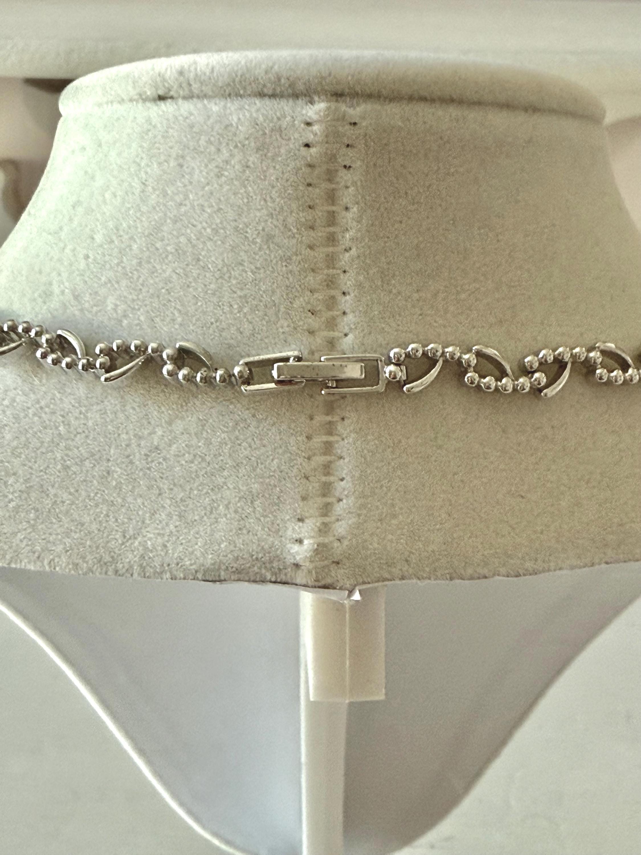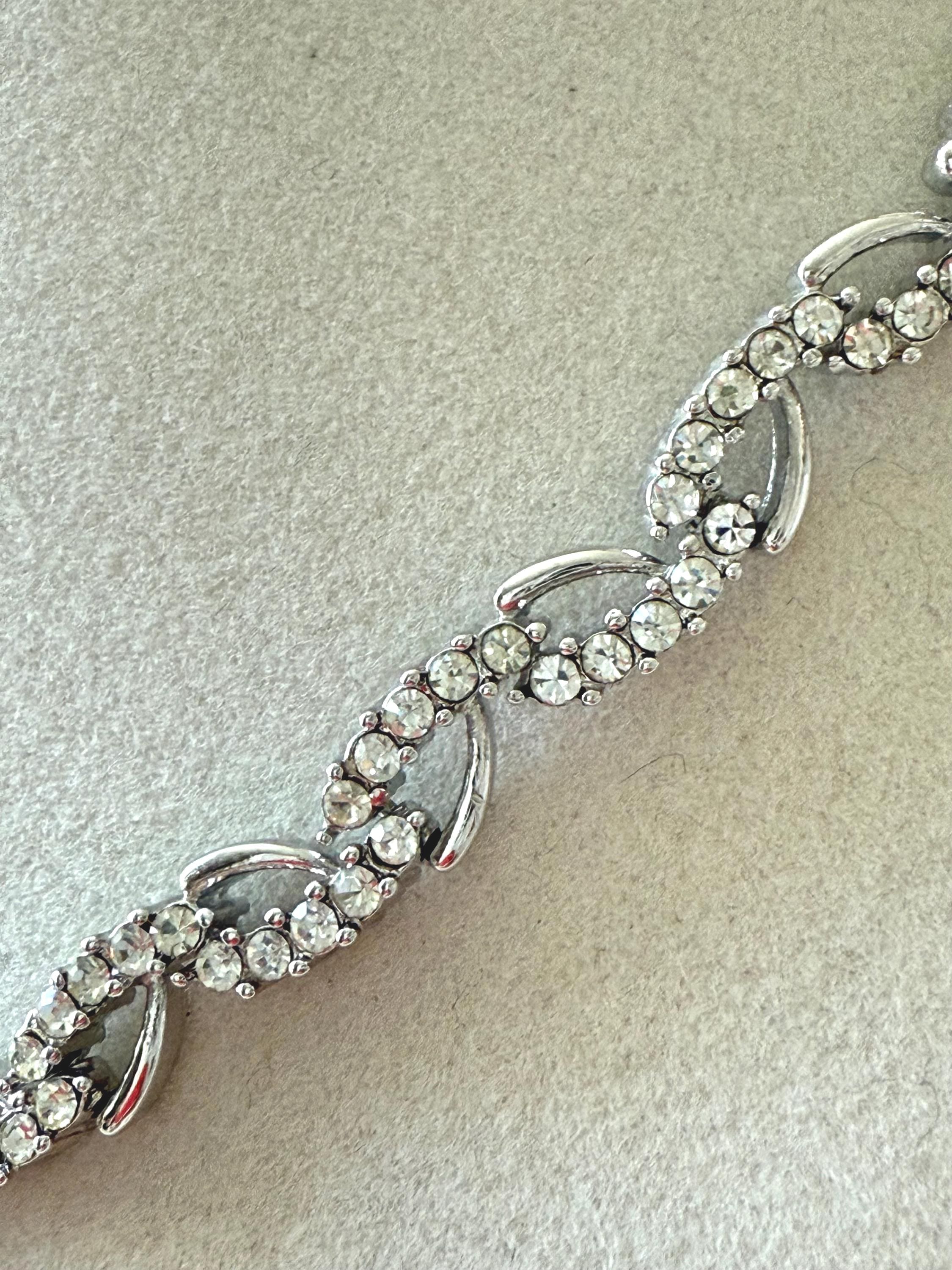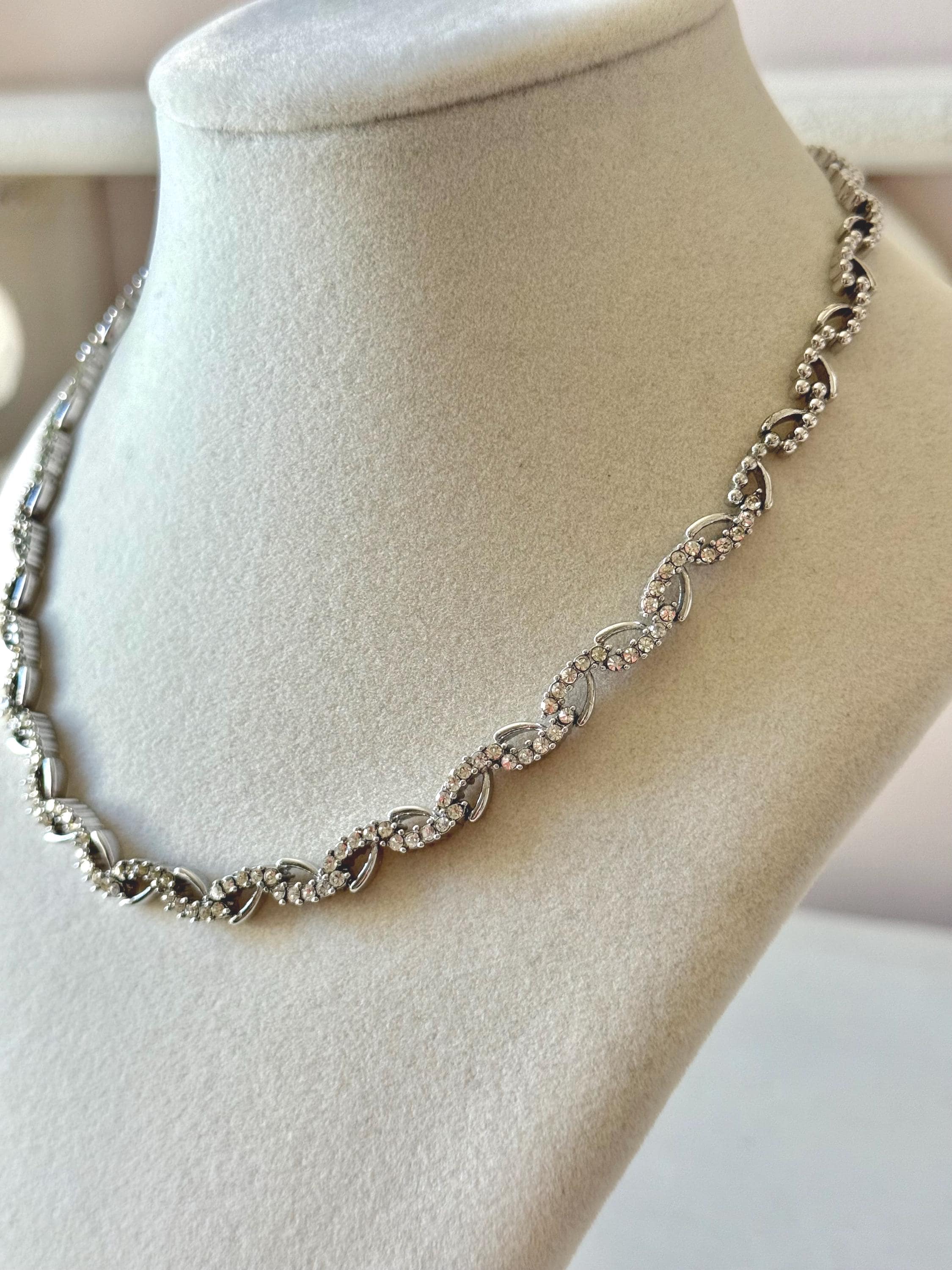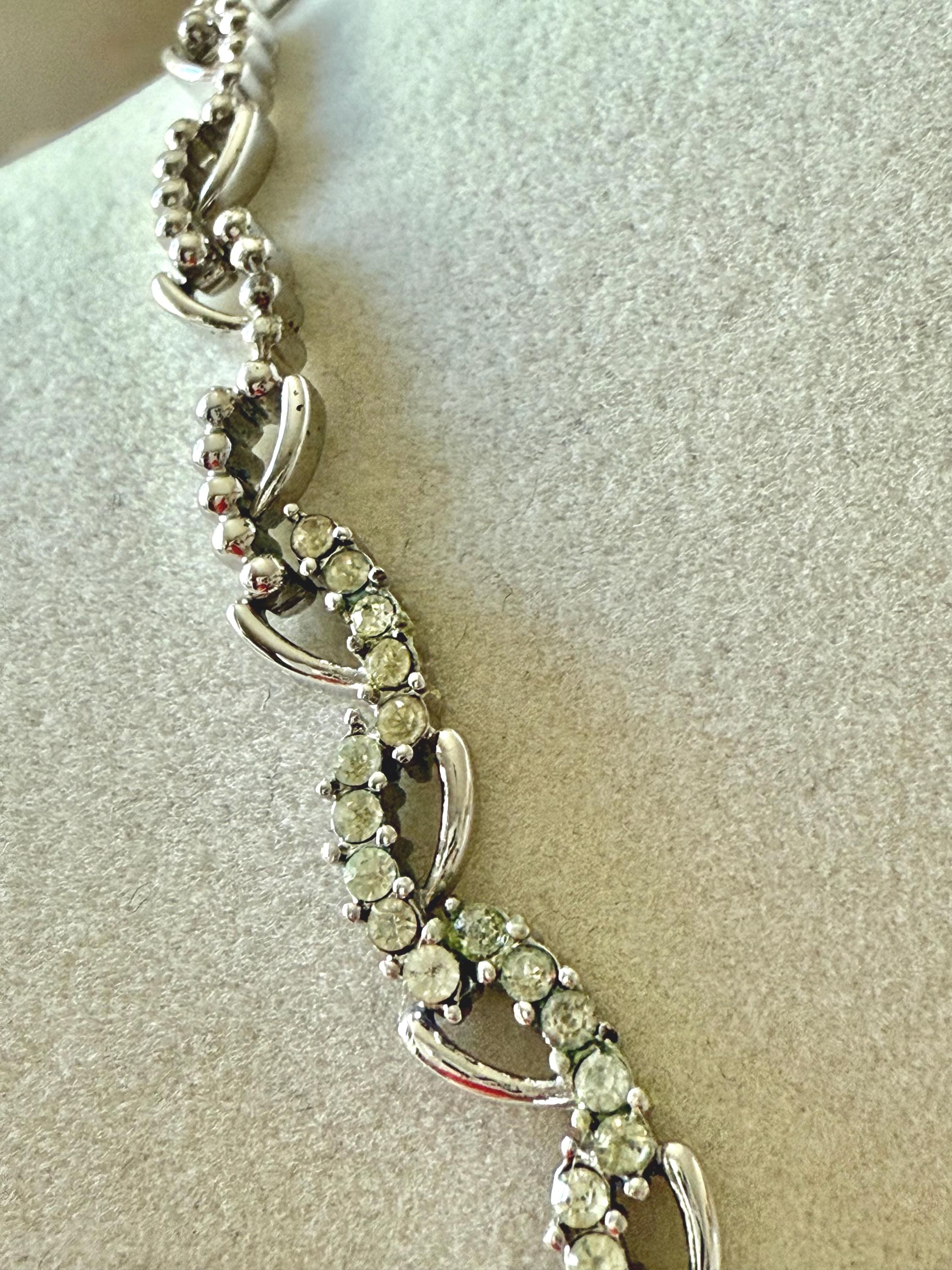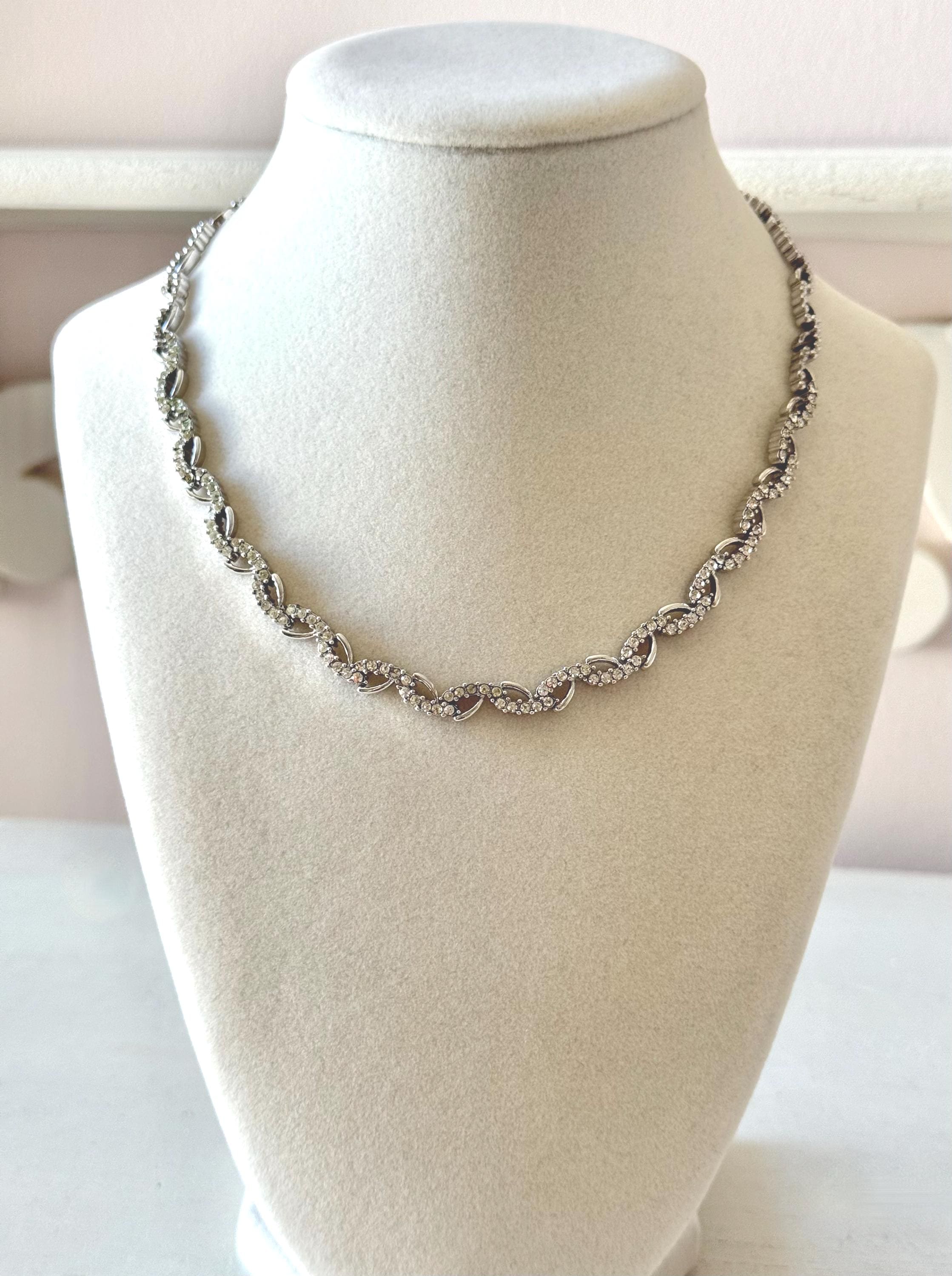 This listing is for a lovely unsigned vintage necklace. Measuring 16.5" in length and just 3/16" wide, the choker necklace has a curvy design that really allows it to sparkle! It lays beautifully on the neck, all stones are present, and the clasp is secure. Perfect with a simple crew neck sweater!