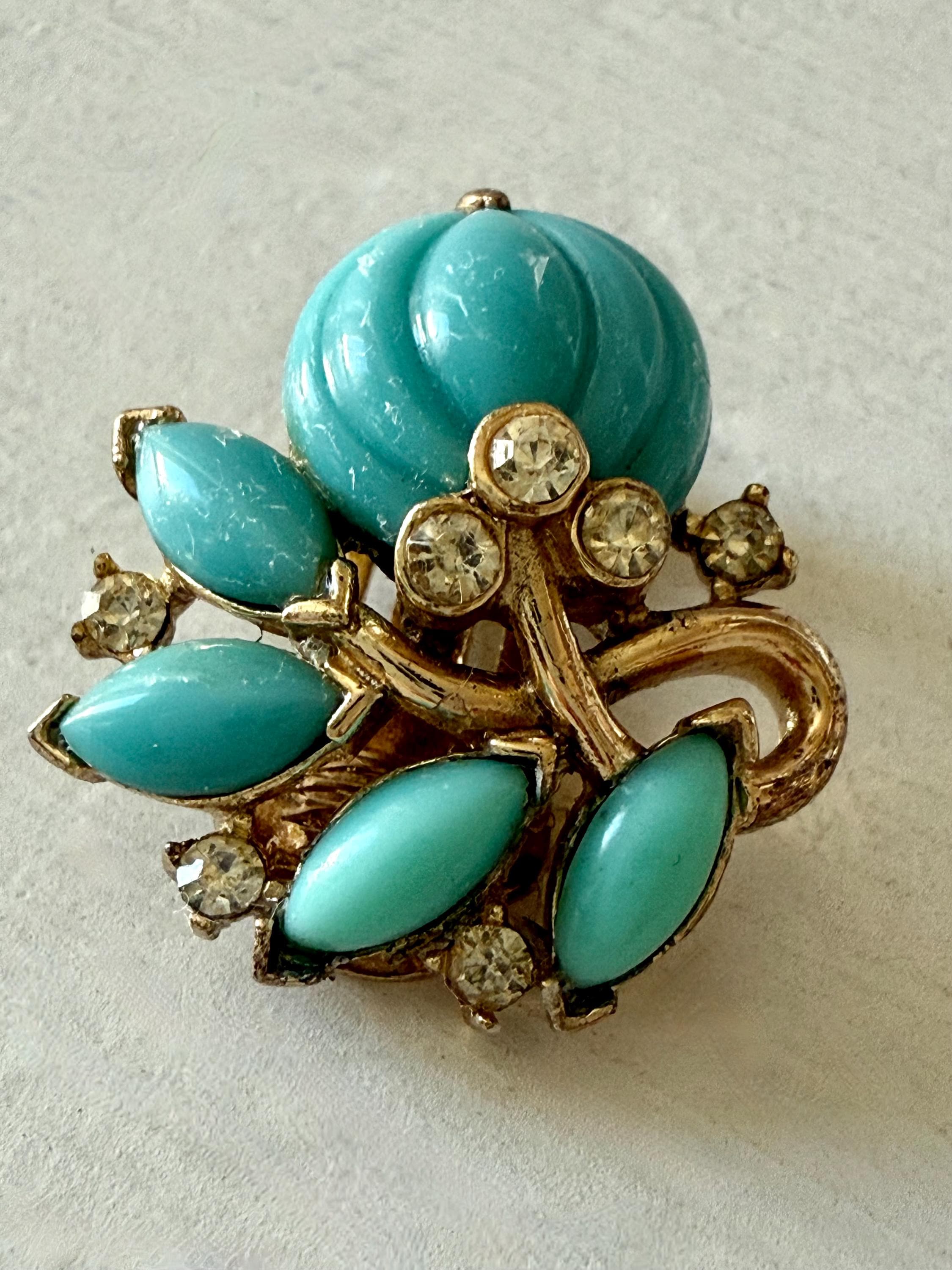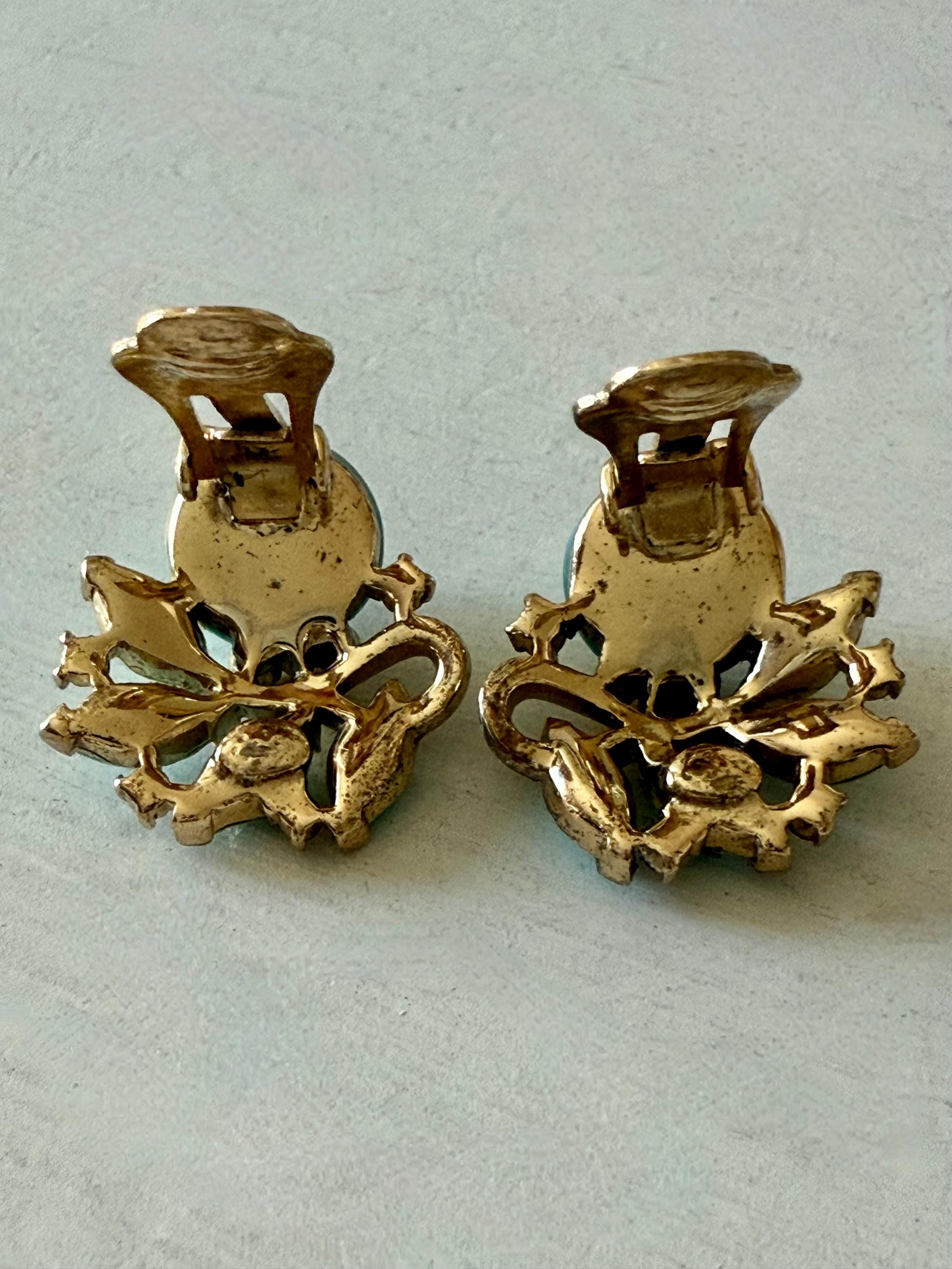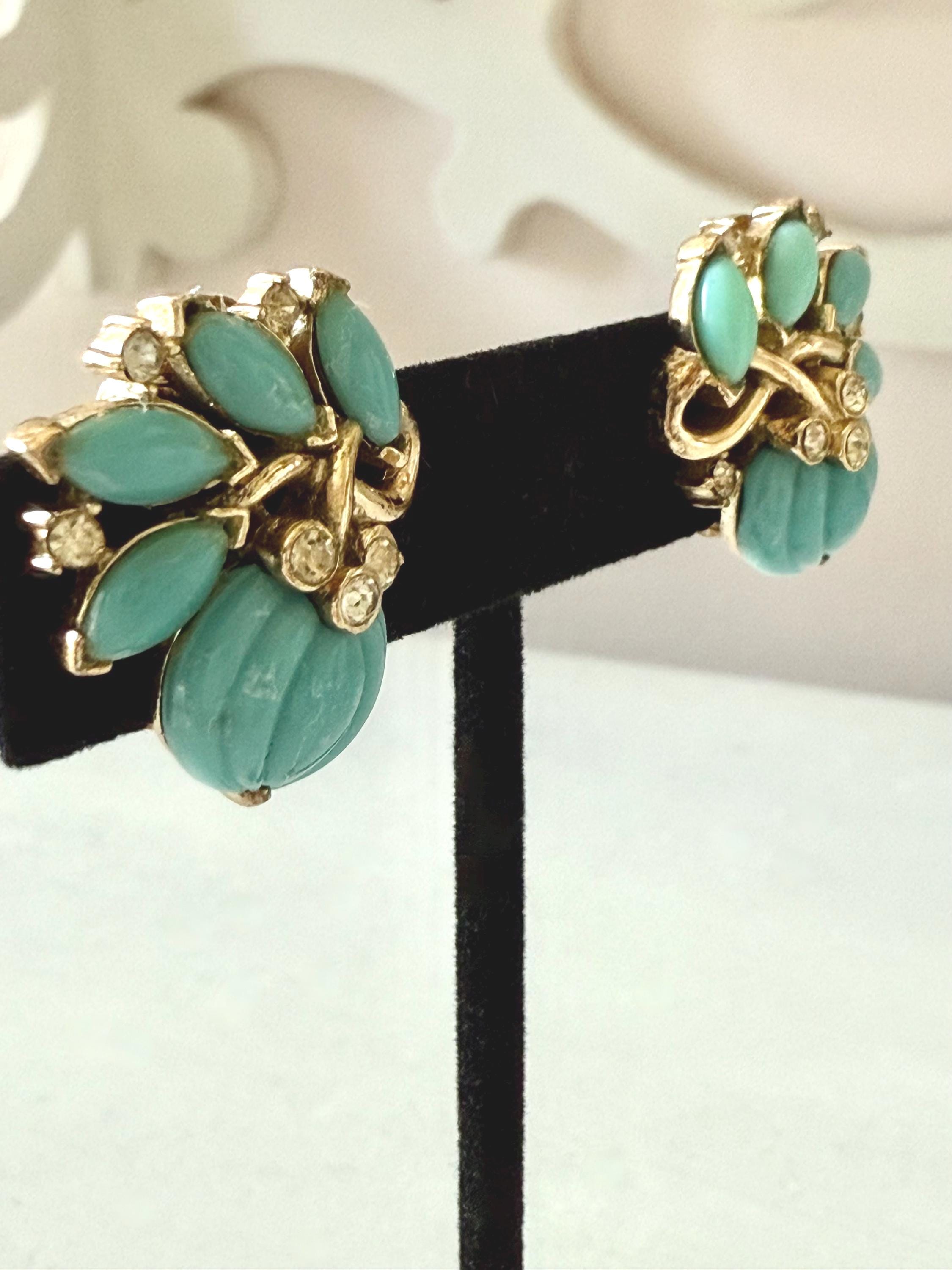 This listing is for a lovely pair of vintage earrings by Trifari. At just under 1" high and 3/4" wide, the gold tone earring features a molded glass melon and marquise stones in bright turquoise. With accents of clear rhinestones, all intact, the earrings have secure and comfortable clip backs and are in very good vintage condition. Perfect day to evening earrings!