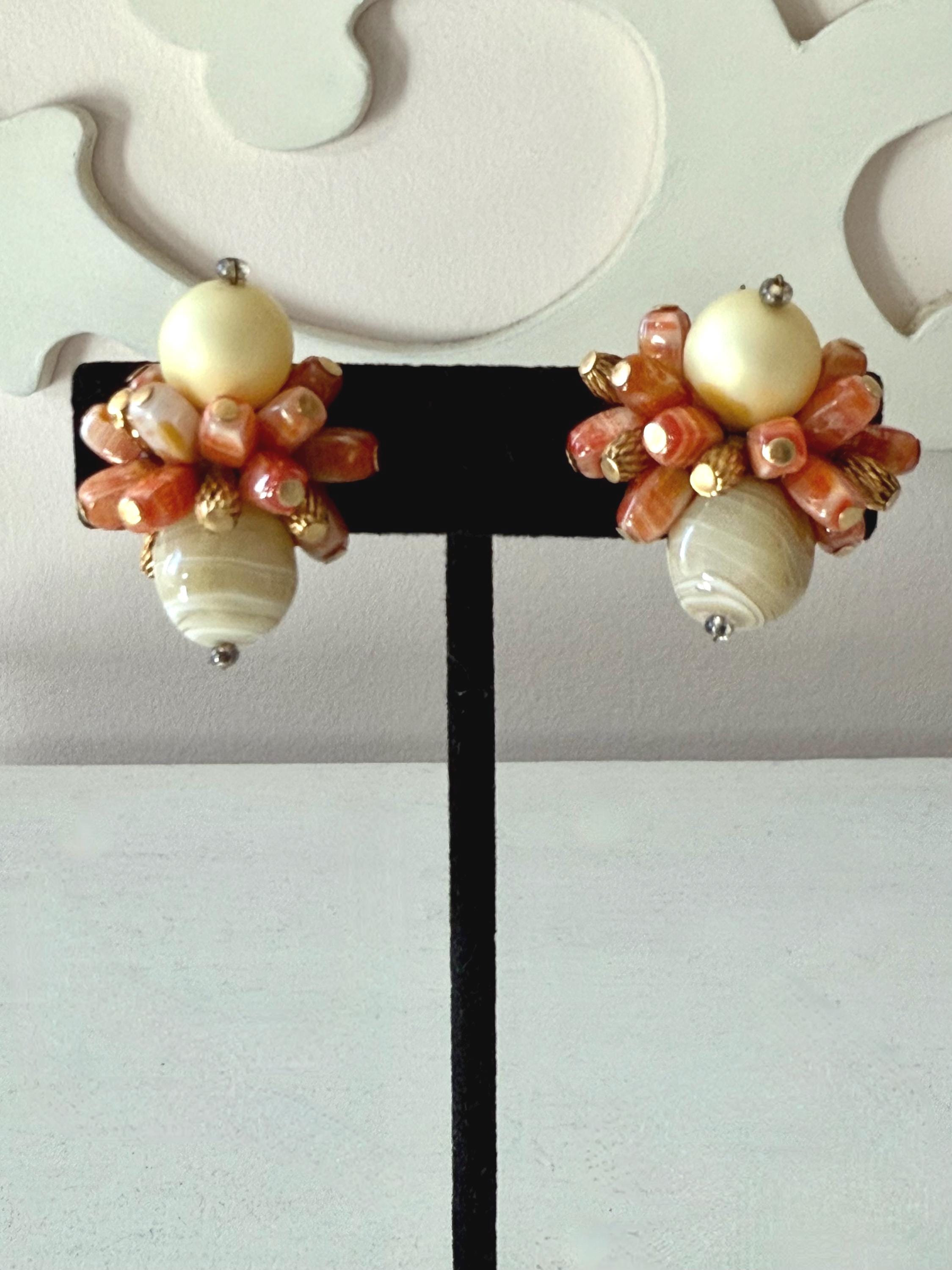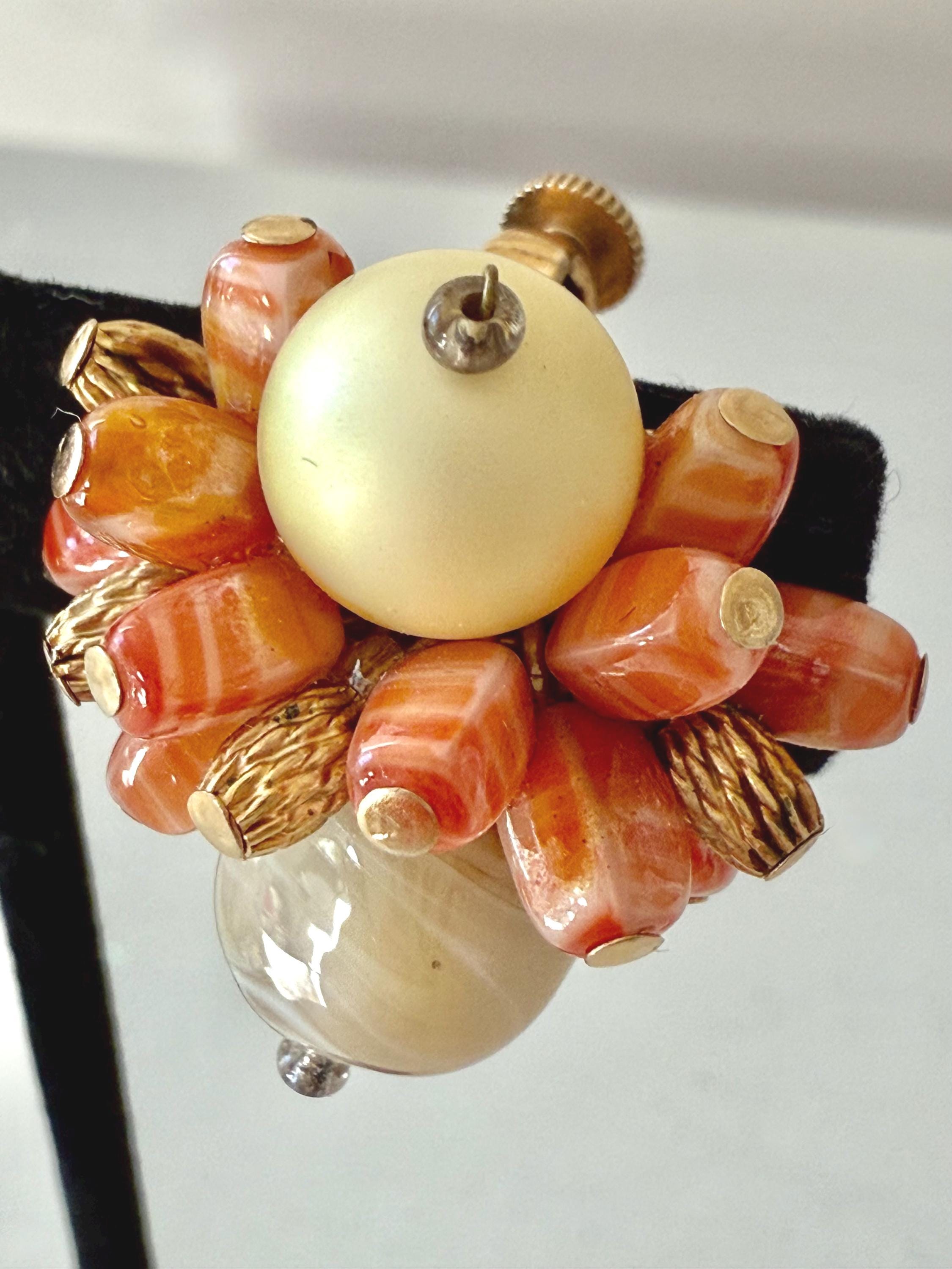 This listing is for a gorgeous pair of vintage earrings by Vendome. Measuring 1 1/8" high and 7/8" wide, the earring features a beige and white art glass bead on the bottom of the cluster, a ring of orange art glass and textured gold tone beads, and a matte faux pearl on top. The clip backs are secure and very comfortable. You will see a bit of glue on the faux pearls but note that it is on the back of the pearl and is not seen when worn. These are truly gorgeous on the ear!