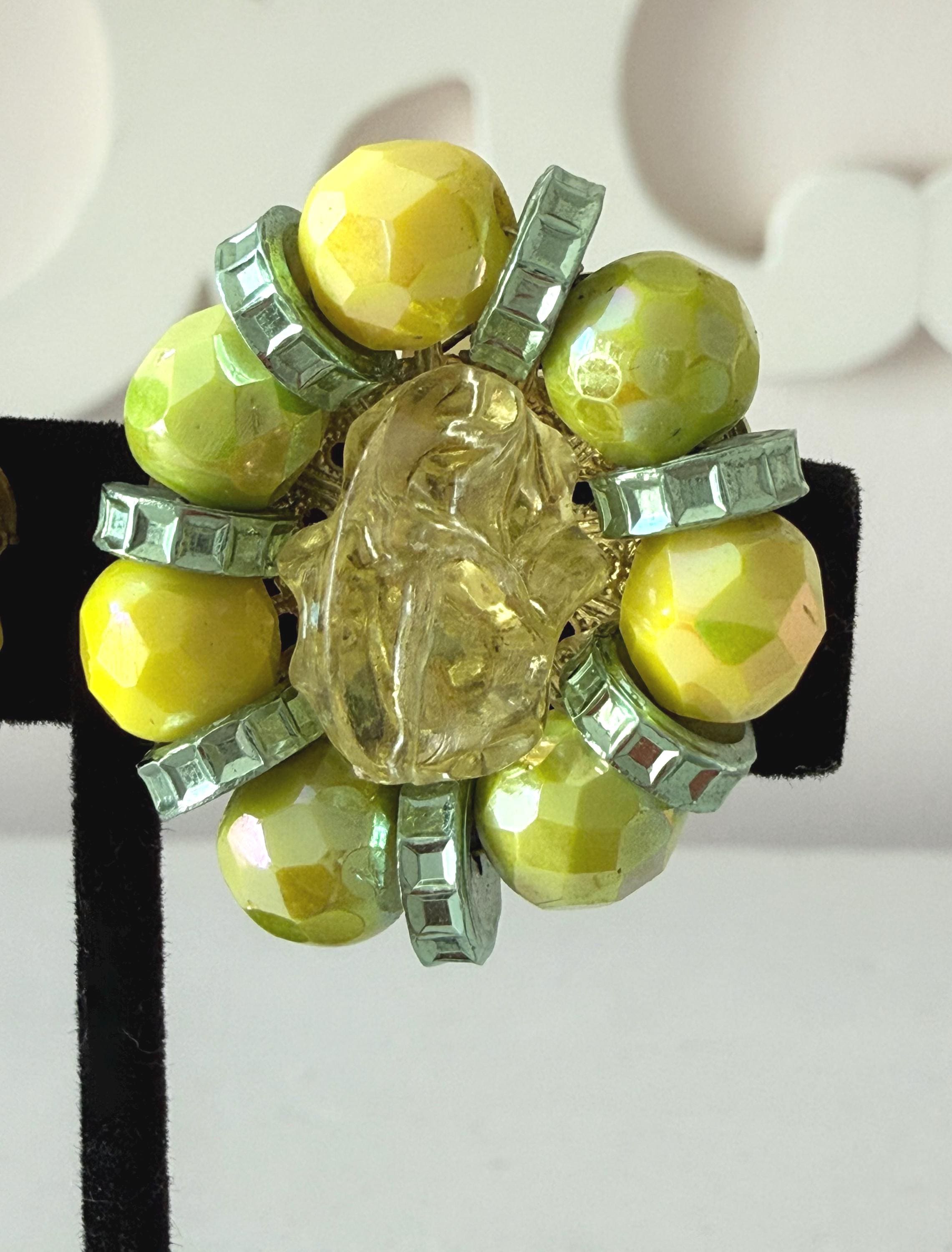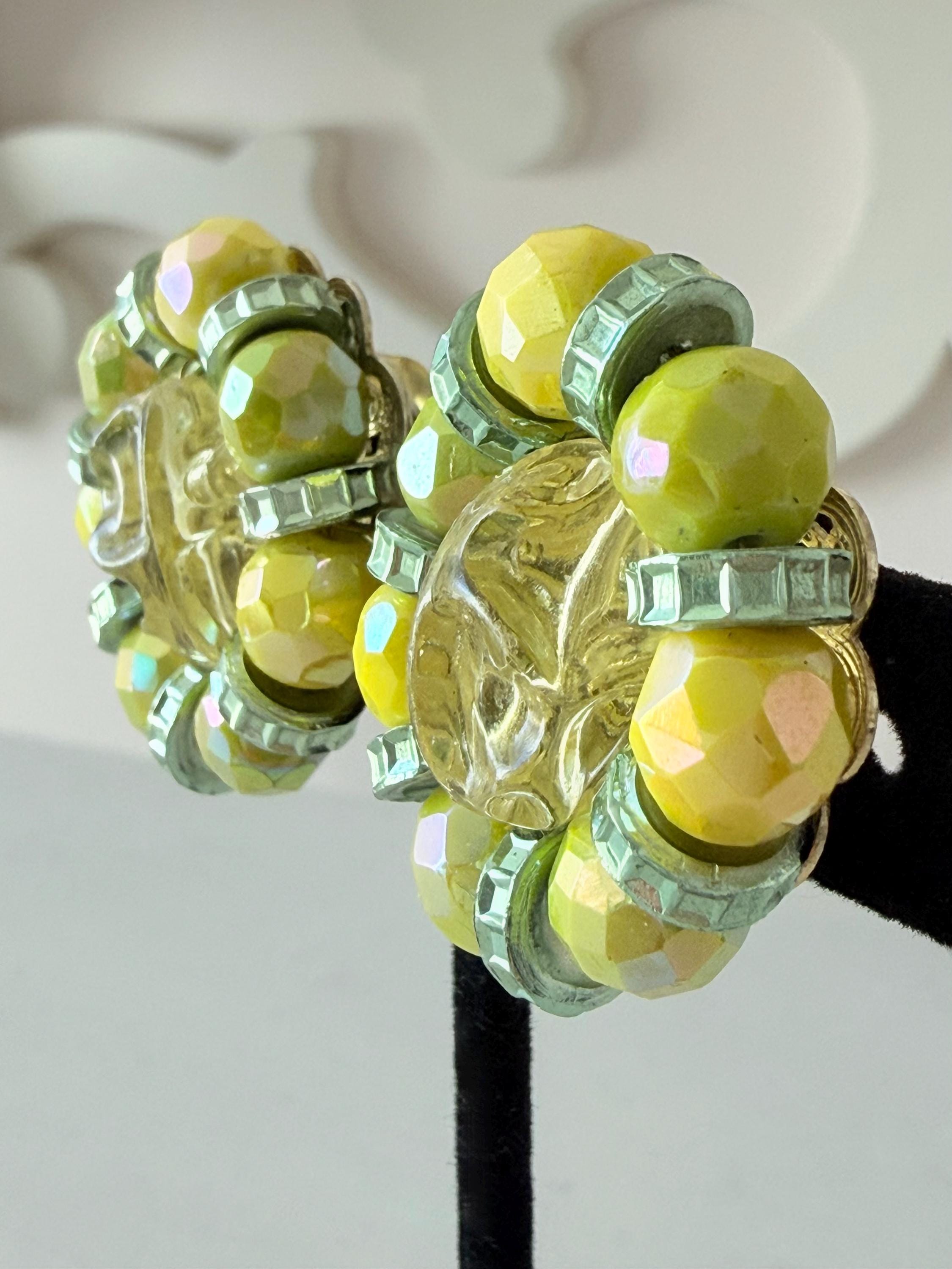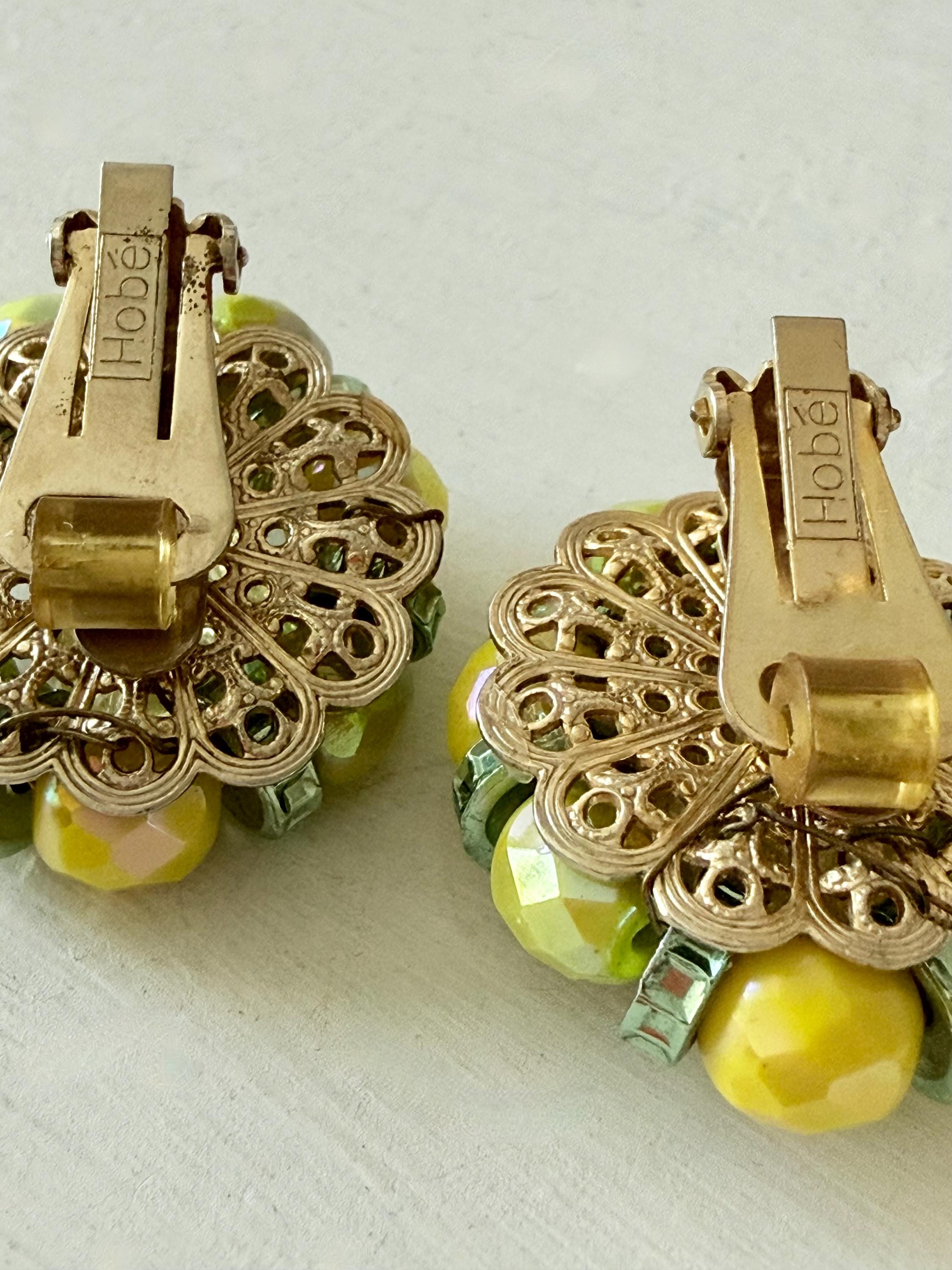 This listing is for a gorgeous pair of vintage earrings by Hobe. Measuring 1 1/4" long and 1" wide, the earring features brilliant AB glass beads in lemon and lime separated by green rondelles and includes a large molded yellow bead at the center. The clip backs are secure and comfortable and they are in excellent, like new condition. Perfect for that trip to someplace sunny and warm!