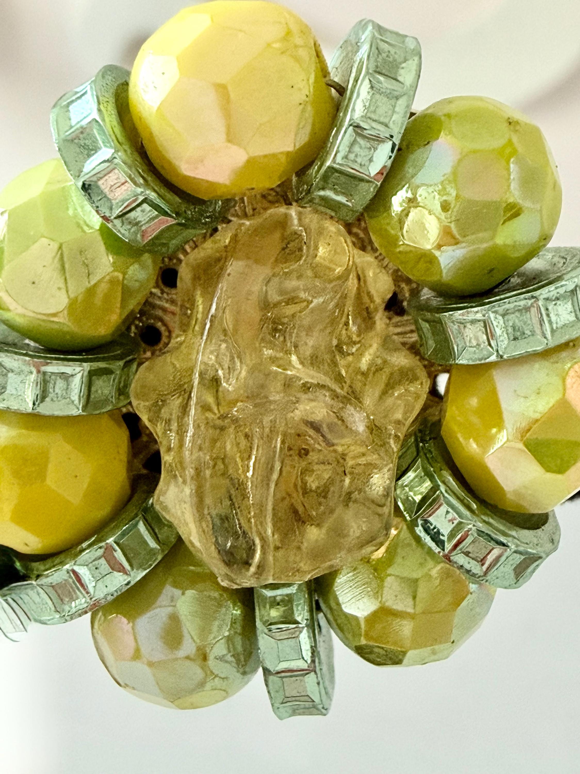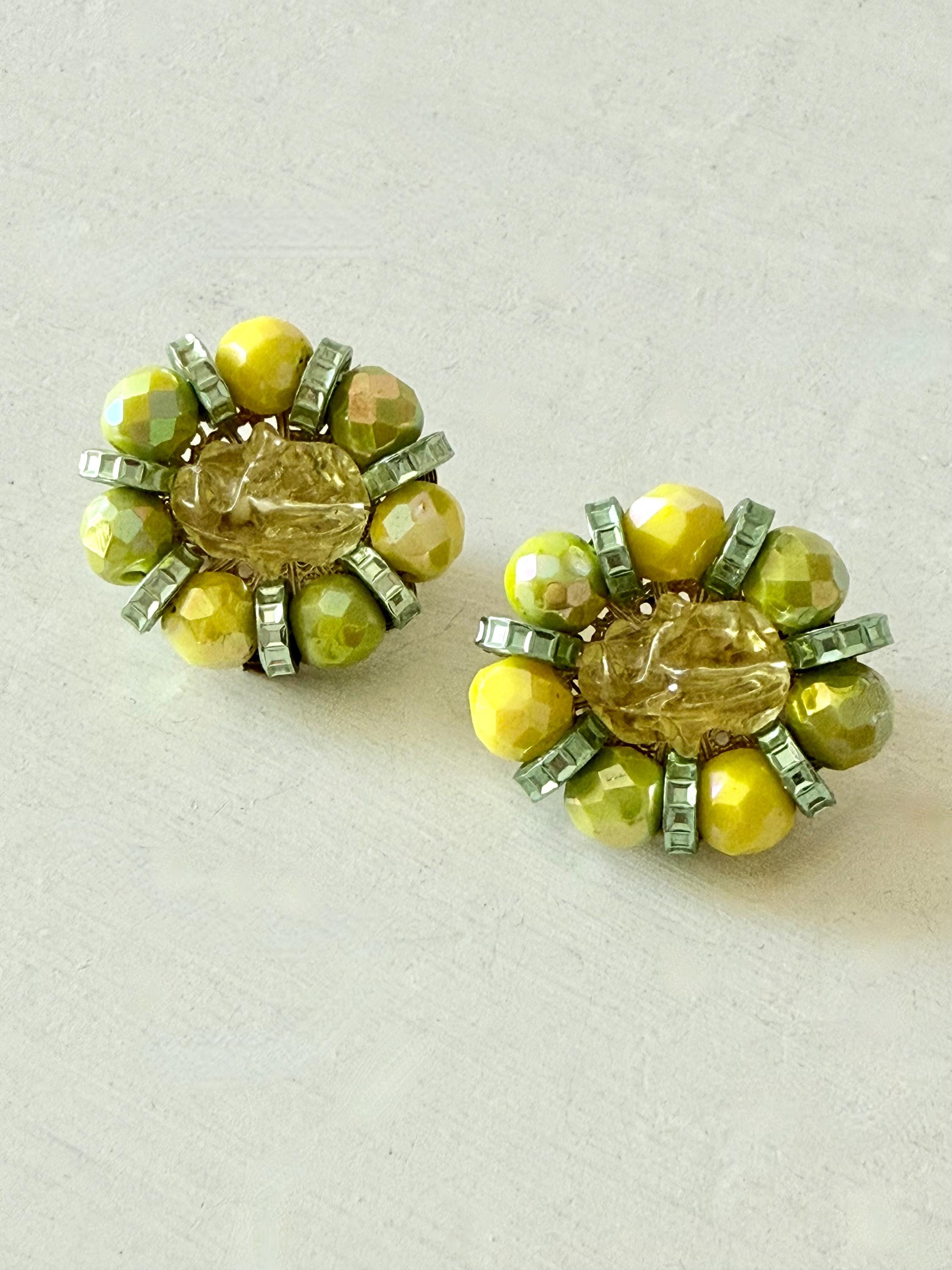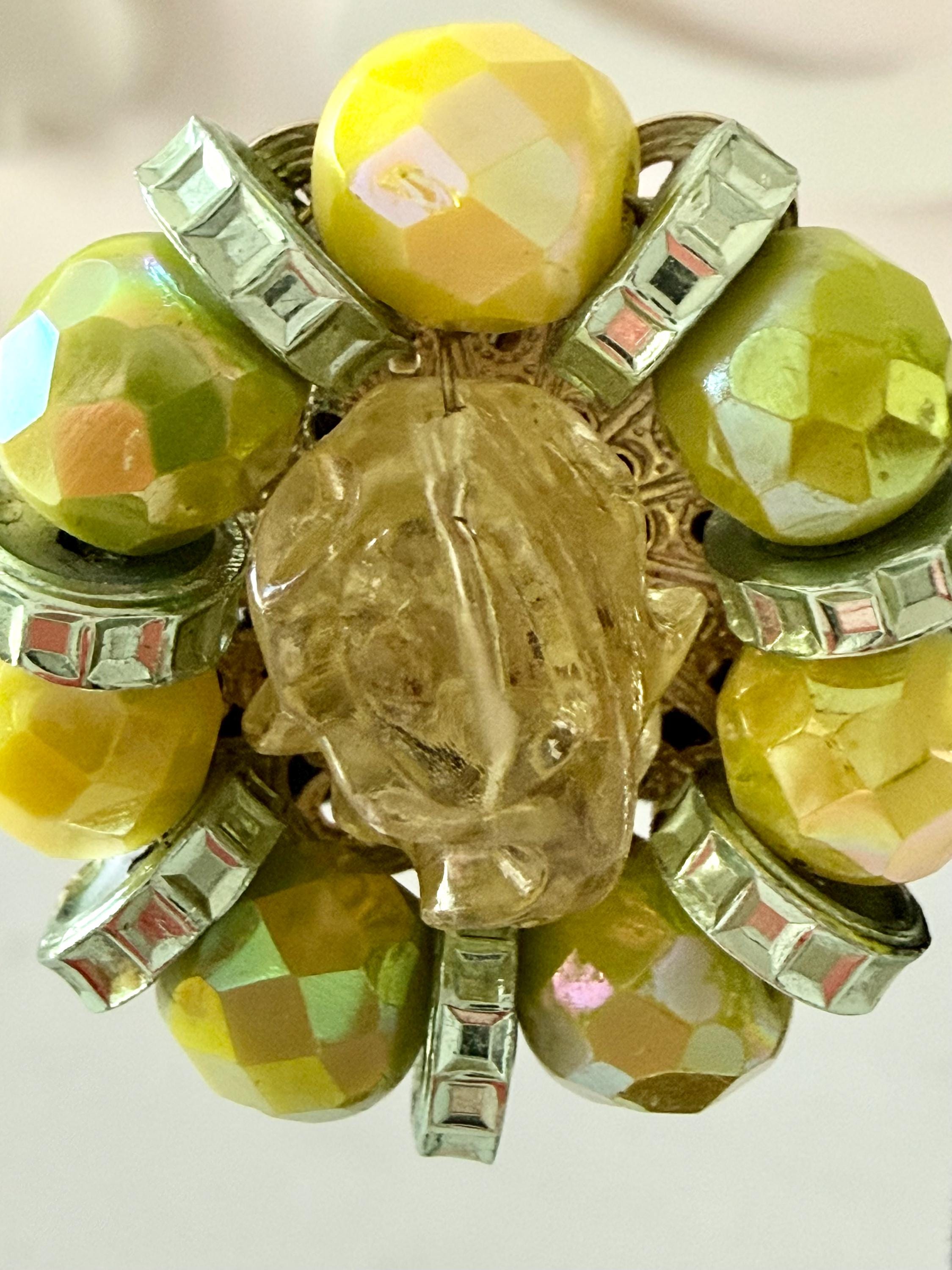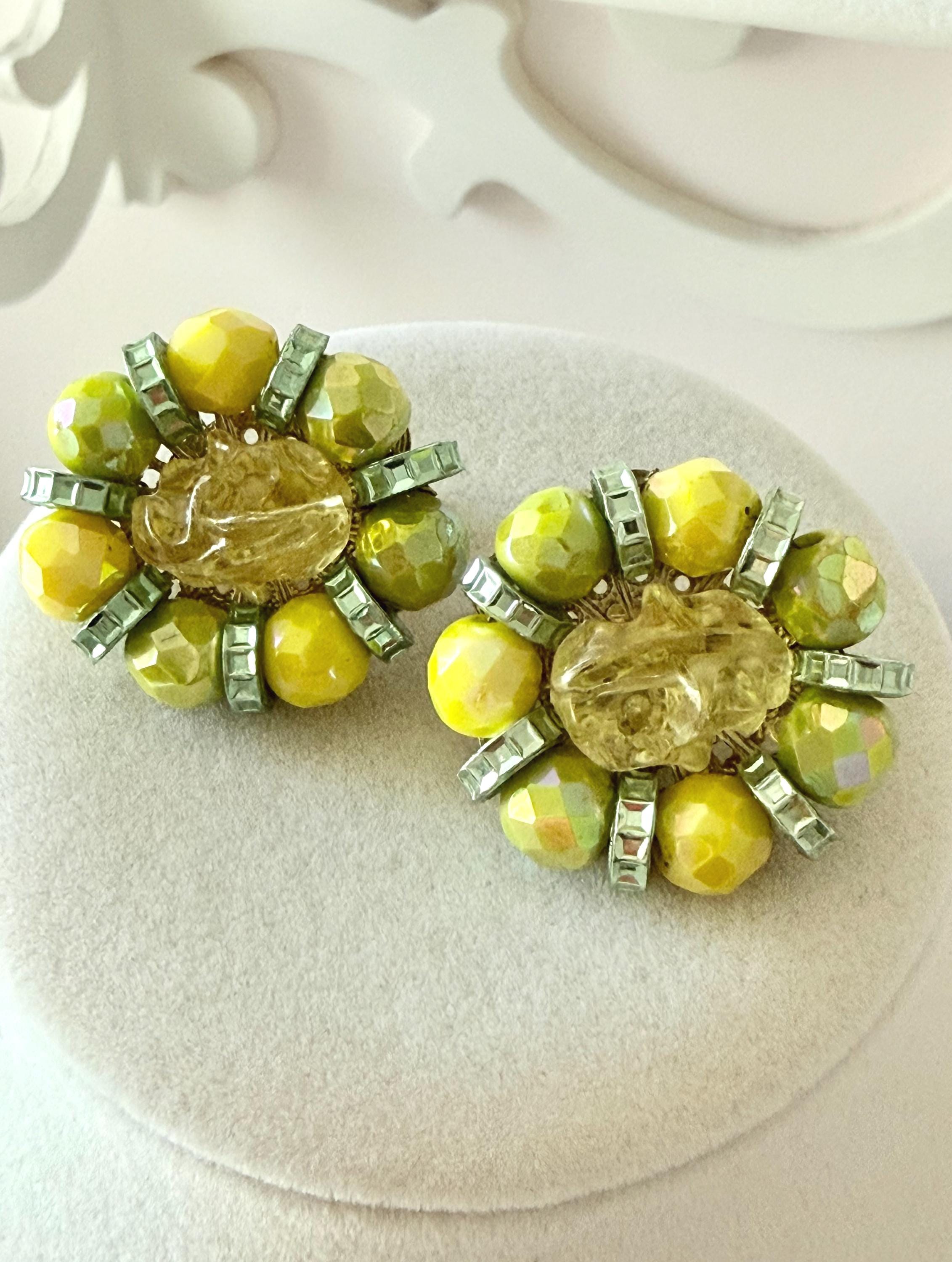 This listing is for a gorgeous pair of vintage earrings by Hobe. Measuring 1 1/4" long and 1" wide, the earring features brilliant AB glass beads in lemon and lime separated by green rondelles and includes a large molded yellow bead at the center. The clip backs are secure and comfortable and they are in excellent, like new condition. Perfect for that trip to someplace sunny and warm!