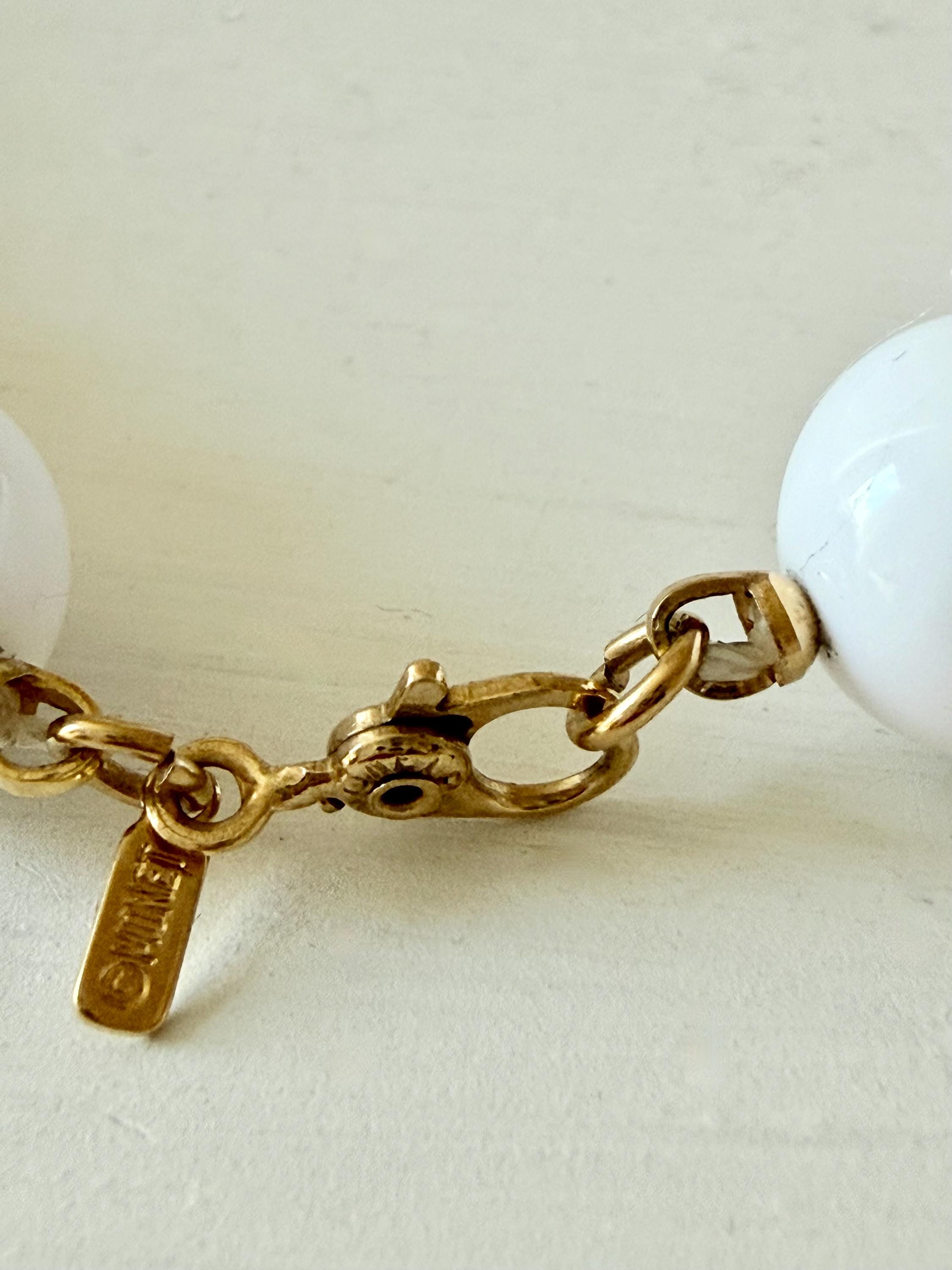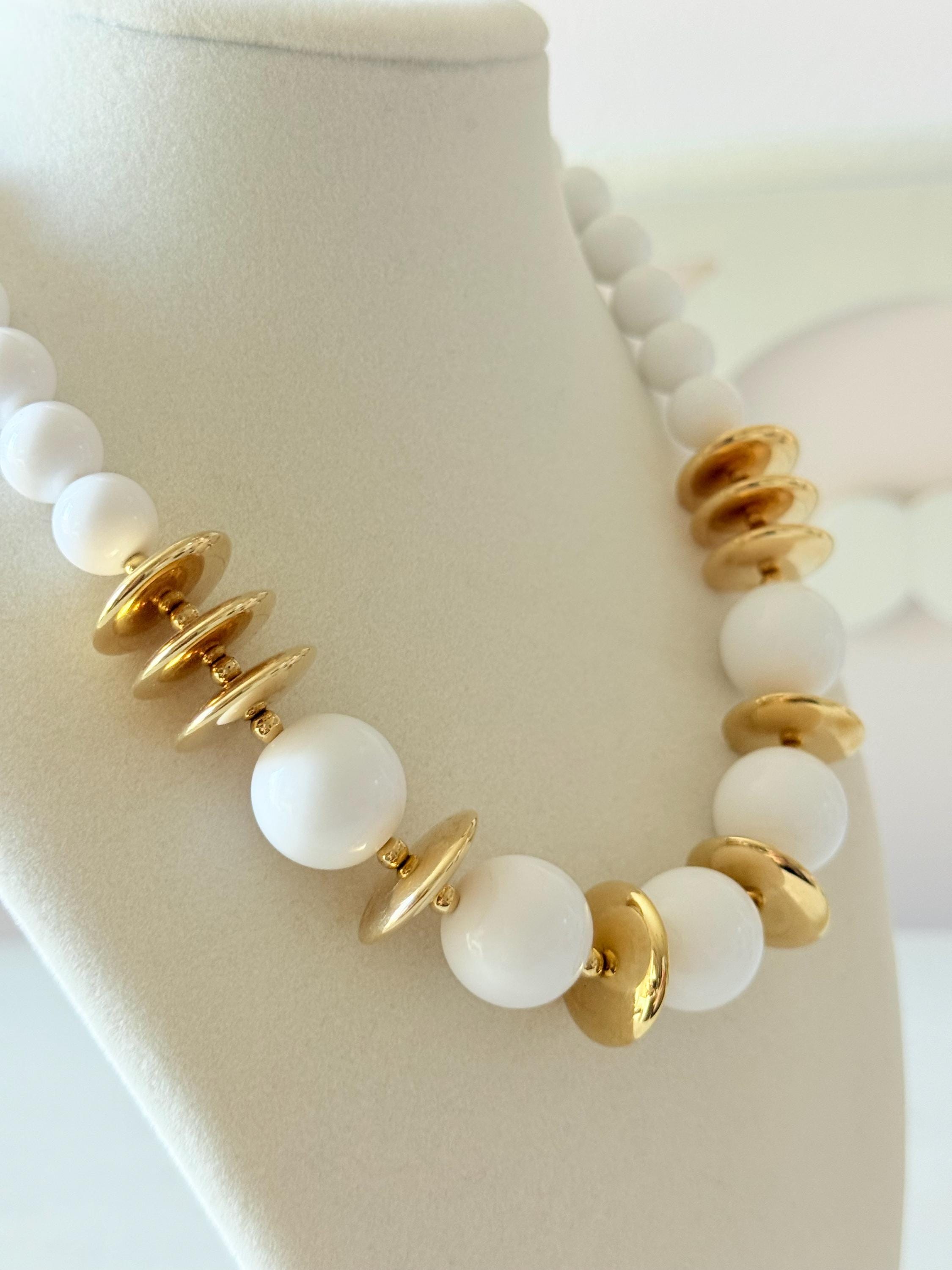This listing is for a very pretty vintage necklace from Monet. Measuring 17" in length, the necklace features graduated, shiny, white acrylic beads separated with bright and shiny gold tone metal discs. The clasp is secure and it is, overall, in excellent, like new condition. It is very lightweight but looks like a more expensive necklace.