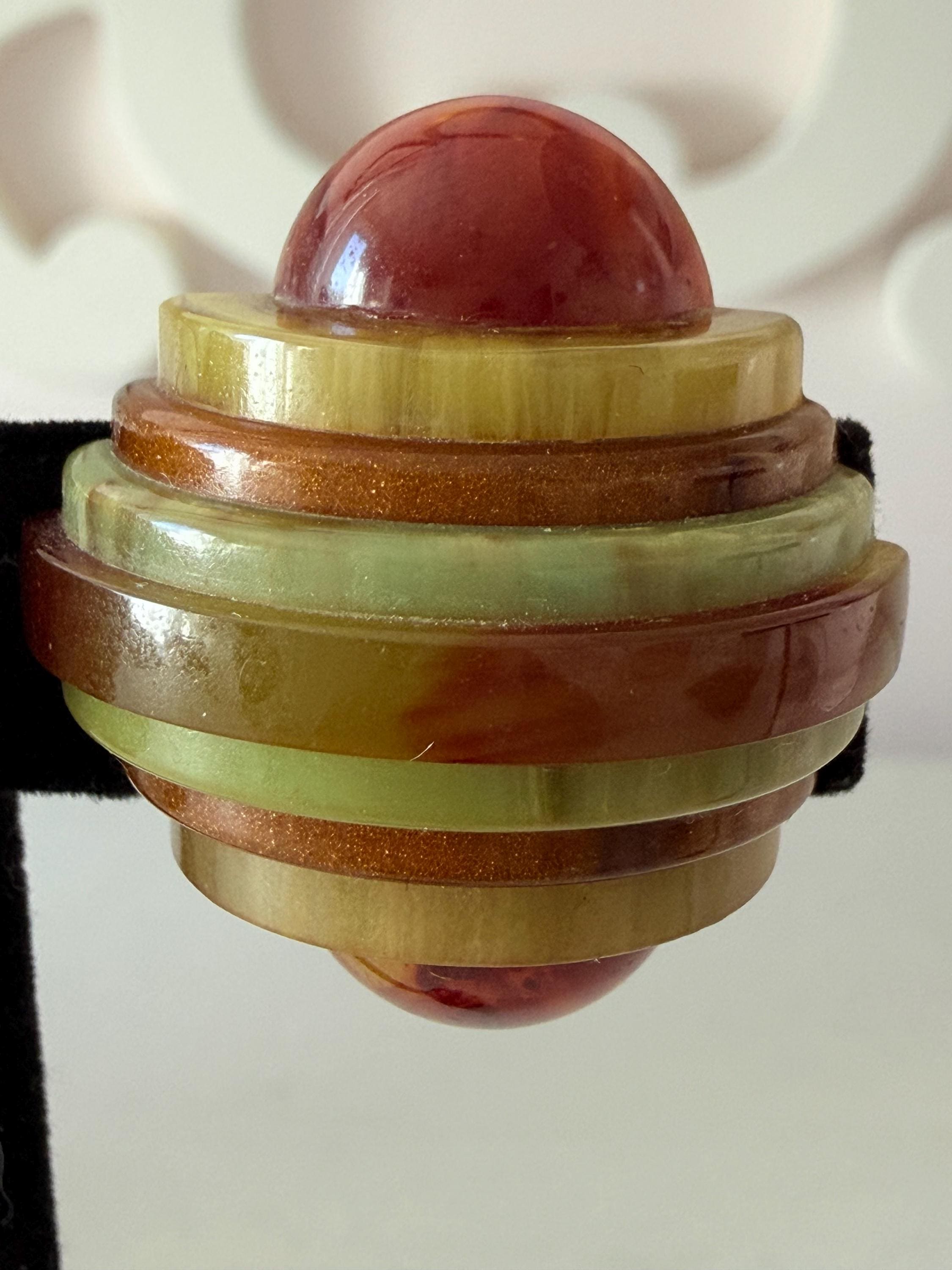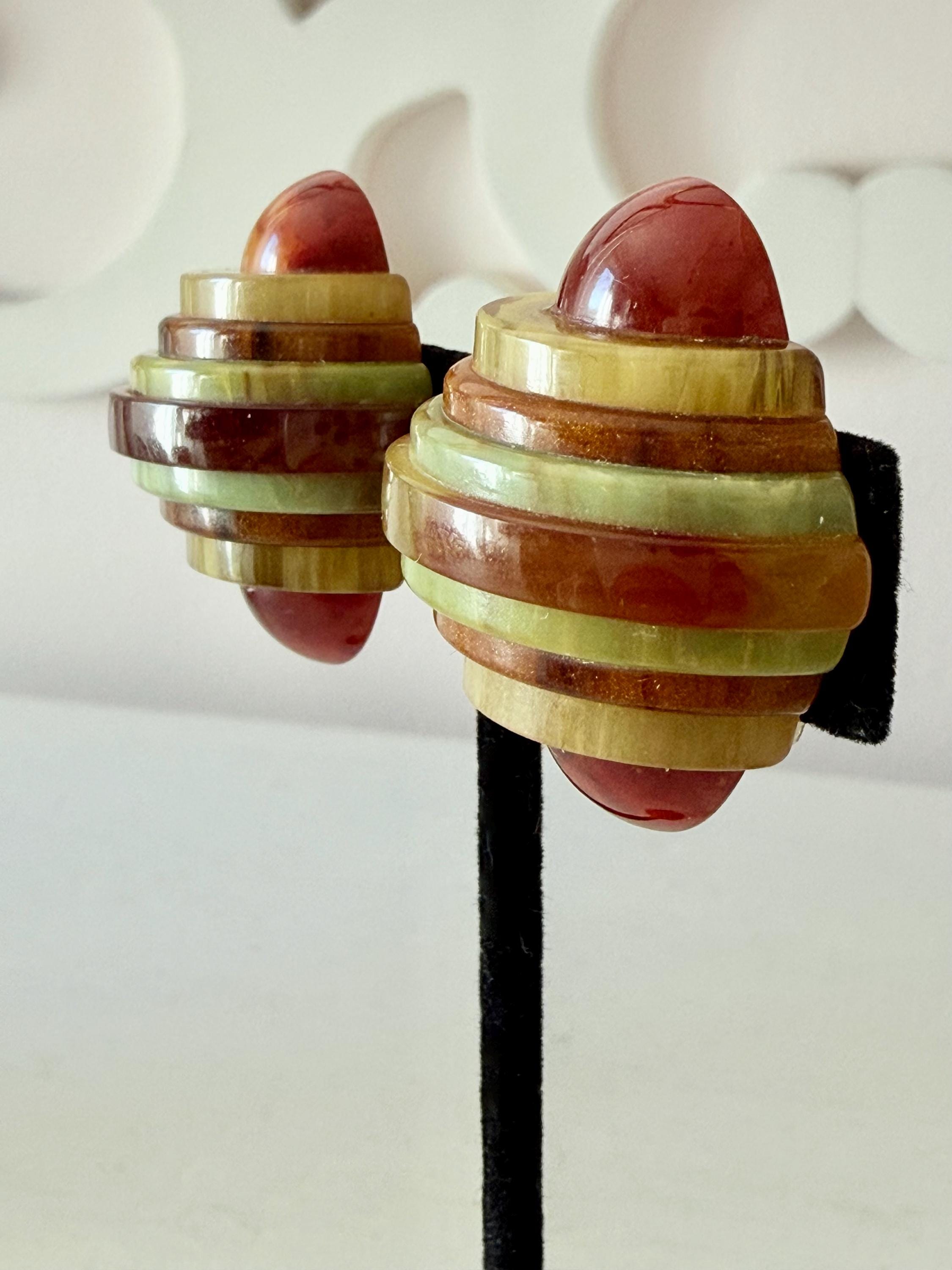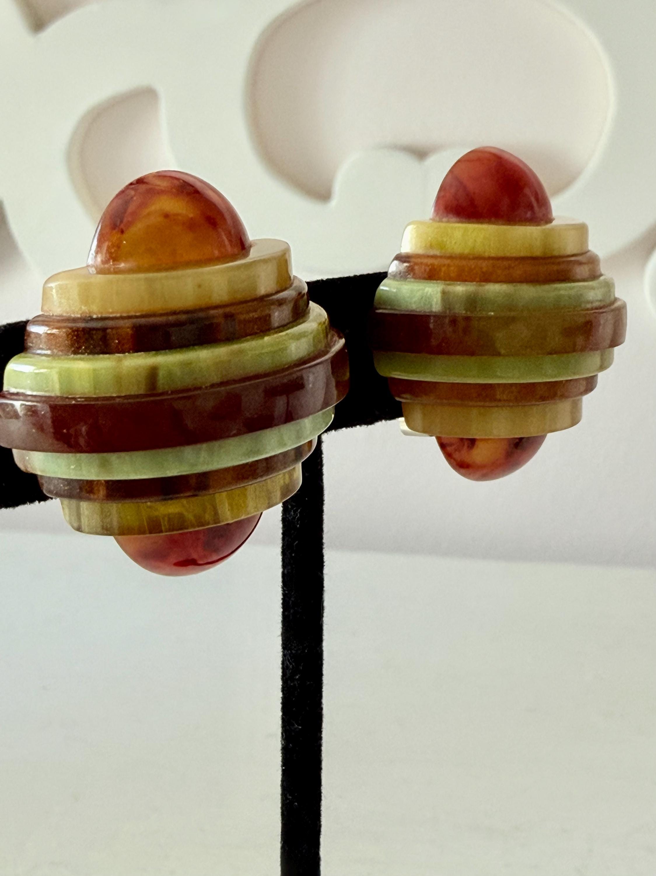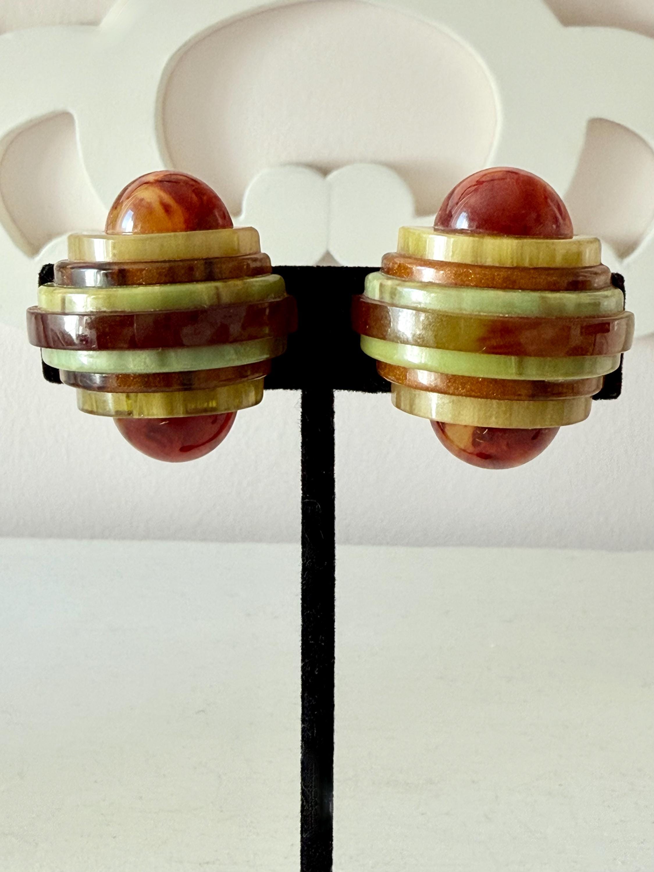 This listing is for a unique and wonderful pair of Art Deco vintage earrings. Measuring 1 3/16" high and 1 1/16" wide, the earring features nine layers of Bakelite including root beer, spinach, and apple juice shades. They are highly domed, peaking at 1/2". They are in excellent condition with secure and comfortable clip backs. A terrific addition to your collection and highly wearable!