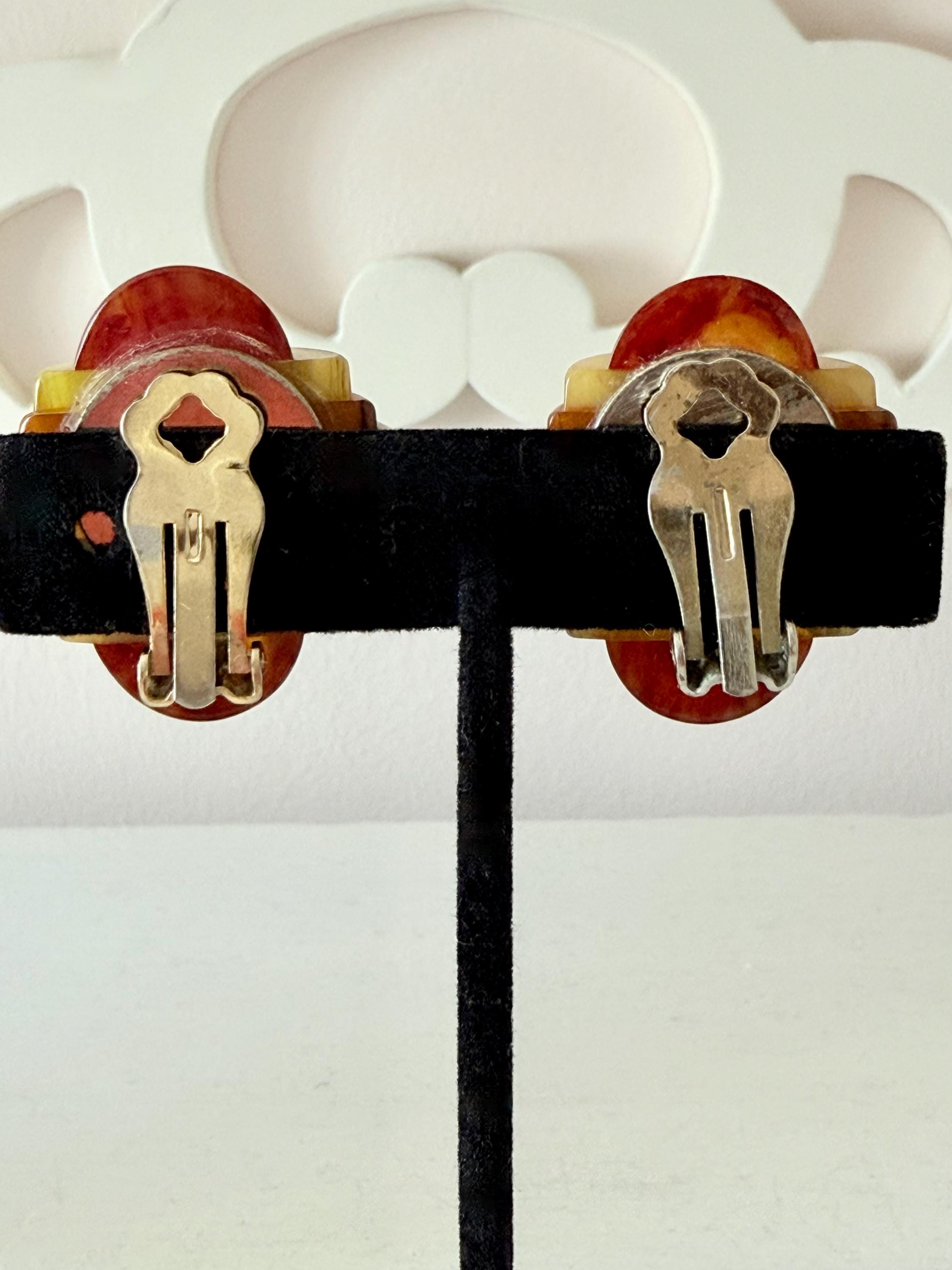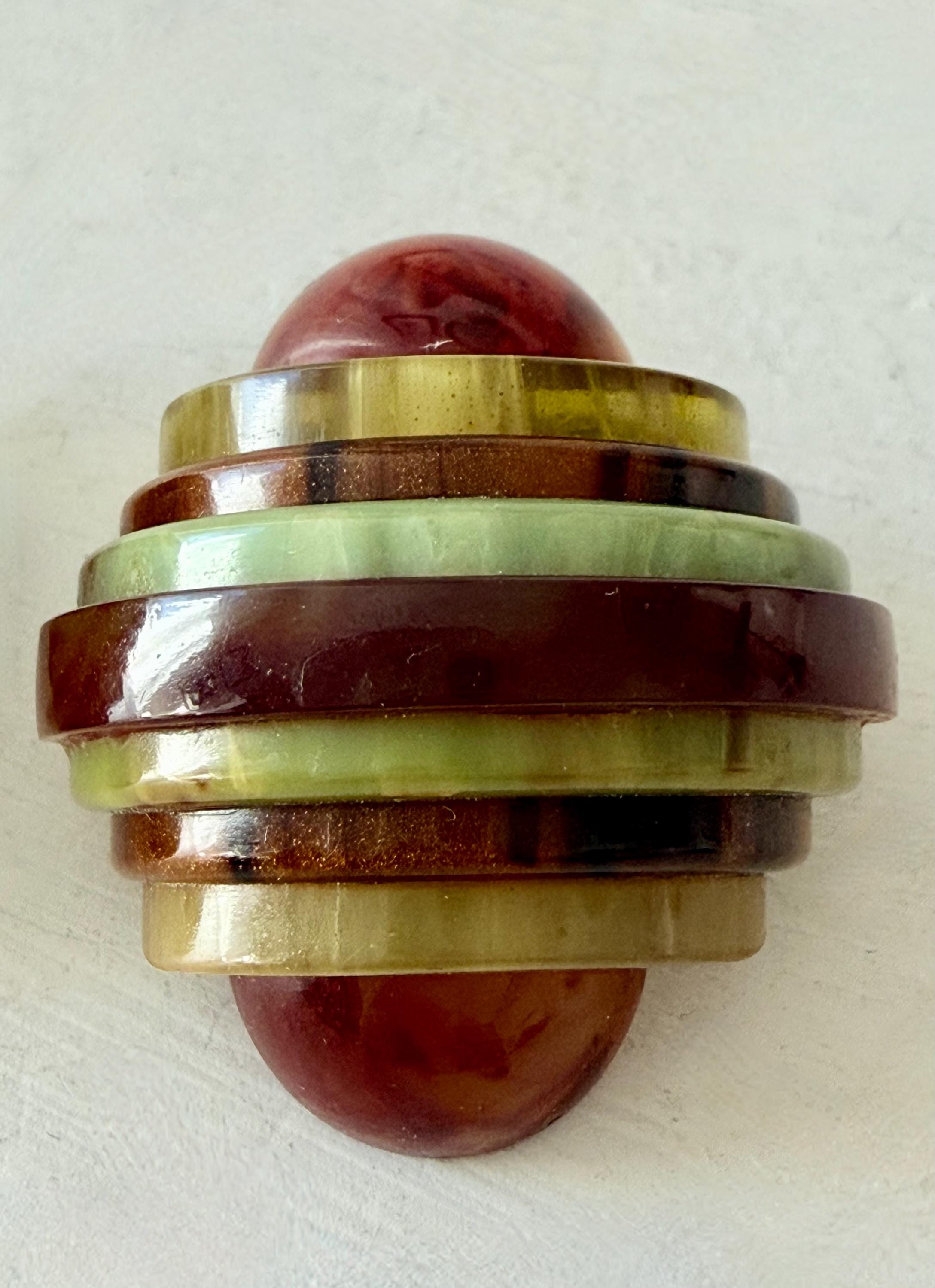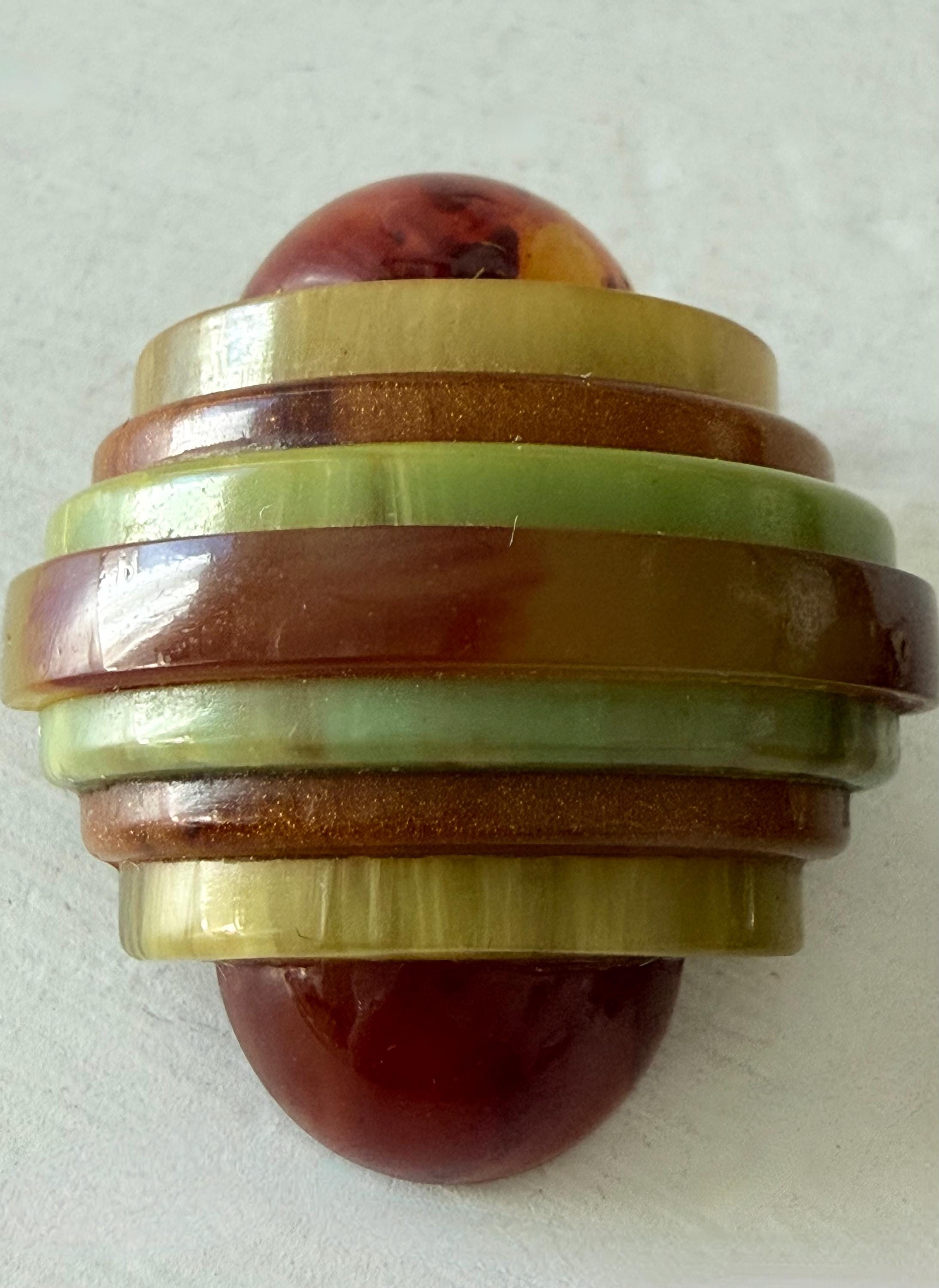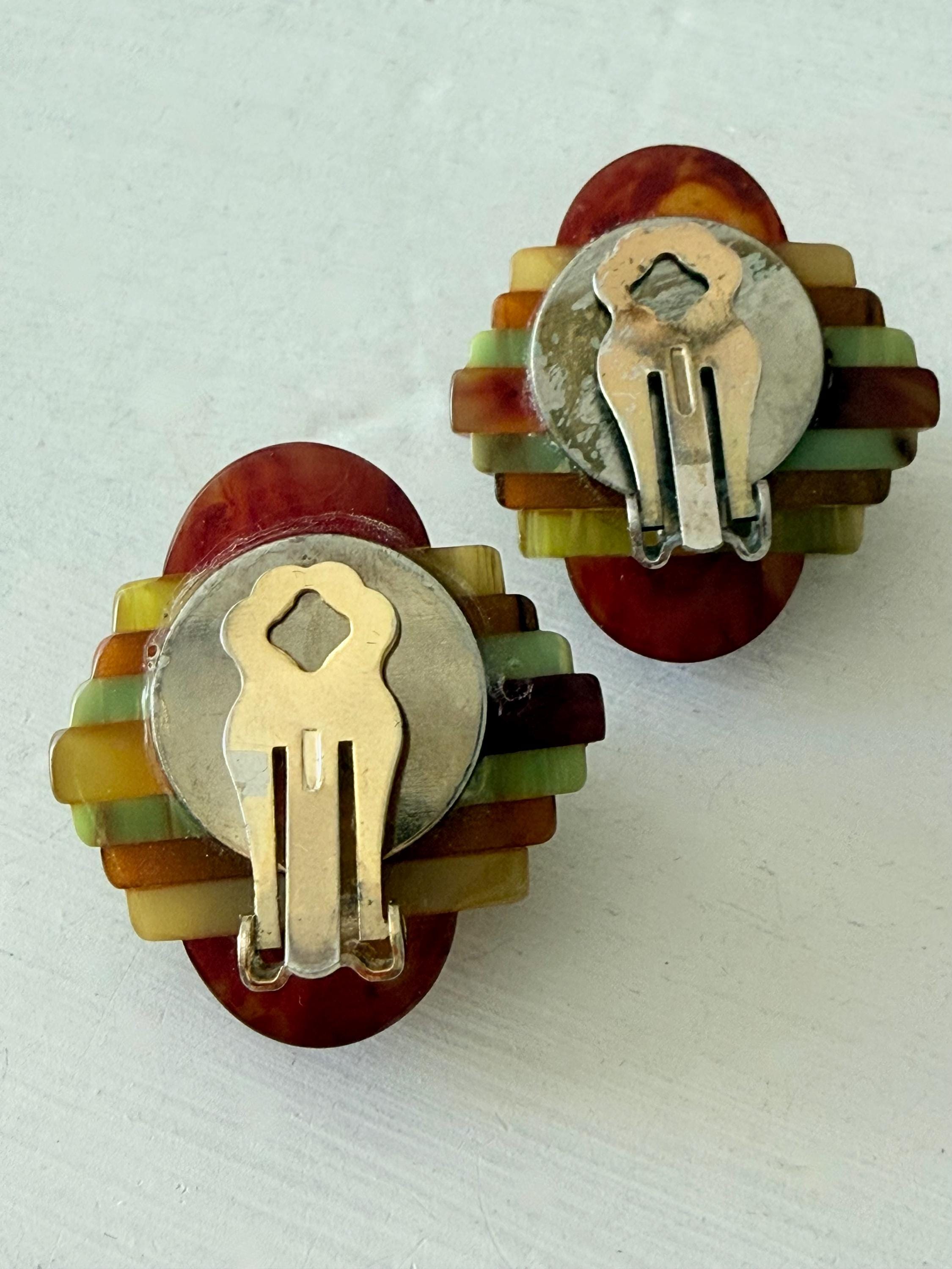 This listing is for a unique and wonderful pair of Art Deco vintage earrings. Measuring 1 3/16" high and 1 1/16" wide, the earring features nine layers of Bakelite including root beer, spinach, and apple juice shades. They are highly domed, peaking at 1/2". They are in excellent condition with secure and comfortable clip backs. A terrific addition to your collection and highly wearable!