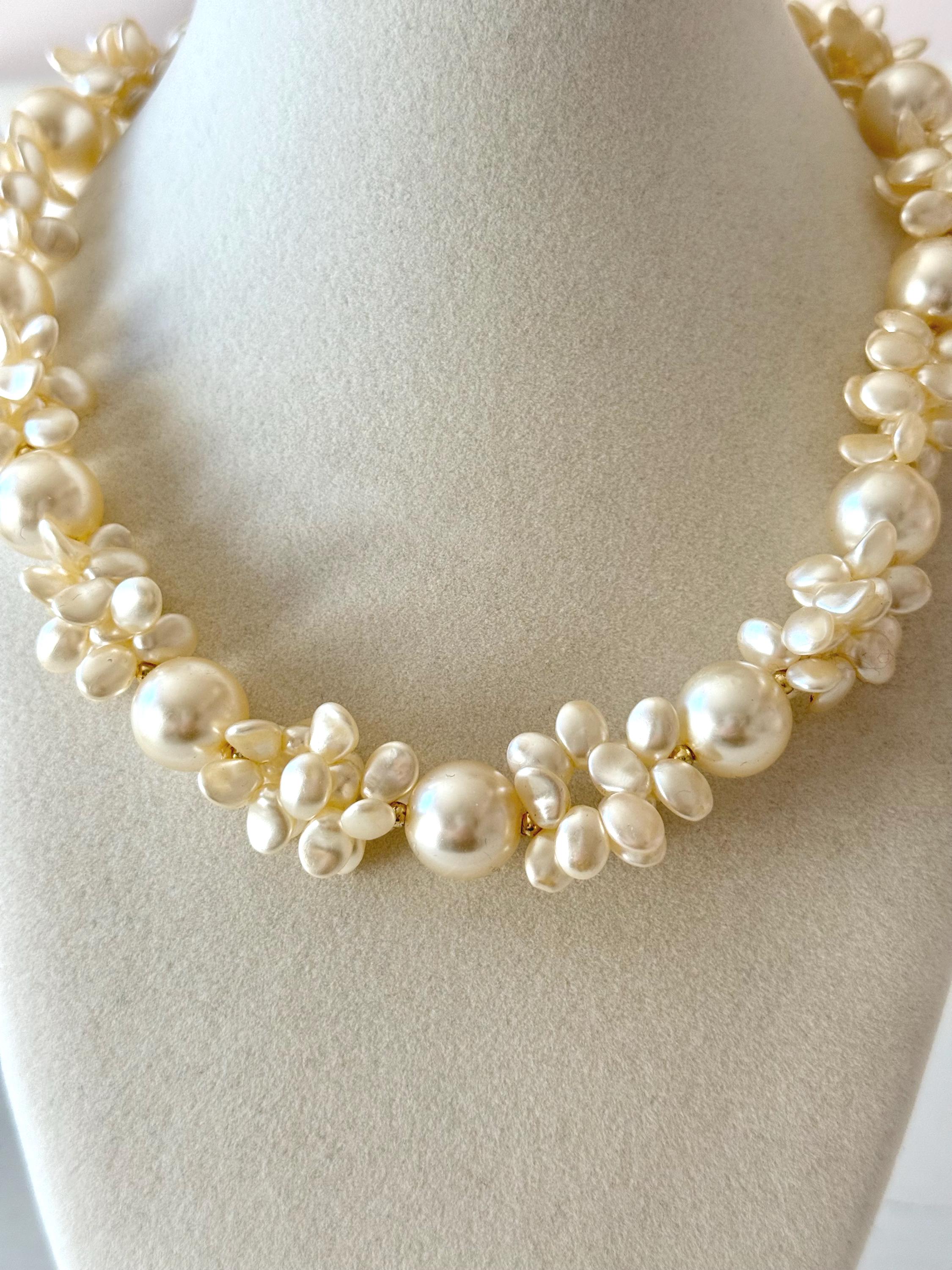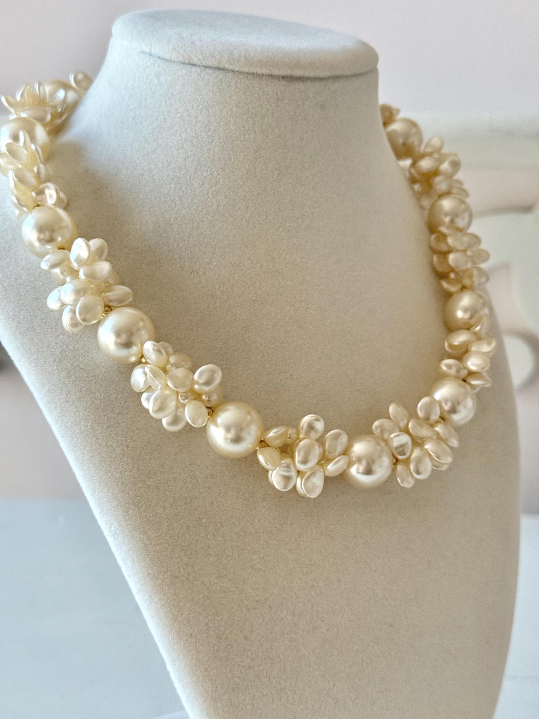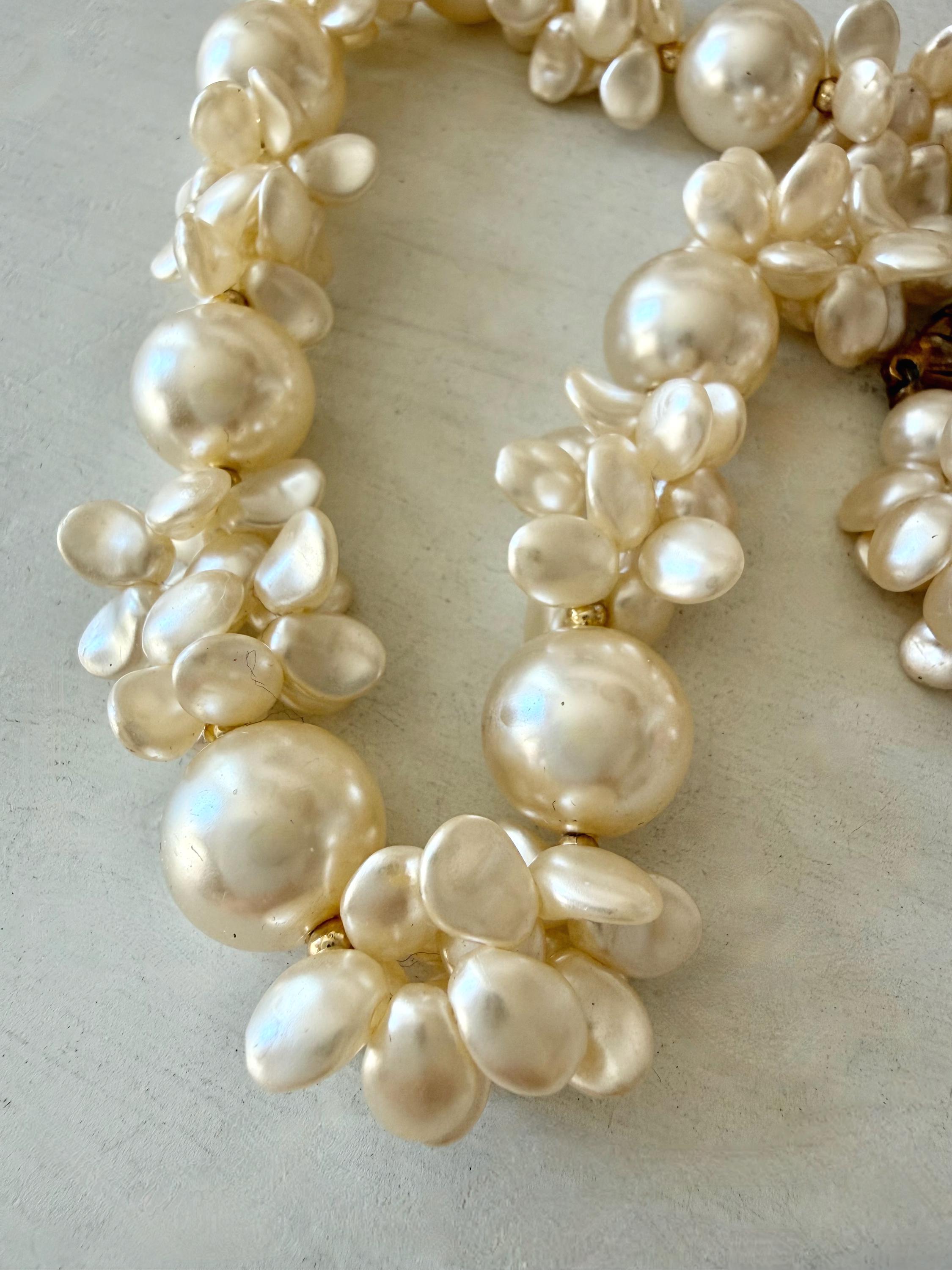 This listing is for a very pretty vintage necklace, unsigned. Measuring 17 1/4" long and 5/8" at its widest, the necklace features gorgeous, glossy, ivory-colored acrylic beads between clusters of seed shaped beads. The clasp is secure and it is in excellent condition. It is very lightweight so you barely know that you are wearing it. It will not, however, go unnoticed! This one is beautiful!