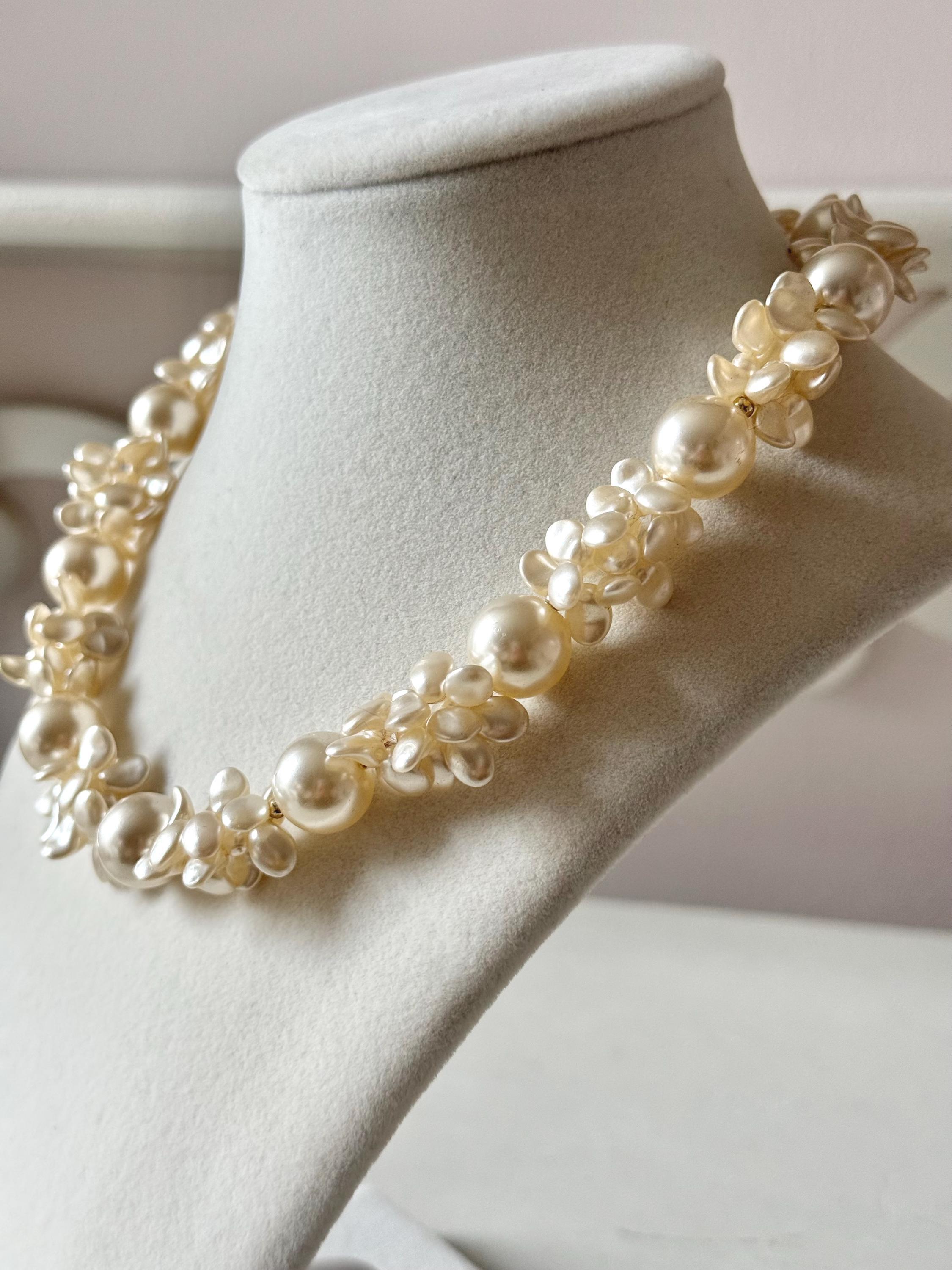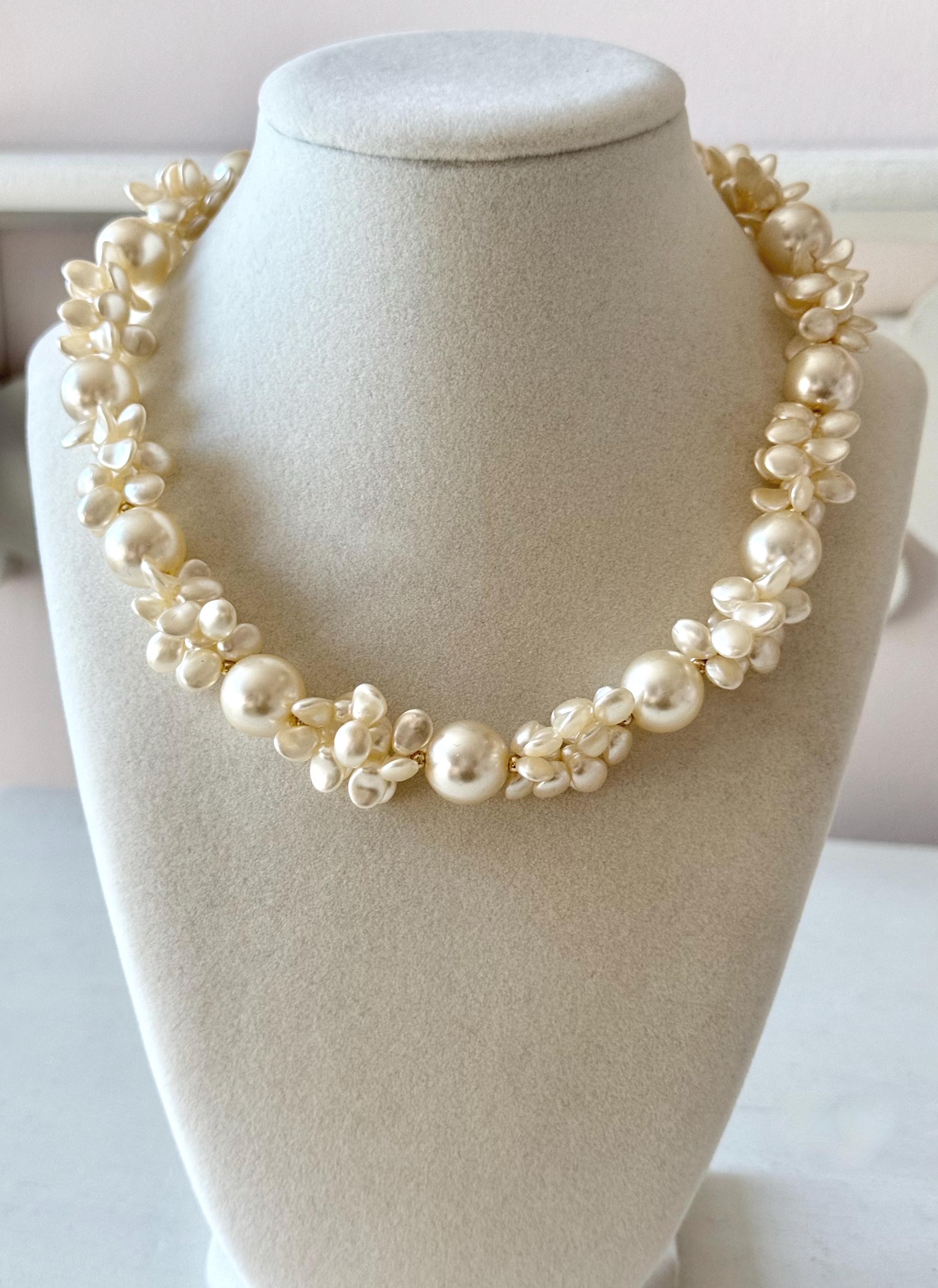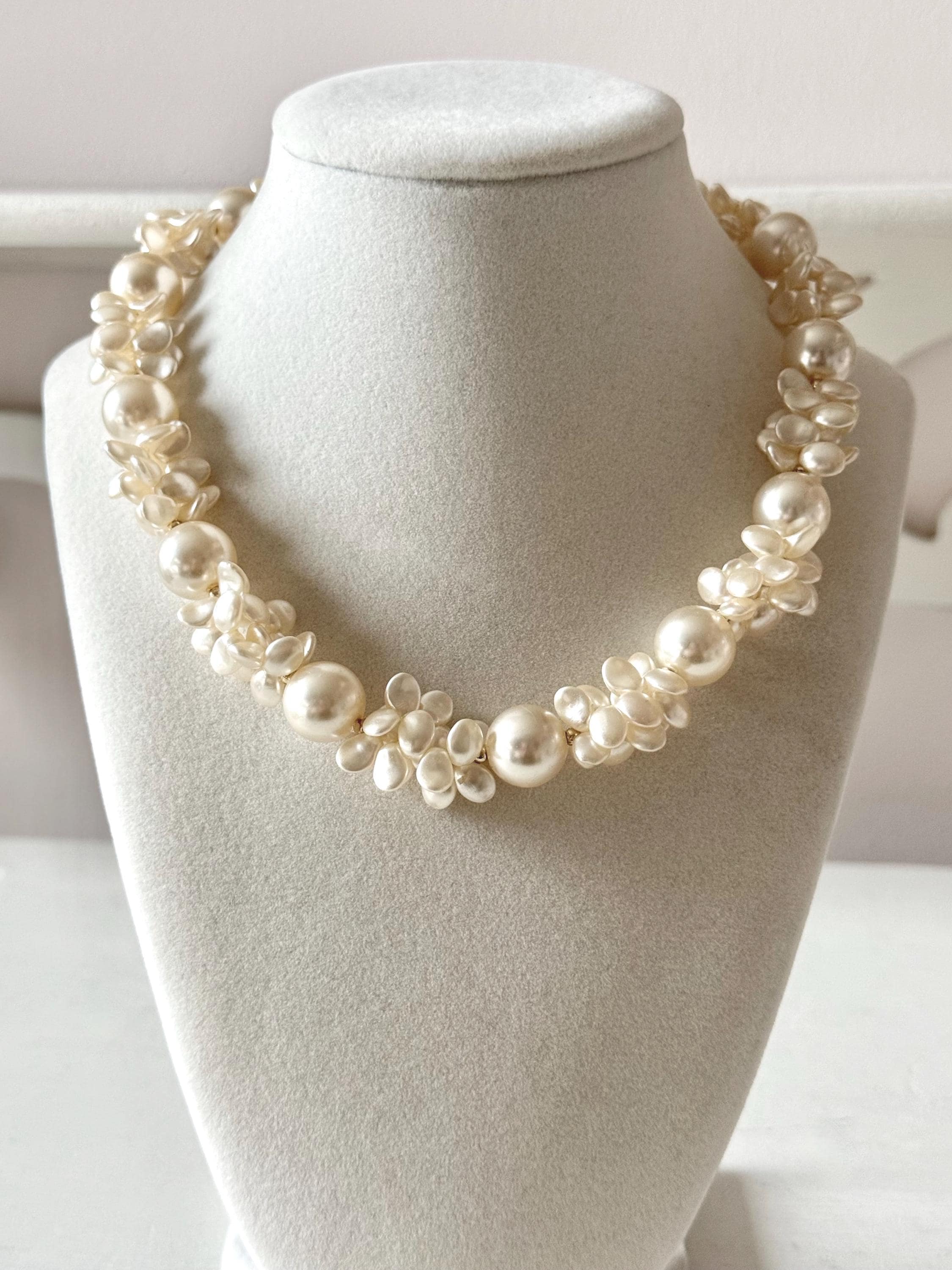 This listing is for a very pretty vintage necklace, unsigned. Measuring 17 1/4" long and 5/8" at its widest, the necklace features gorgeous, glossy, ivory-colored acrylic beads between clusters of seed shaped beads. The clasp is secure and it is in excellent condition. It is very lightweight so you barely know that you are wearing it. It will not, however, go unnoticed! This one is beautiful!