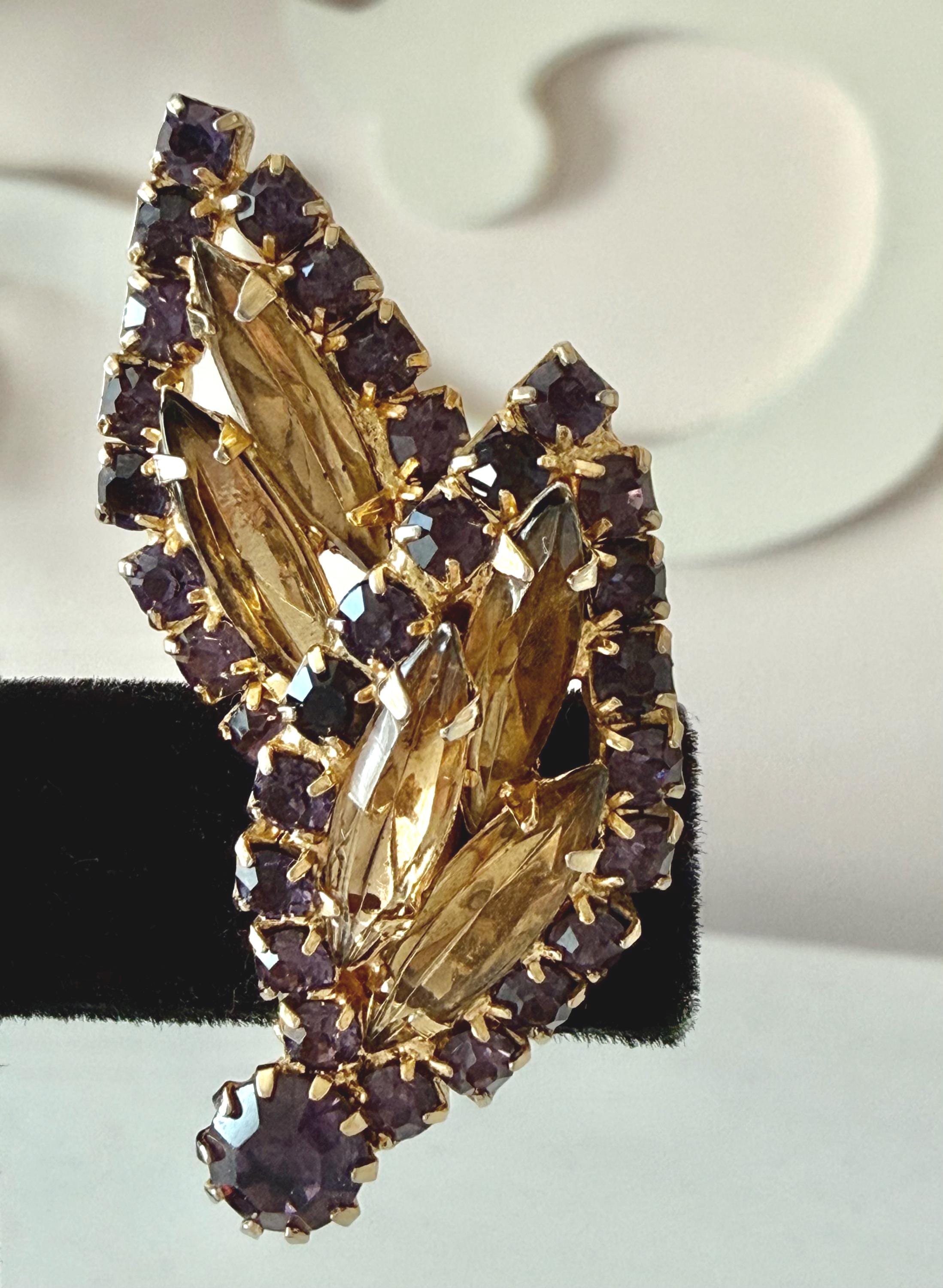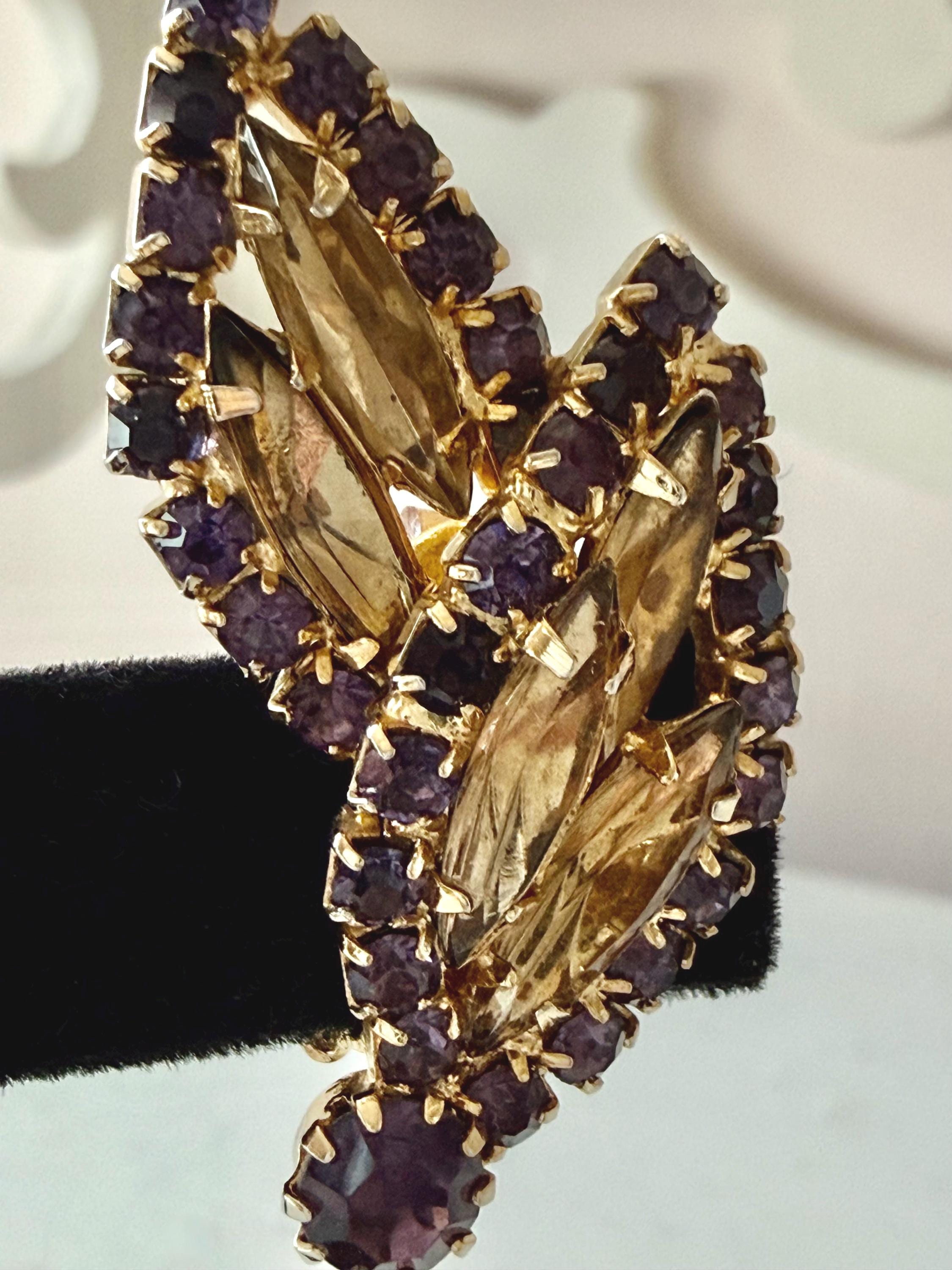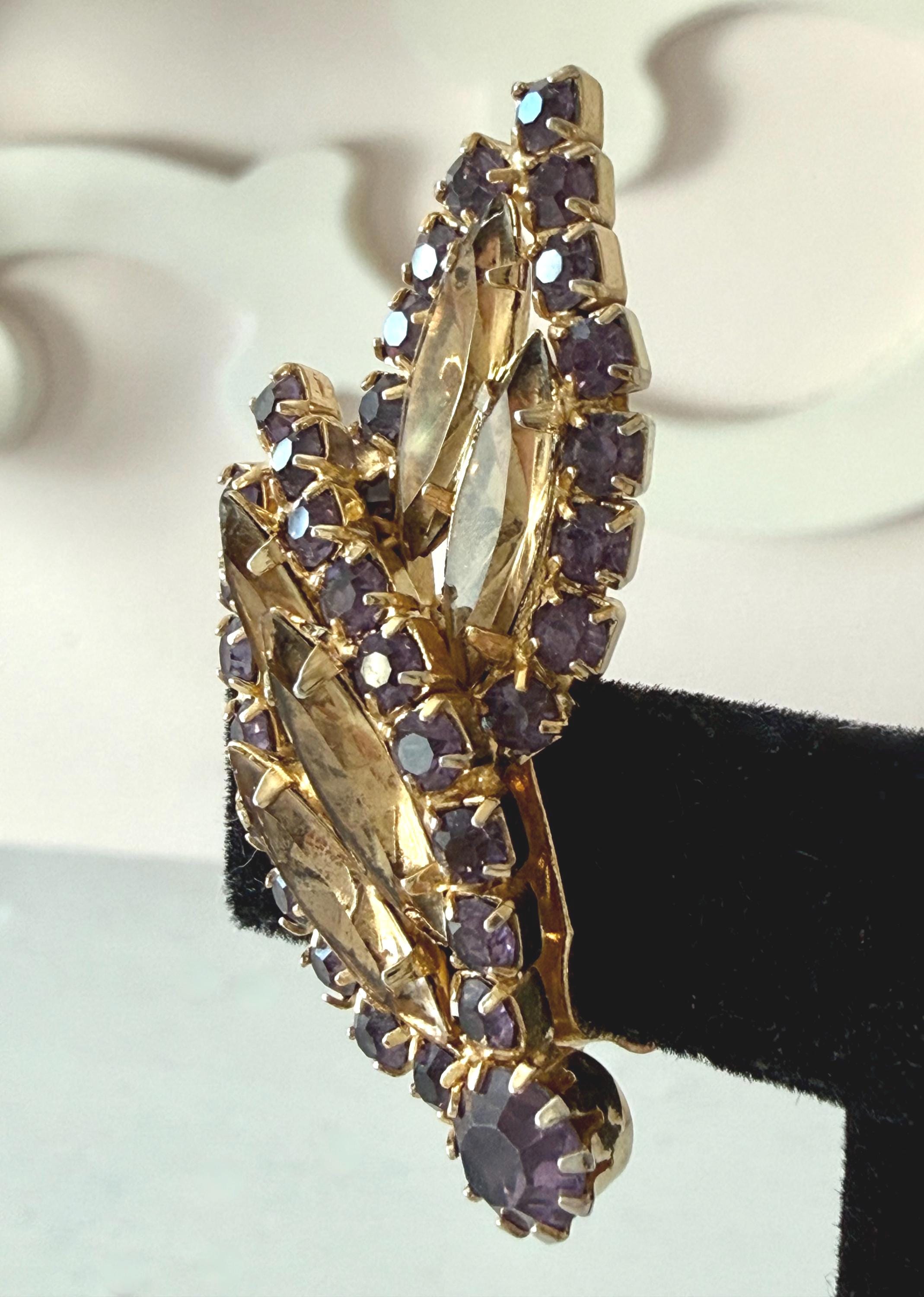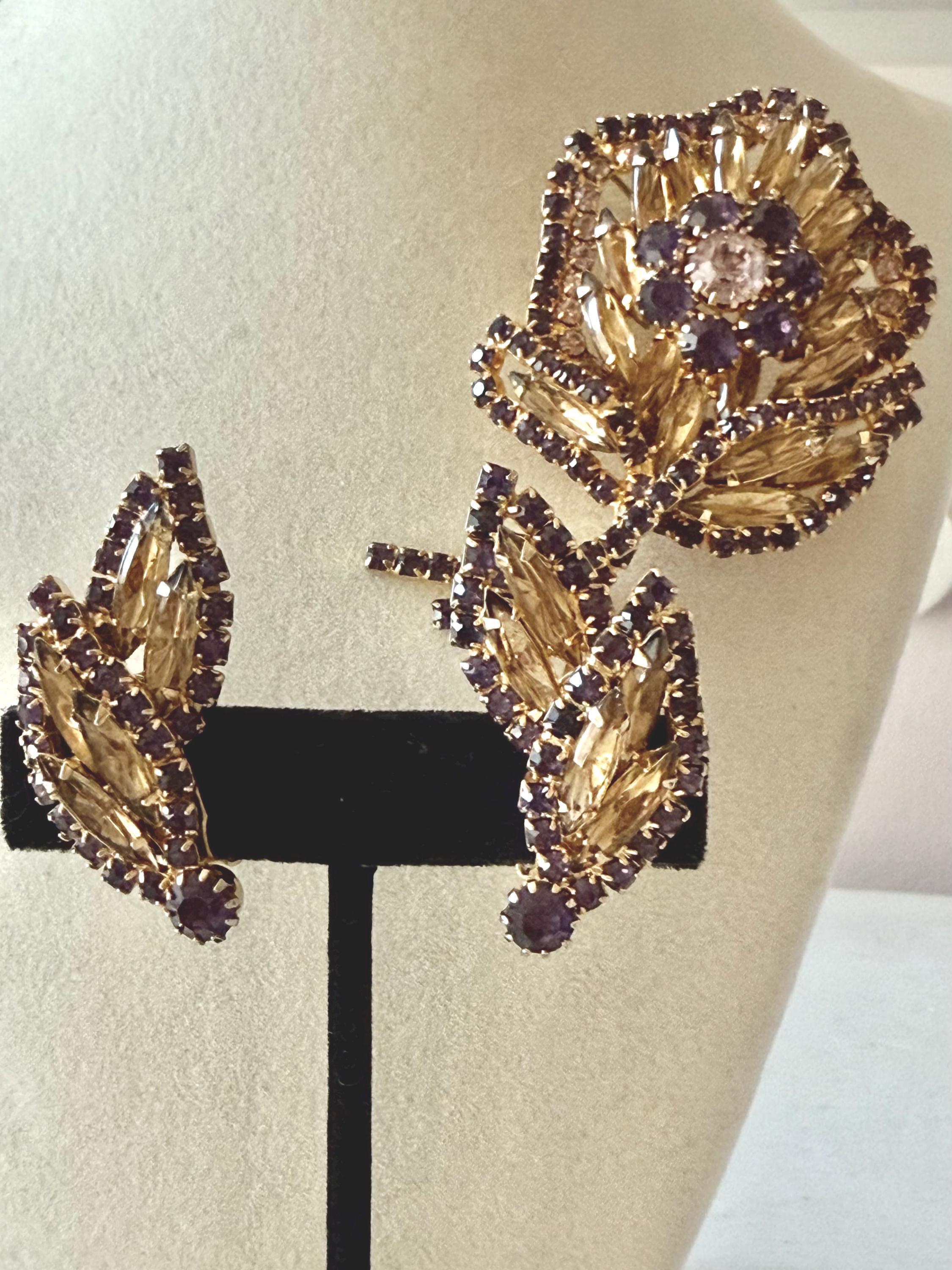 This listing is for a gorgeous vintage set of brooch and earrings by Hobe. The gold tone floral brooch is 2 3/4" high and just under 2" at its widest. The curvy design is edged with prong-set deep bluish-purple and very pale lavender stones. Then a layer of sparkling, golden navettes topped with larger purple and a pale lavender stone. The earrings mimic the leaf design in the brooch and are nearly 1 3/4" high, curving beautifully up the ear. All stones are intact, clip backs and clasp are secure, and the pieces are, overall, in excellent condition.
