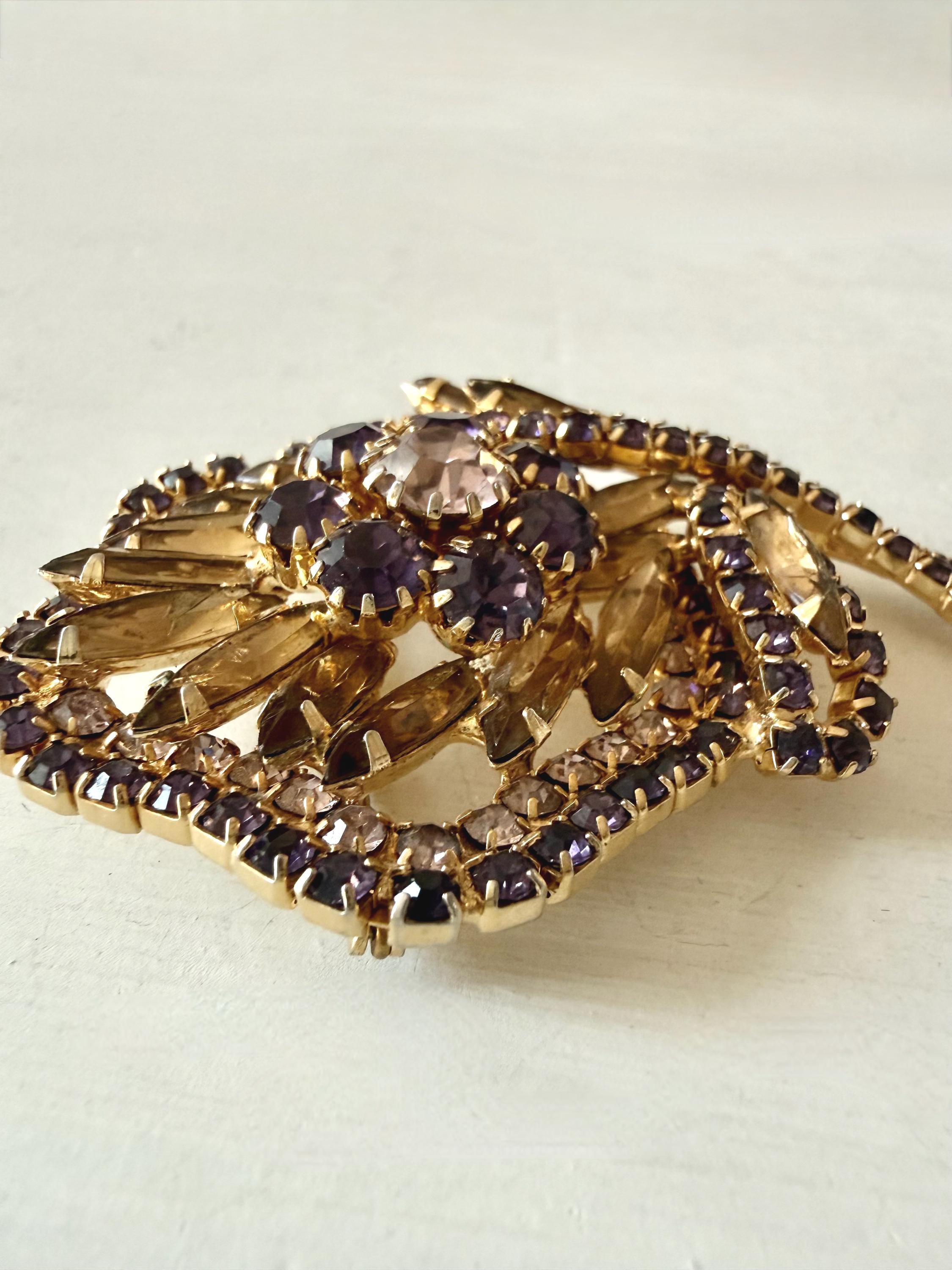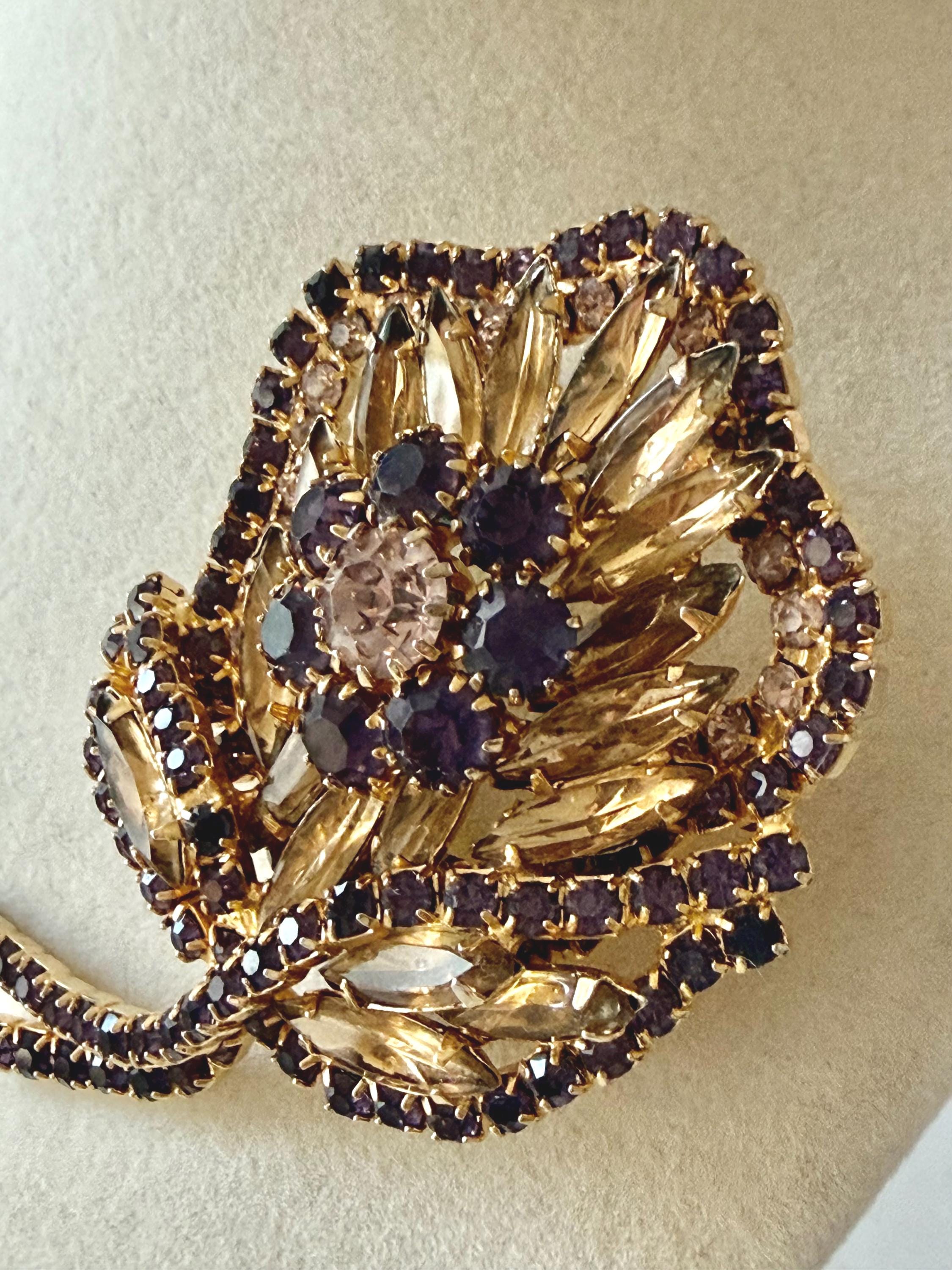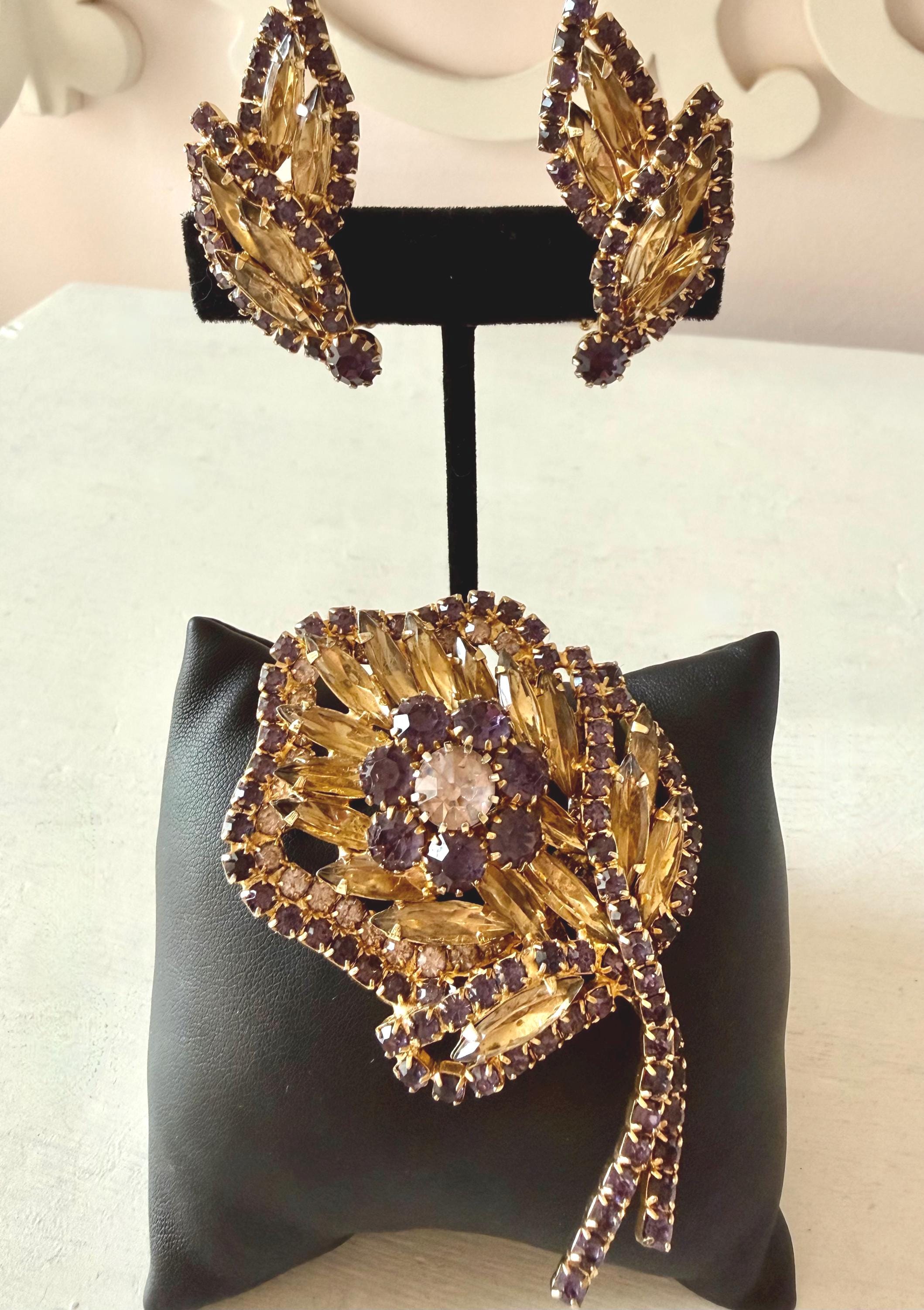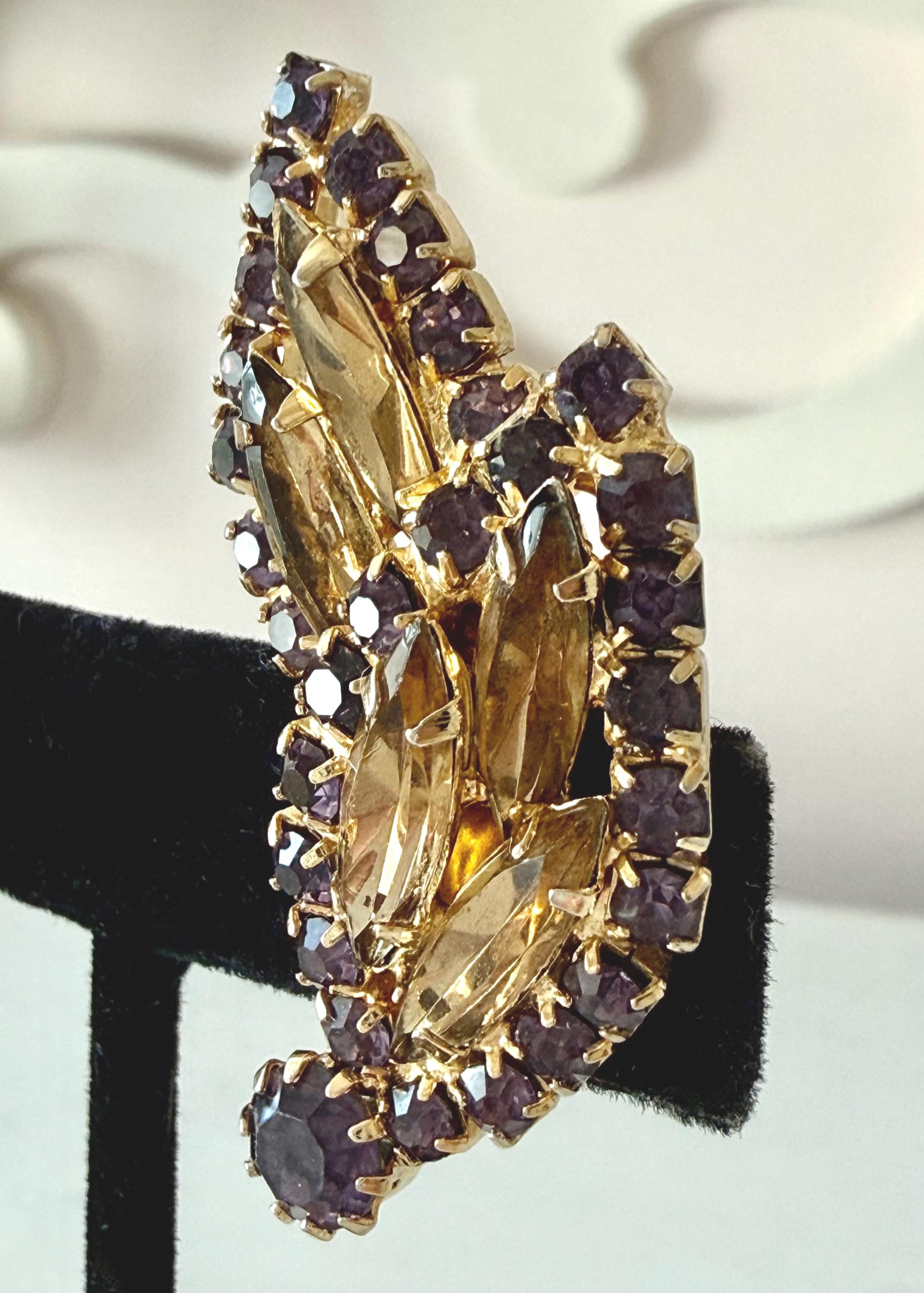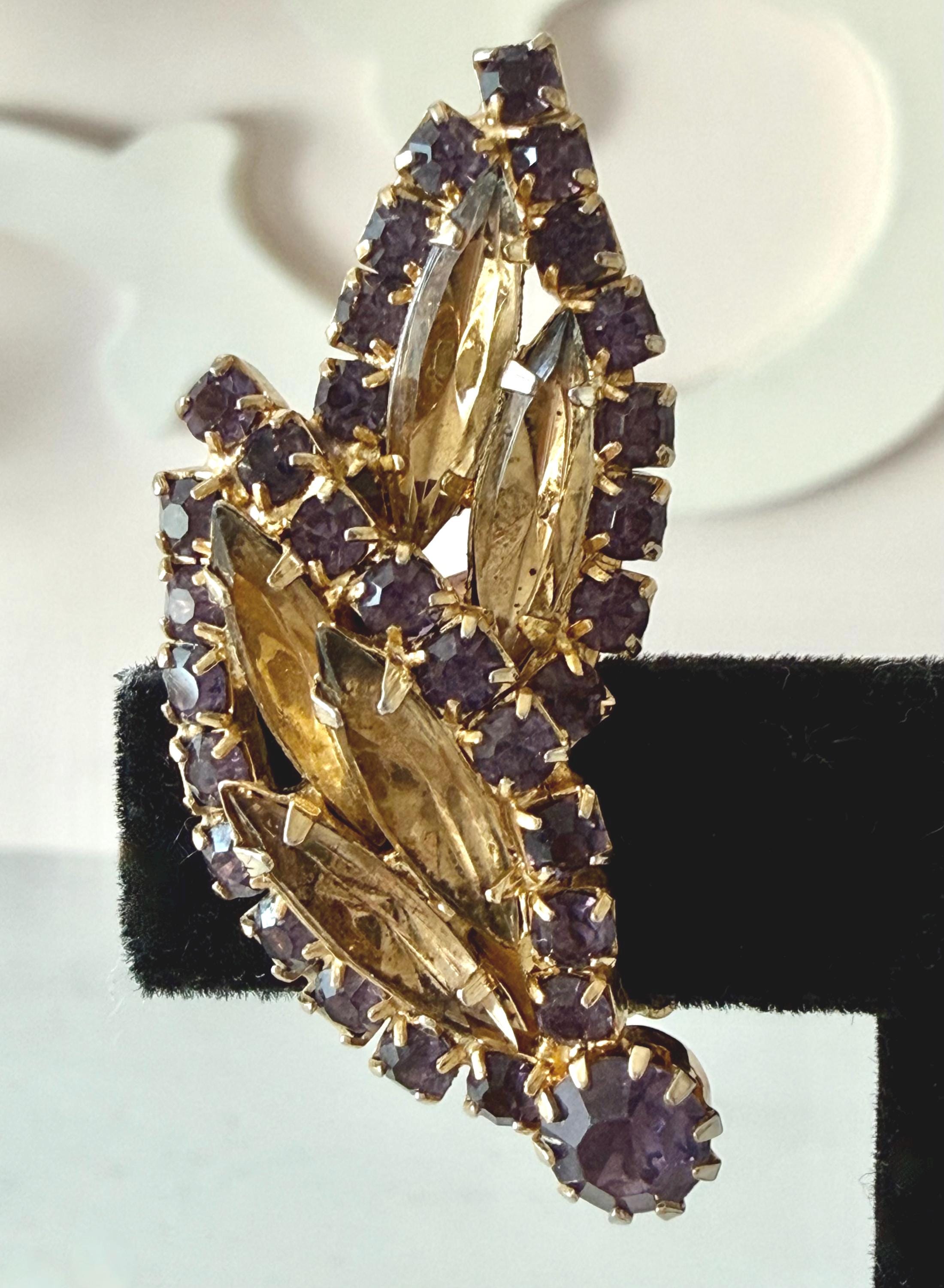 This listing is for a gorgeous vintage set of brooch and earrings by Hobe. The gold tone floral brooch is 2 3/4" high and just under 2" at its widest. The curvy design is edged with prong-set deep bluish-purple and very pale lavender stones. Then a layer of sparkling, golden navettes topped with larger purple and a pale lavender stone. The earrings mimic the leaf design in the brooch and are nearly 1 3/4" high, curving beautifully up the ear. All stones are intact, clip backs and clasp are secure, and the pieces are, overall, in excellent condition.