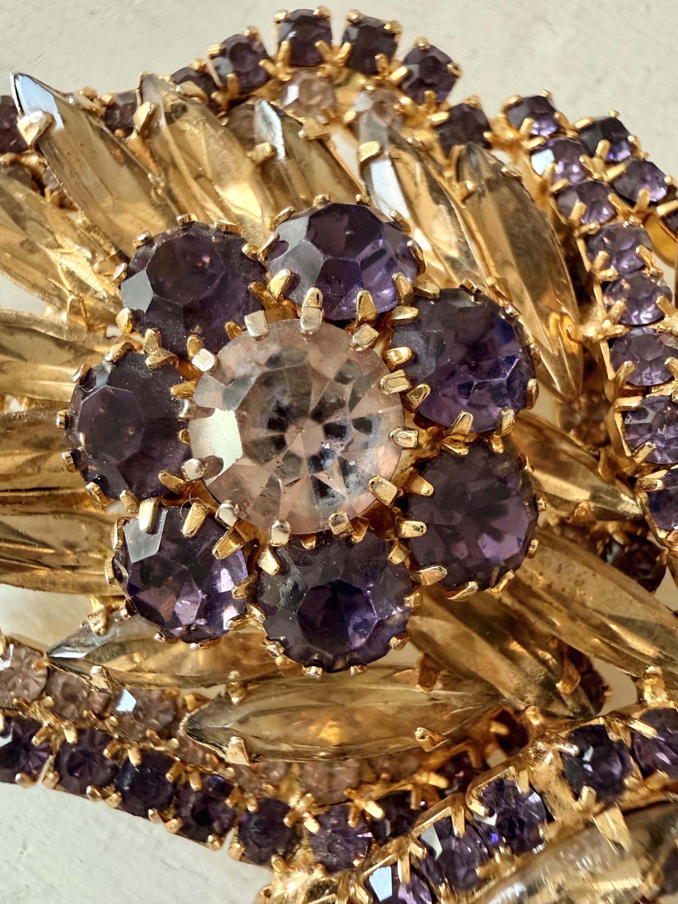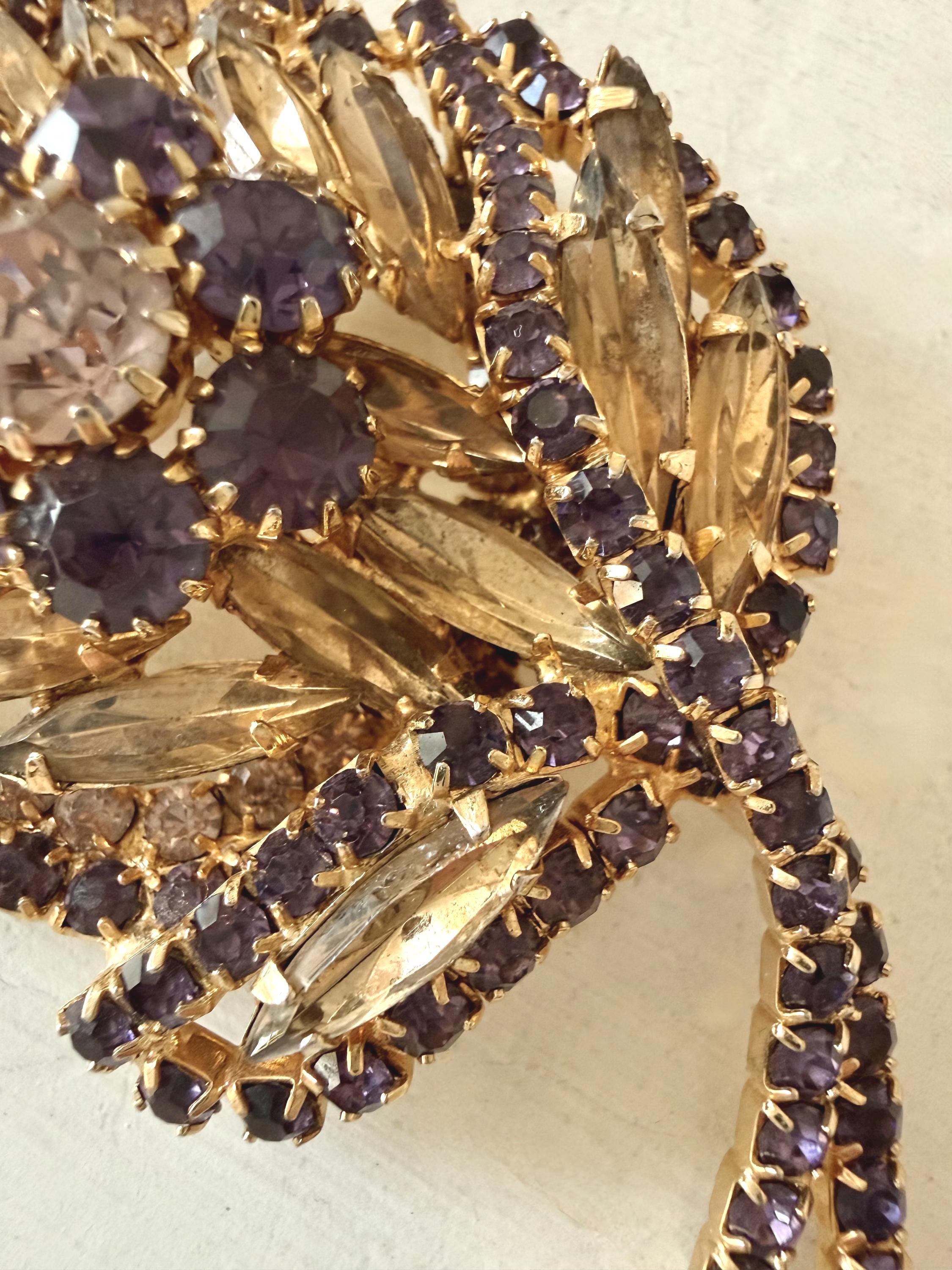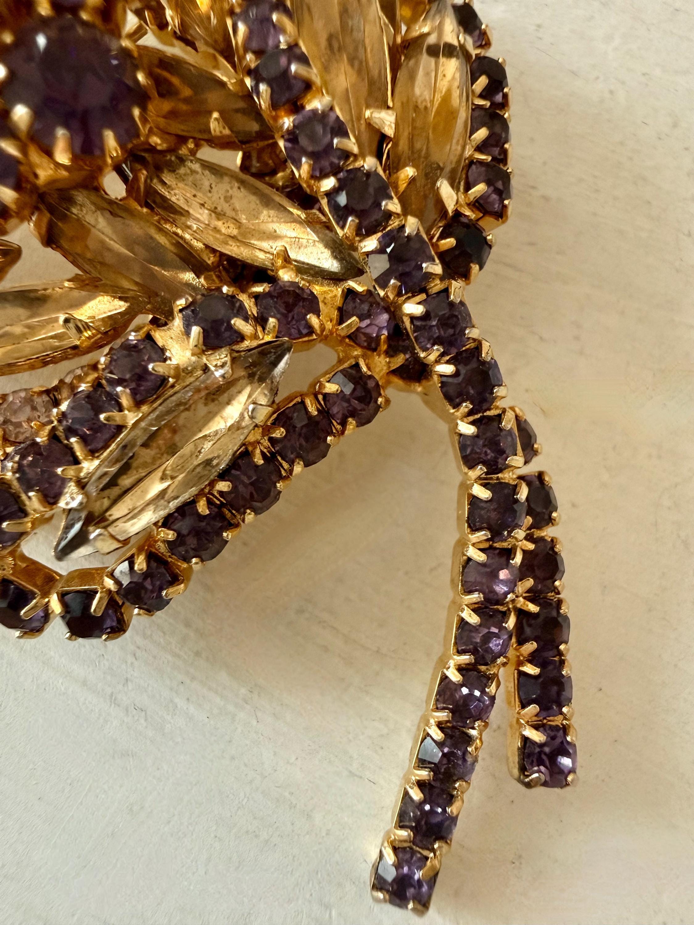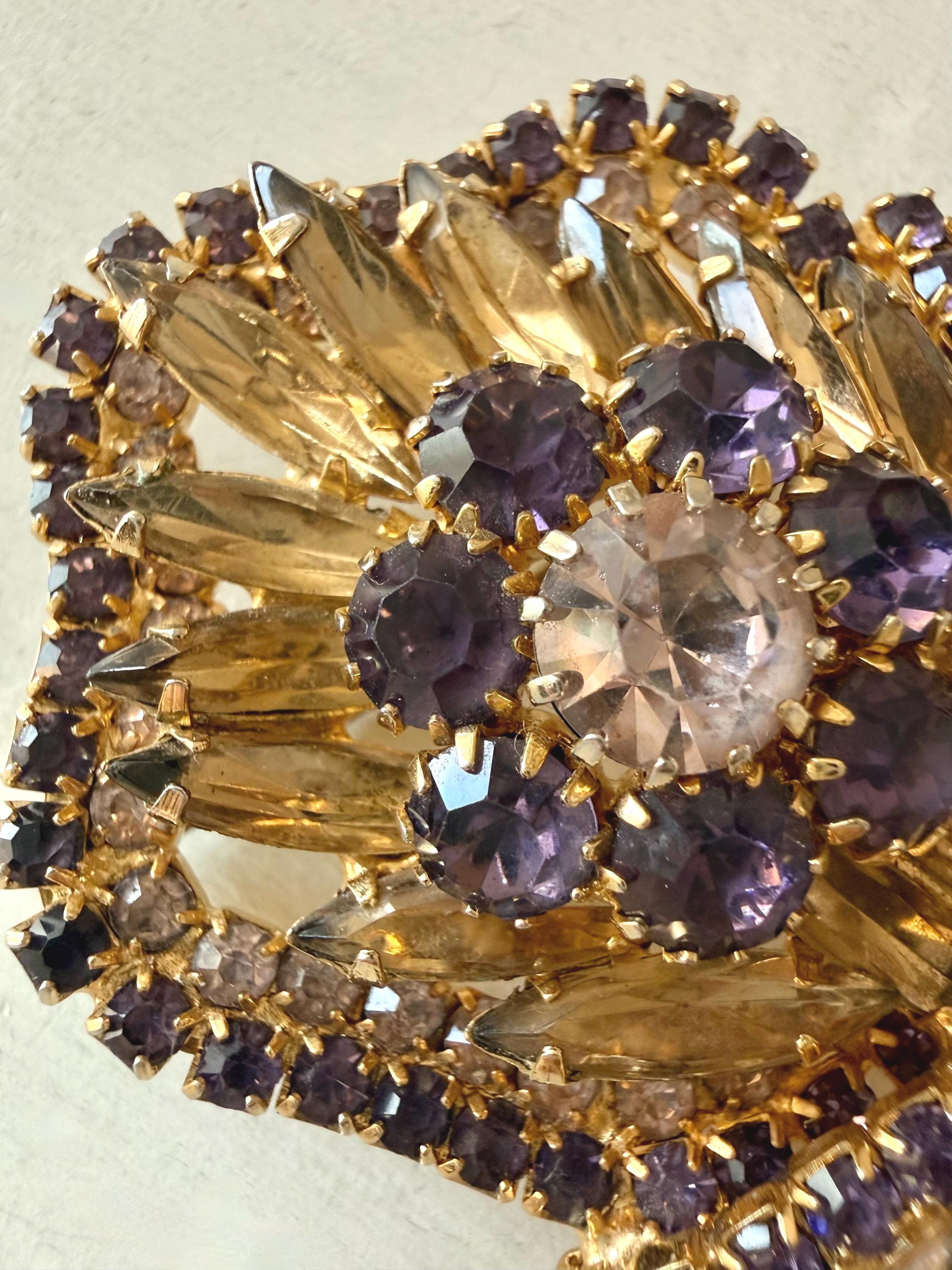 This listing is for a gorgeous vintage set of brooch and earrings by Hobe. The gold tone floral brooch is 2 3/4" high and just under 2" at its widest. The curvy design is edged with prong-set deep bluish-purple and very pale lavender stones. Then a layer of sparkling, golden navettes topped with larger purple and a pale lavender stone. The earrings mimic the leaf design in the brooch and are nearly 1 3/4" high, curving beautifully up the ear. All stones are intact, clip backs and clasp are secure, and the pieces are, overall, in excellent condition.