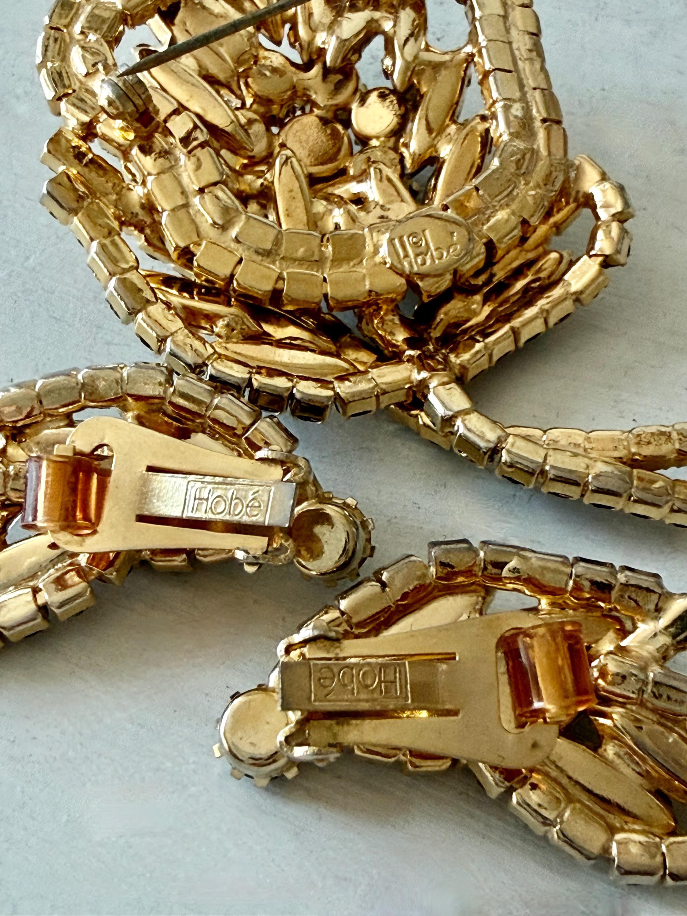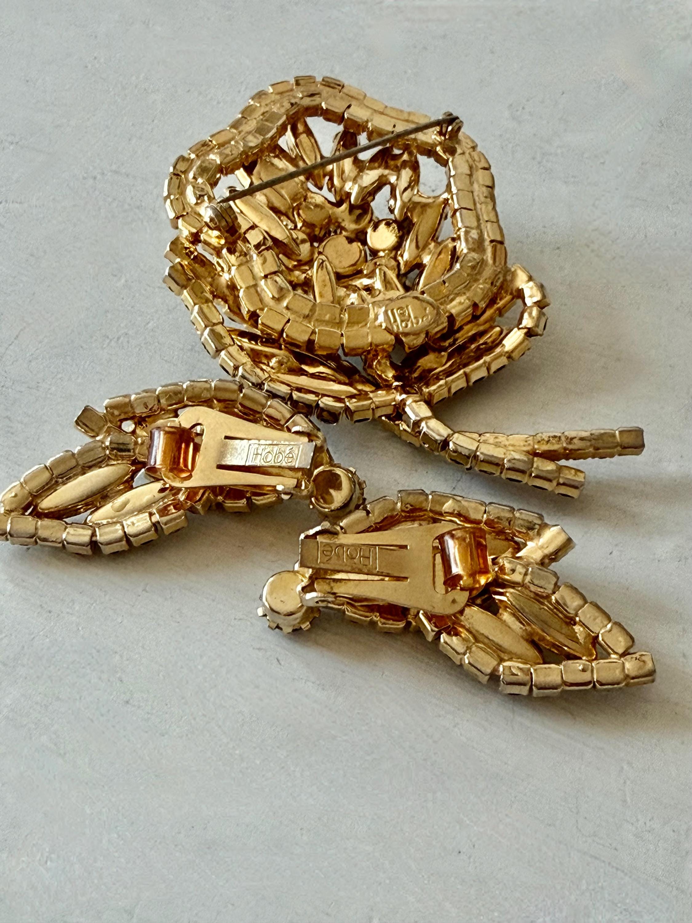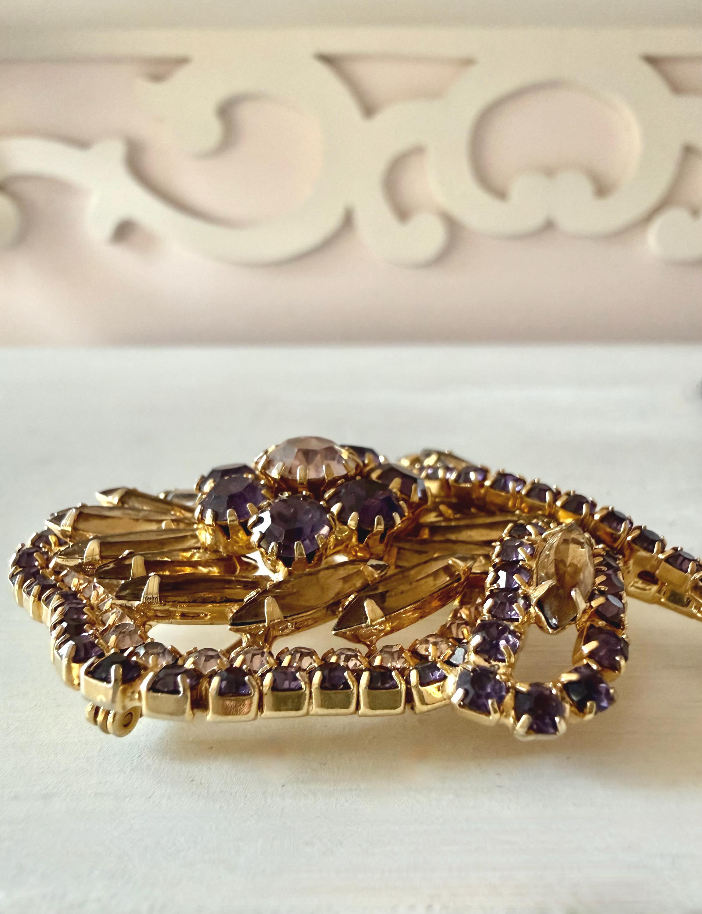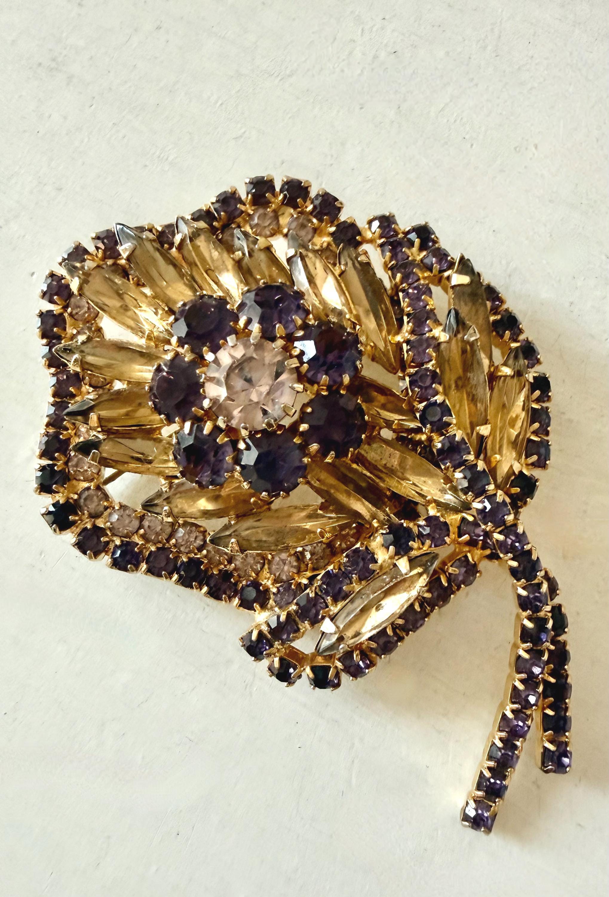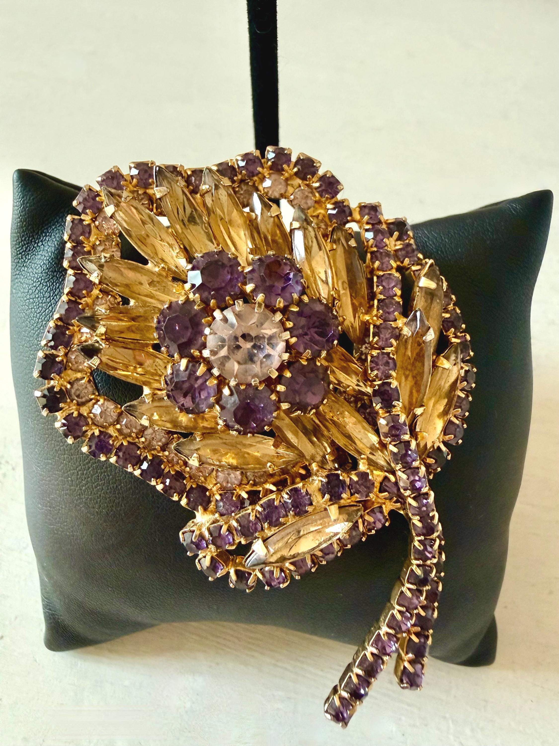 This listing is for a gorgeous vintage set of brooch and earrings by Hobe. The gold tone floral brooch is 2 3/4" high and just under 2" at its widest. The curvy design is edged with prong-set deep bluish-purple and very pale lavender stones. Then a layer of sparkling, golden navettes topped with larger purple and a pale lavender stone. The earrings mimic the leaf design in the brooch and are nearly 1 3/4" high, curving beautifully up the ear. All stones are intact, clip backs and clasp are secure, and the pieces are, overall, in excellent condition.