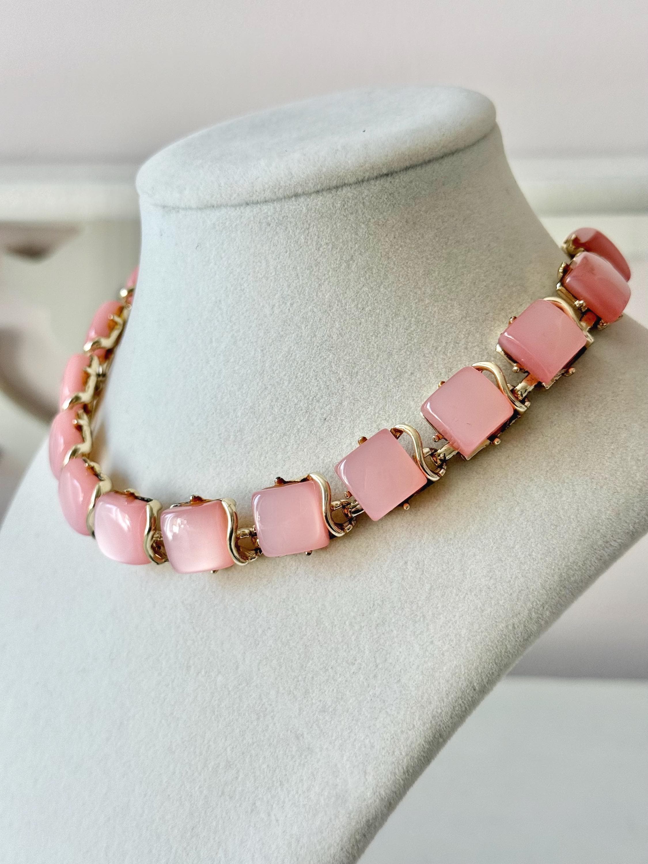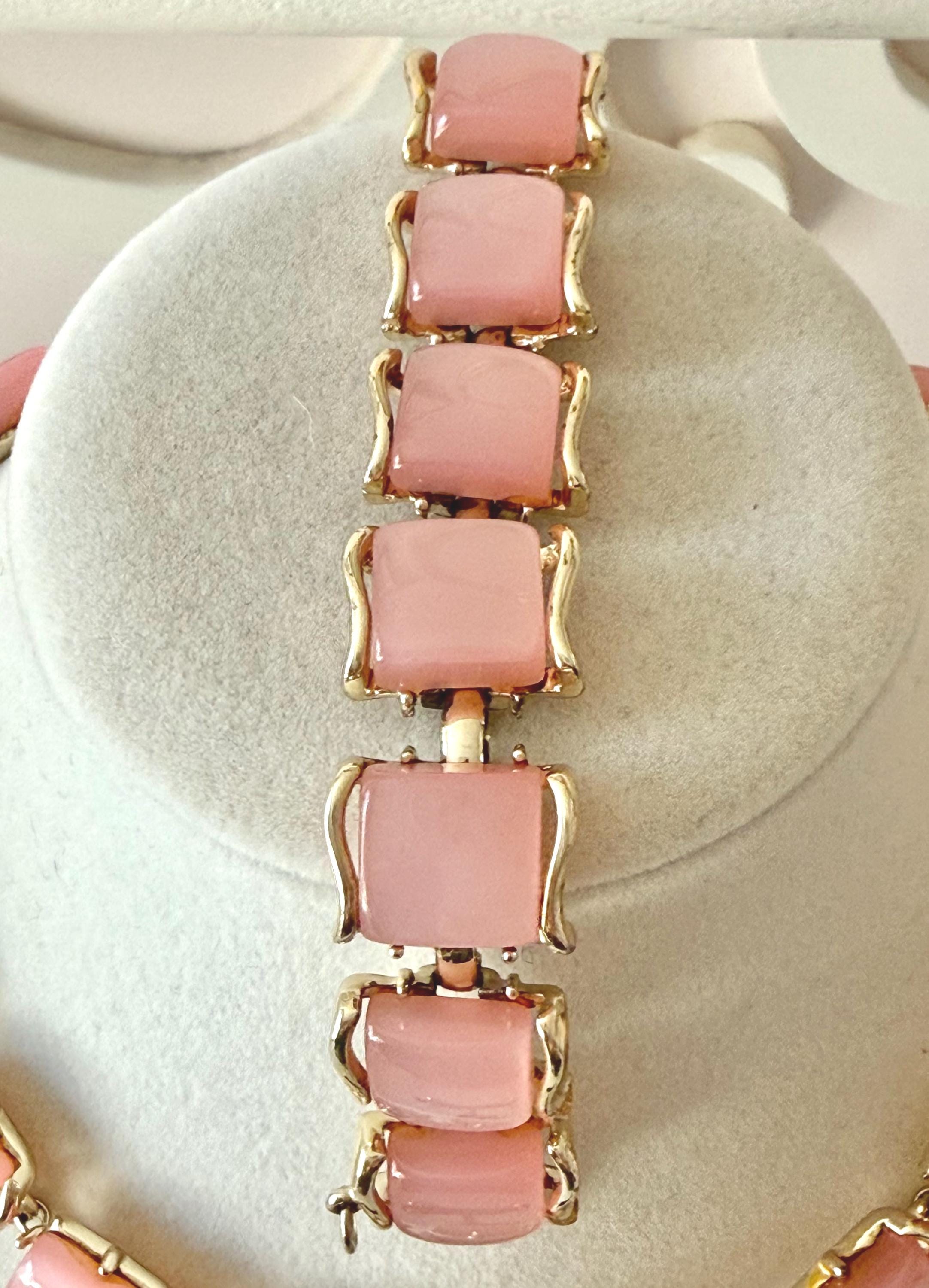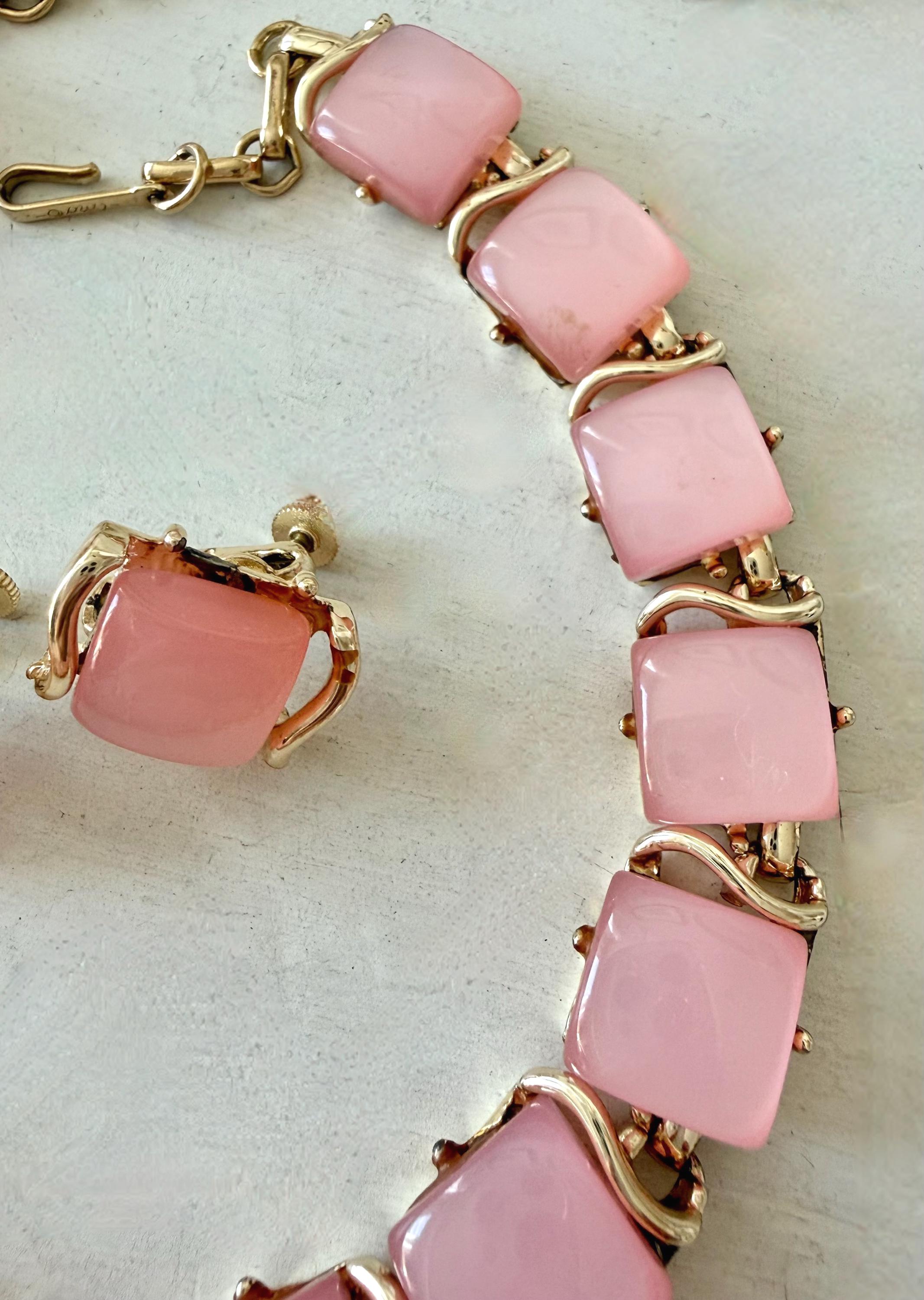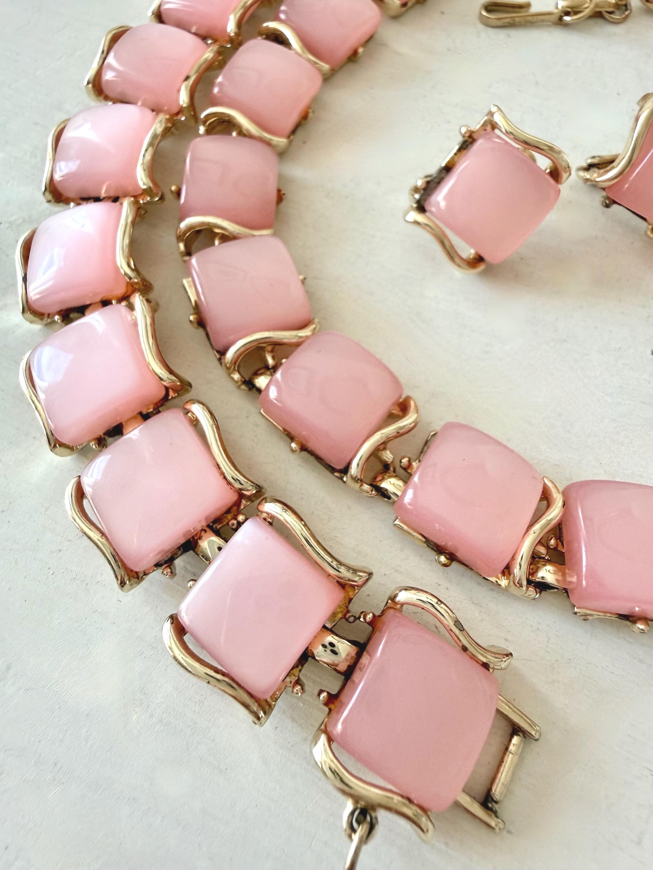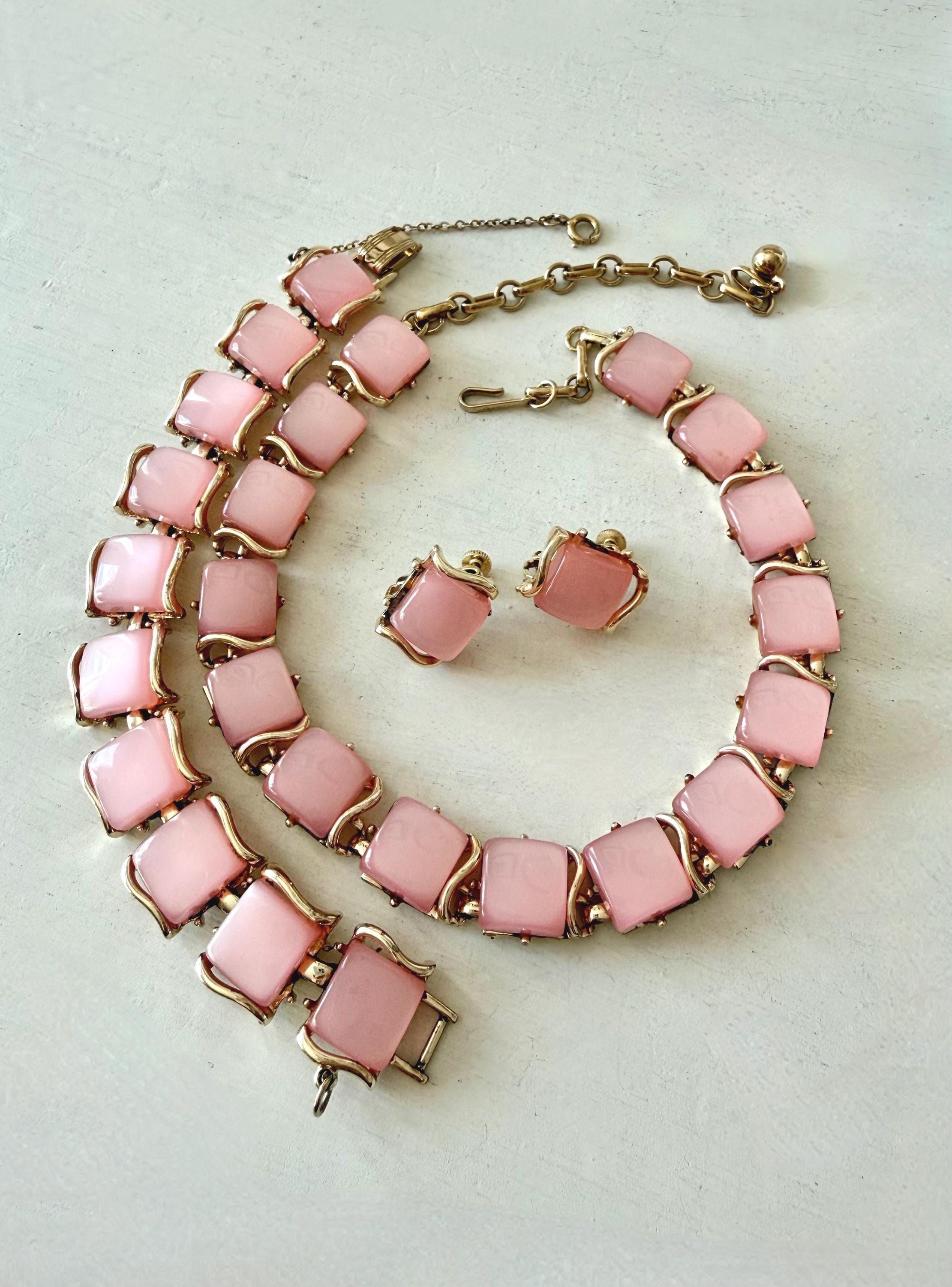 This listing is for a beautiful vintage parure by Coro that includes a necklace, bracelet, and earrings. The adjustable necklace measures 17" long and 1/2" wide, the bracelet is 7" long and 3/4" wide, and the earrings are 3/4" high and 7/8" wide. All pieces are signed. The moonglow thermoset stones are a gorgeous shade of pink and are all in excellent condition. The hook, clasp, and clip backs are secure and the bracelet has a safety chain. A beautiful set that glows with warmth!