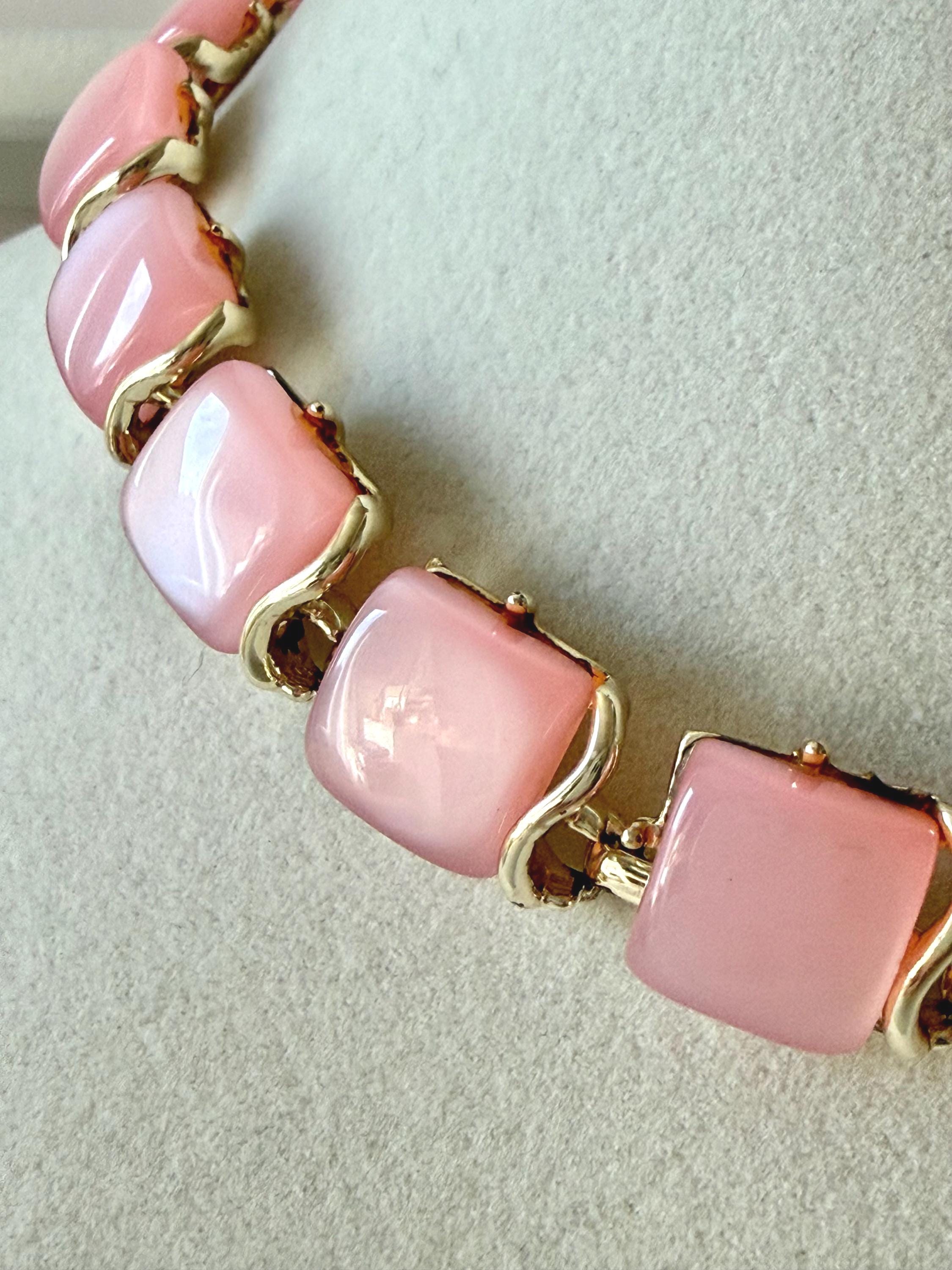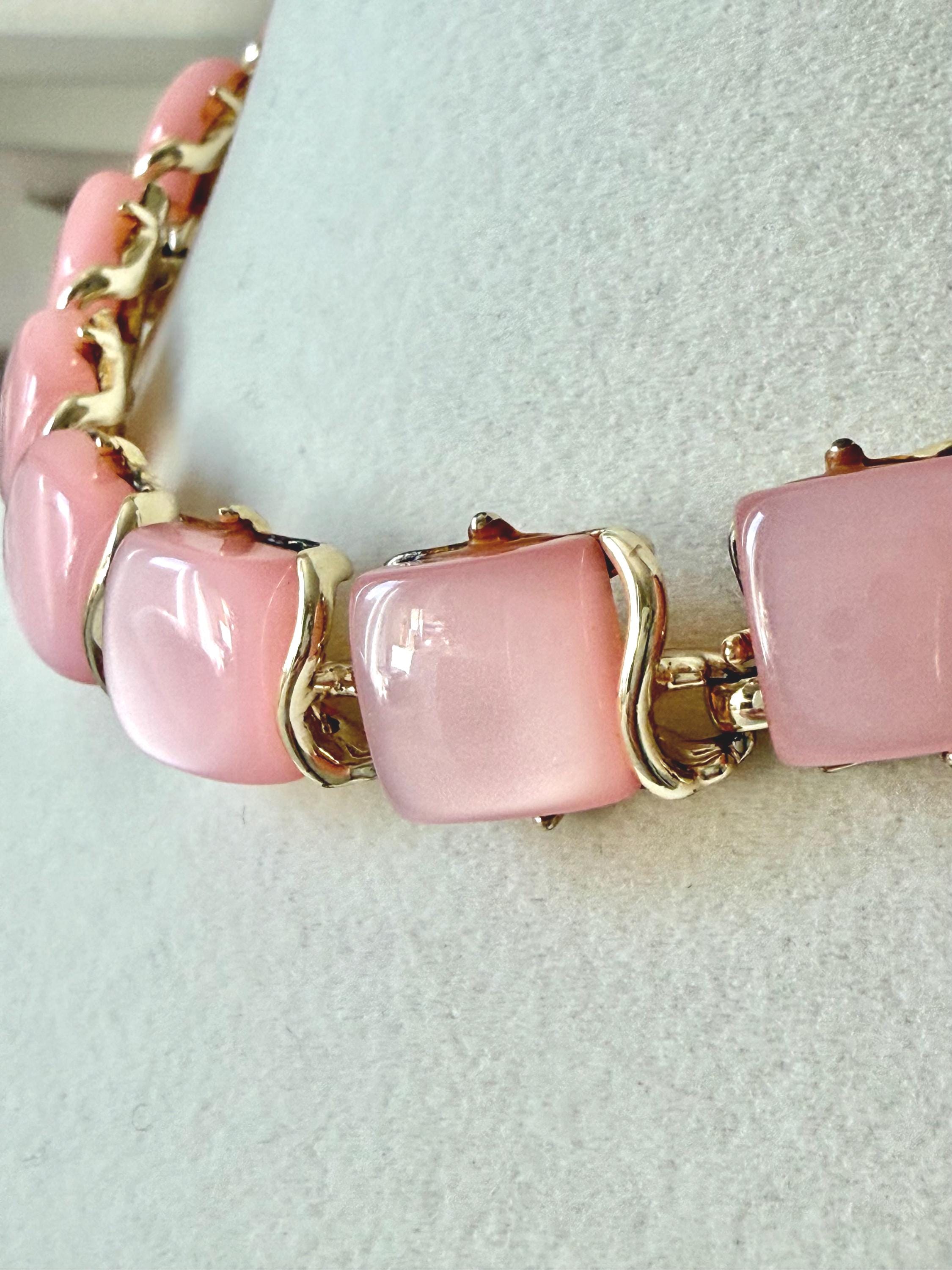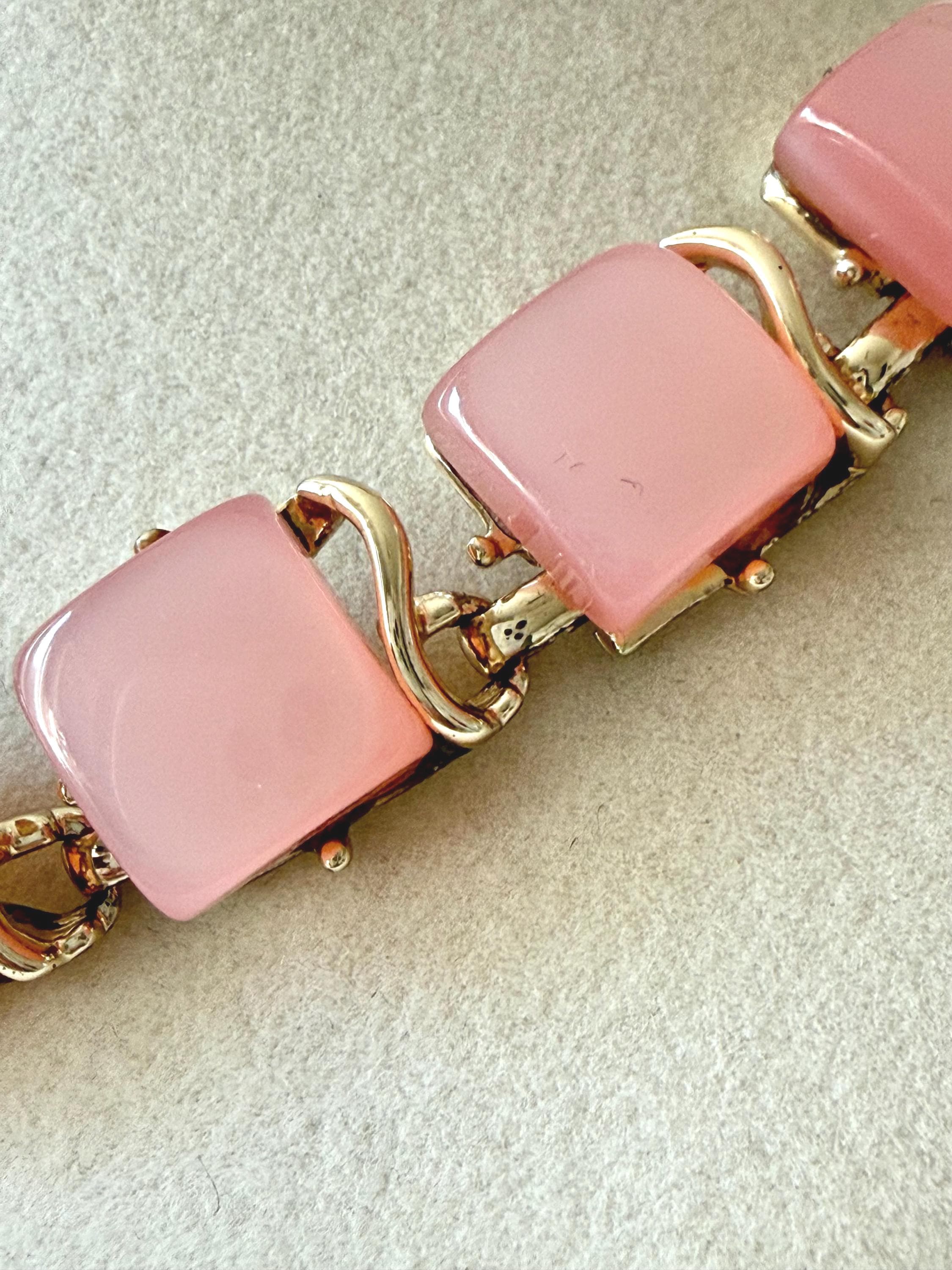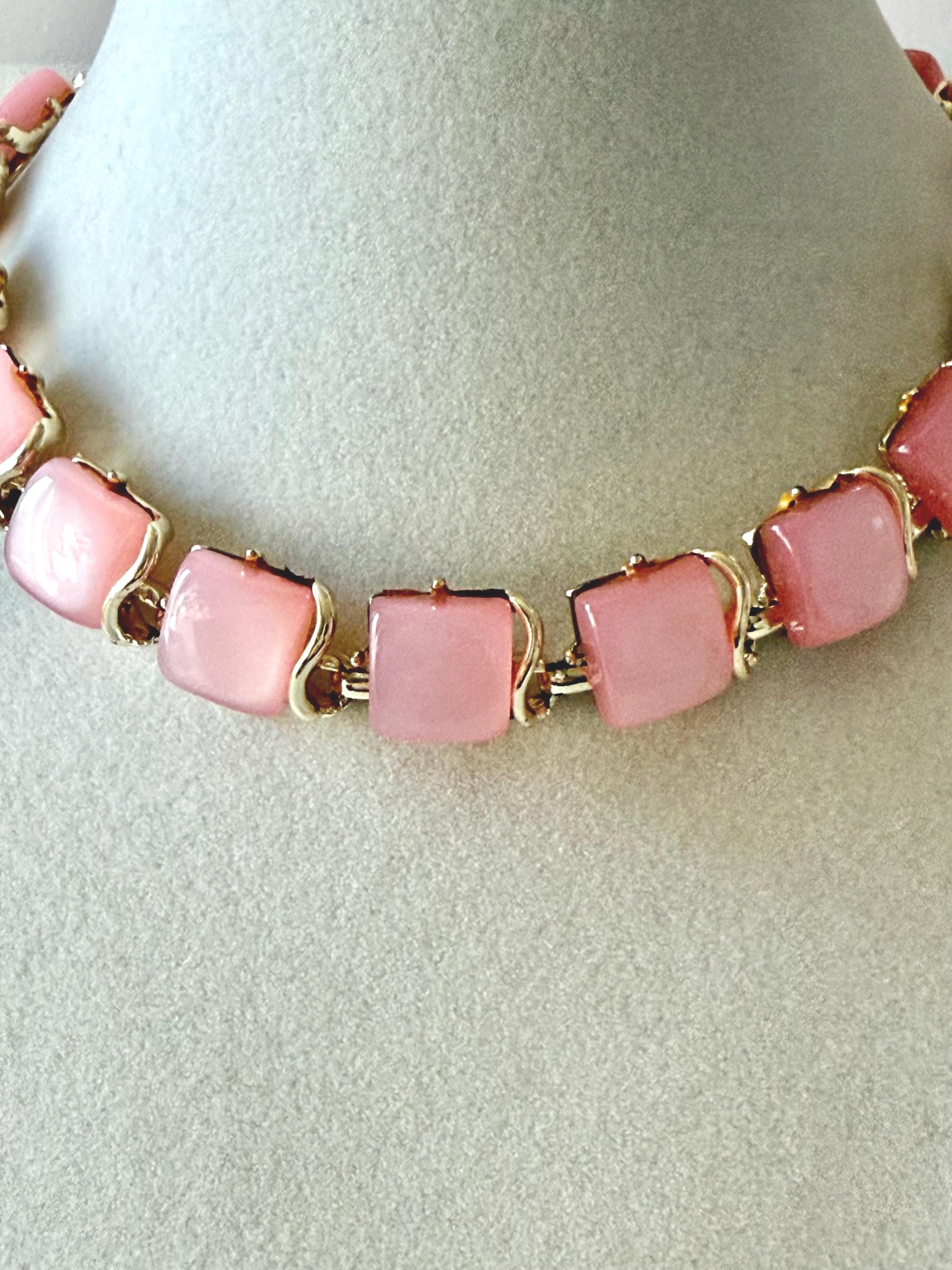 This listing is for a beautiful vintage parure by Coro that includes a necklace, bracelet, and earrings. The adjustable necklace measures 17" long and 1/2" wide, the bracelet is 7" long and 3/4" wide, and the earrings are 3/4" high and 7/8" wide. All pieces are signed. The moonglow thermoset stones are a gorgeous shade of pink and are all in excellent condition. The hook, clasp, and clip backs are secure and the bracelet has a safety chain. A beautiful set that glows with warmth!