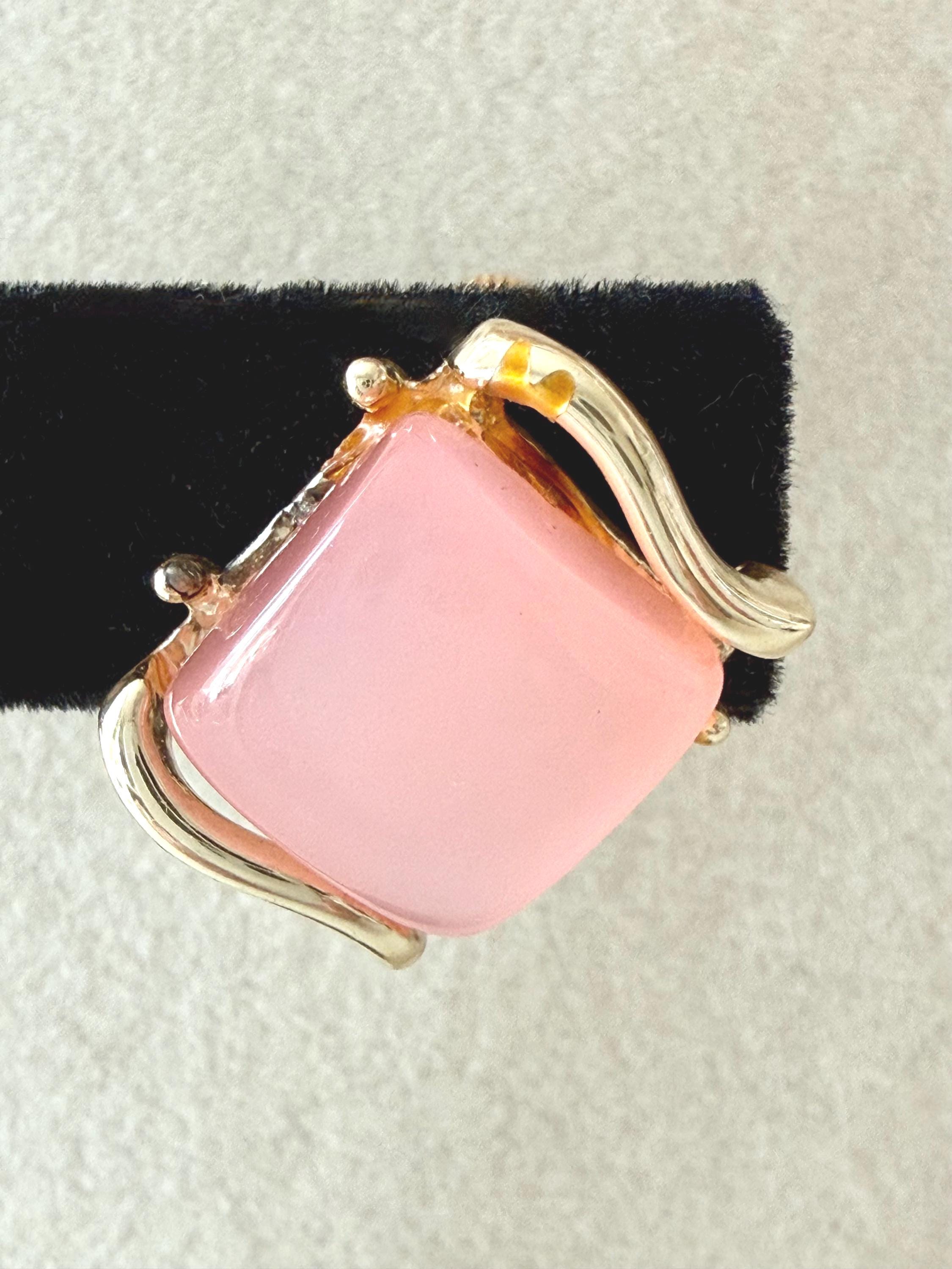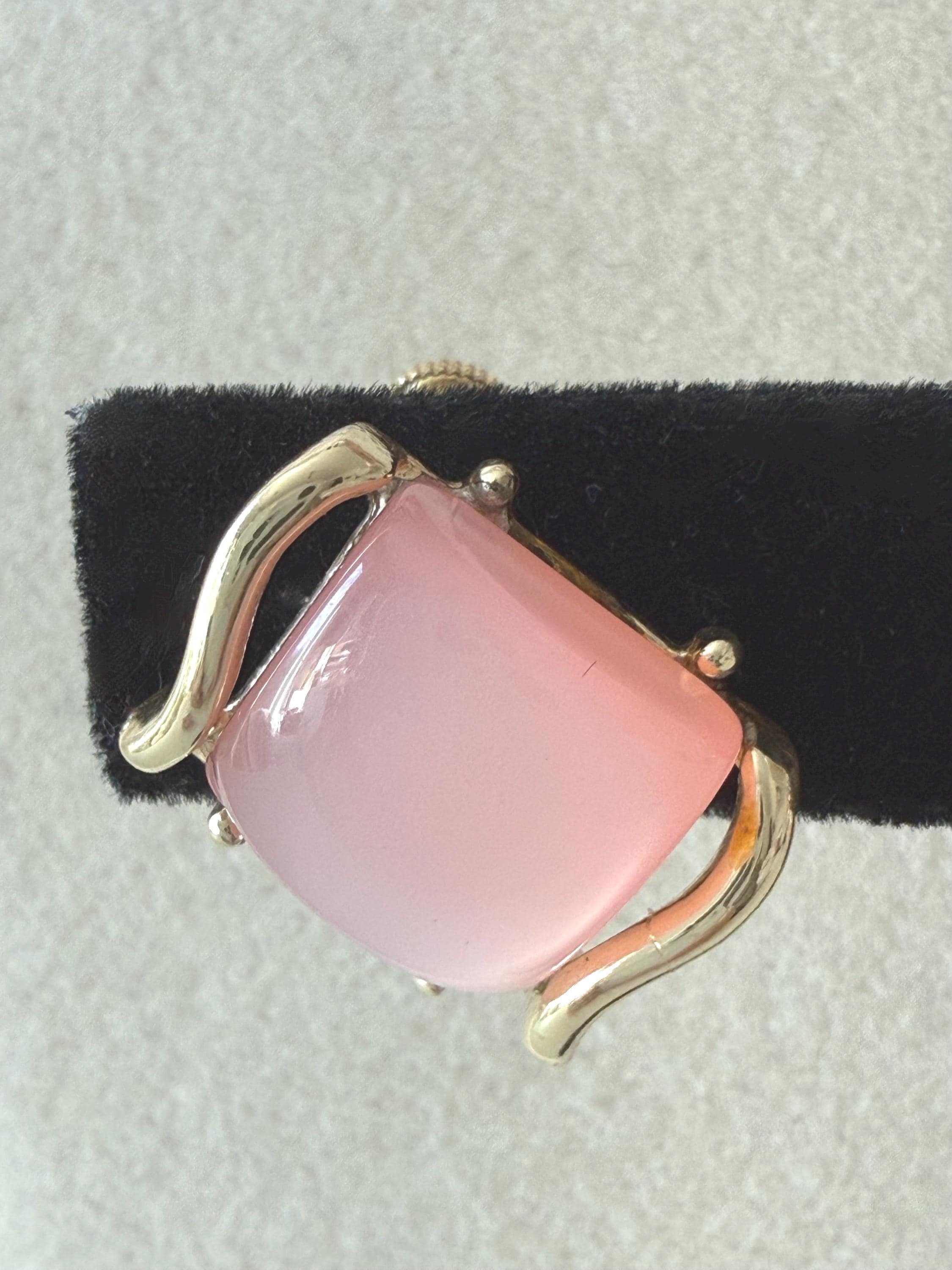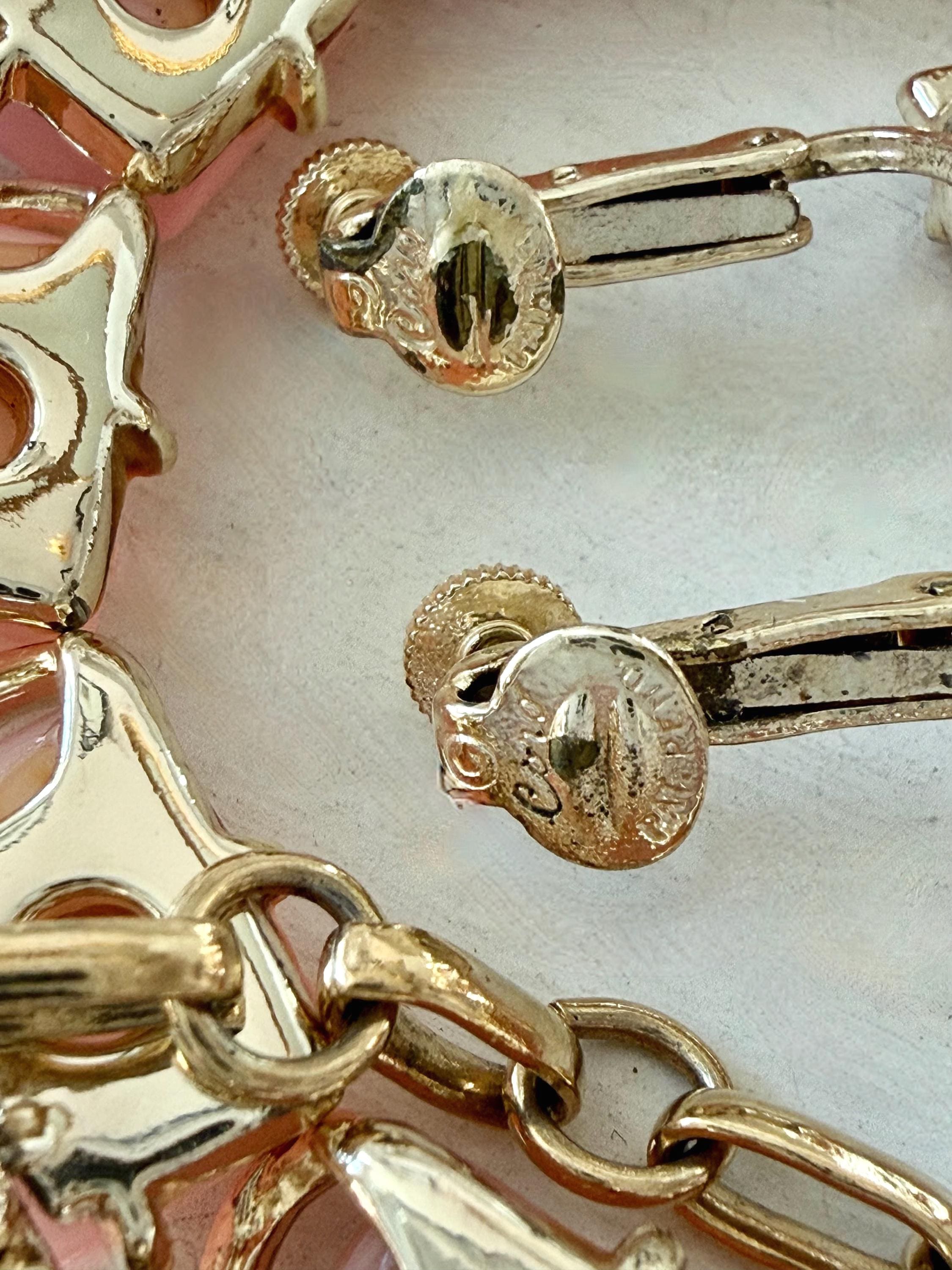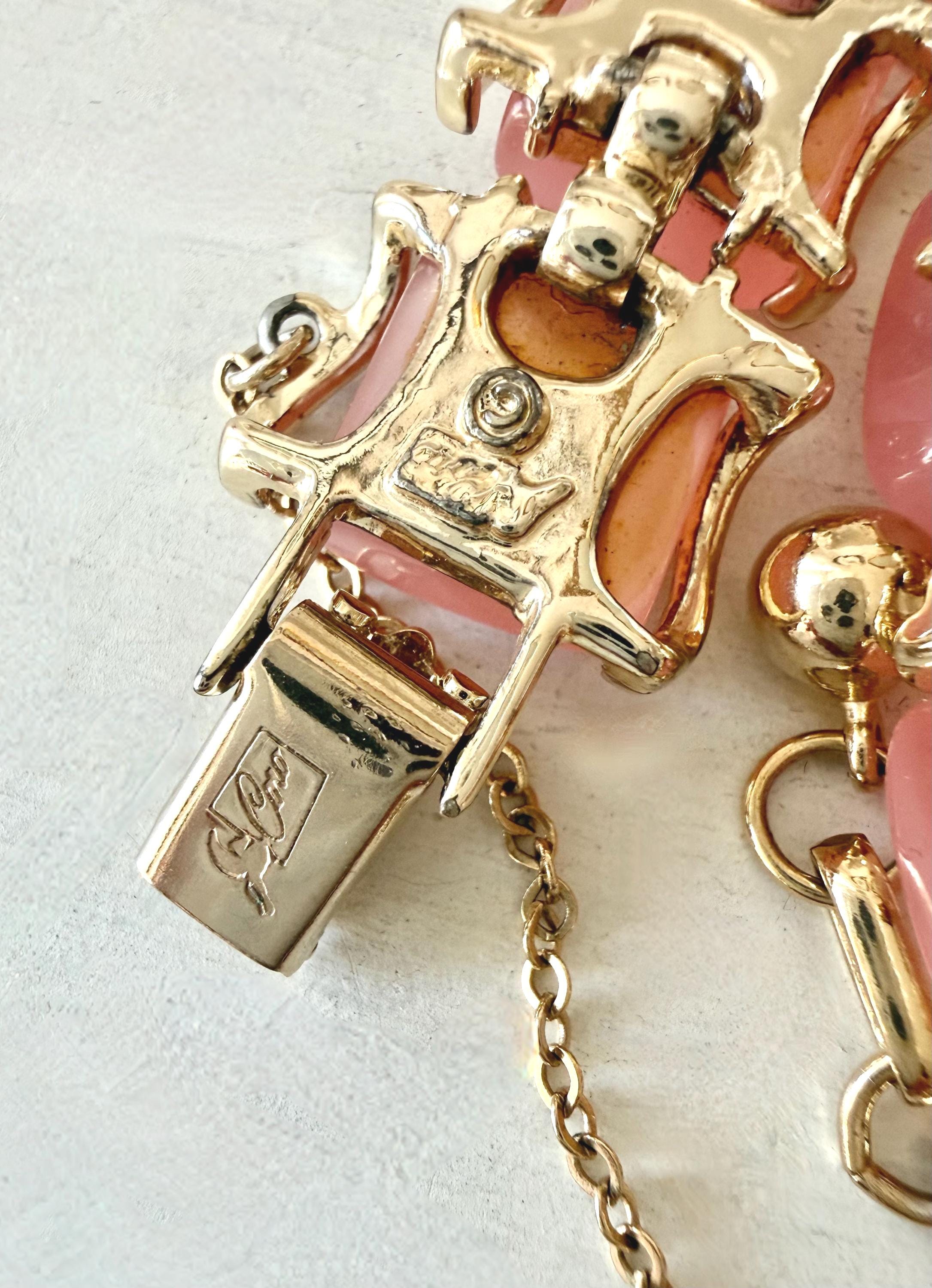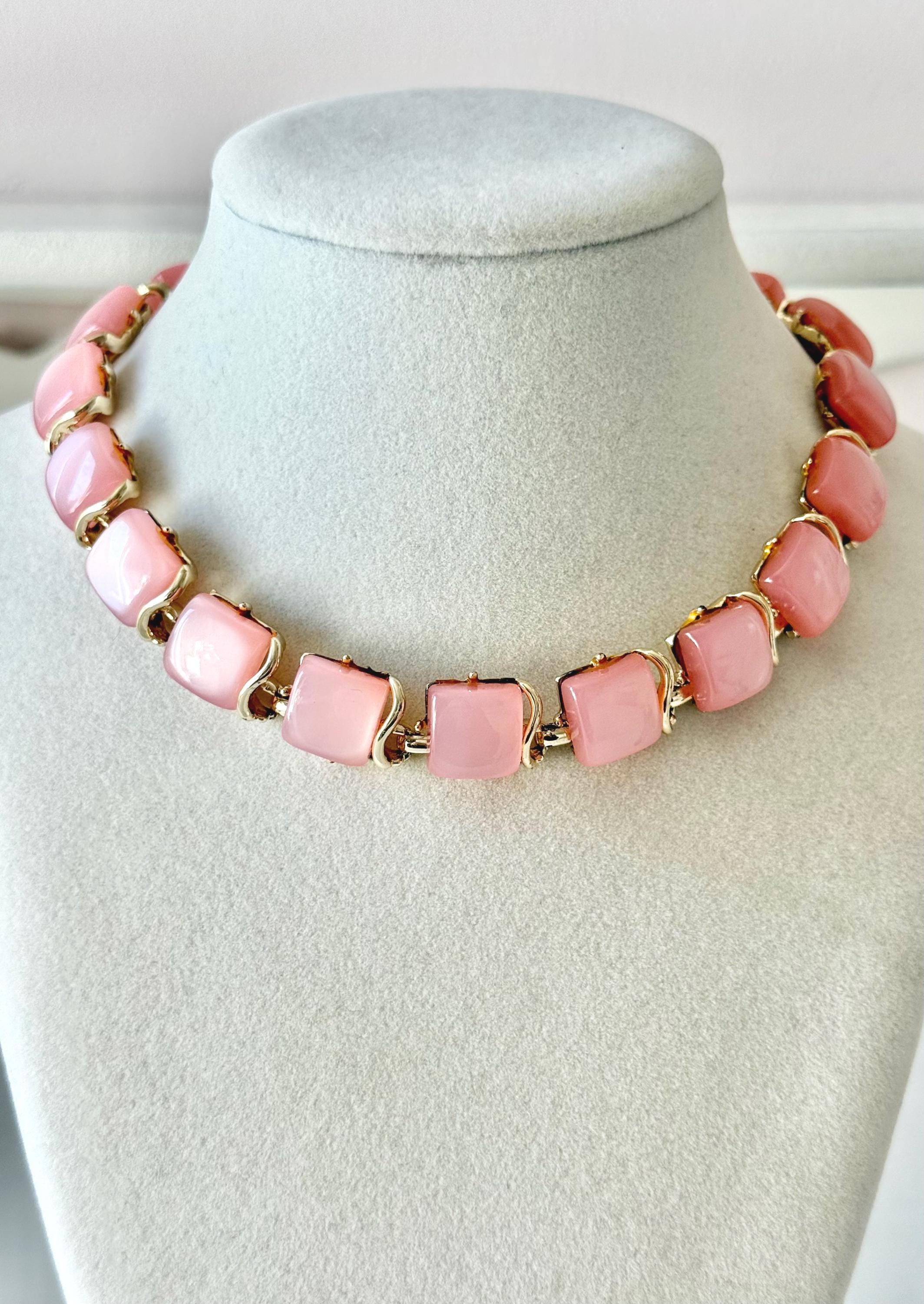 This listing is for a beautiful vintage parure by Coro that includes a necklace, bracelet, and earrings. The adjustable necklace measures 17" long and 1/2" wide, the bracelet is 7" long and 3/4" wide, and the earrings are 3/4" high and 7/8" wide. All pieces are signed. The moonglow thermoset stones are a gorgeous shade of pink and are all in excellent condition. The hook, clasp, and clip backs are secure and the bracelet has a safety chain. A beautiful set that glows with warmth!