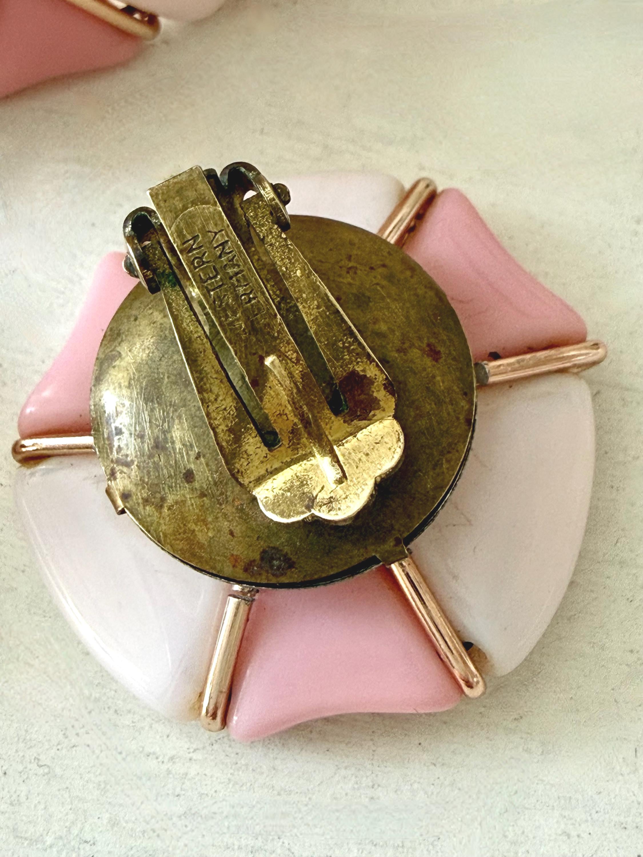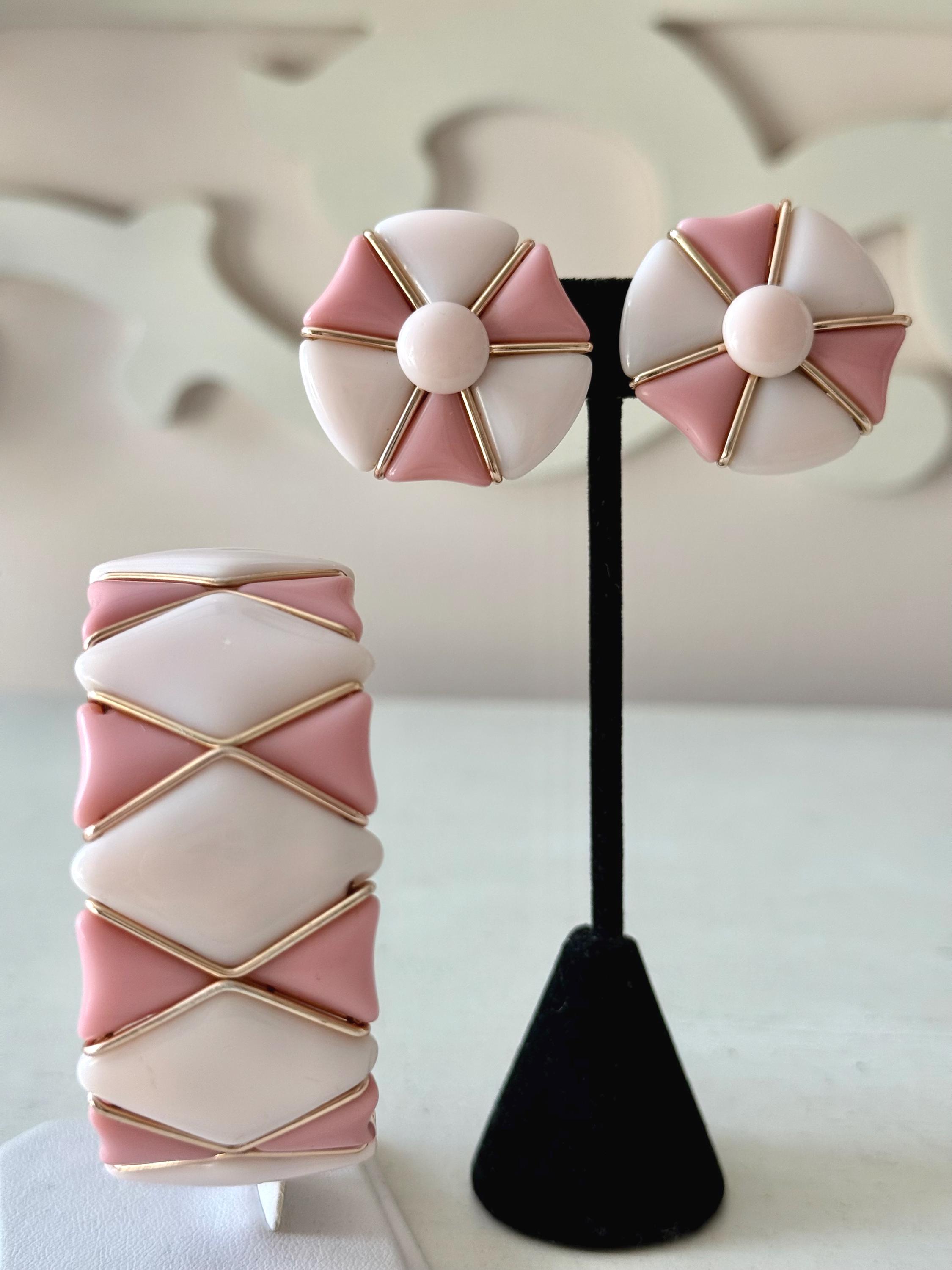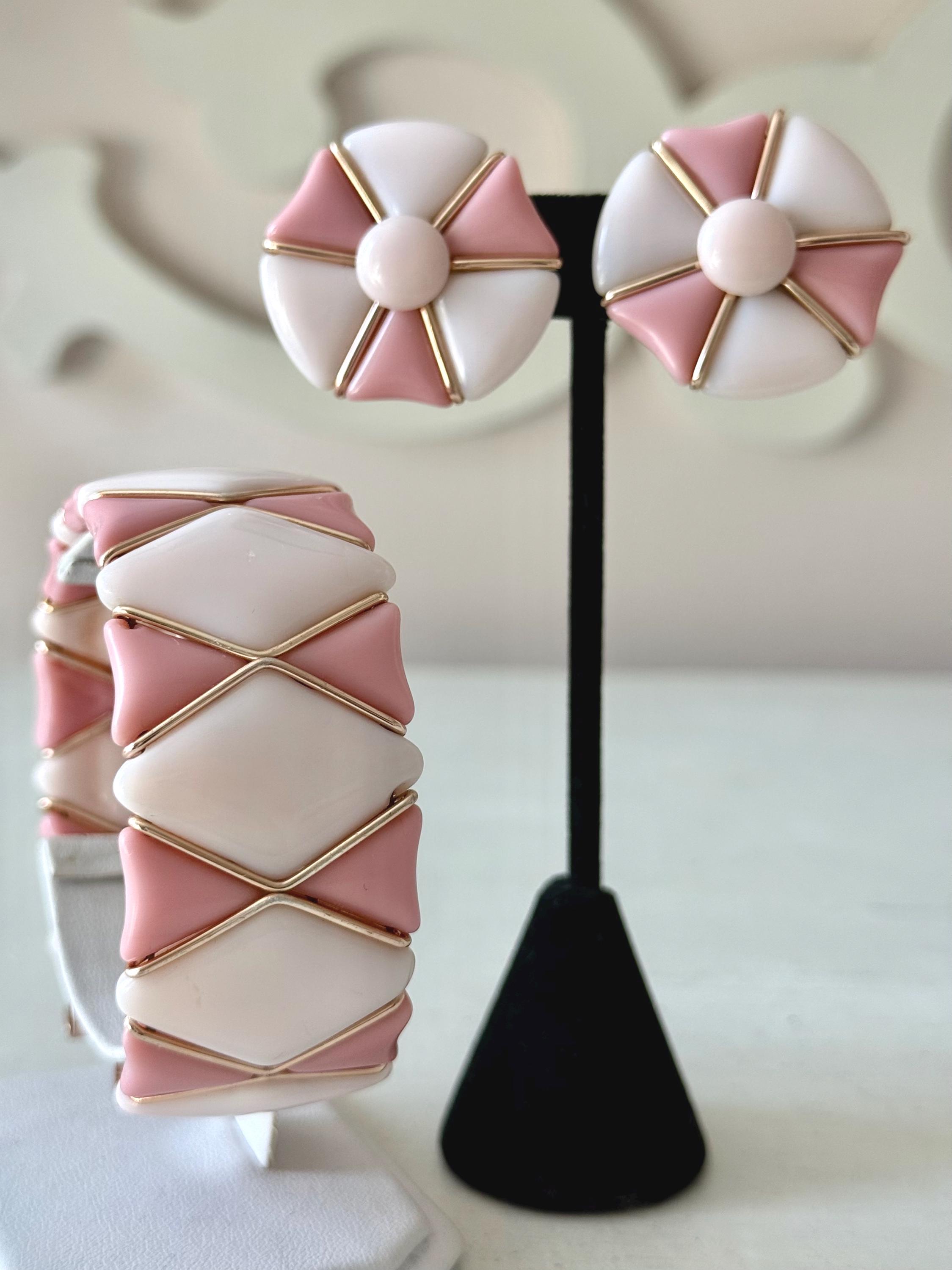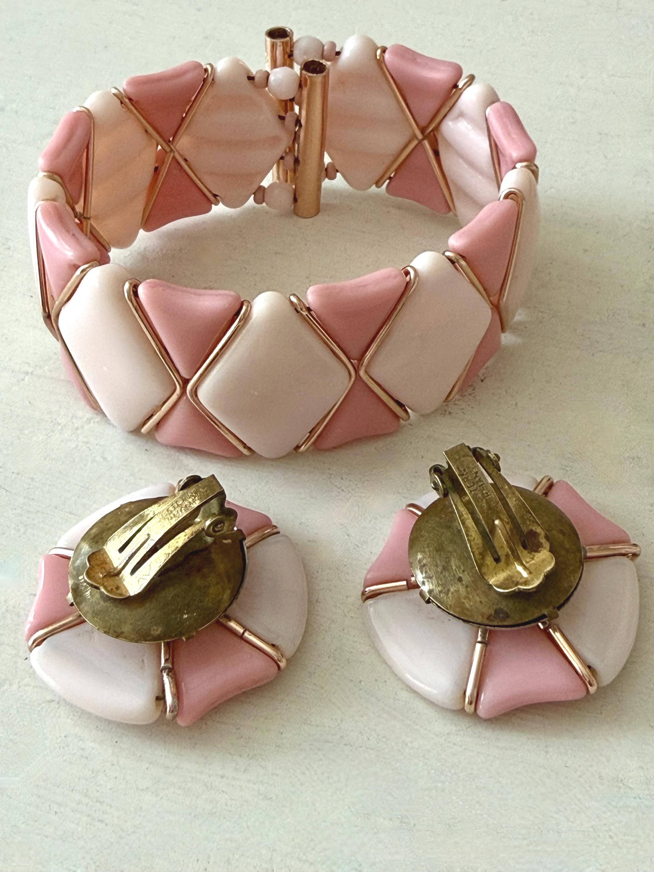 This listing is for a very fun mid-century modern set of bracelet and earrings from Western Germany. All pieces are of pale and medium tones of pink glass in geometric shapes held by rose gold tone metal. The expandable bracelet has an inner diameter of 2.46" and is 1 1/16" wide. The clip on earrings are 1 1/4" in diameter. The set is in very good vintage condition. Just a terrific set!