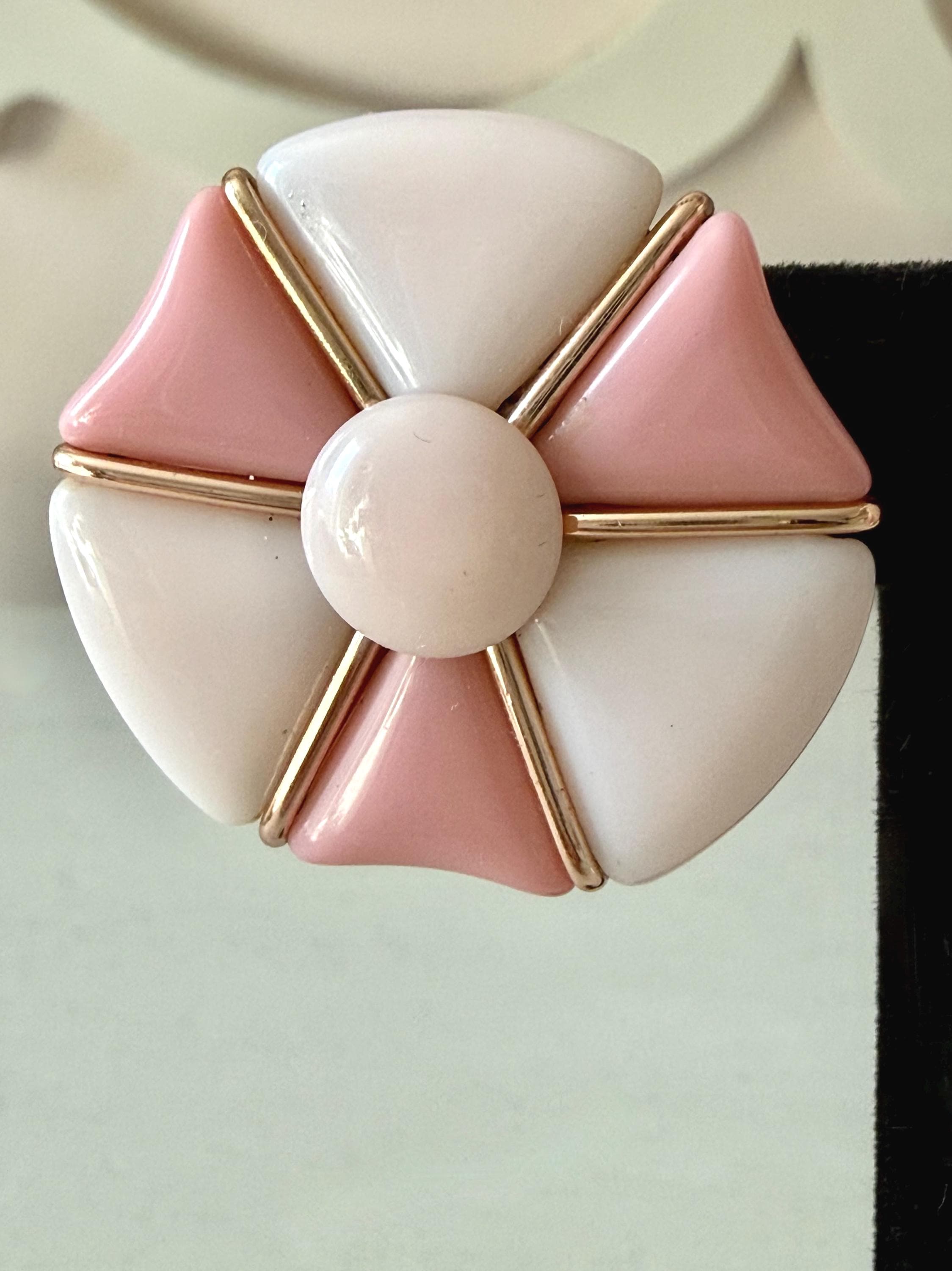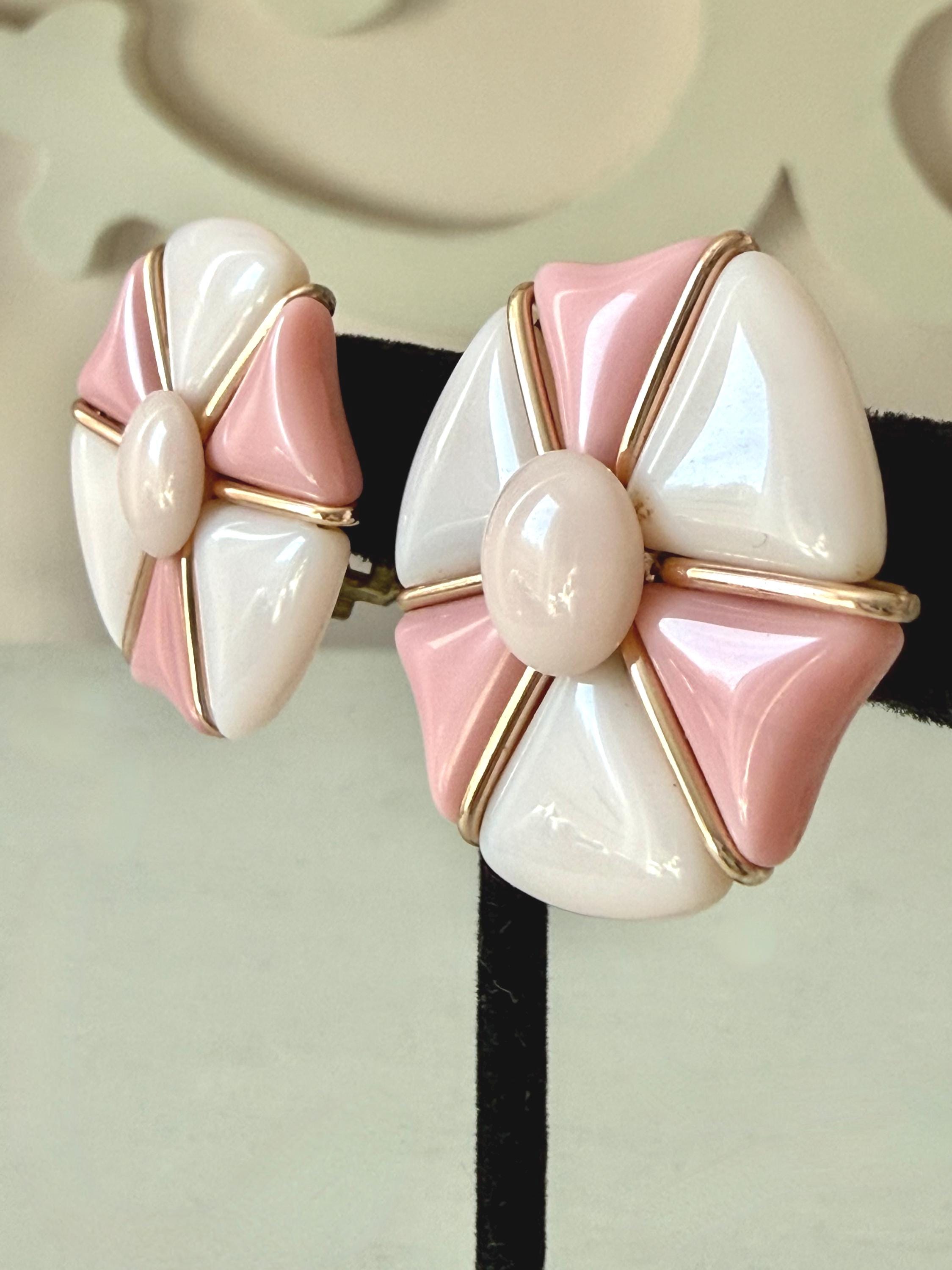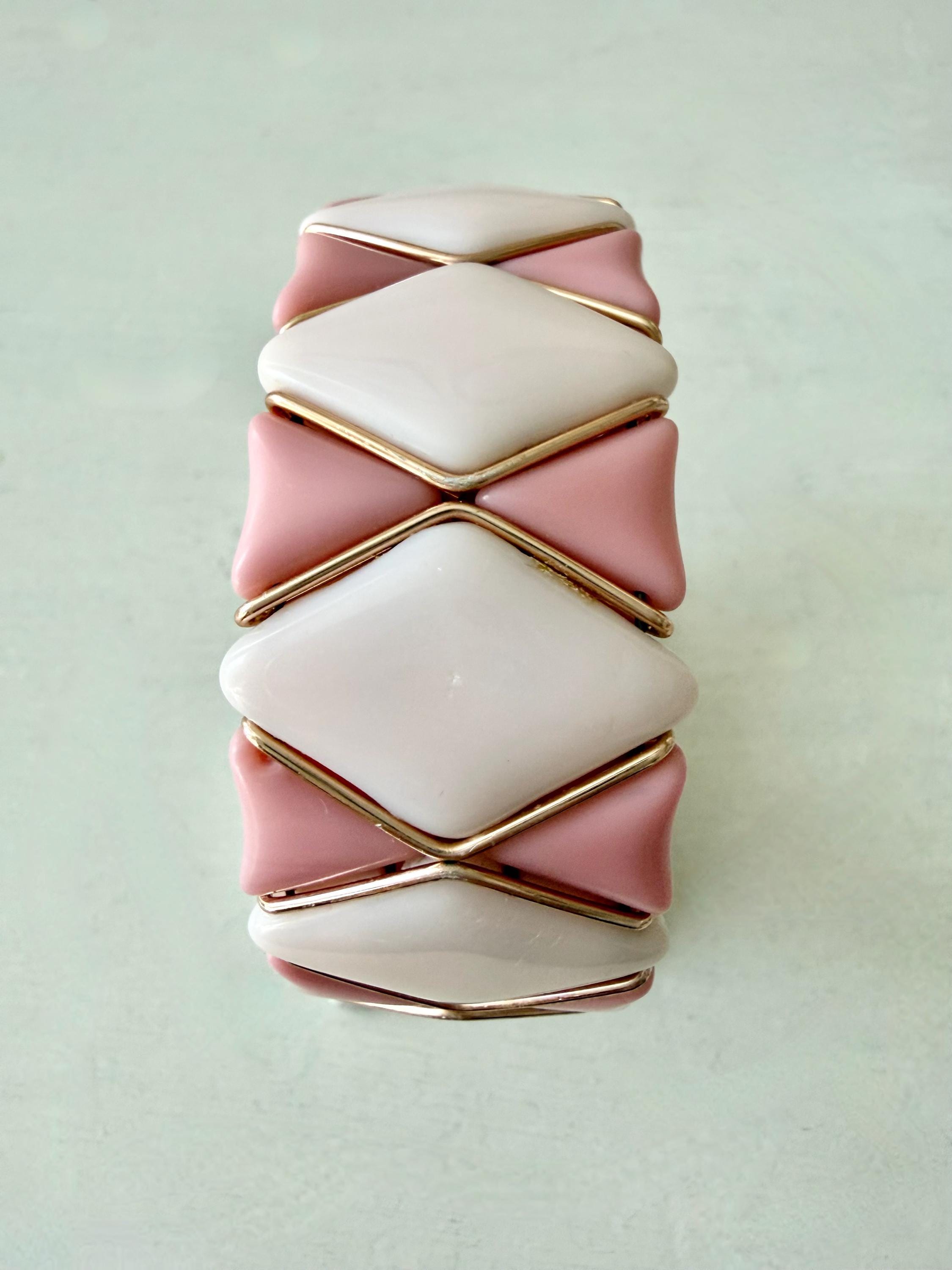 This listing is for a very fun mid-century modern set of bracelet and earrings from Western Germany. All pieces are of pale and medium tones of pink glass in geometric shapes held by rose gold tone metal. The expandable bracelet has an inner diameter of 2.46" and is 1 1/16" wide. The clip on earrings are 1 1/4" in diameter. The set is in very good vintage condition. Just a terrific set!