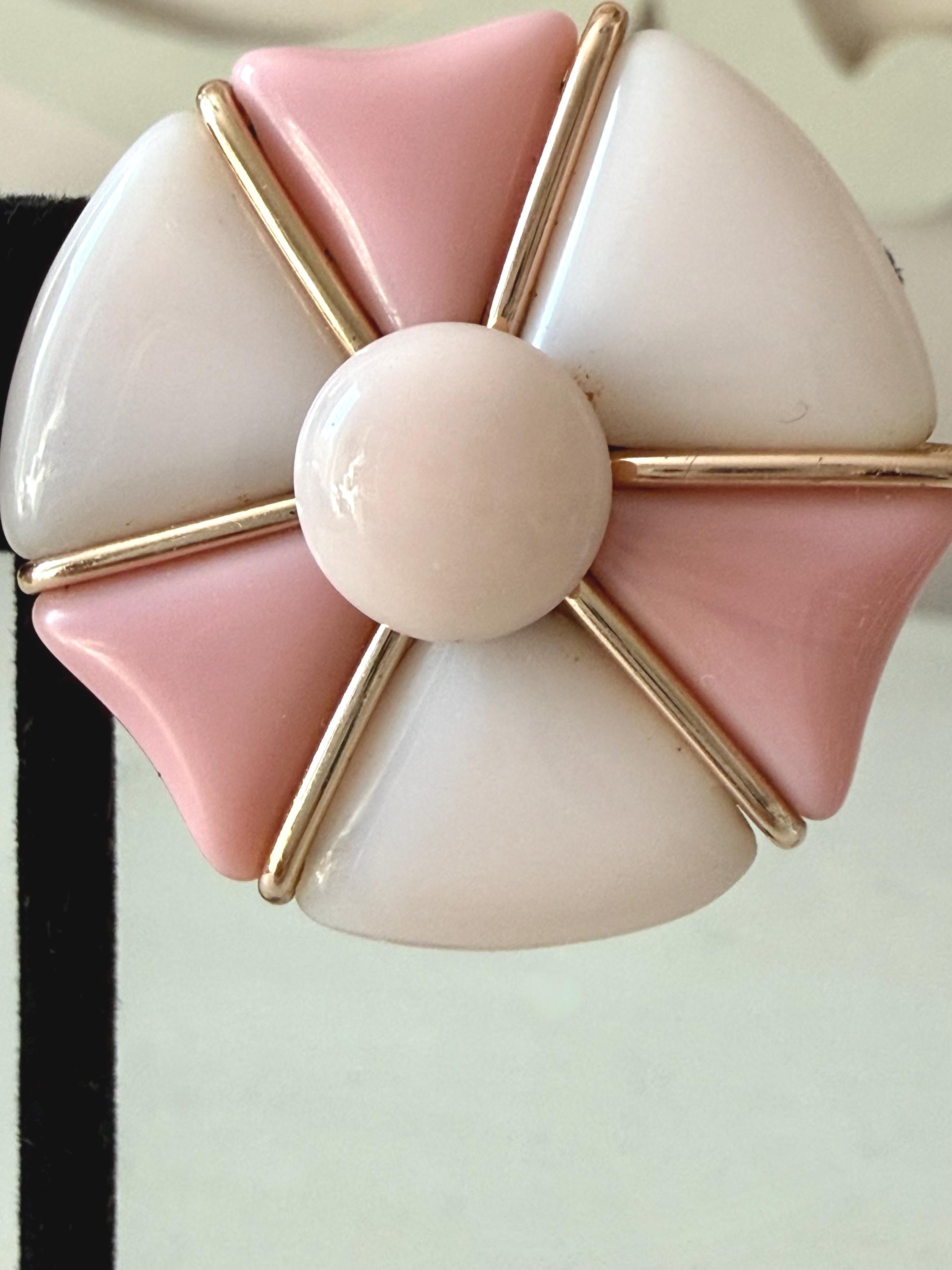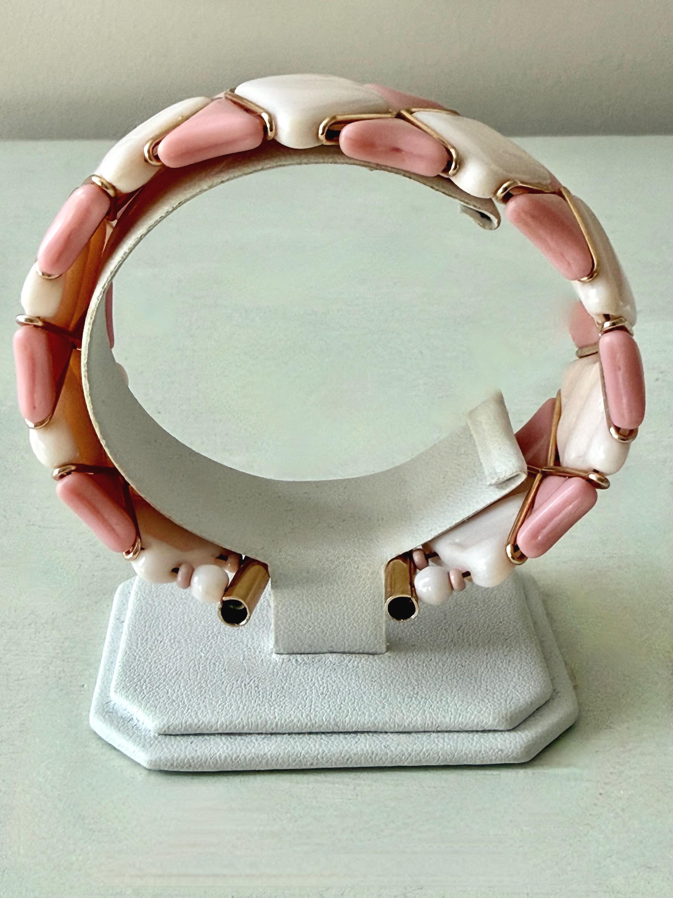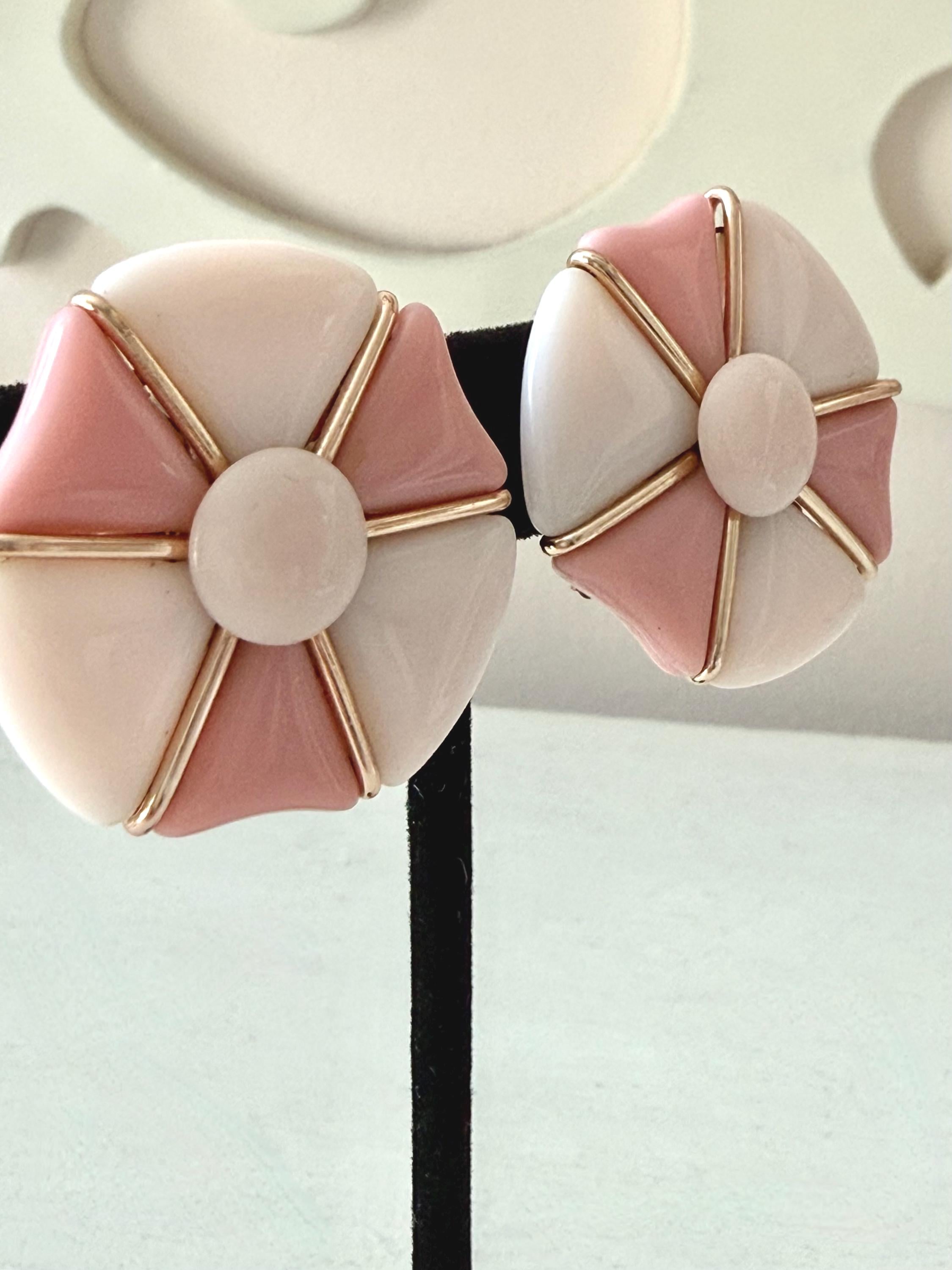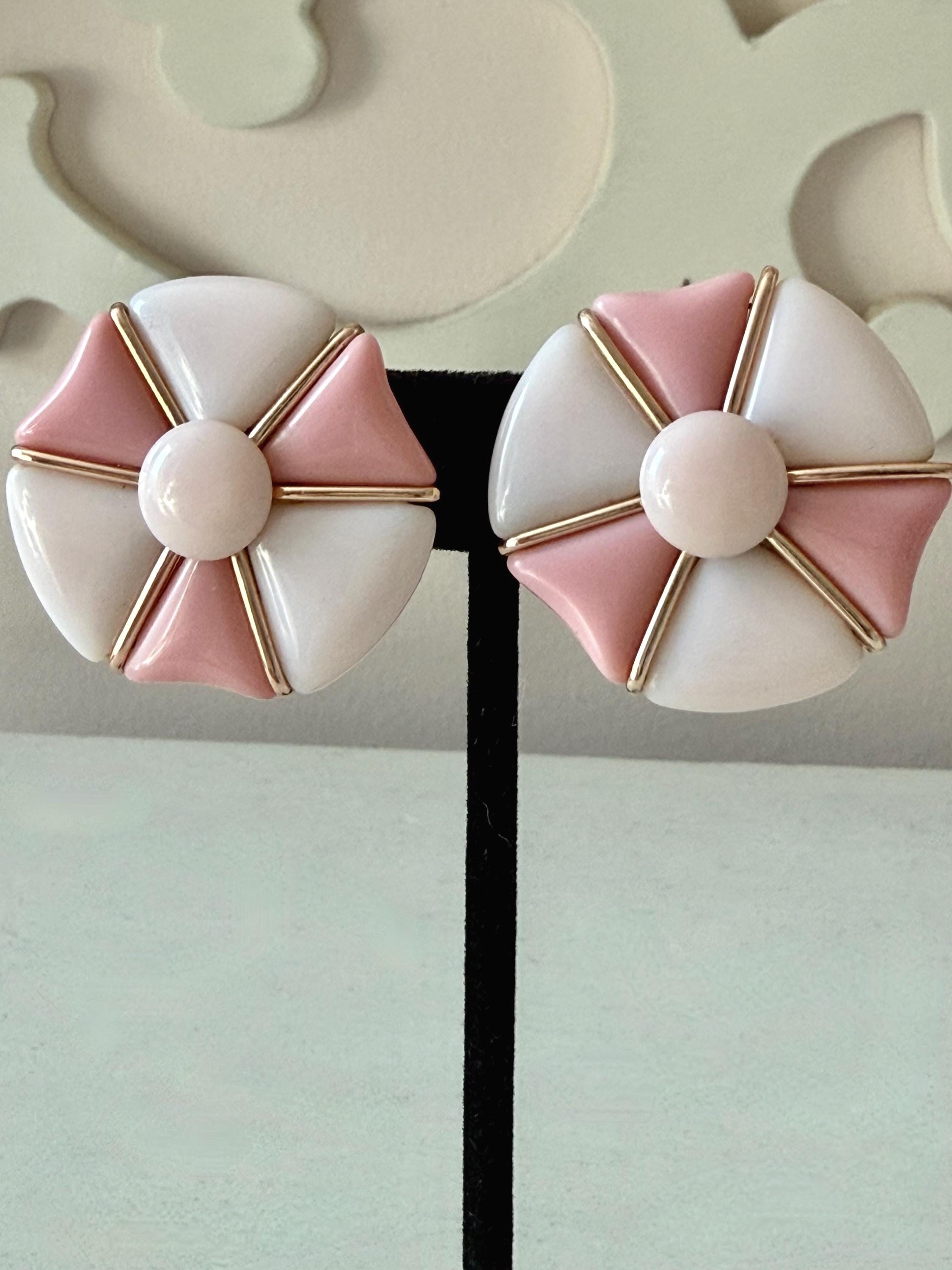 This listing is for a very fun mid-century modern set of bracelet and earrings from Western Germany. All pieces are of pale and medium tones of pink glass in geometric shapes held by rose gold tone metal. The expandable bracelet has an inner diameter of 2.46" and is 1 1/16" wide. The clip on earrings are 1 1/4" in diameter. The set is in very good vintage condition. Just a terrific set!