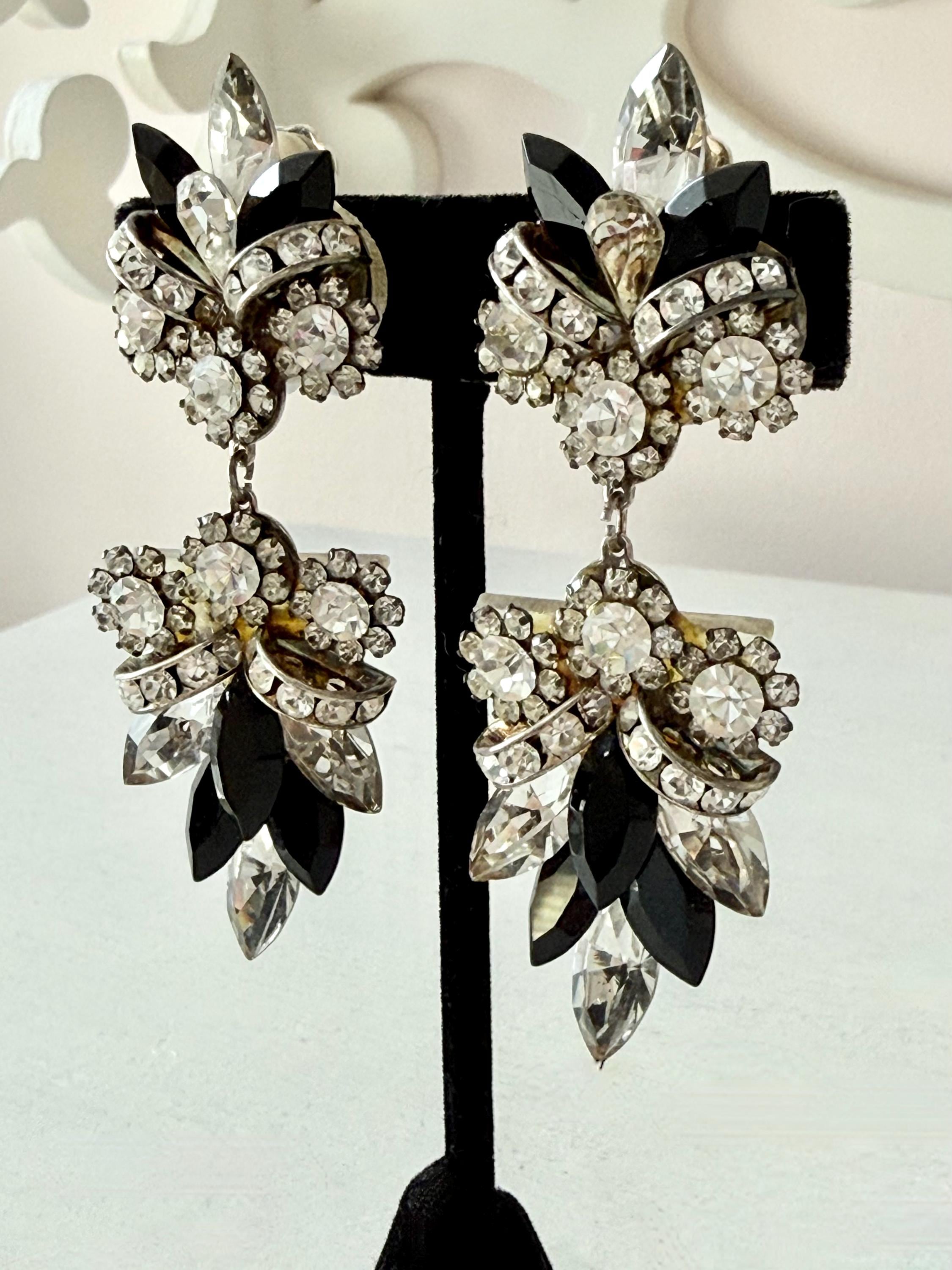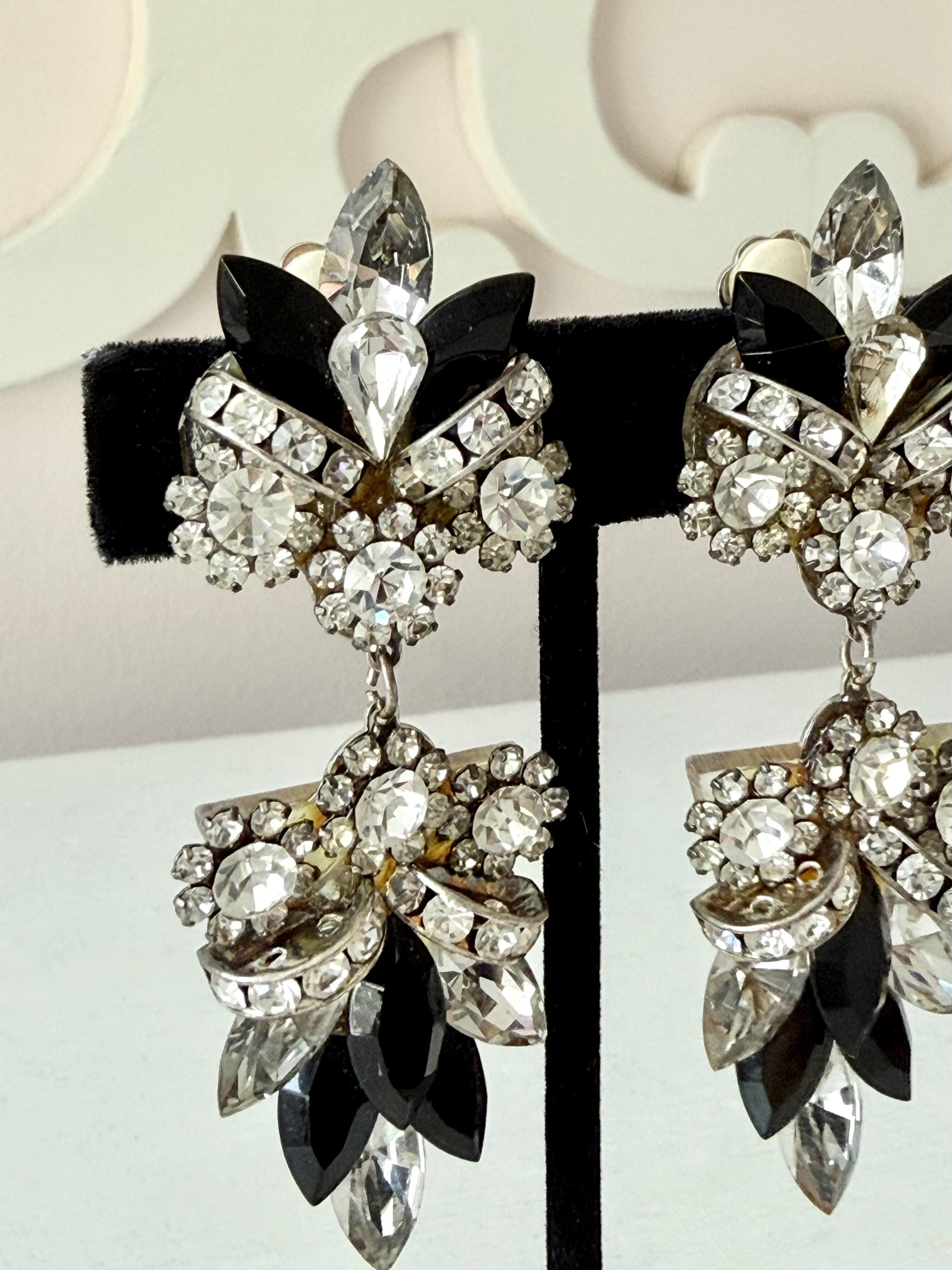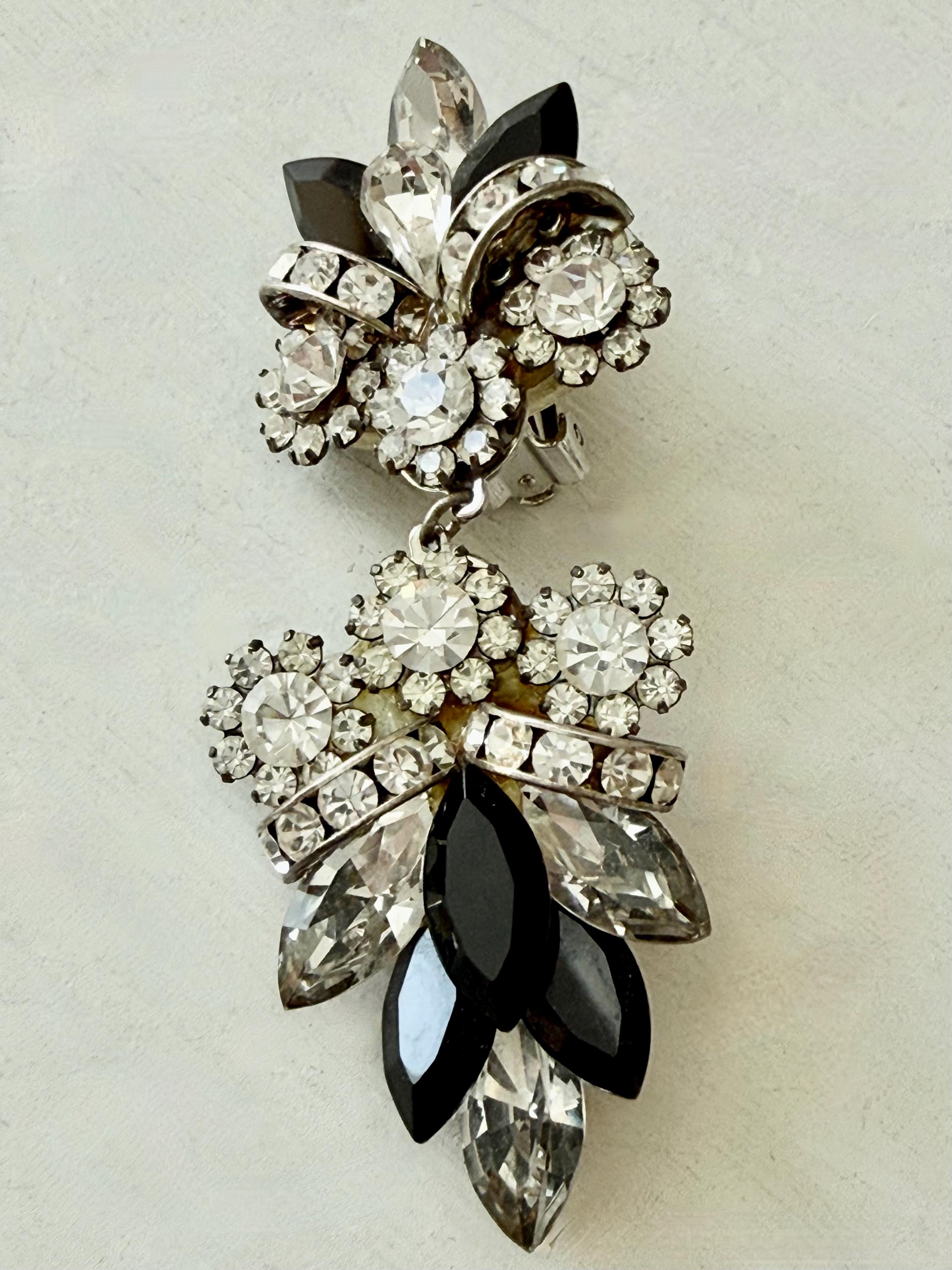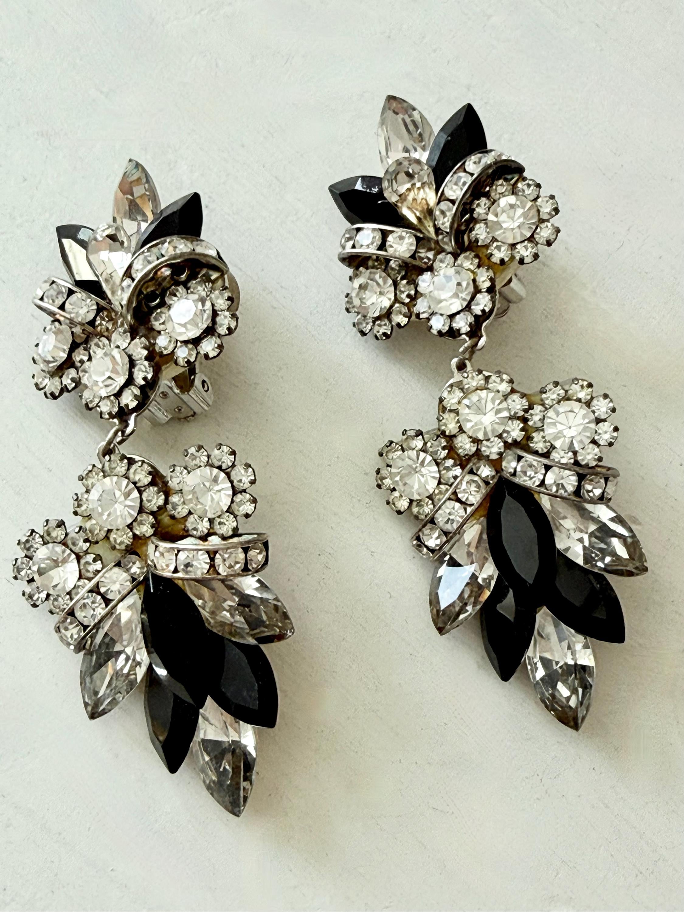 This listing is for a spectacular pair of vintage earrings, unsigned. Measuring 3" long and 1" wide, the drop earrings feature shiny black marquise and sparkling clear Austrian rhinestones in multiple shapes and sizes. The leafy, flowery, and layered design is just gorgeous. All stones are intact and the clip backs are secure and comfortable. Perfect for that very special occasion!