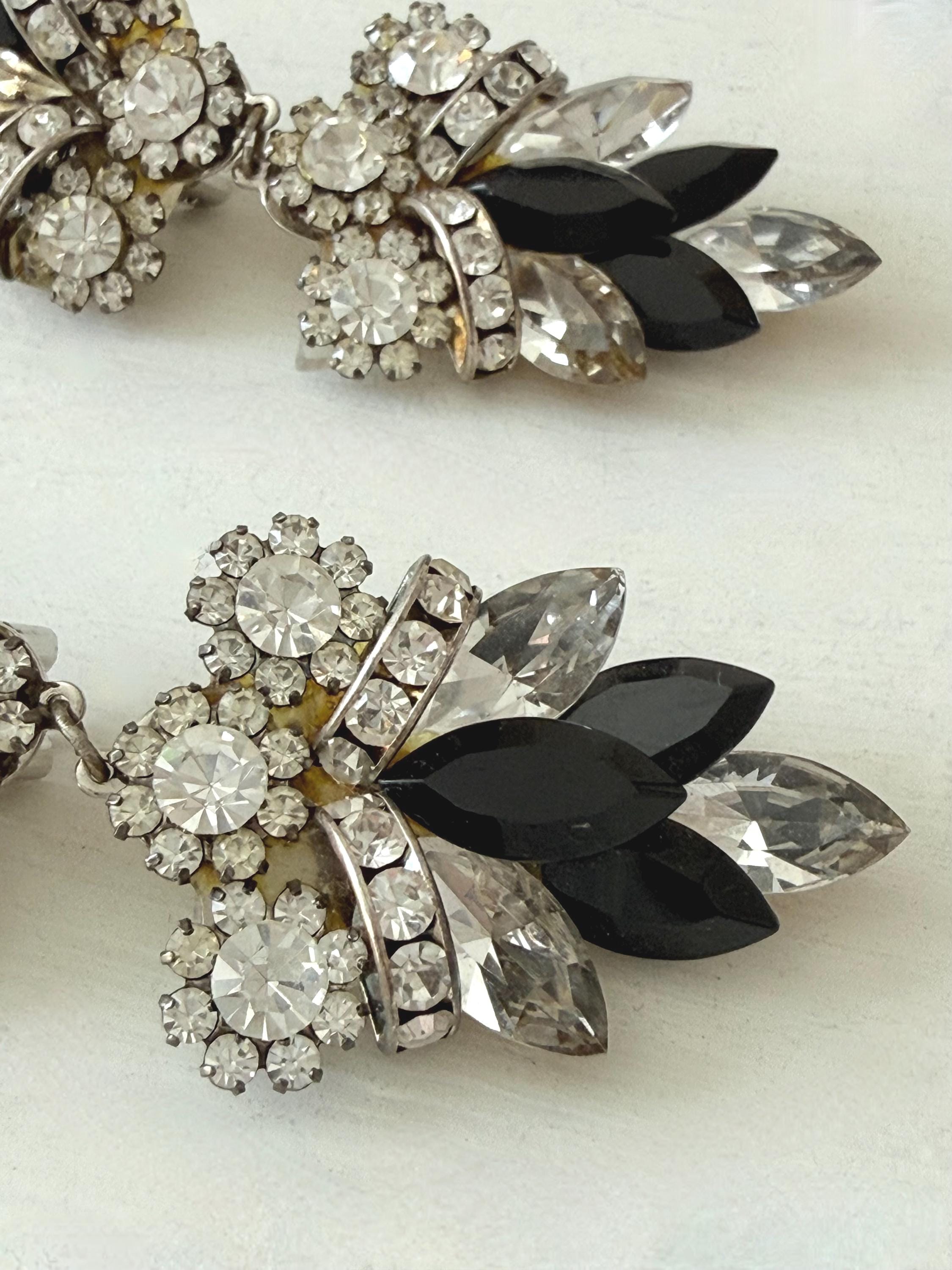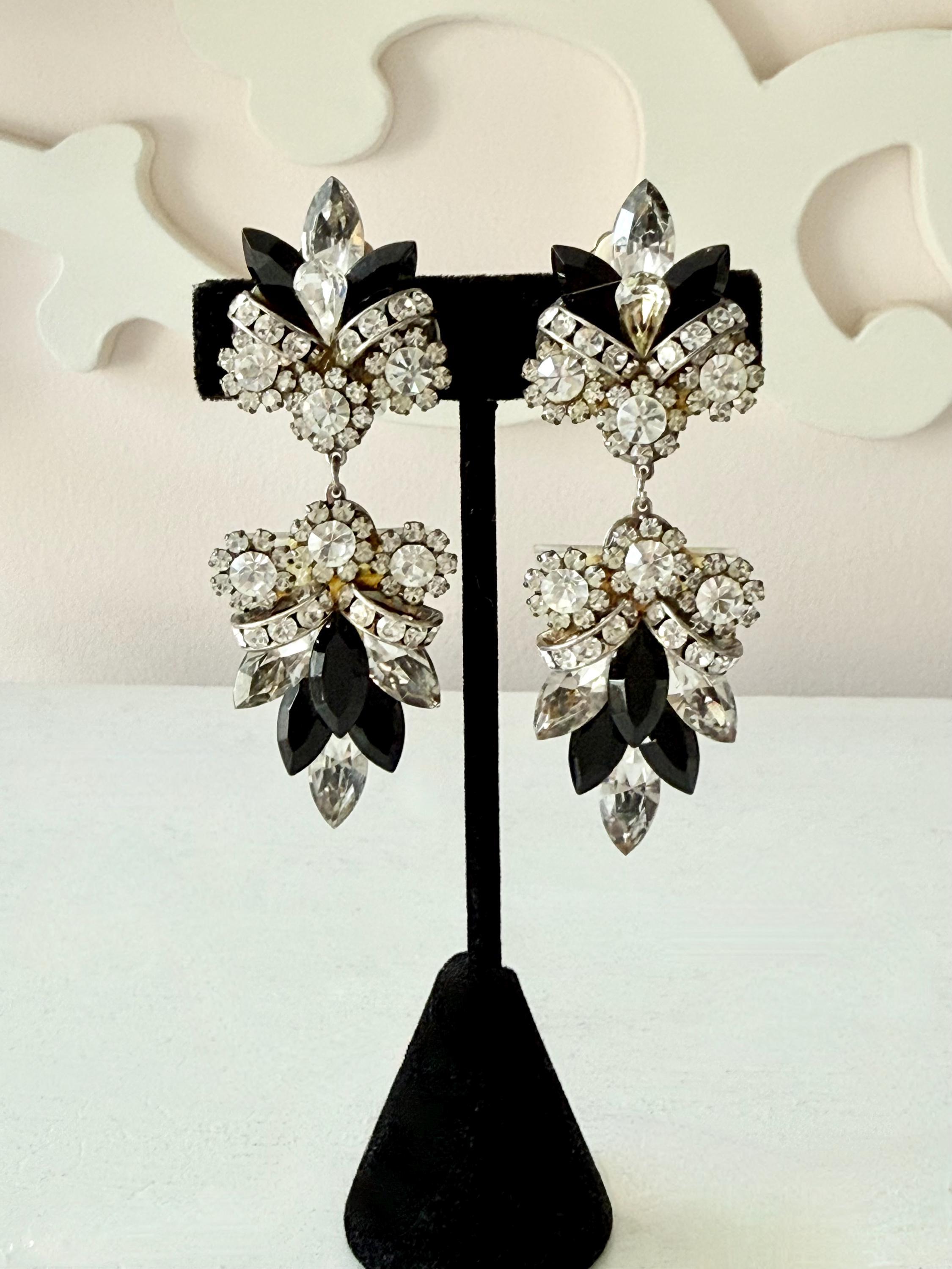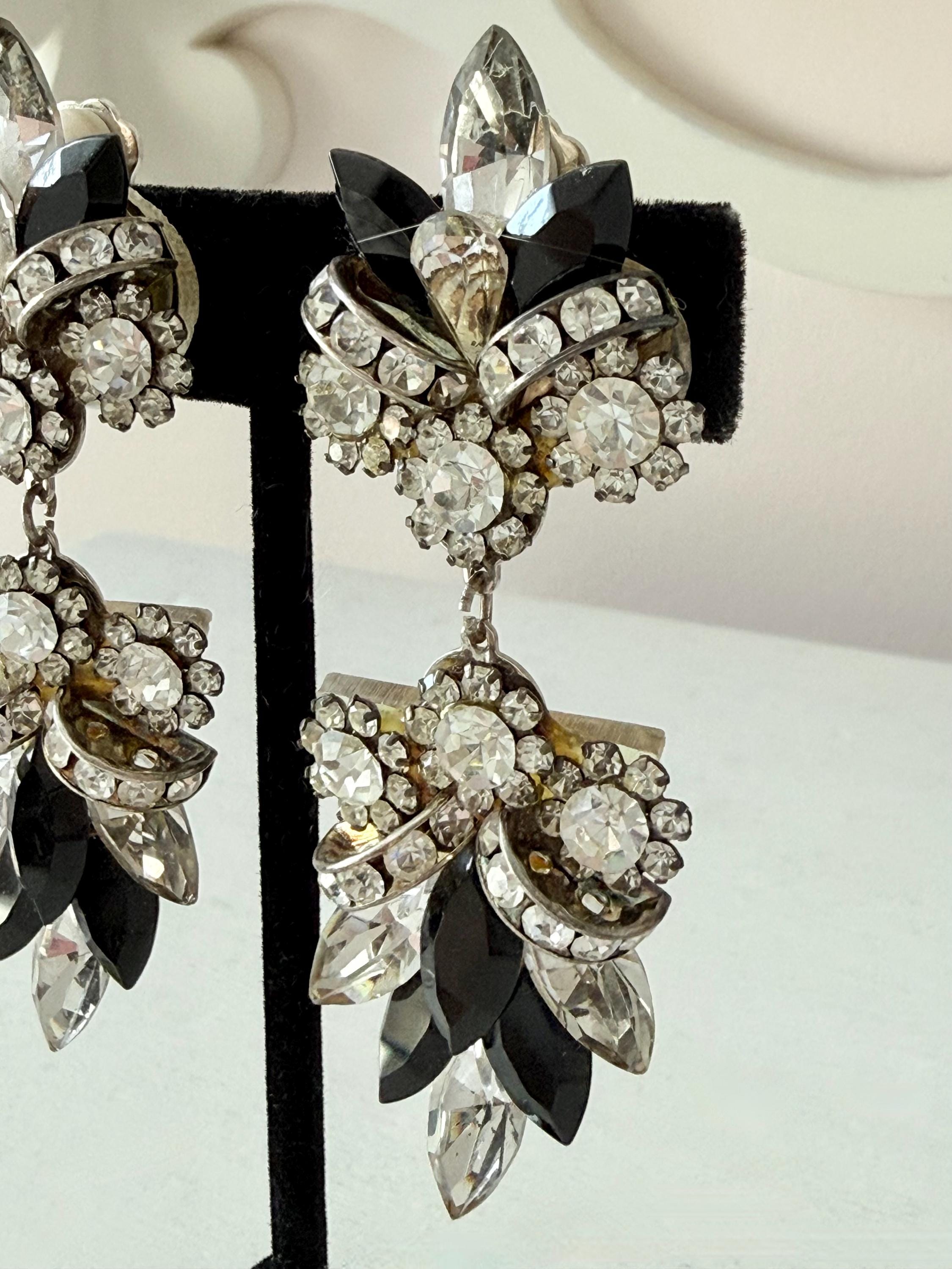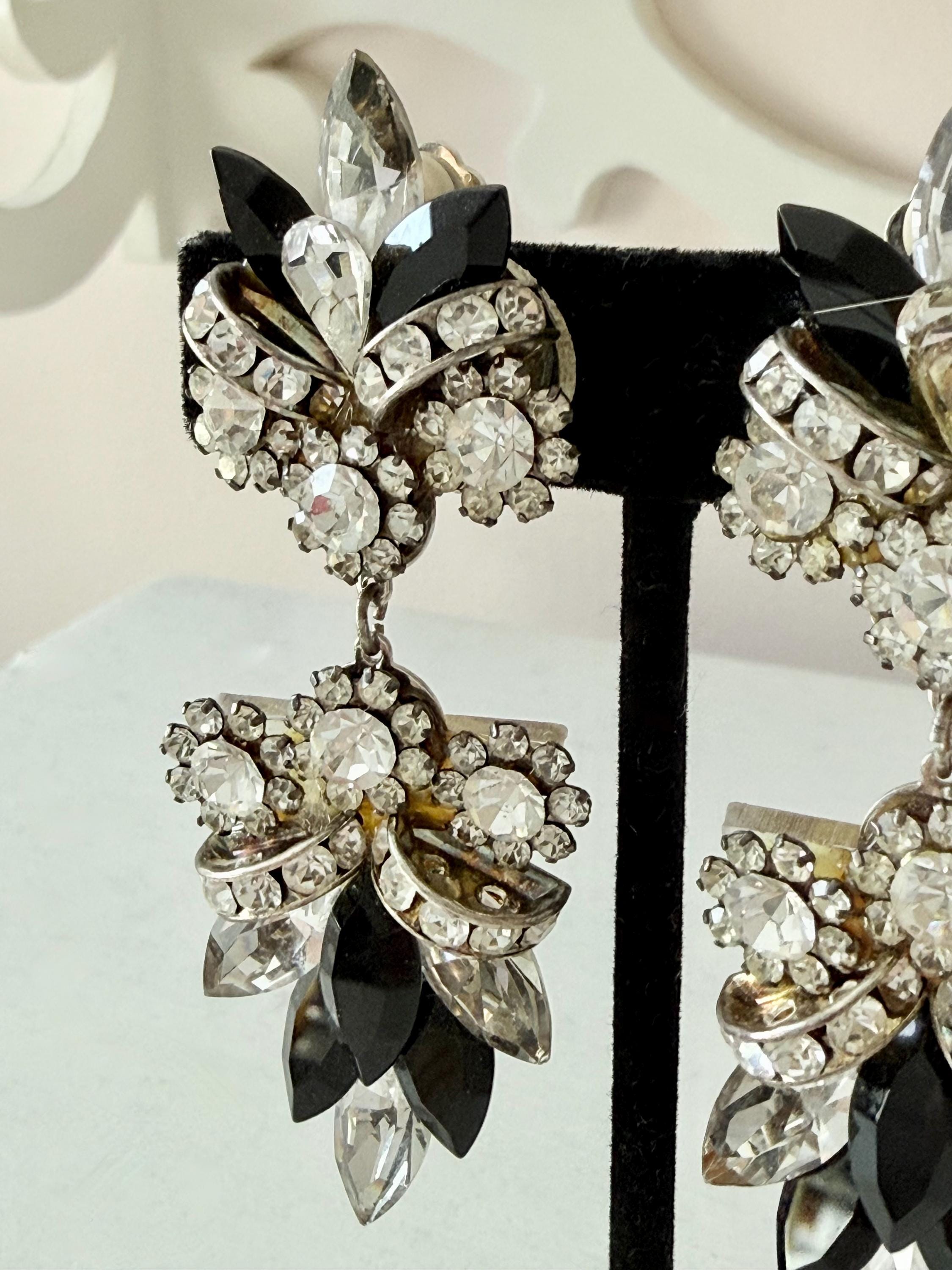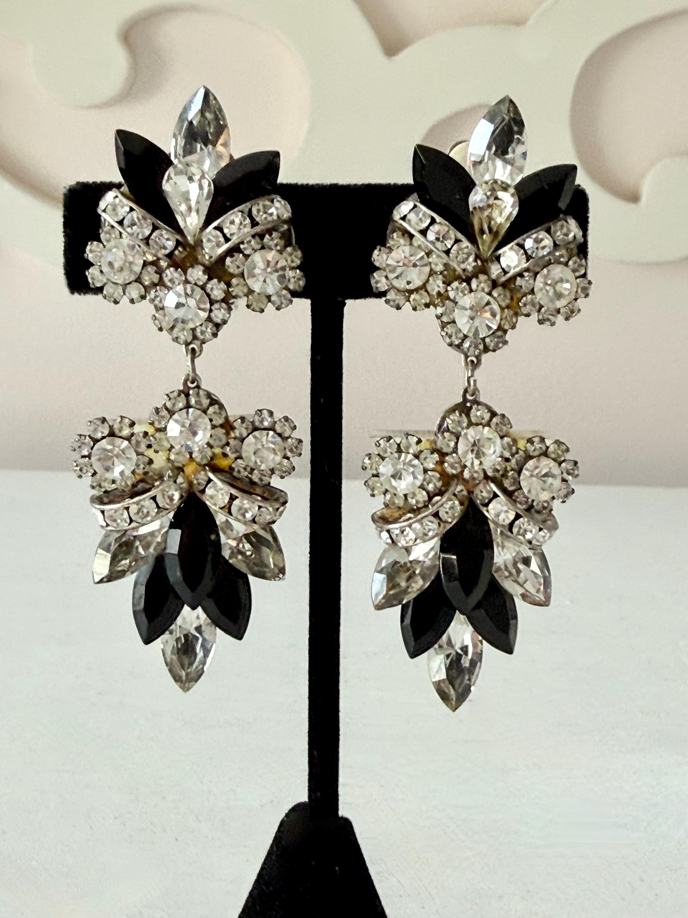 This listing is for a spectacular pair of vintage earrings, unsigned. Measuring 3" long and 1" wide, the drop earrings feature shiny black marquise and sparkling clear Austrian rhinestones in multiple shapes and sizes. The leafy, flowery, and layered design is just gorgeous. All stones are intact and the clip backs are secure and comfortable. Perfect for that very special occasion!