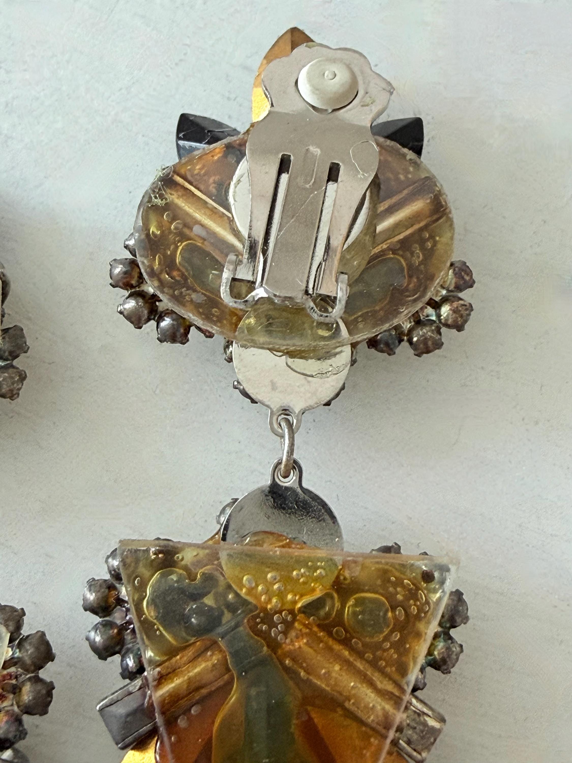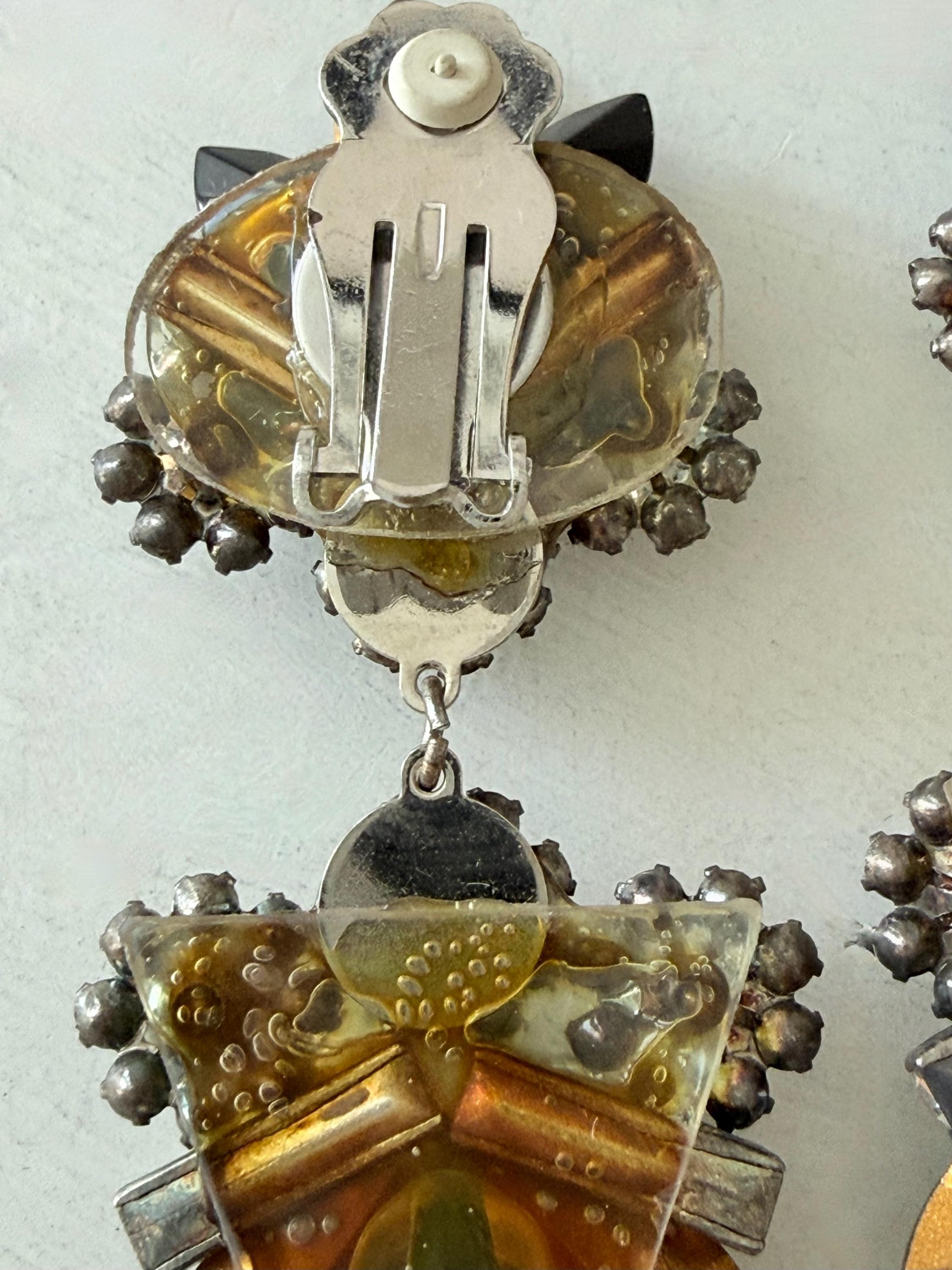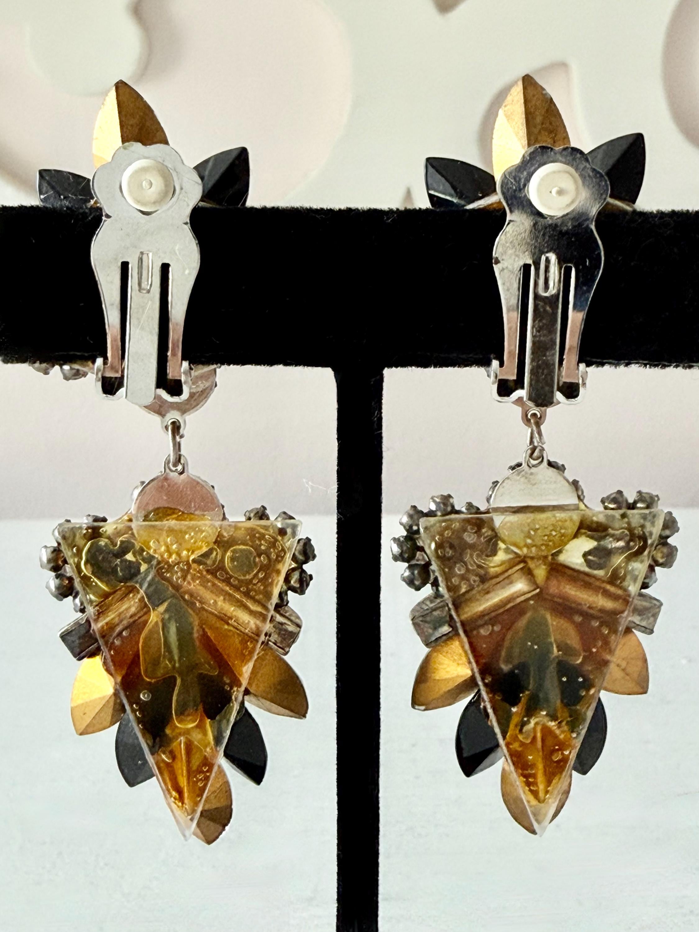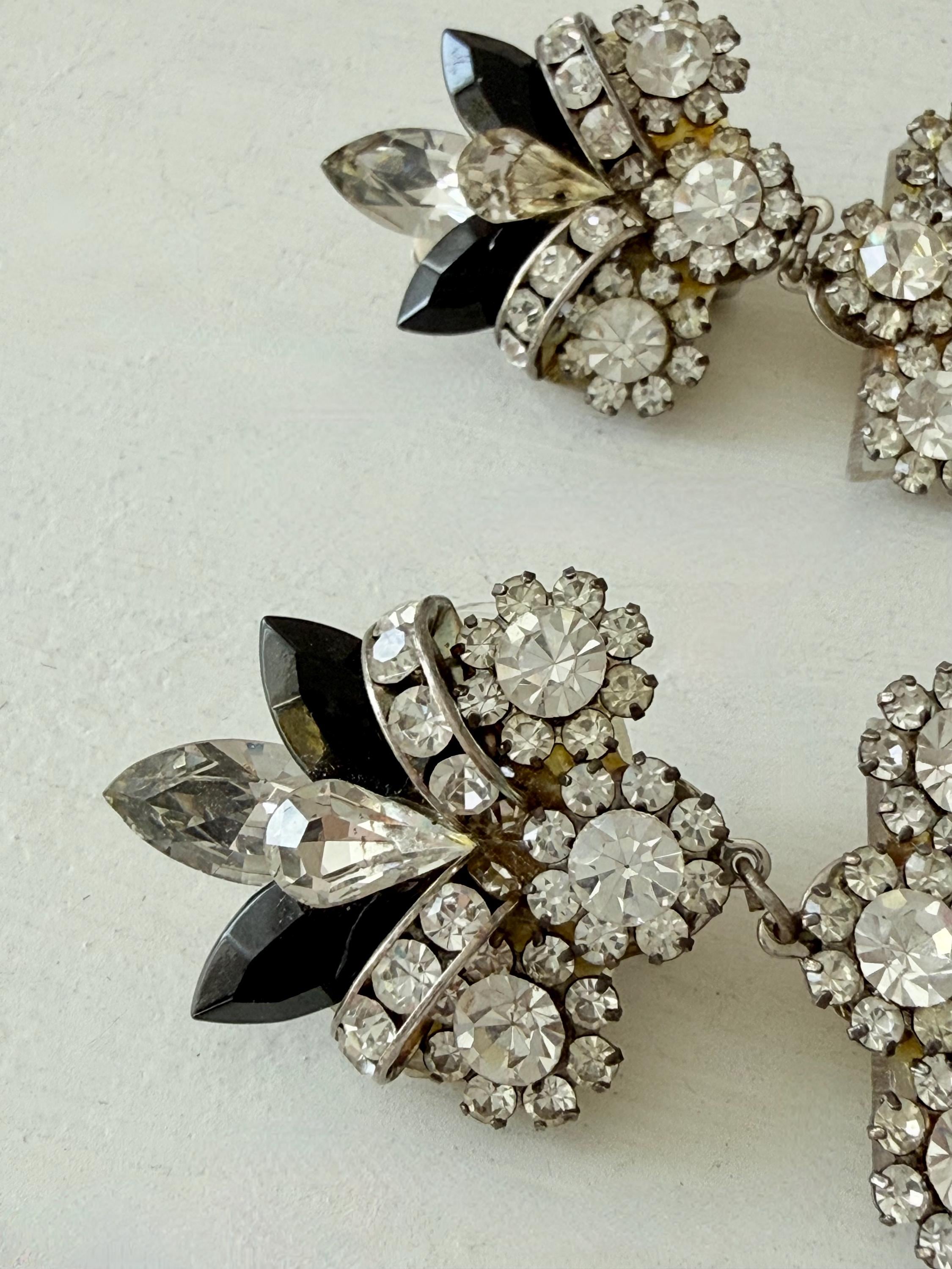 This listing is for a spectacular pair of vintage earrings, unsigned. Measuring 3" long and 1" wide, the drop earrings feature shiny black marquise and sparkling clear Austrian rhinestones in multiple shapes and sizes. The leafy, flowery, and layered design is just gorgeous. All stones are intact and the clip backs are secure and comfortable. Perfect for that very special occasion!