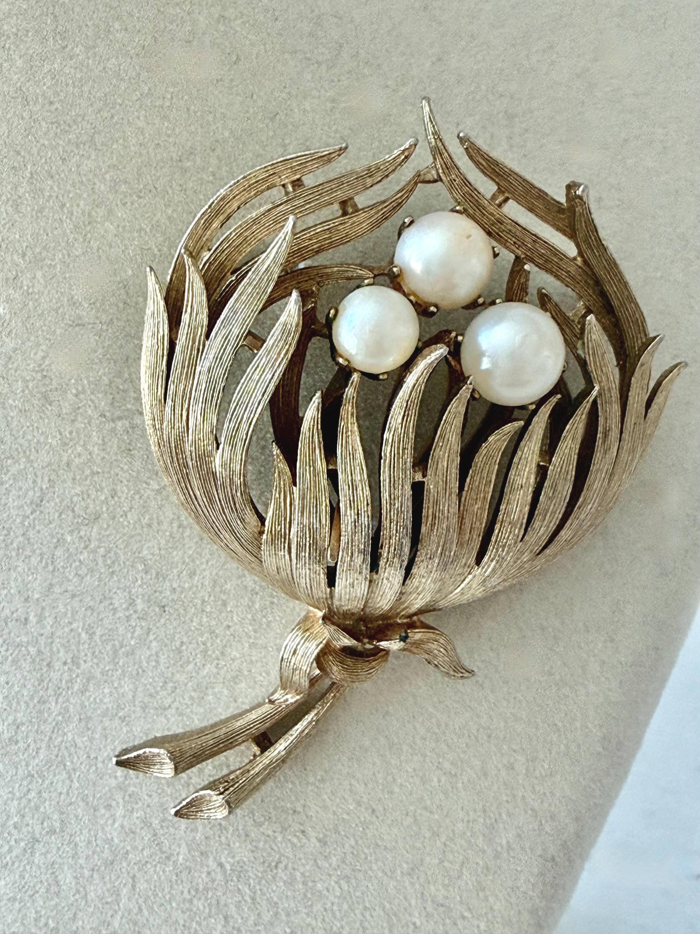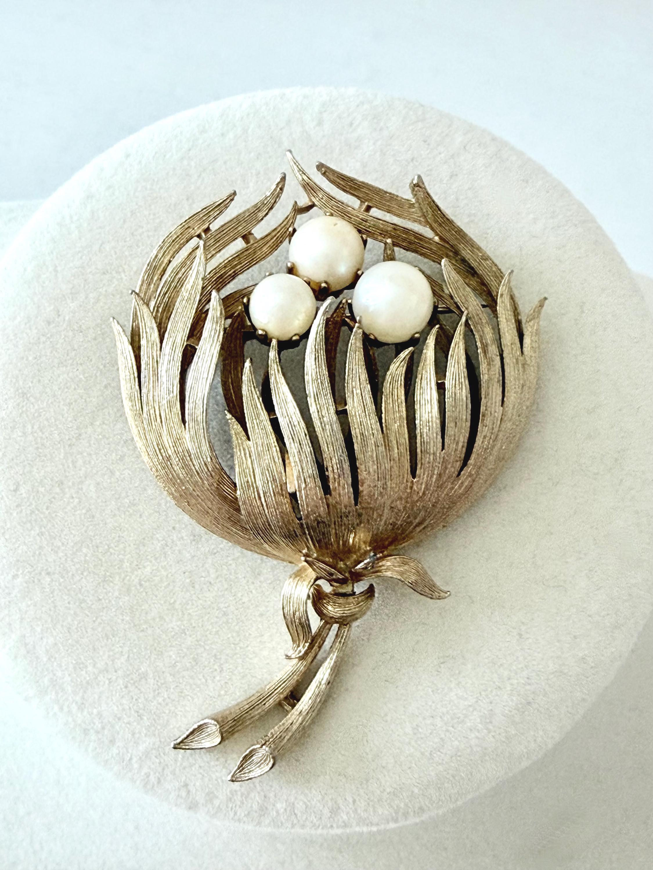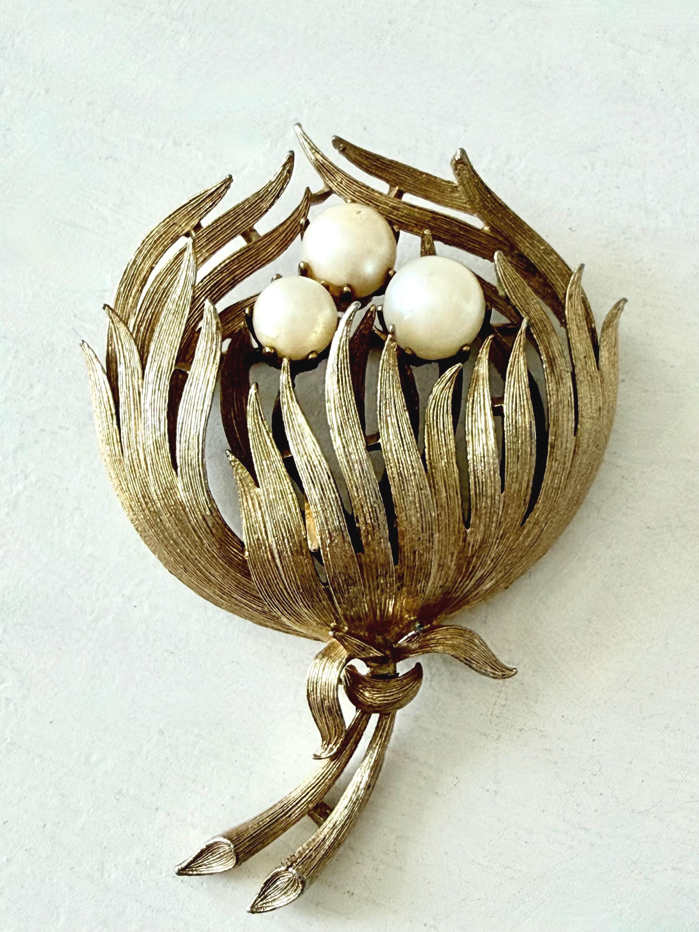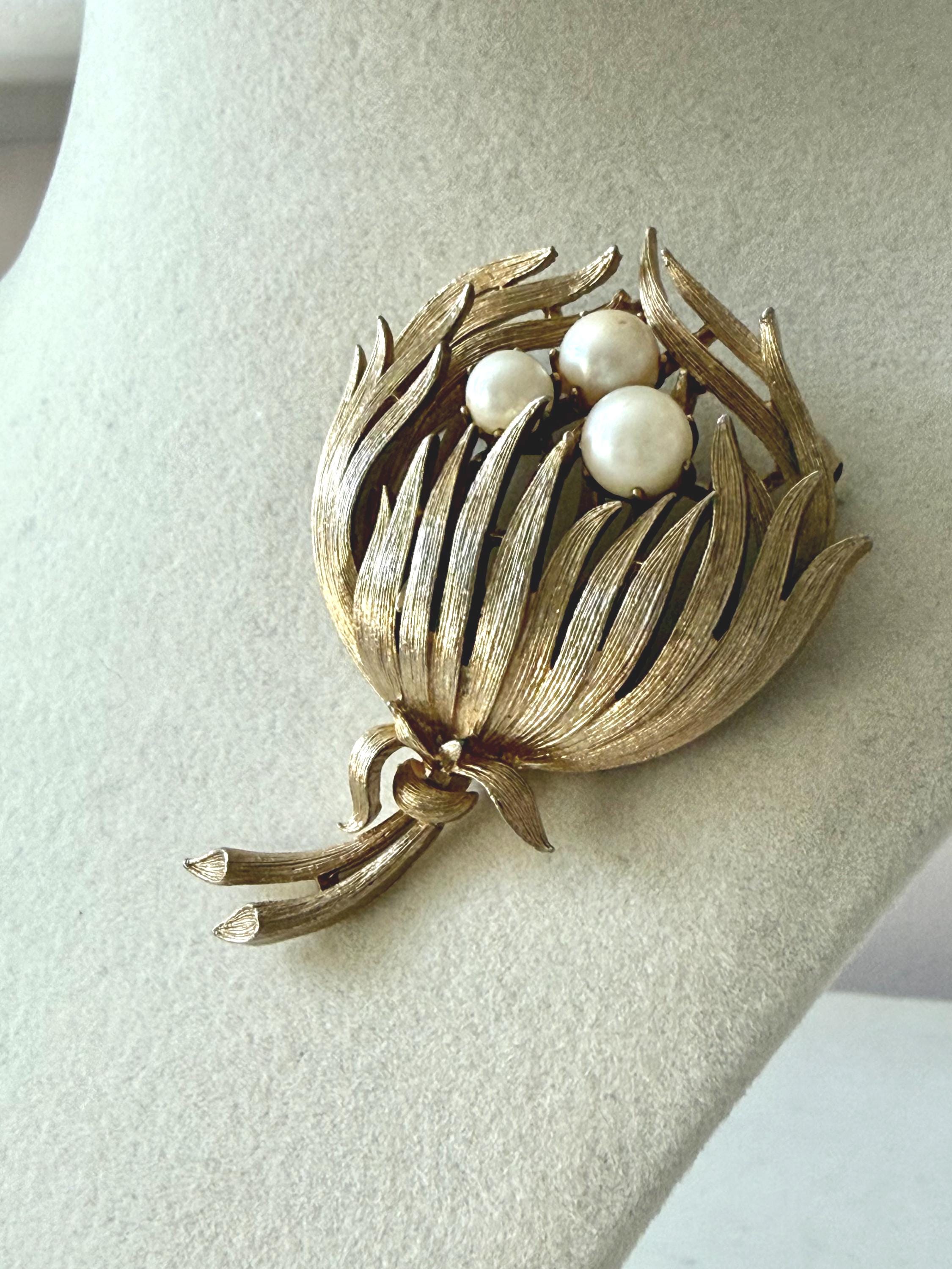 This listing is for a lovely vintage brooch by Lisner. Measuring 2 1/4" long and 1 1/8" wide, the domed, brushed gold tone brooch features wavy petals, leaves, and stems, all centered by three faux pearls. There is one tiny bite on one of the pearls (see photos), but the metal and clasp are in excellent condition. You will love the simple, dimensional design!