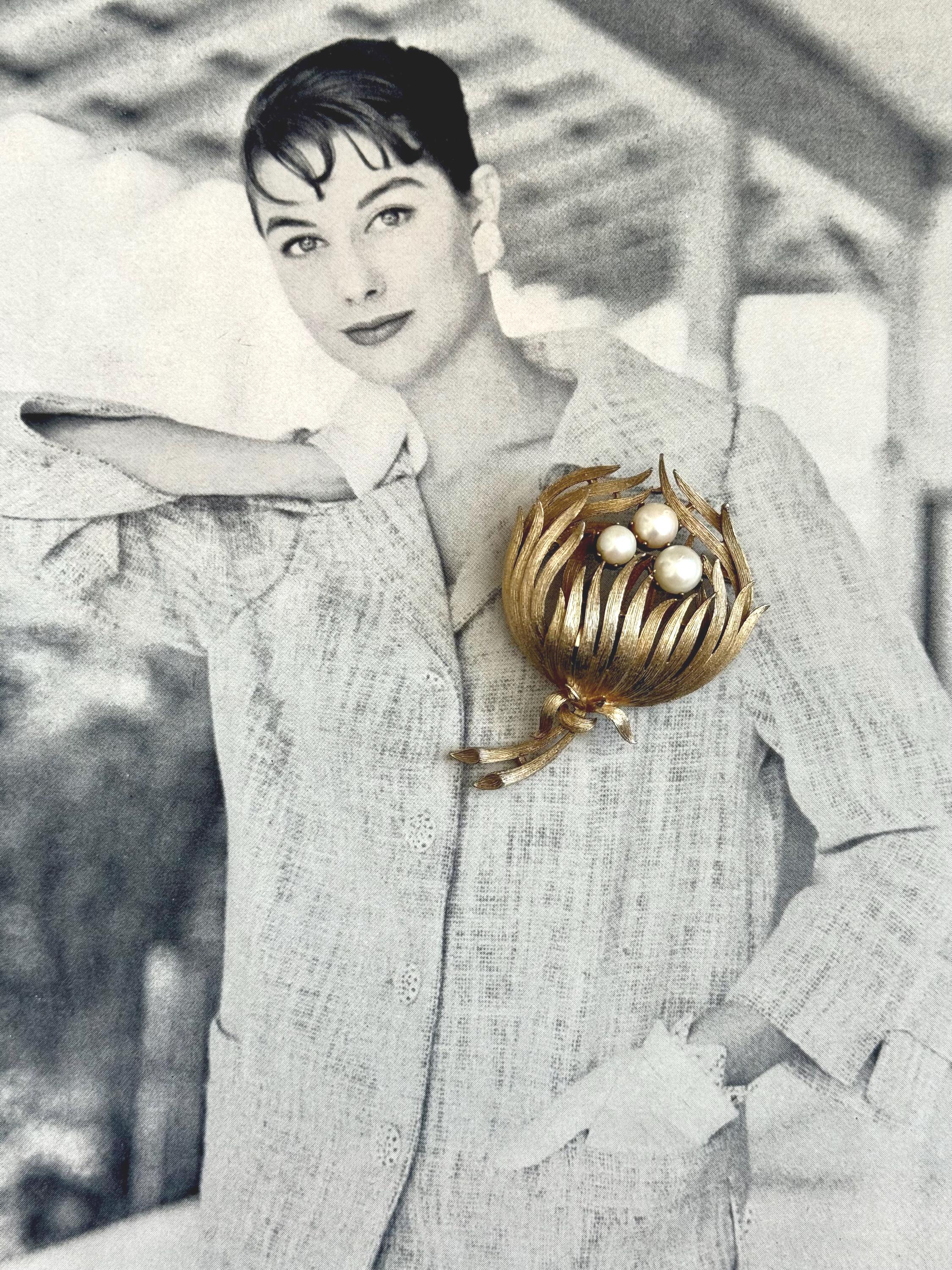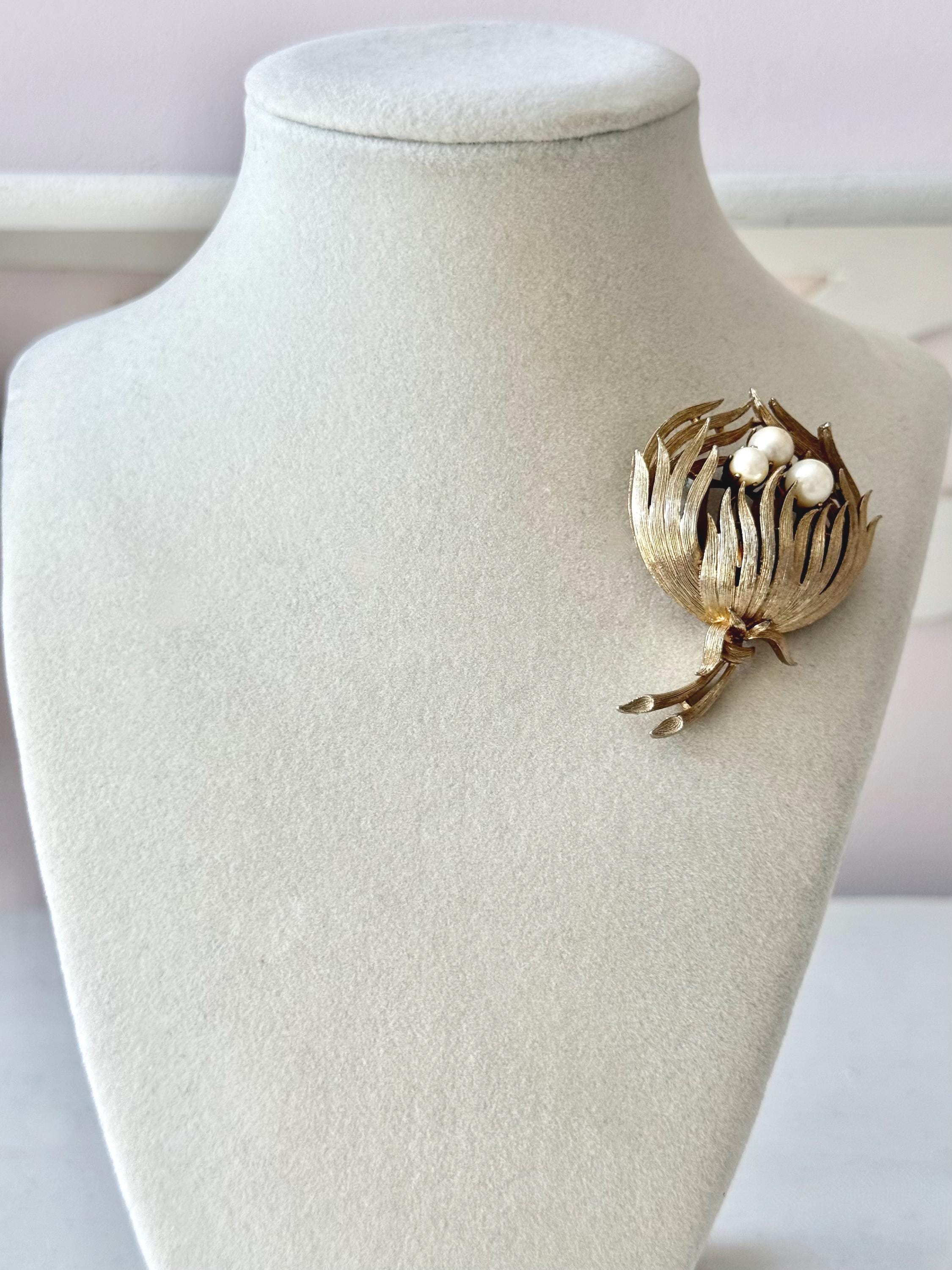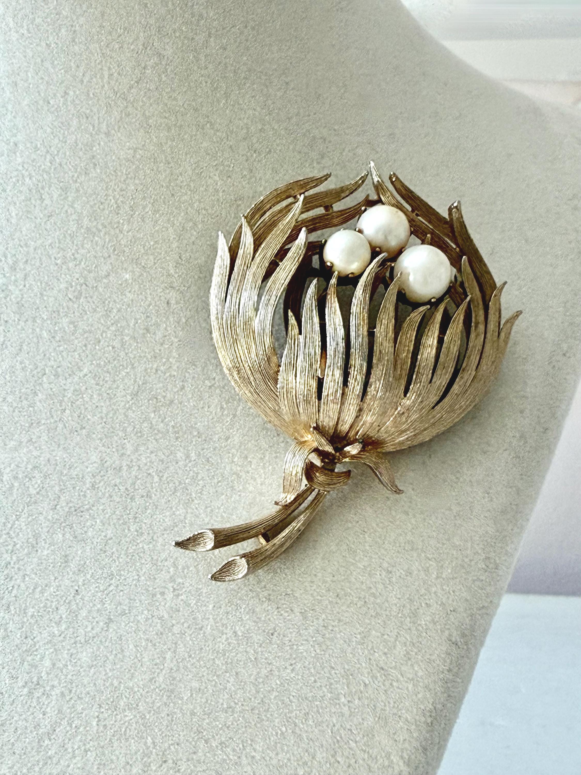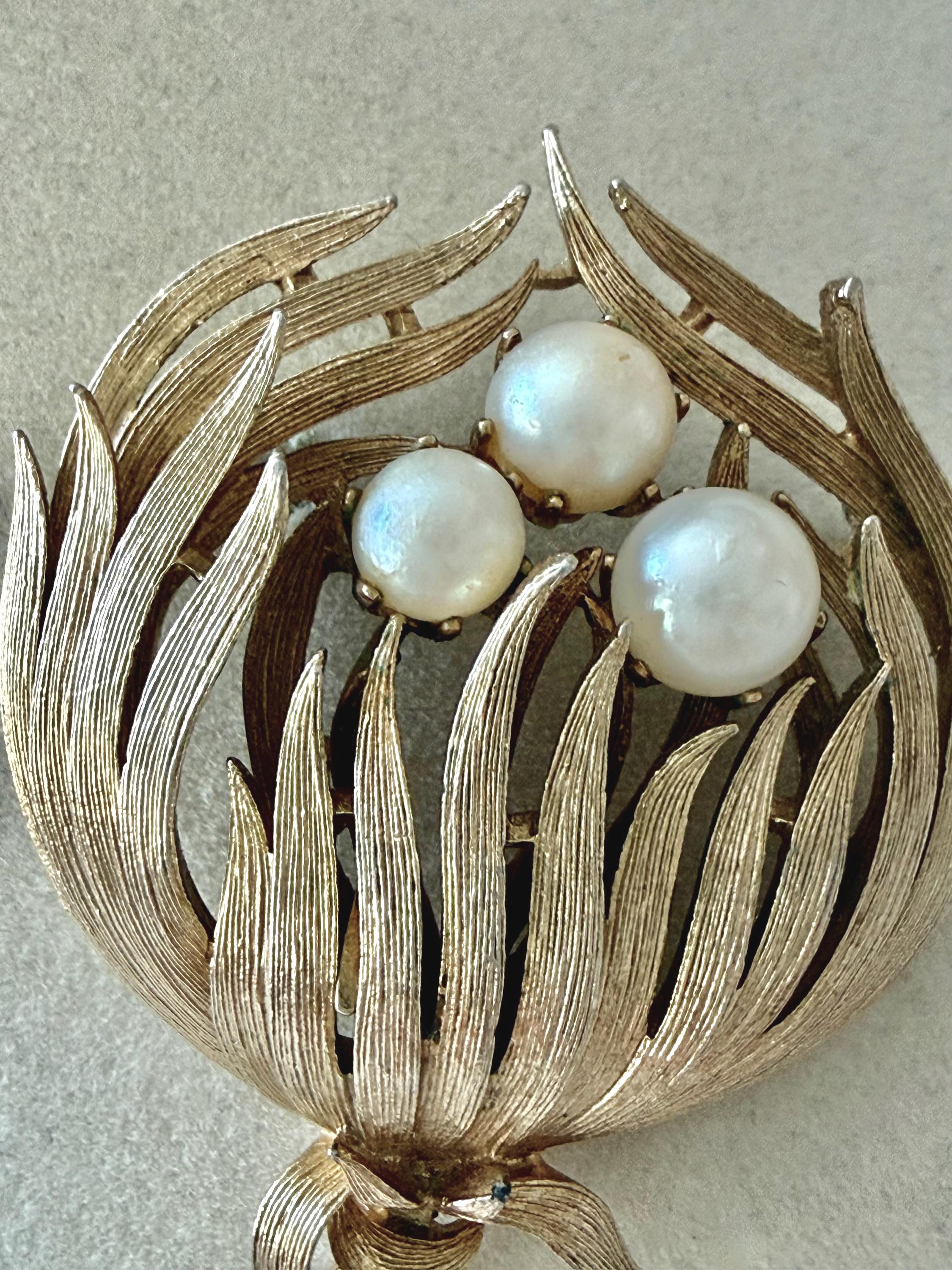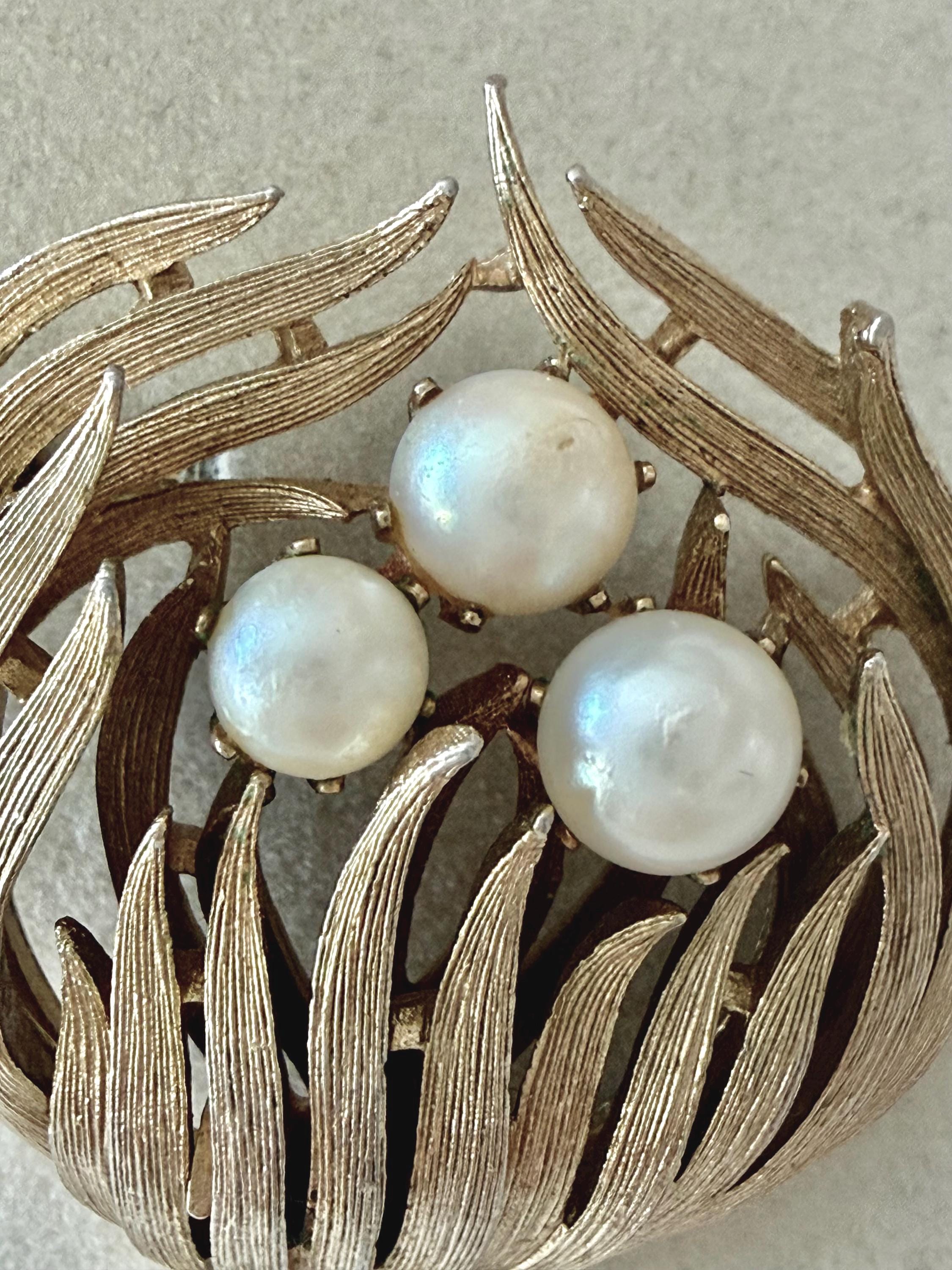 This listing is for a lovely vintage brooch by Lisner. Measuring 2 1/4" long and 1 1/8" wide, the domed, brushed gold tone brooch features wavy petals, leaves, and stems, all centered by three faux pearls. There is one tiny bite on one of the pearls (see photos), but the metal and clasp are in excellent condition. You will love the simple, dimensional design!