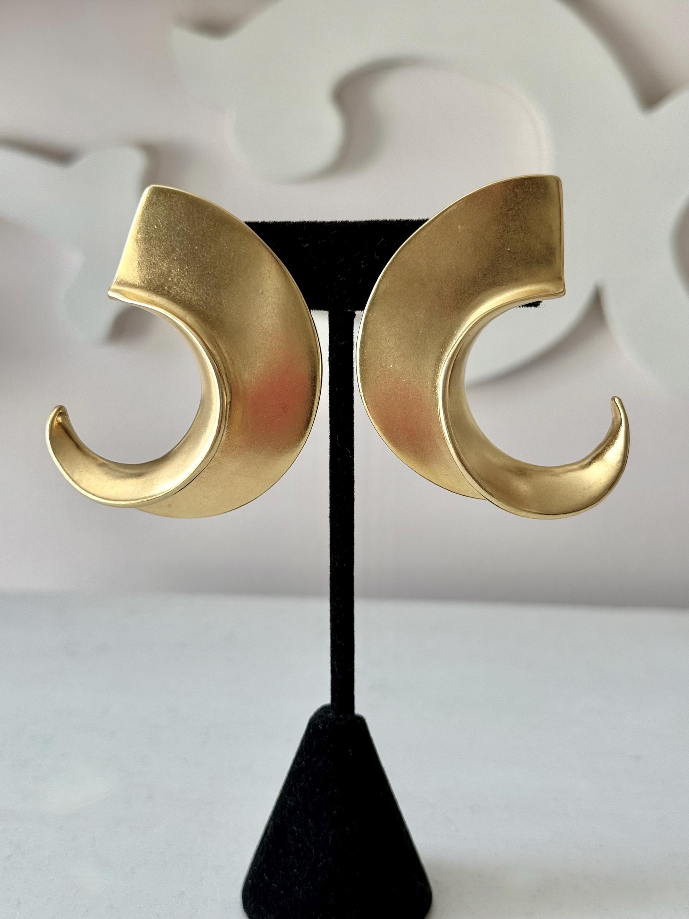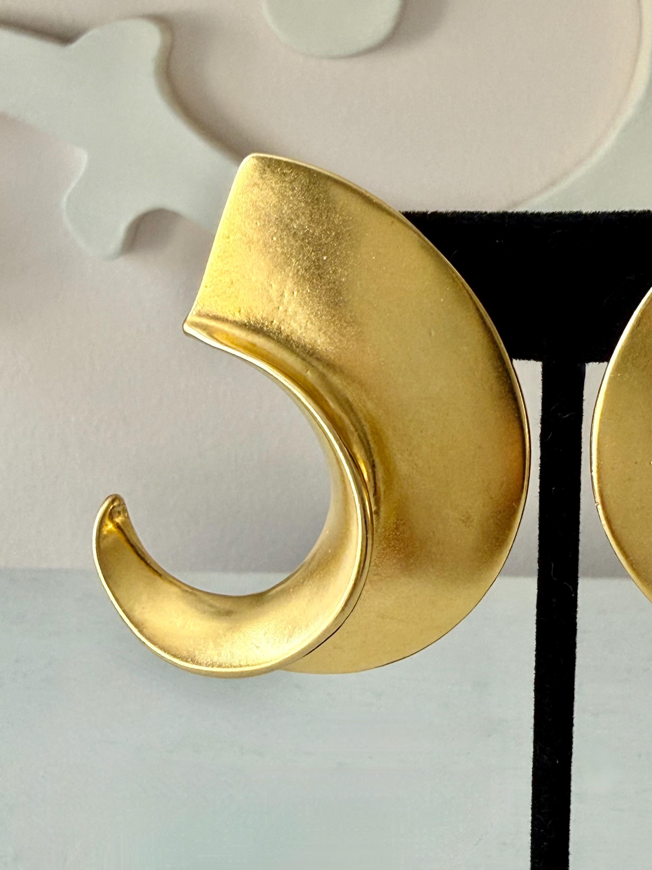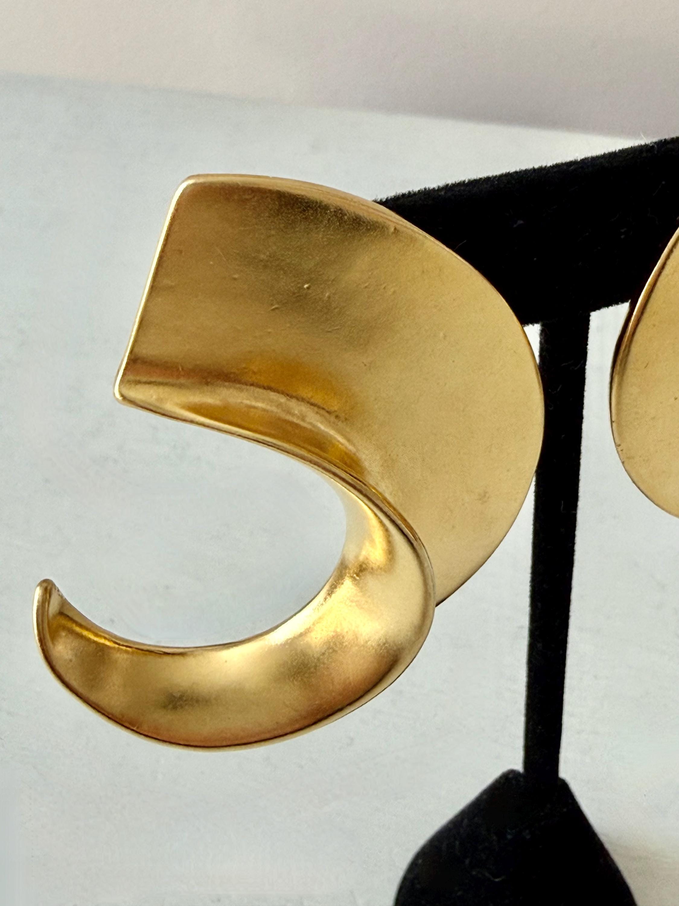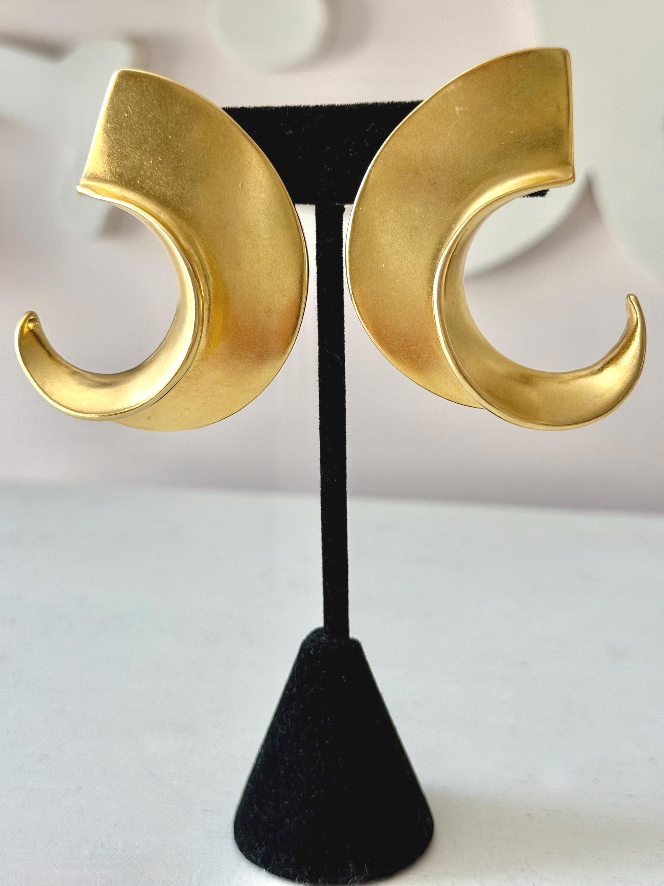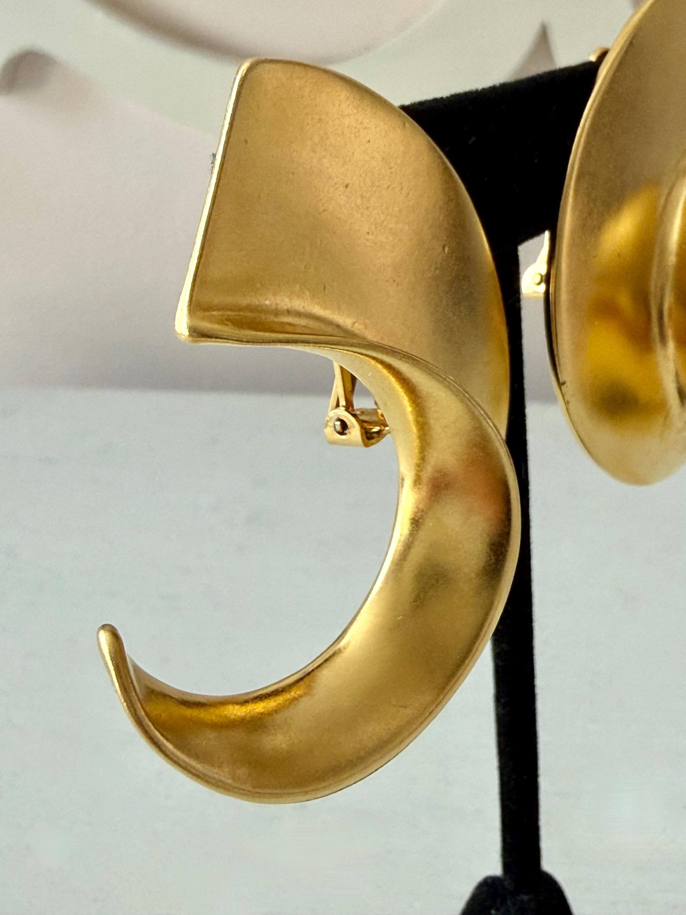 This listing is for a spectacular pair of clip on earrings by Kenneth J Lane. Measuring just over 2" in length and 1 3/8" wide, the satin gold tone metal earrings make a huge statement. Though likely made in the 1980s, the unique, oversize comma design is perfect for today. And these are in excellent, like new condition.