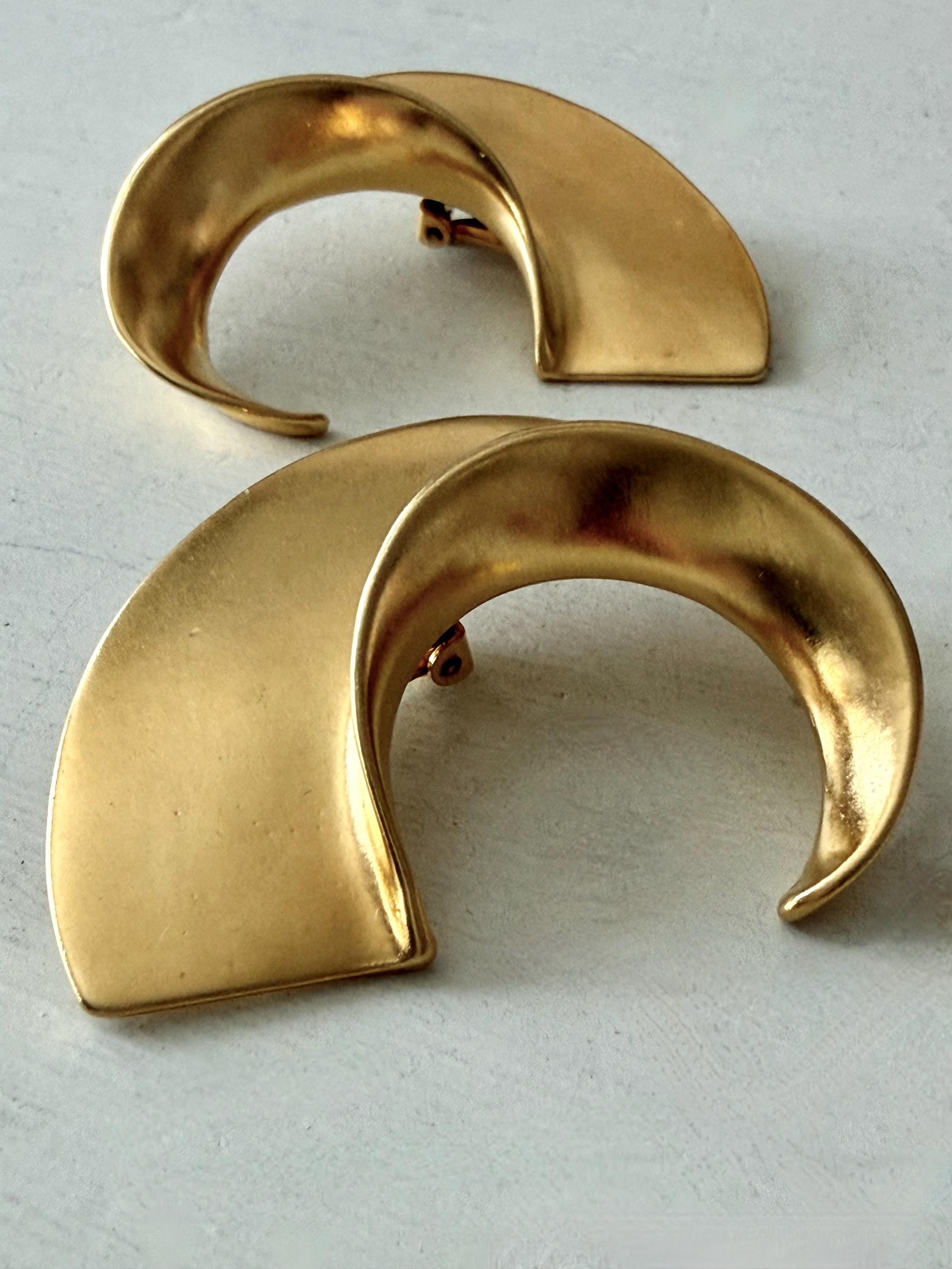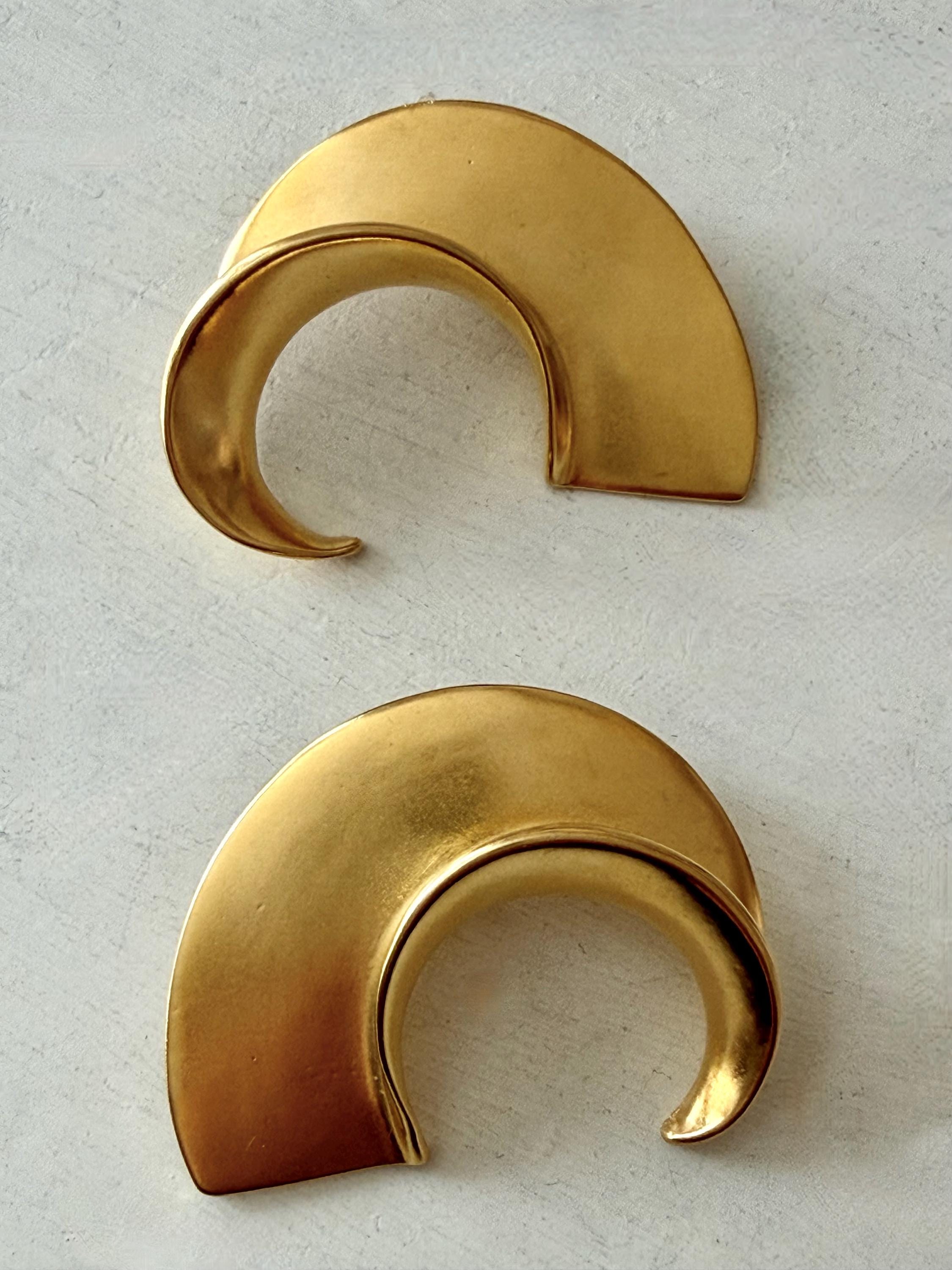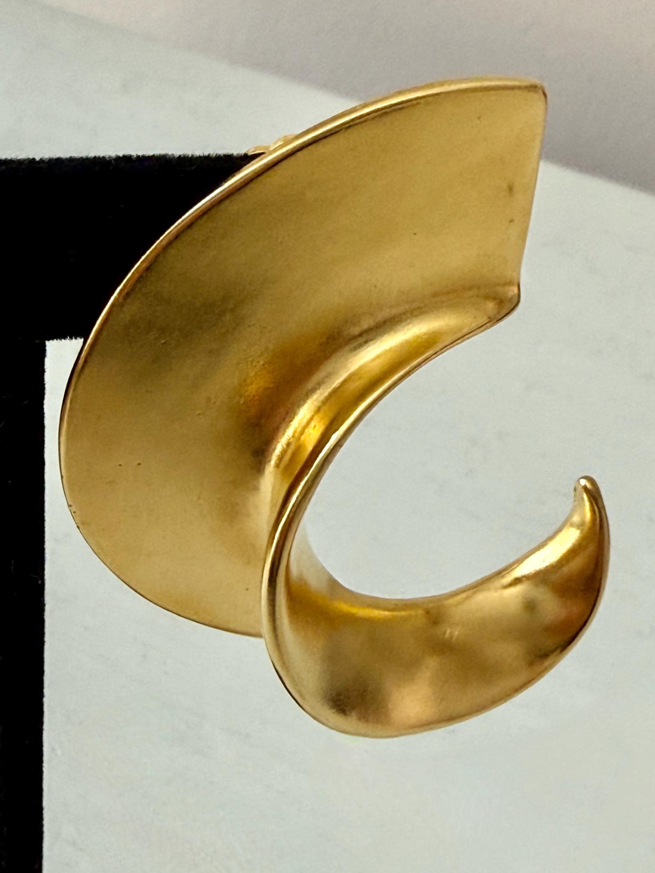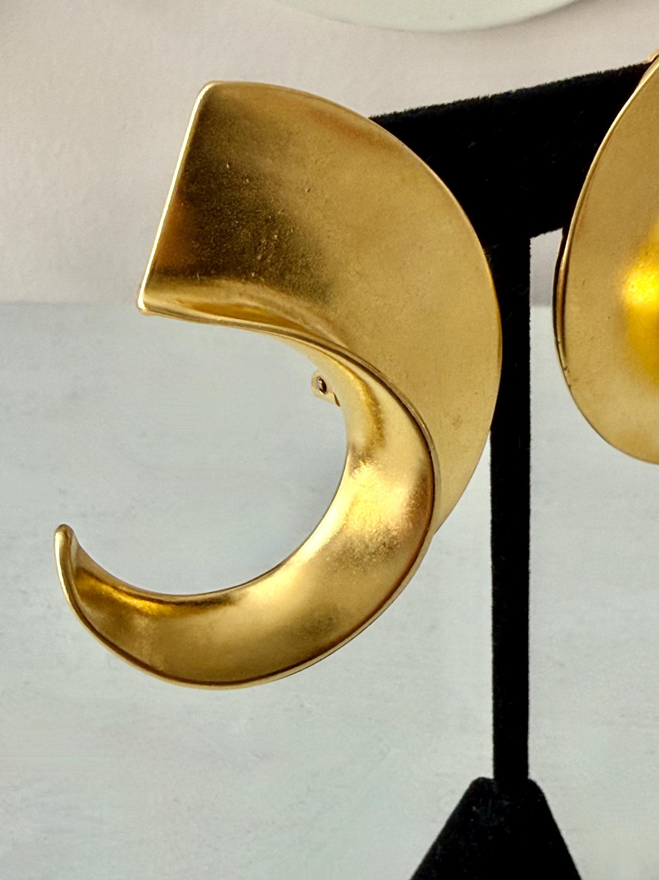 This listing is for a spectacular pair of clip on earrings by Kenneth J Lane. Measuring just over 2" in length and 1 3/8" wide, the satin gold tone metal earrings make a huge statement. Though likely made in the 1980s, the unique, oversize comma design is perfect for today. And these are in excellent, like new condition.