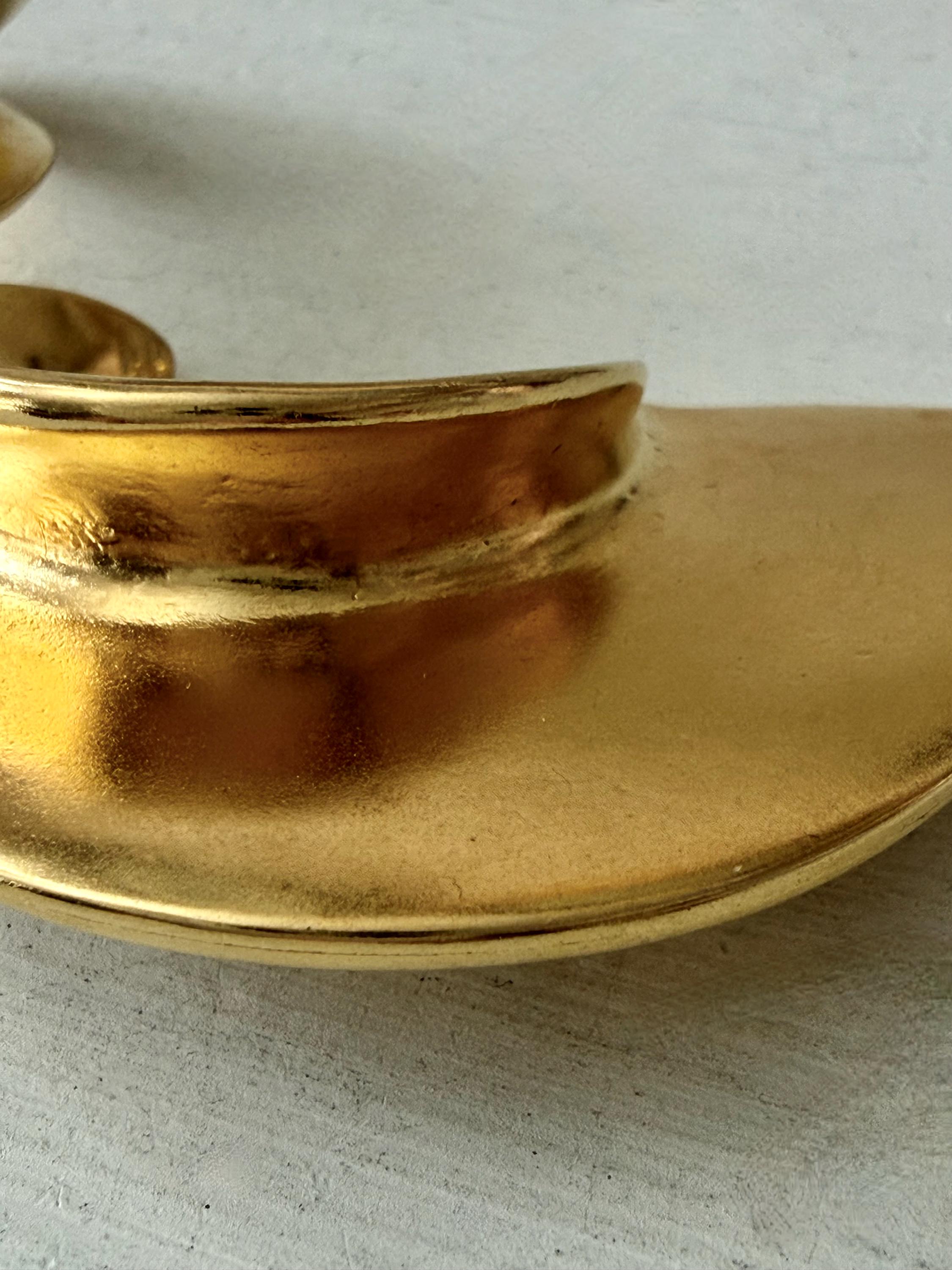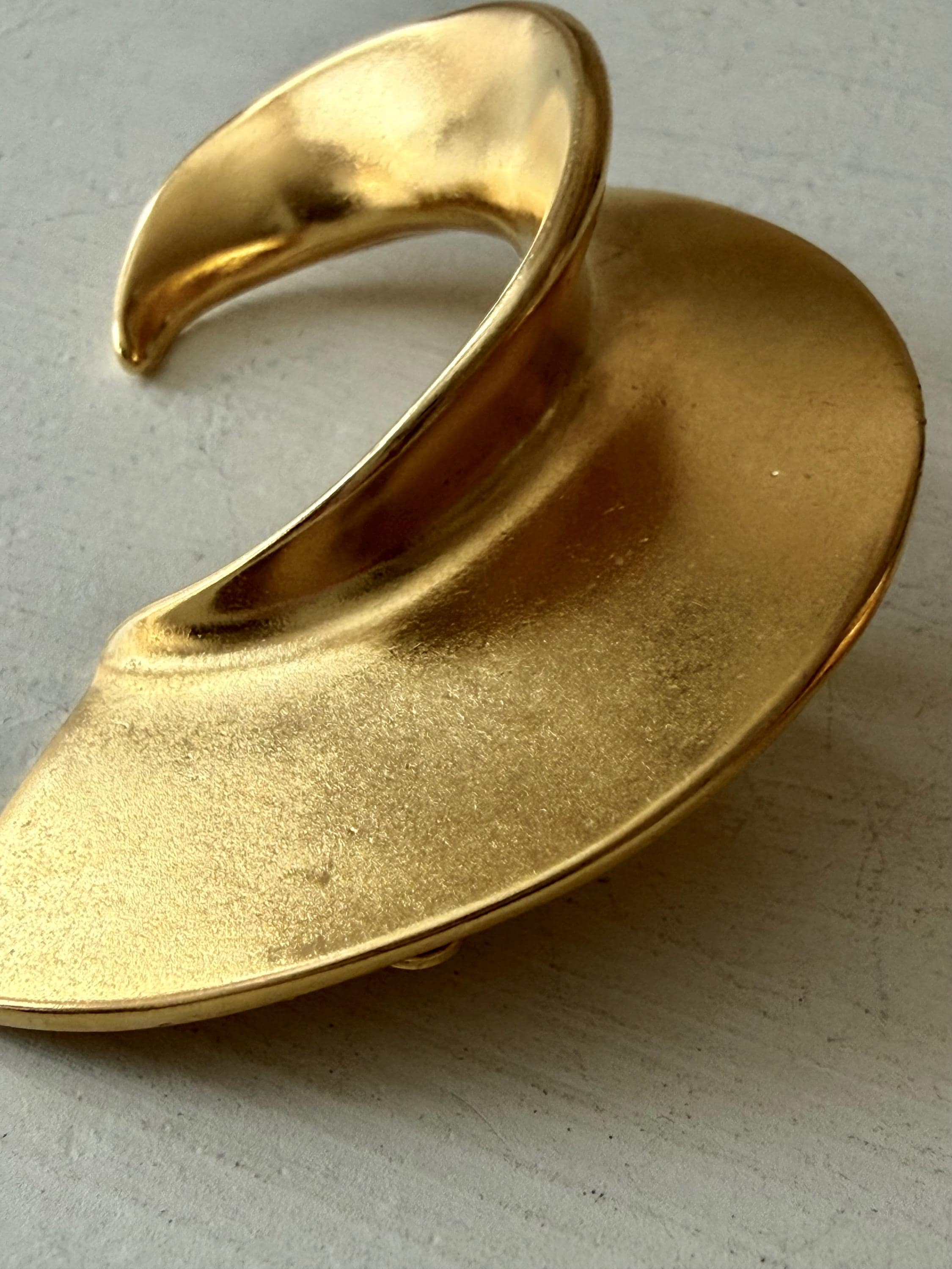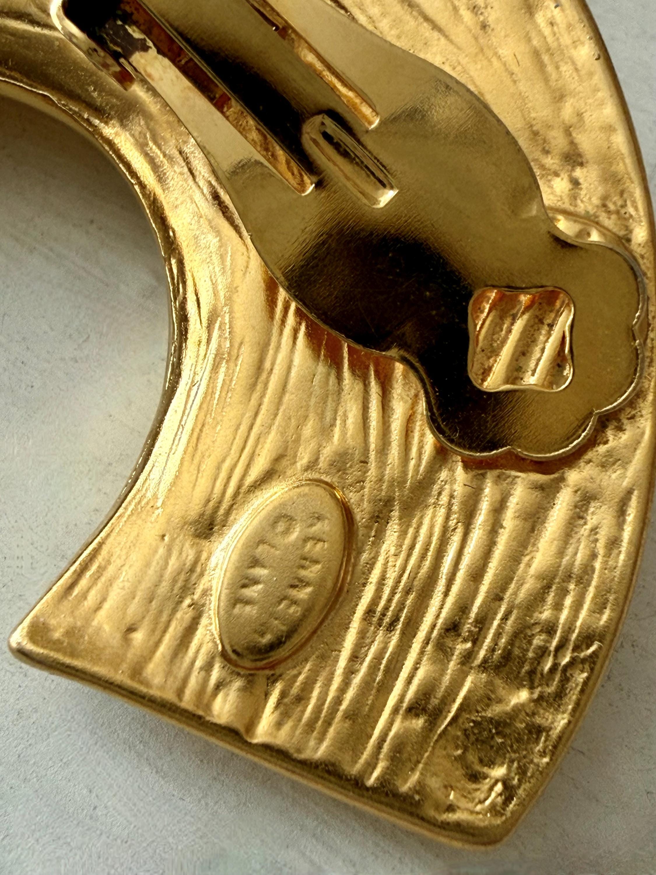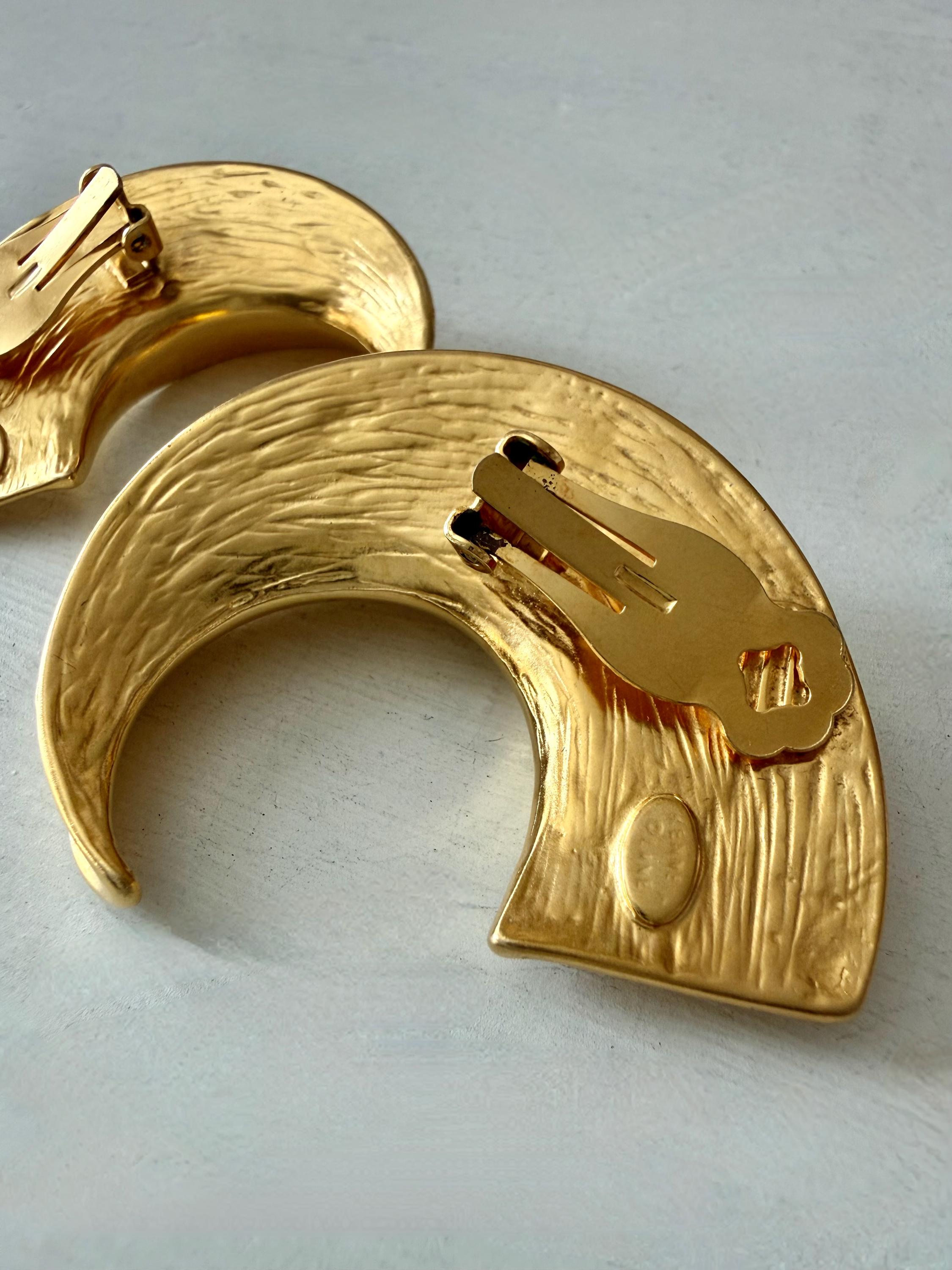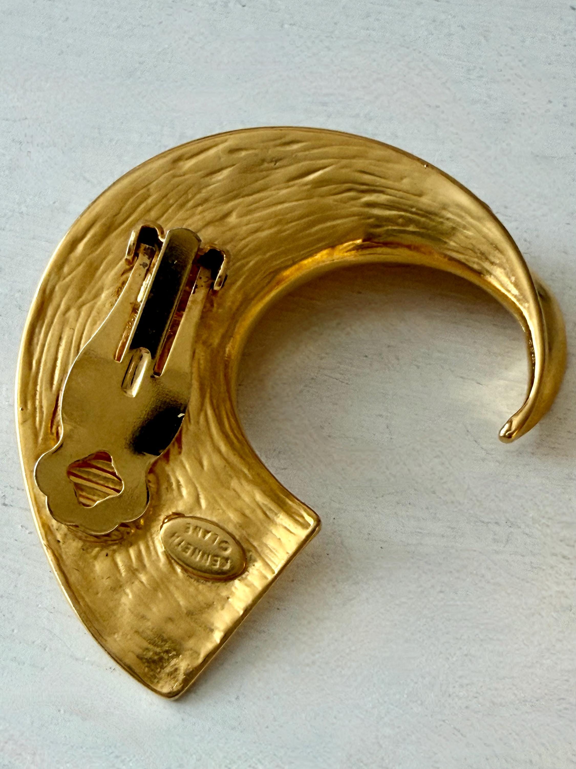 This listing is for a spectacular pair of clip on earrings by Kenneth J Lane. Measuring just over 2" in length and 1 3/8" wide, the satin gold tone metal earrings make a huge statement. Though likely made in the 1980s, the unique, oversize comma design is perfect for today. And these are in excellent, like new condition.