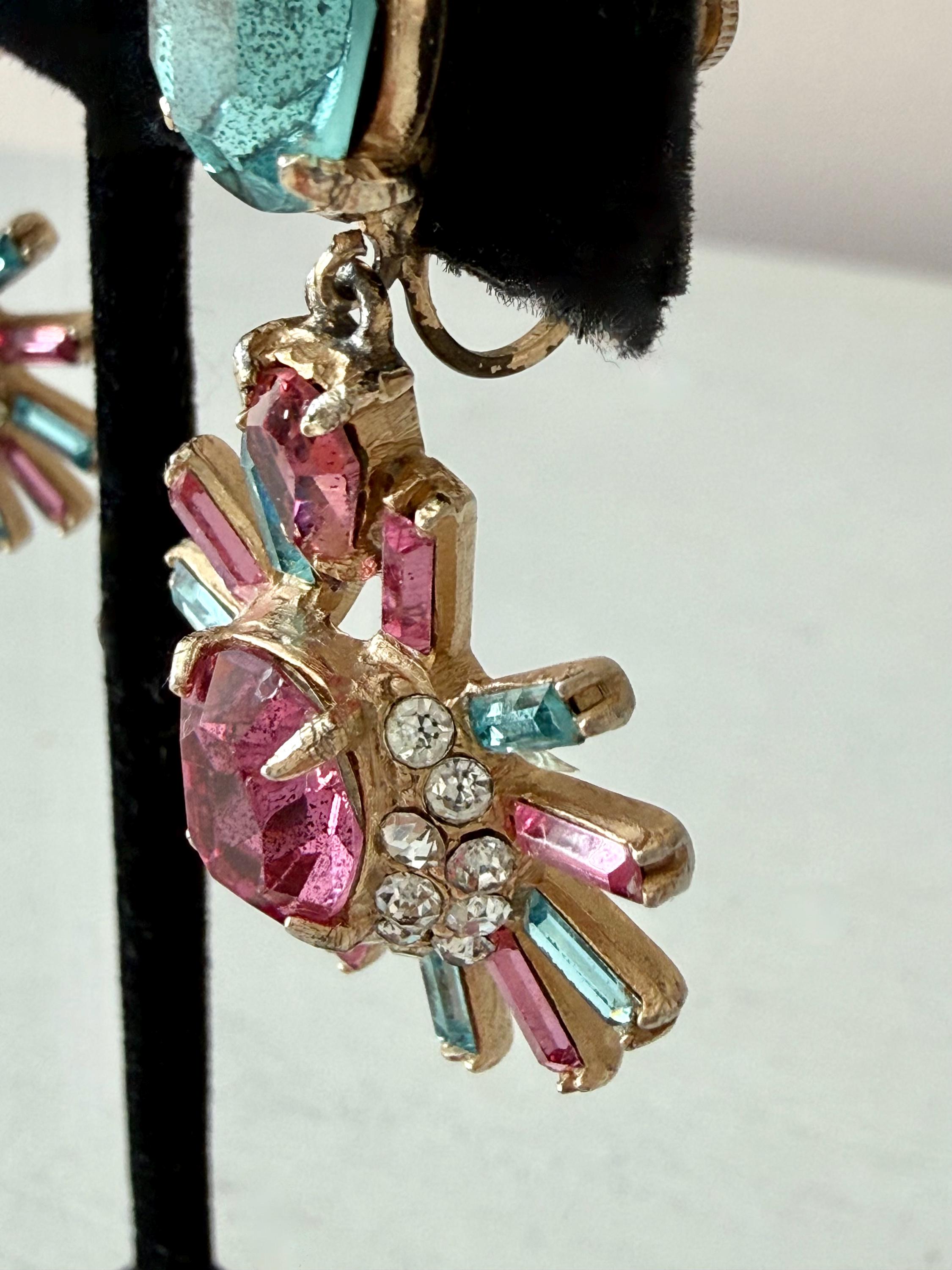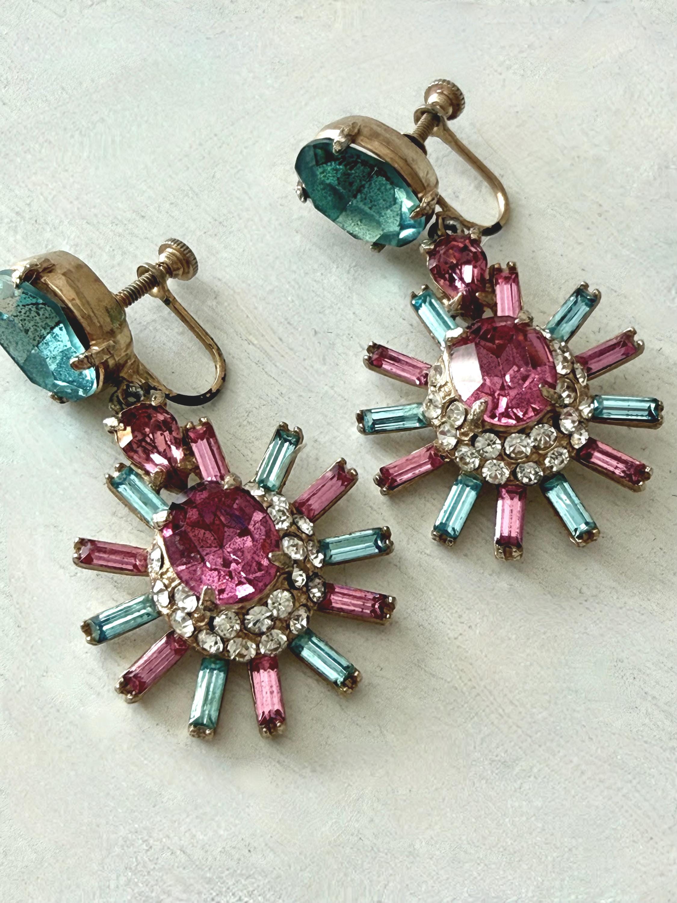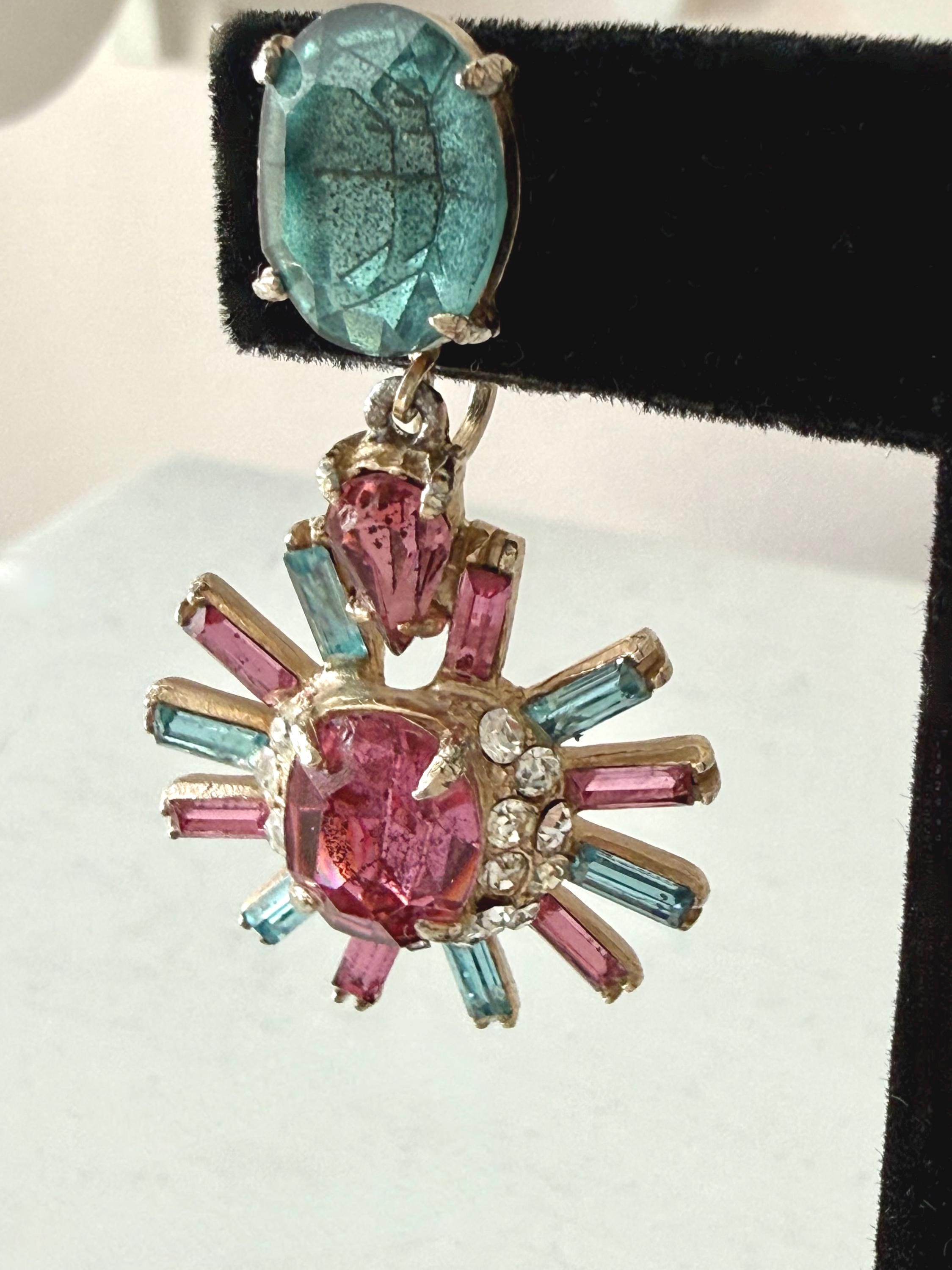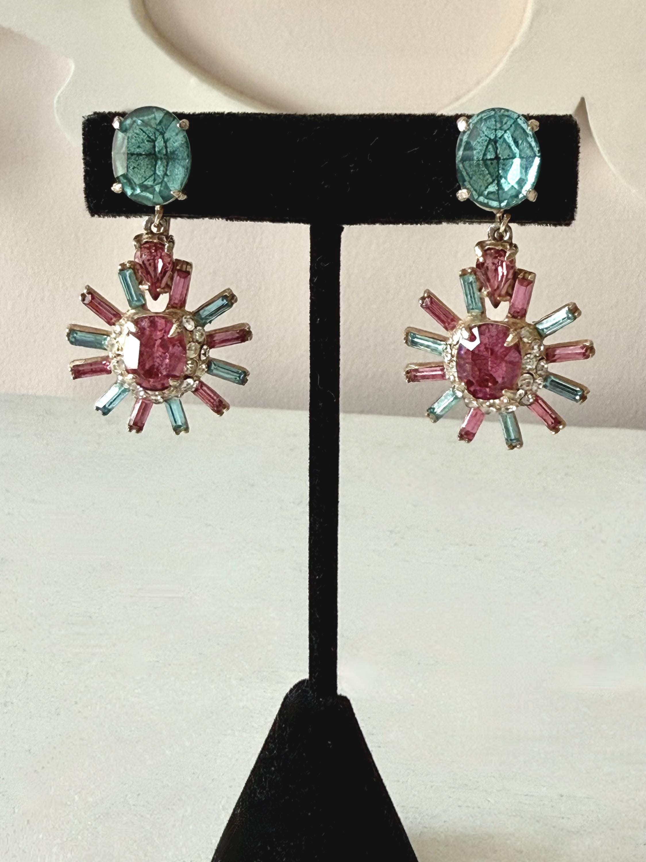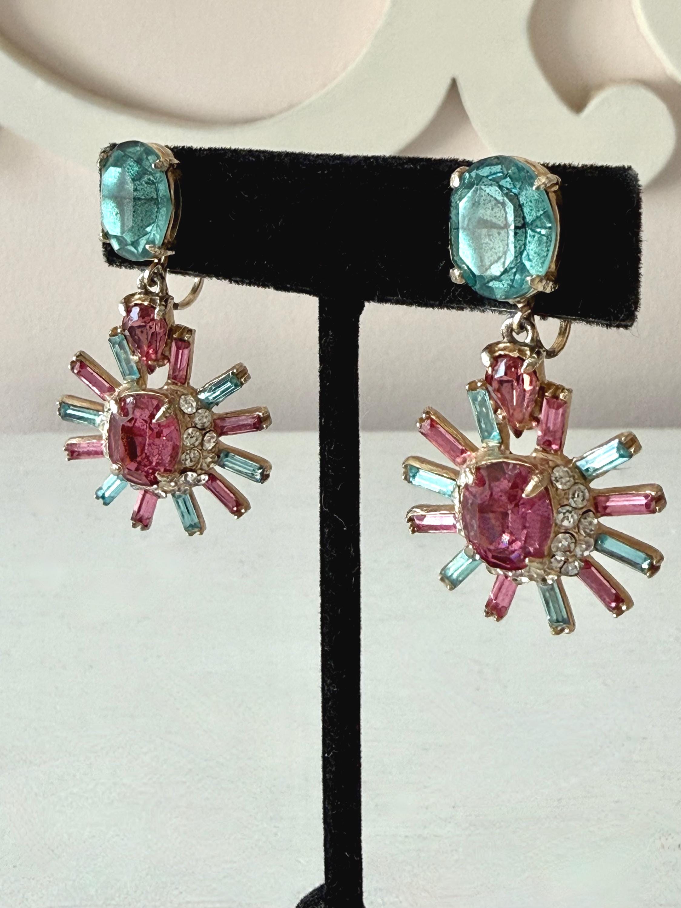 This listing is for a beautiful pair of vintage earrings, unsigned. With a total length of 1 3/4" and width of 1", the drop earrings feature a large aqua blue stone at the top that holds a starburst dangle. The pink and aqua rhinestones, with an additional layer of clear stones, really sparkle and capture the light. All stones are intact and the screw backs are secure. They are simply gorgeous.