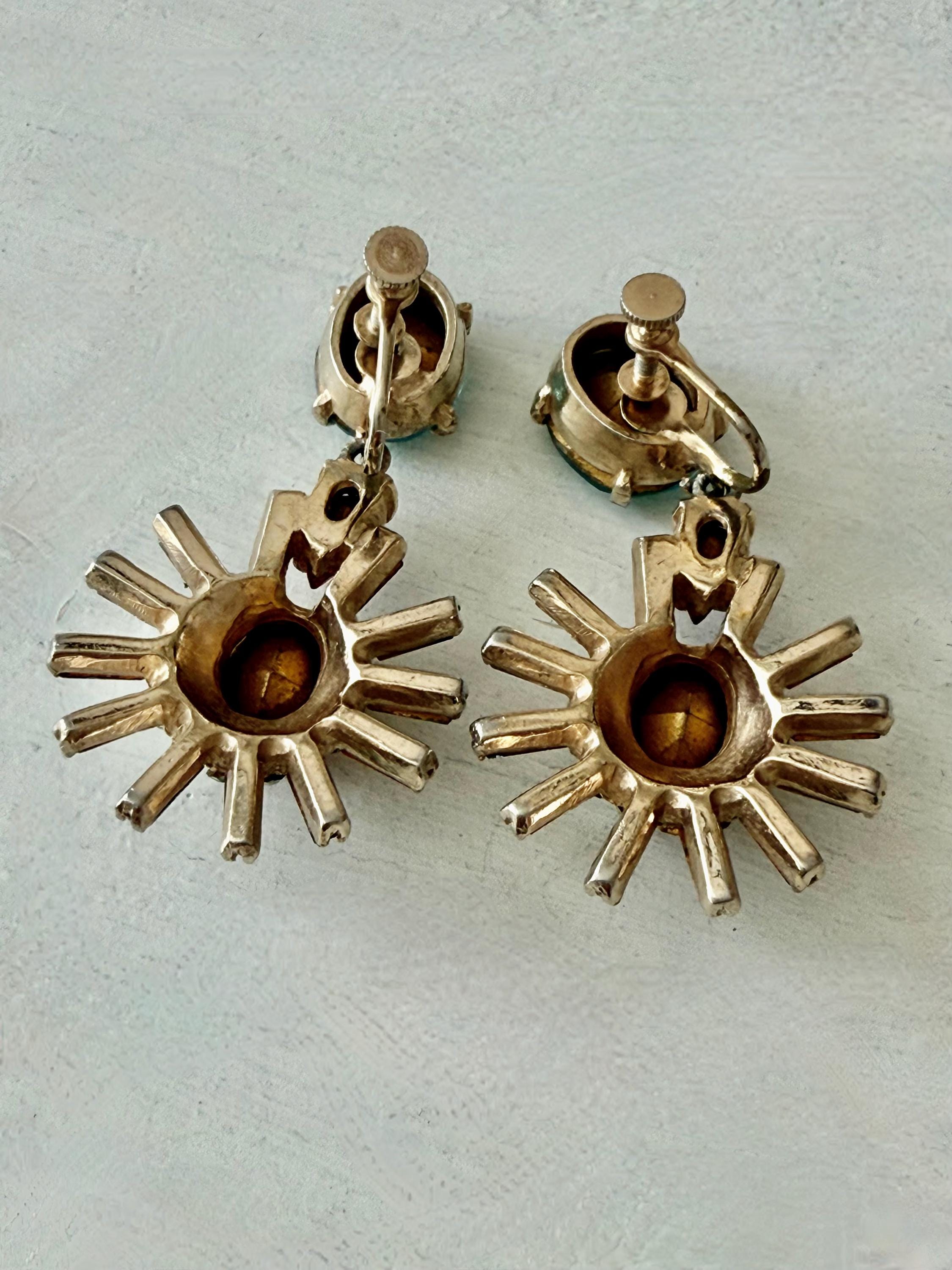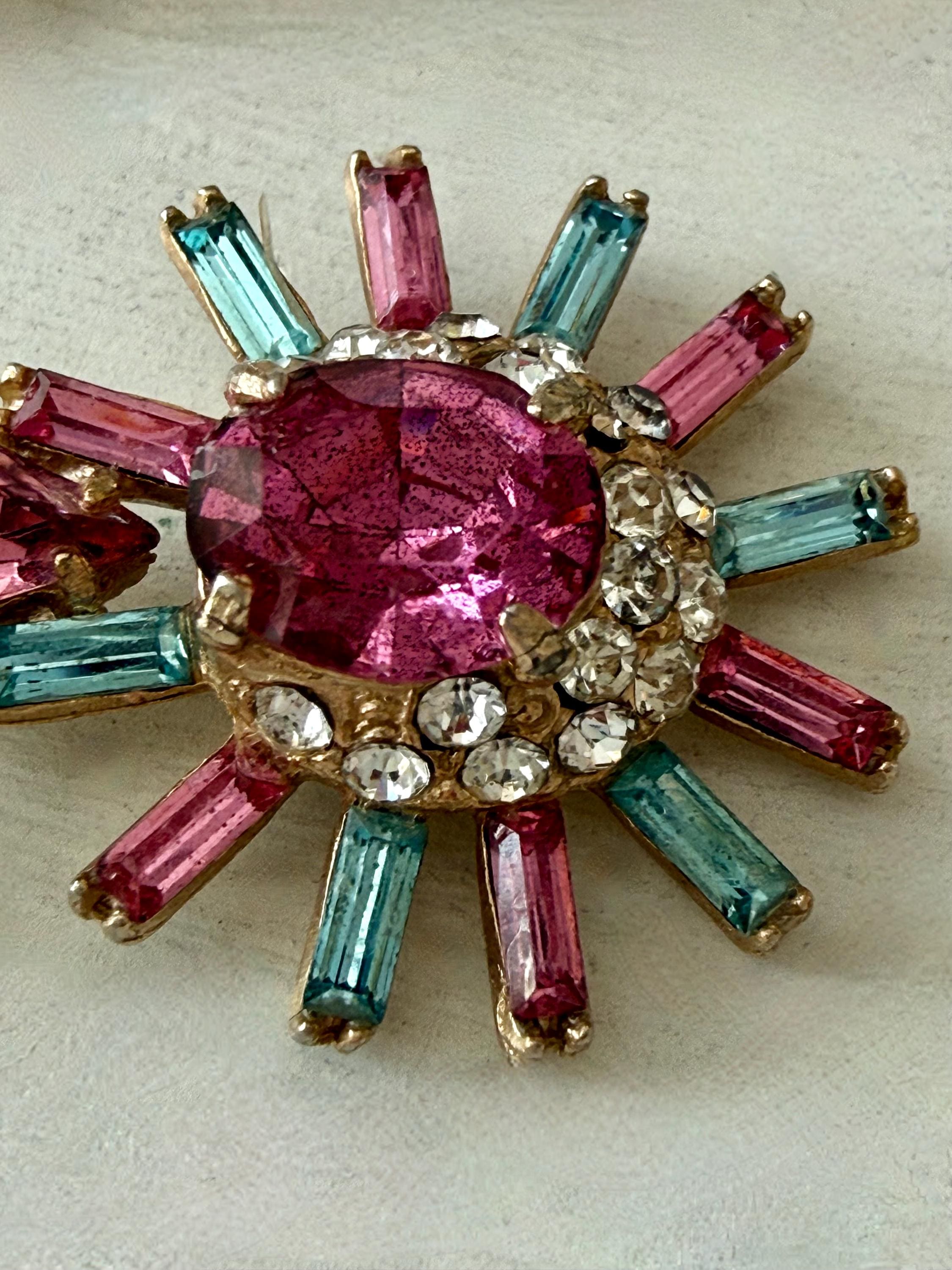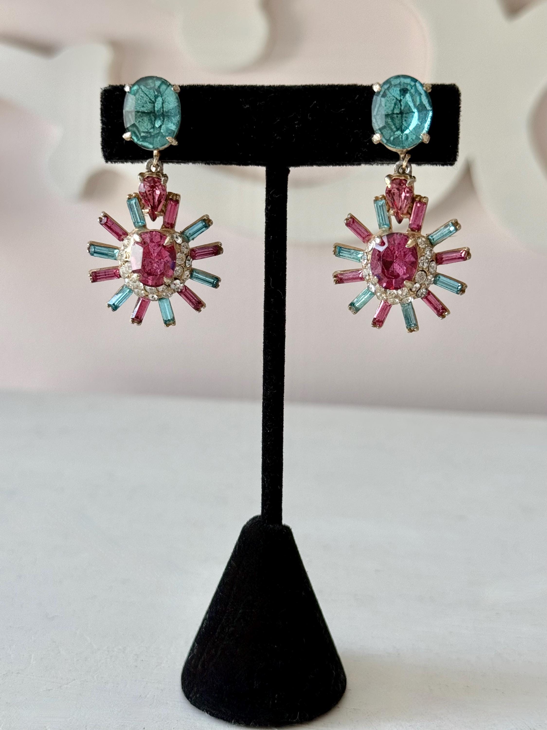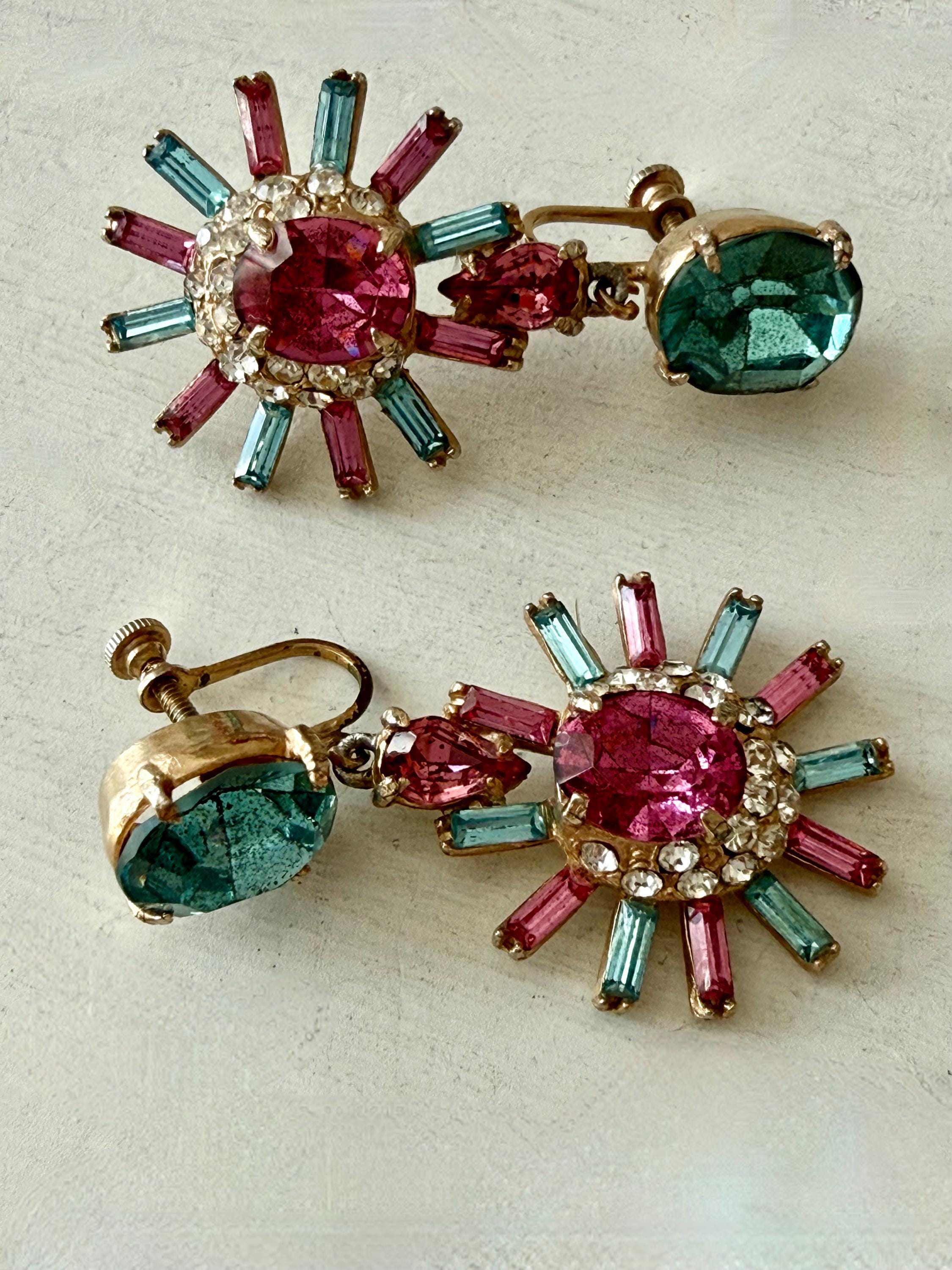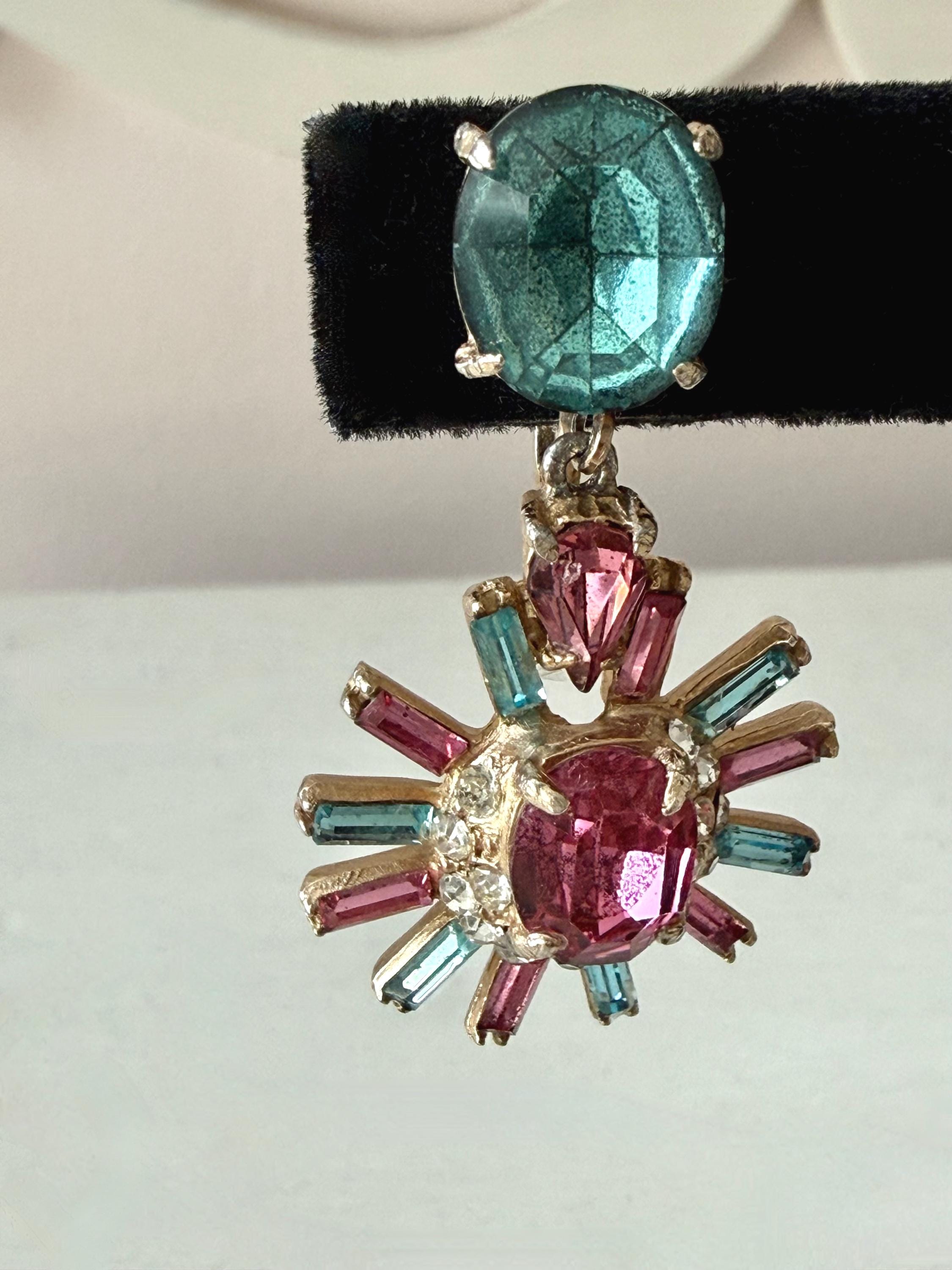 This listing is for a beautiful pair of vintage earrings, unsigned. With a total length of 1 3/4" and width of 1", the drop earrings feature a large aqua blue stone at the top that holds a starburst dangle. The pink and aqua rhinestones, with an additional layer of clear stones, really sparkle and capture the light. All stones are intact and the screw backs are secure. They are simply gorgeous.