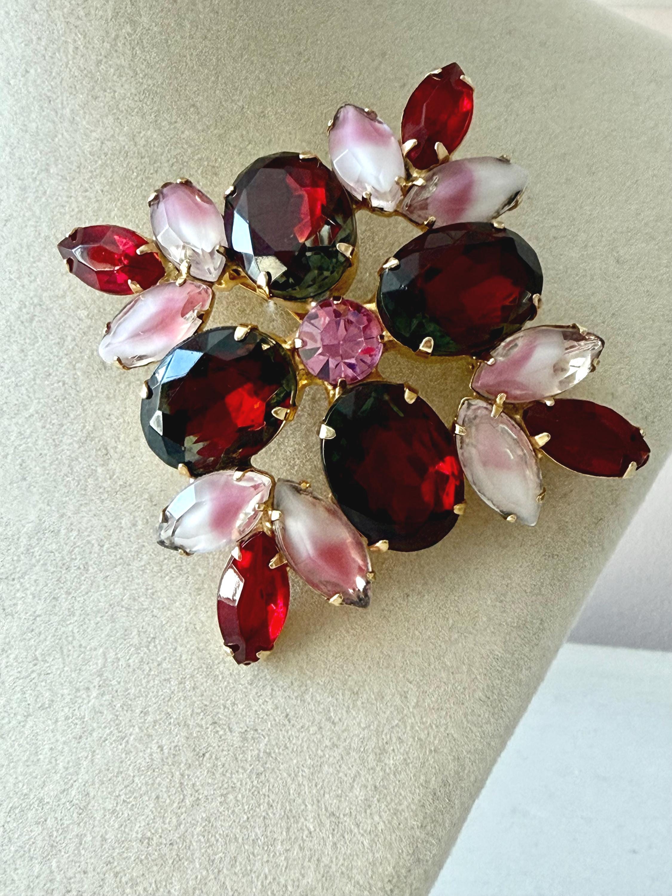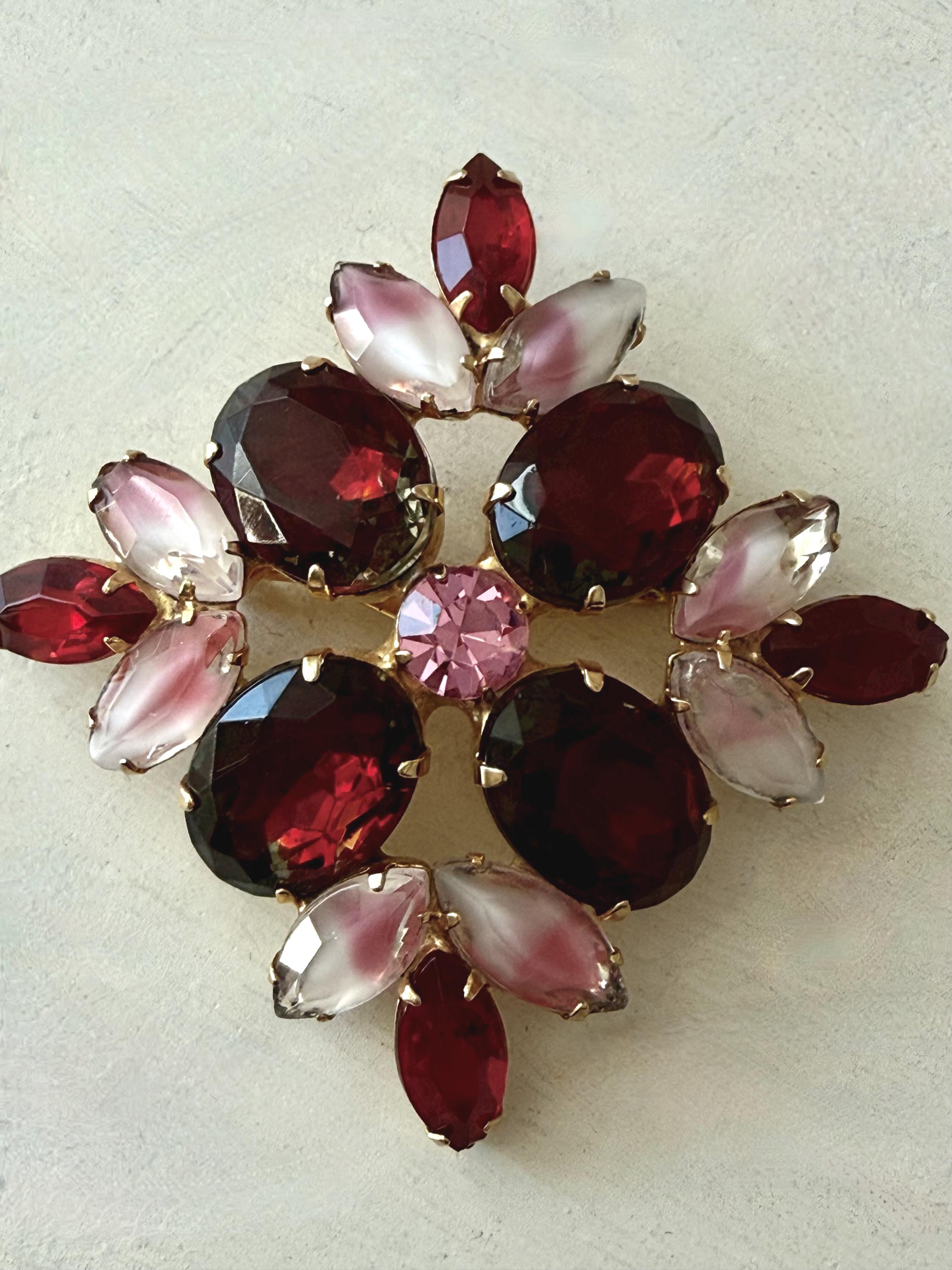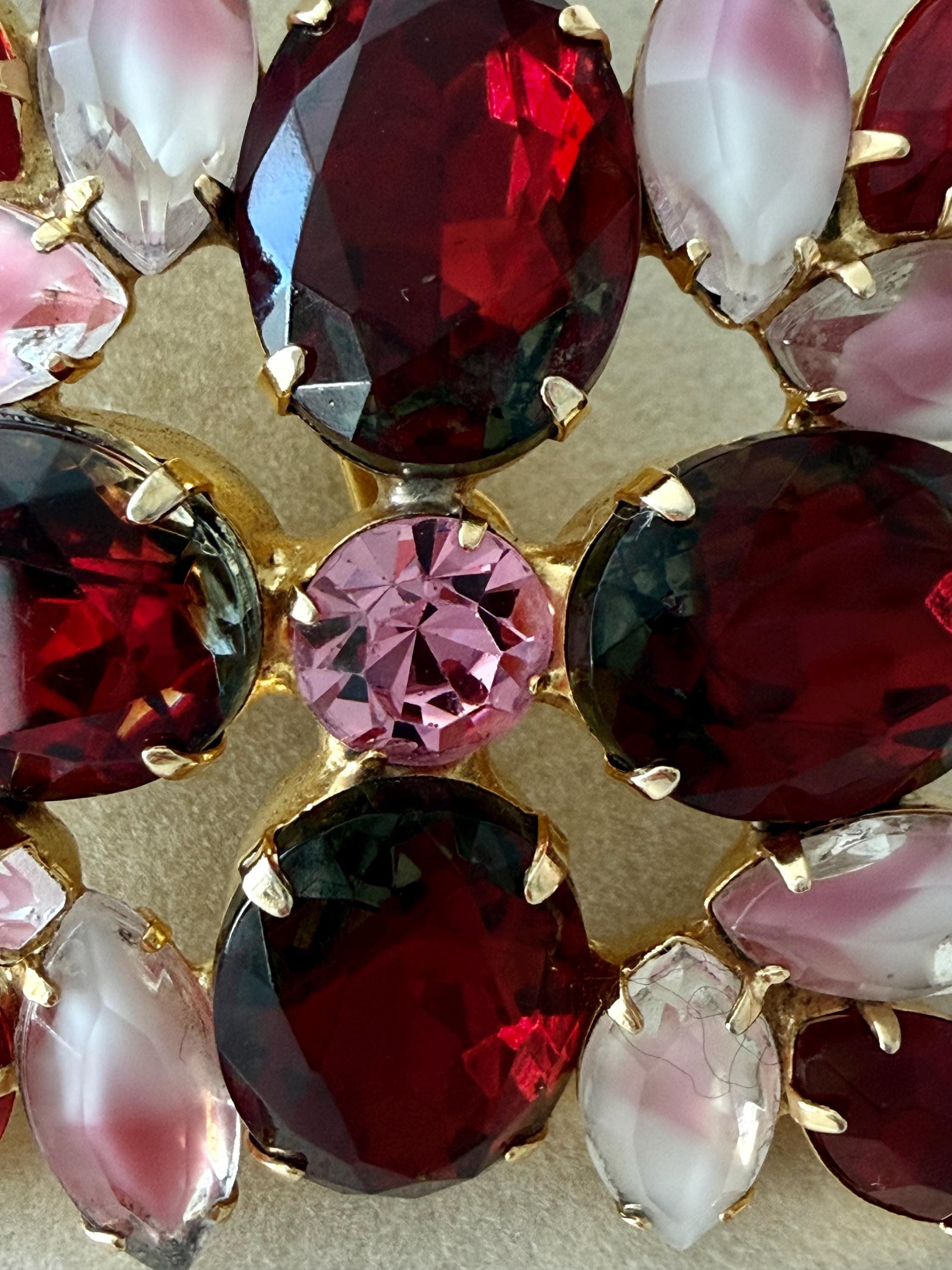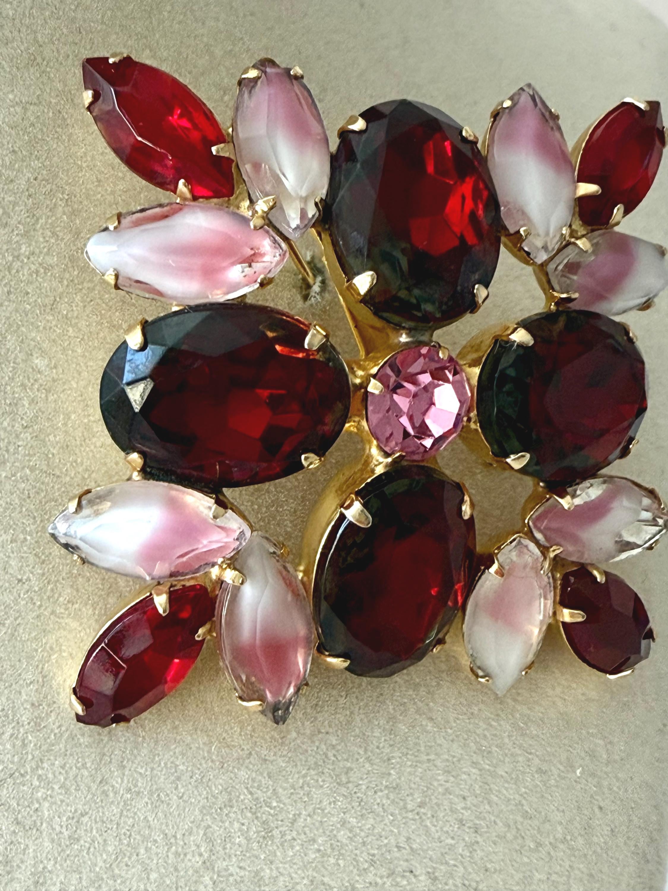 This listing is for an absolutely gorgeous, unsigned, vintage brooch. Measuring 2" by 2", the gold tone floral design is centered by four very large, deep red cushion stones with tips of bright red open-backed marquise stones. But the eight pink and white givre glass stones are the true stars of this beautiful brooch. All stones are intact, the clasp is secure and it is in very good condition. Perfect anytime but especially for Valentines and Christmas!