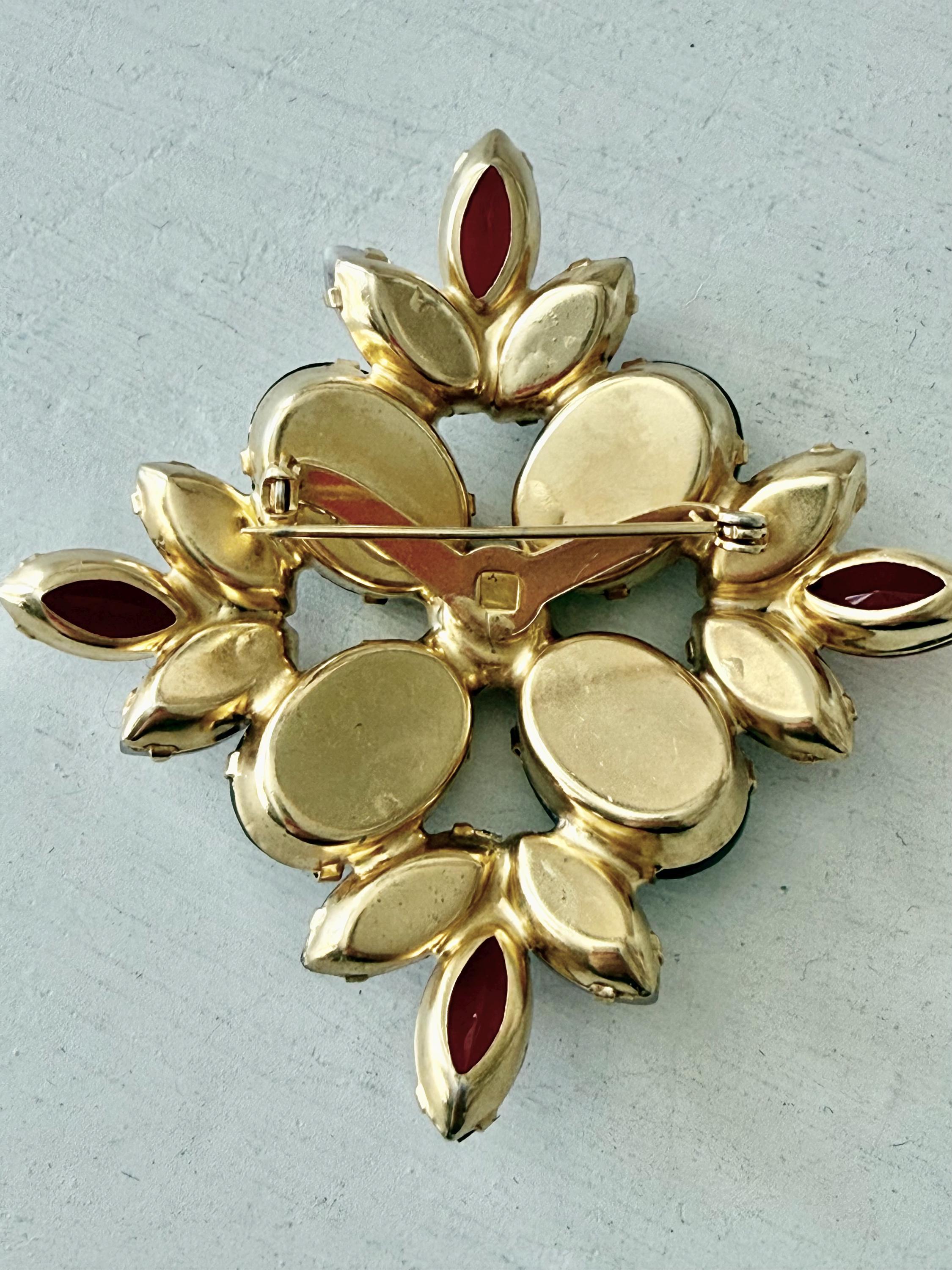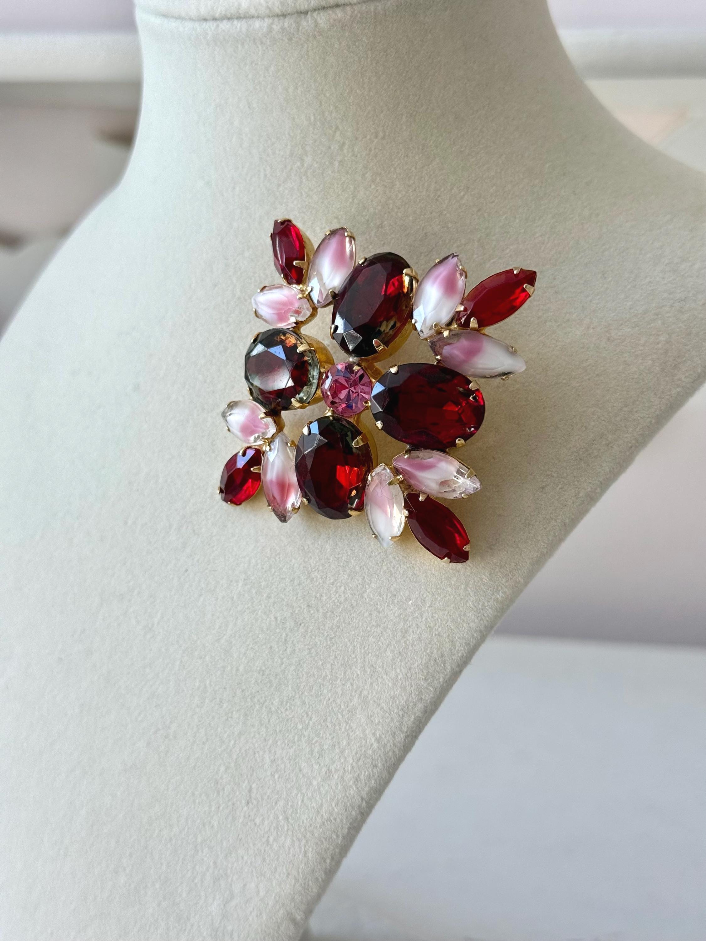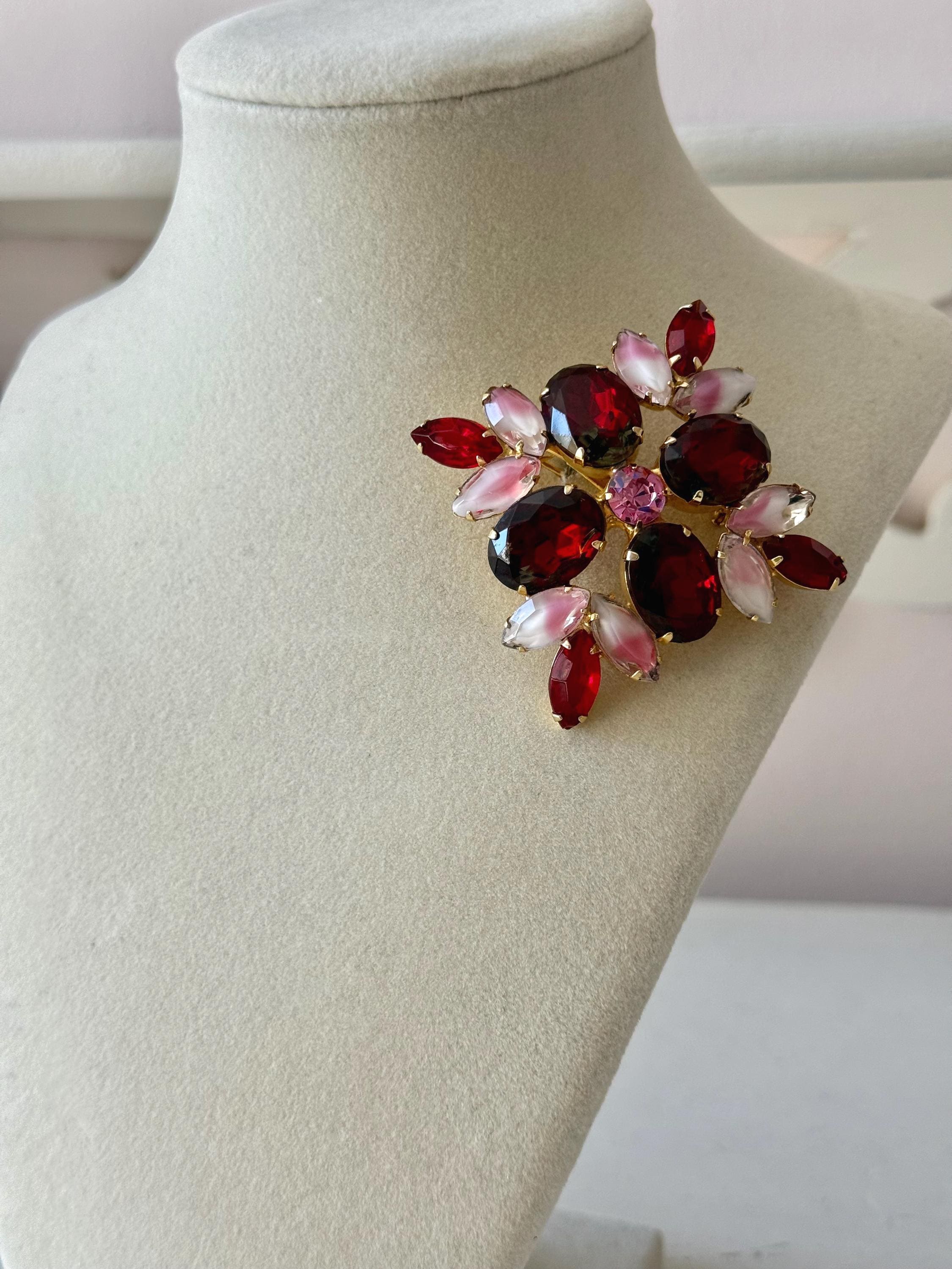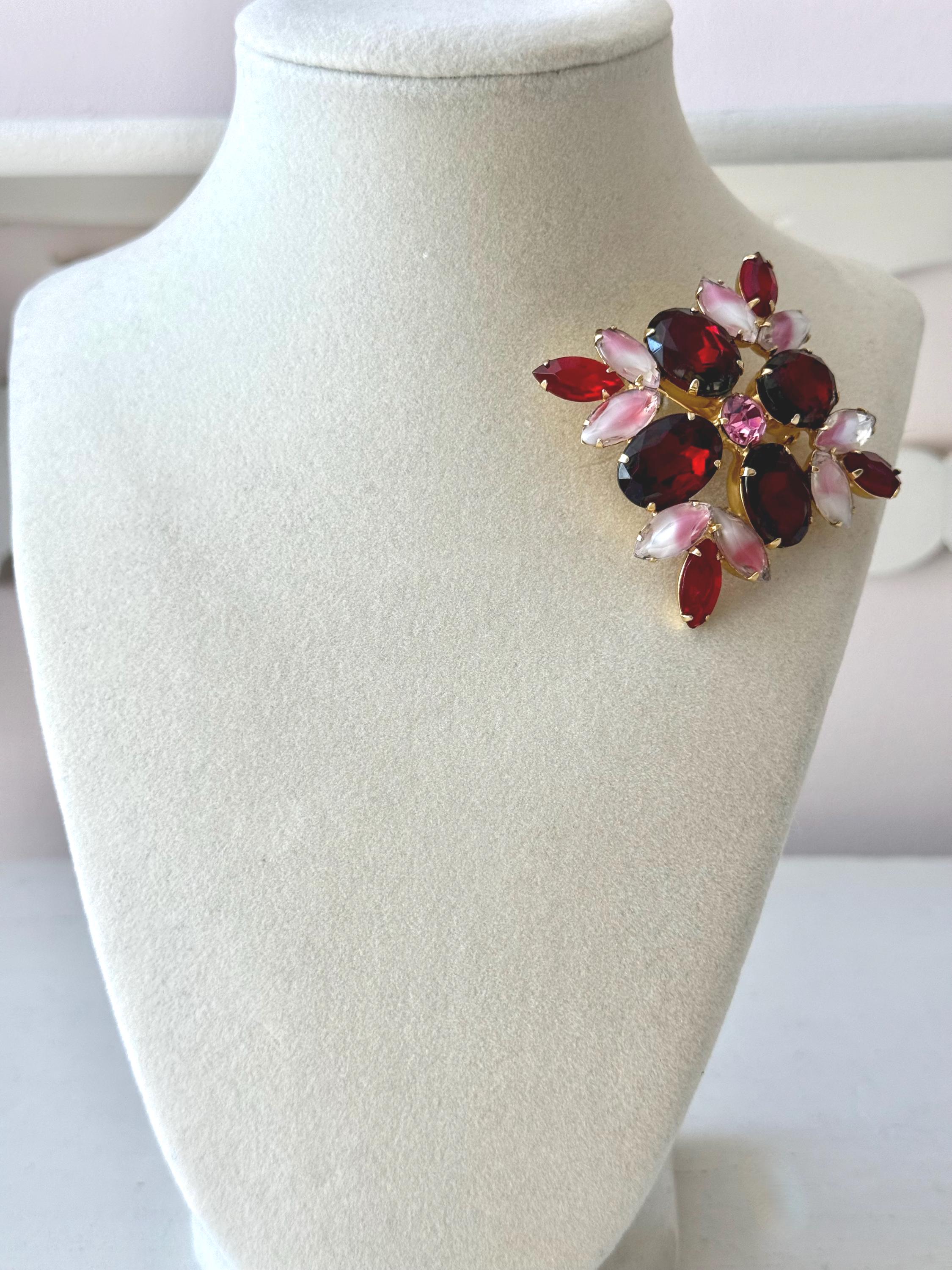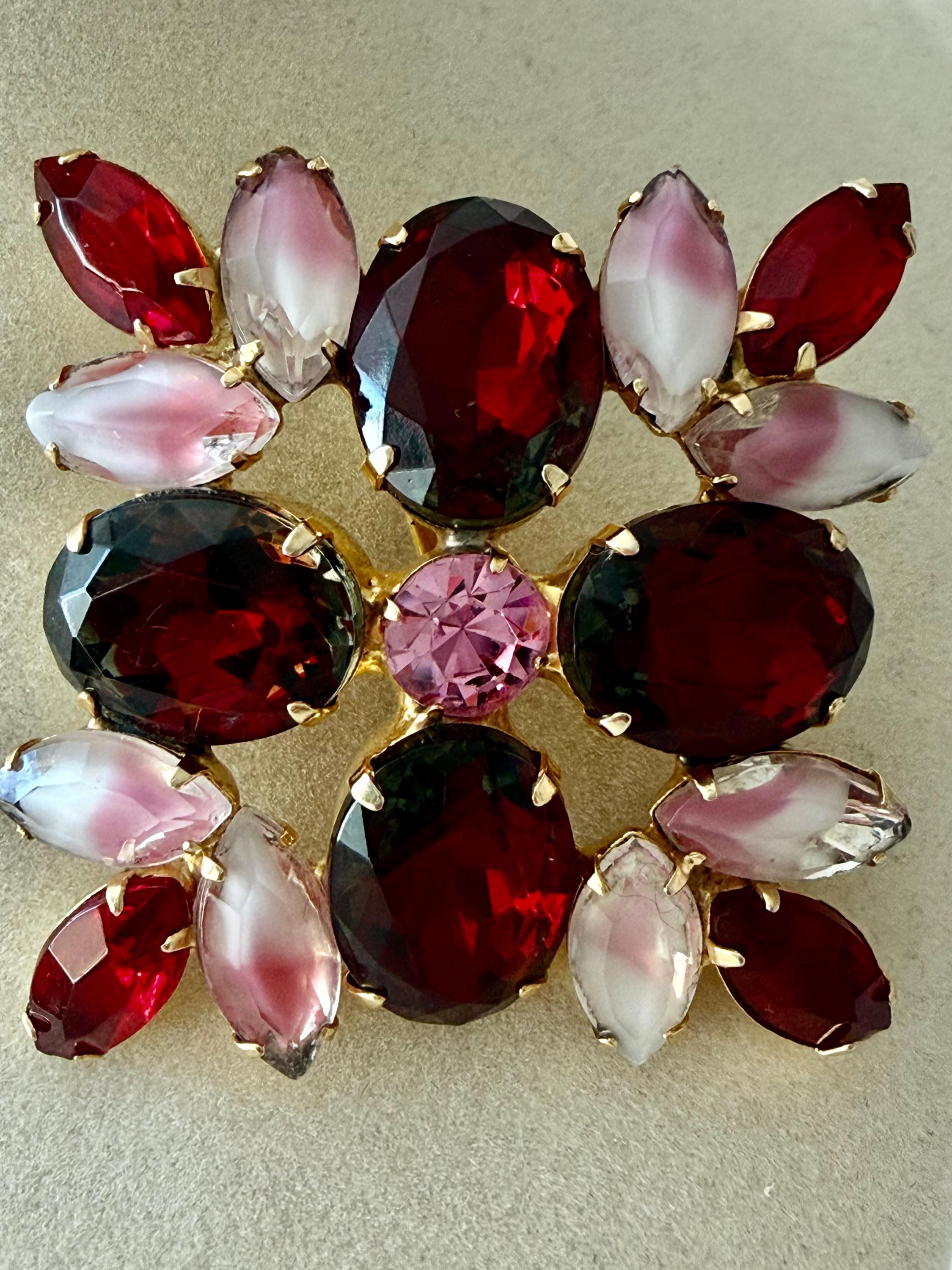 This listing is for an absolutely gorgeous, unsigned, vintage brooch. Measuring 2" by 2", the gold tone floral design is centered by four very large, deep red cushion stones with tips of bright red open-backed marquise stones. But the eight pink and white givre glass stones are the true stars of this beautiful brooch. All stones are intact, the clasp is secure and it is in very good condition. Perfect anytime but especially for Valentines and Christmas!