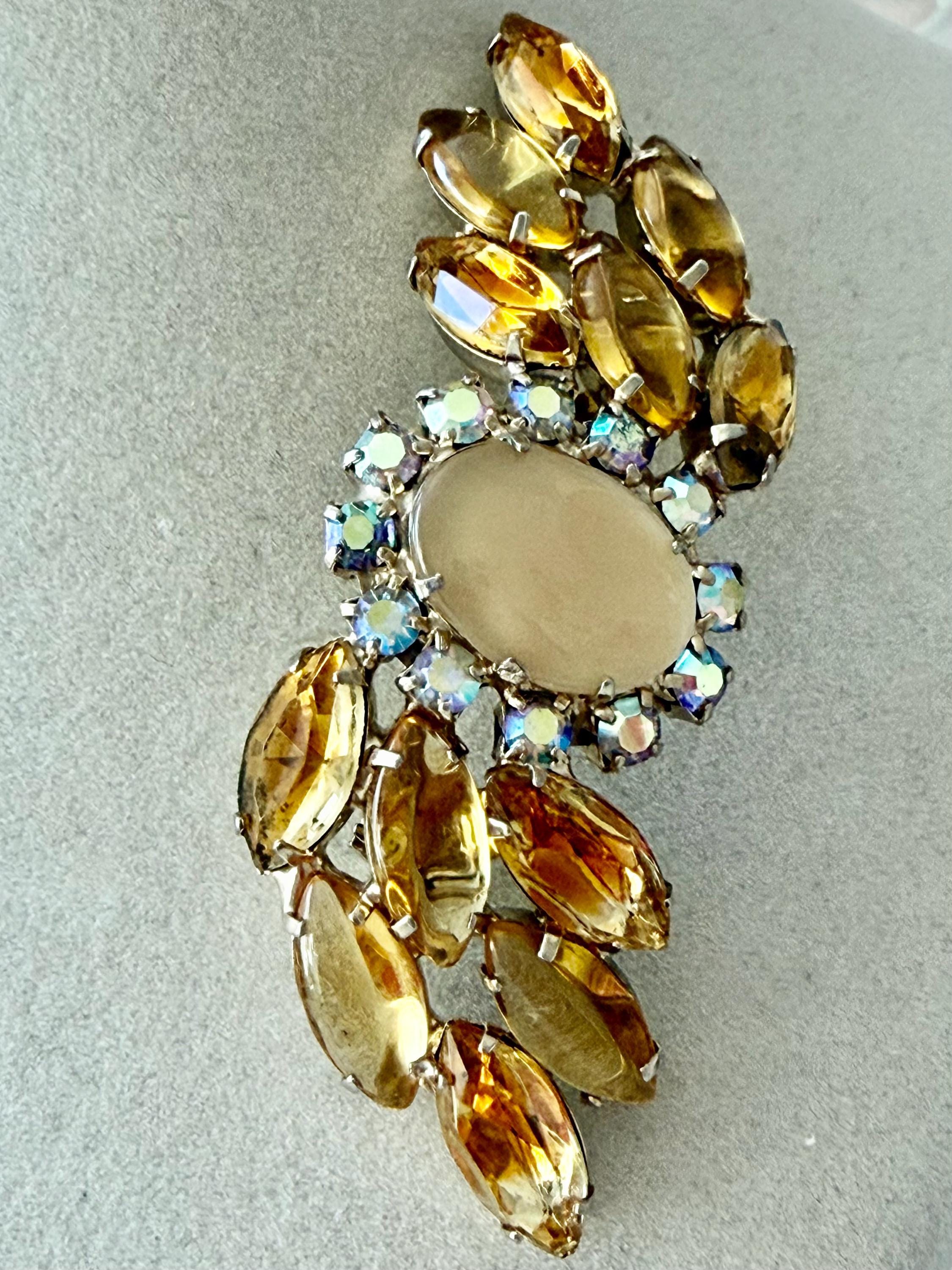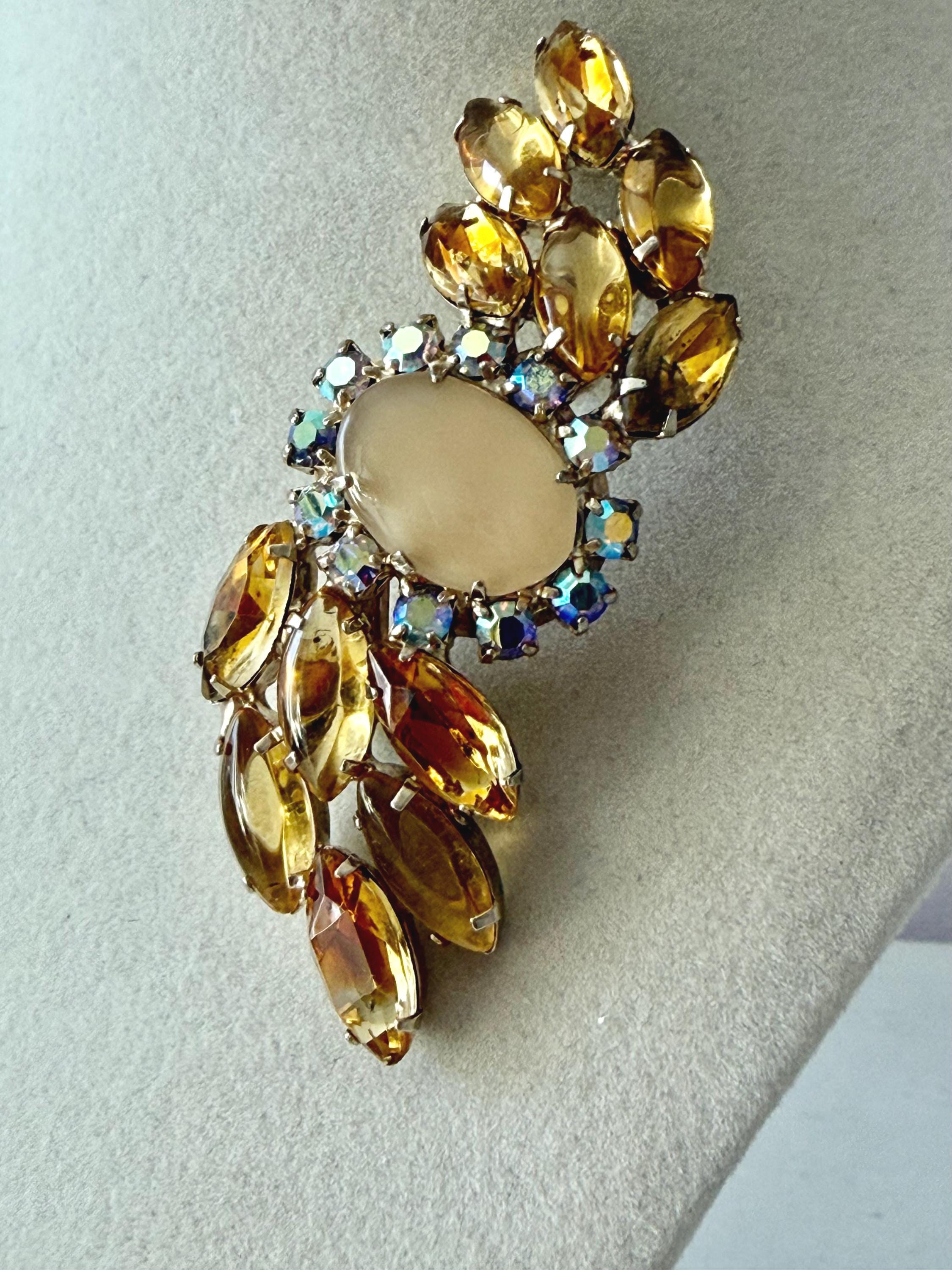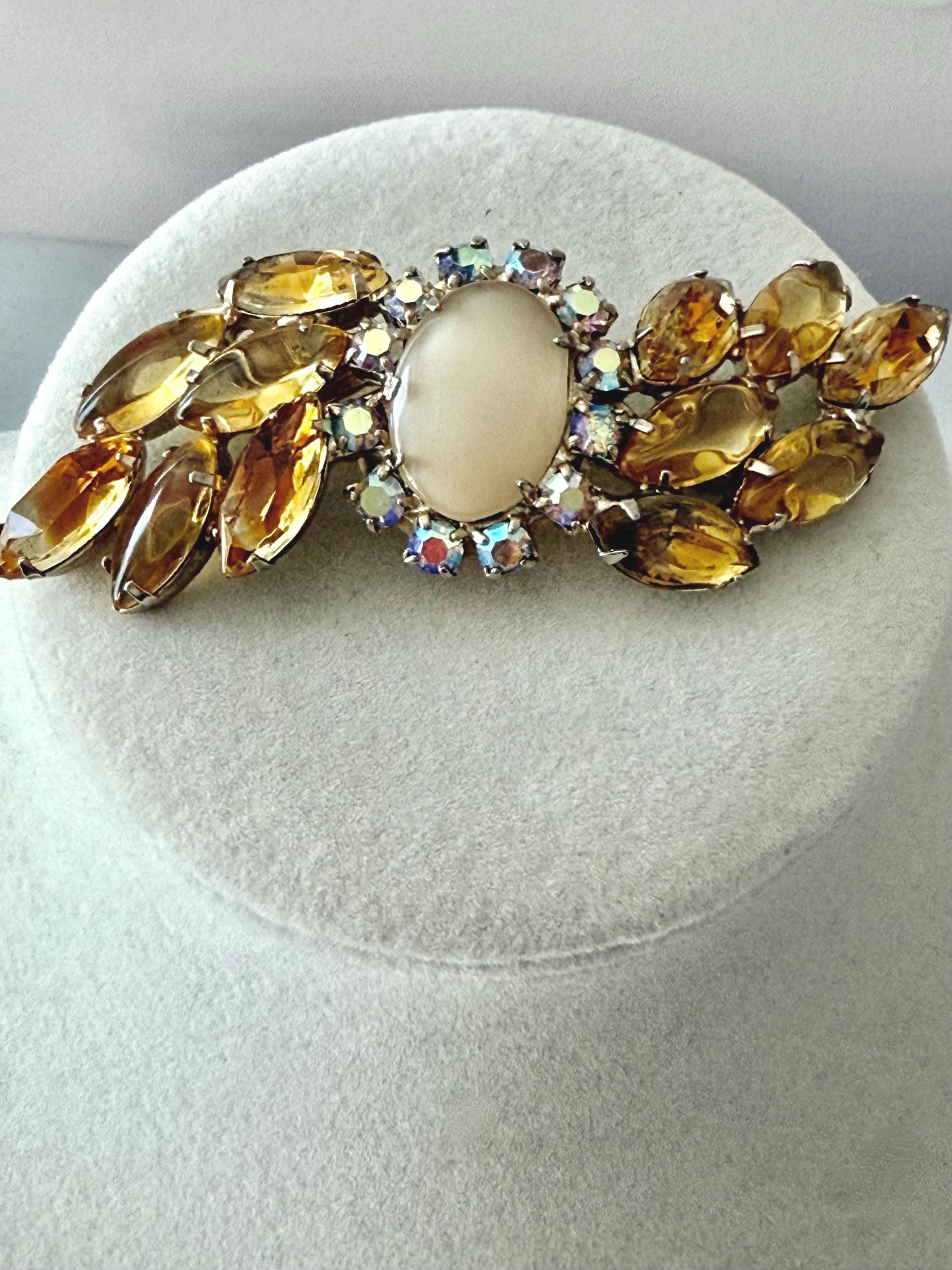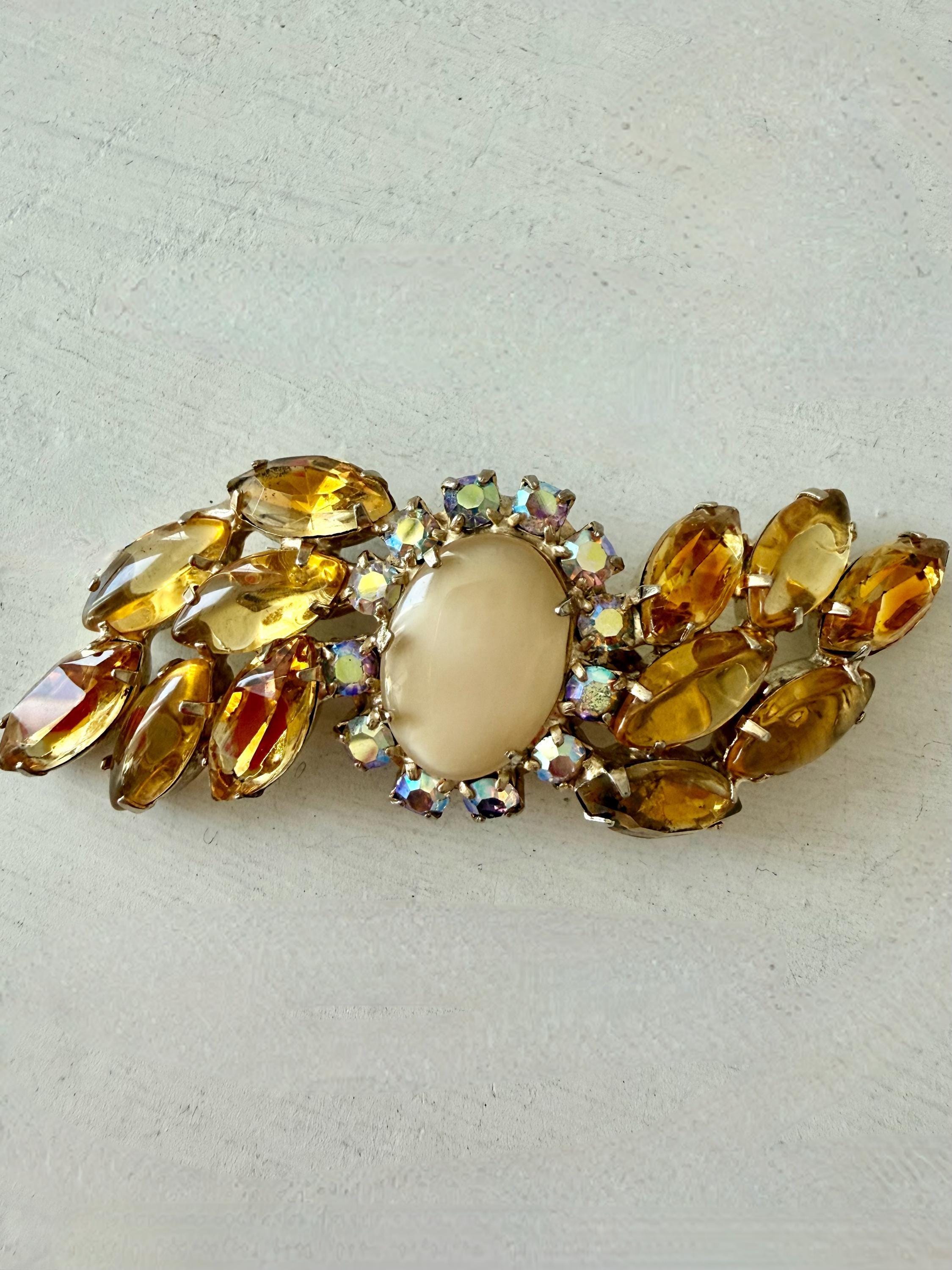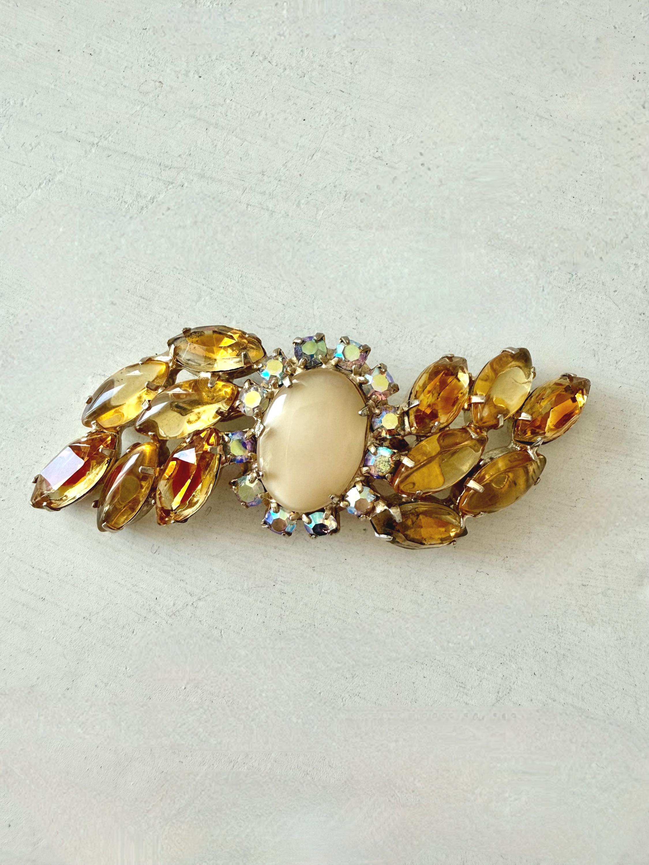 This listing is for a lovely unsigned vintage brooch. Measuring 3" wide and 1" high, the gold tone brooch features a design of wavy golden citrine marquises centered by a large pale yellow cabochon surrounded by AB stones that glow with a bit of blue. Note a bit of wear to one of the AB stones in the photos. All stones are intact, the clasp is secure. You'll love the movement and glow!