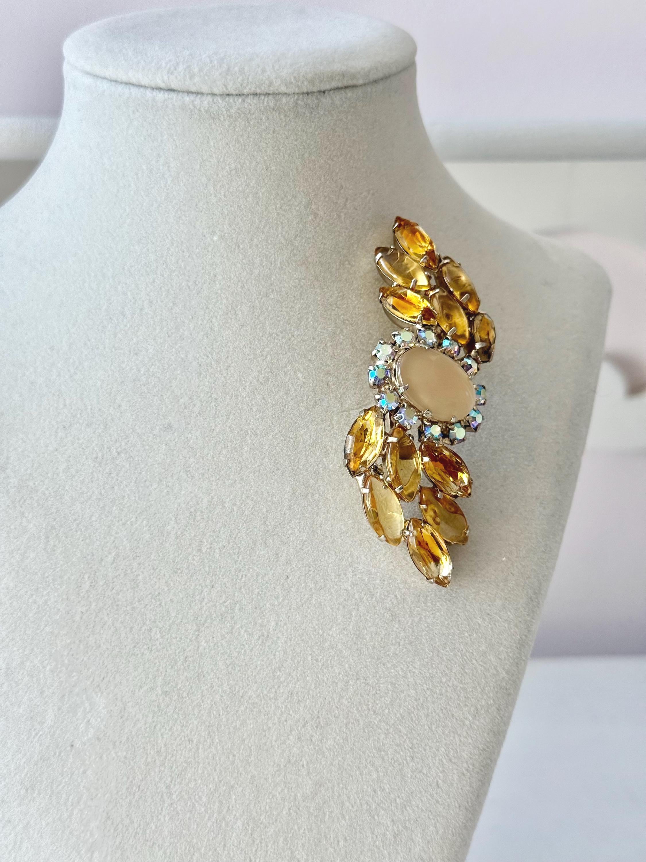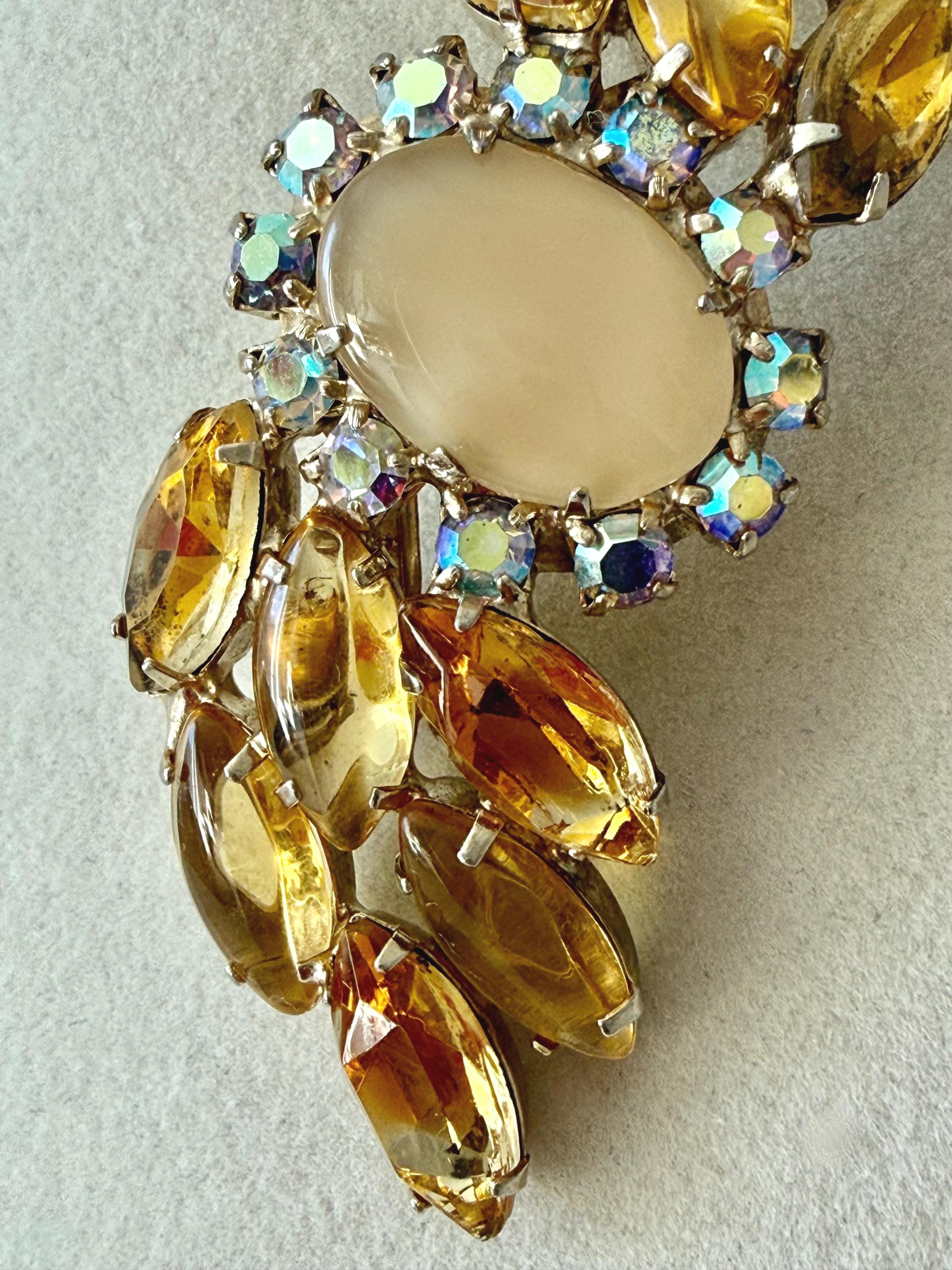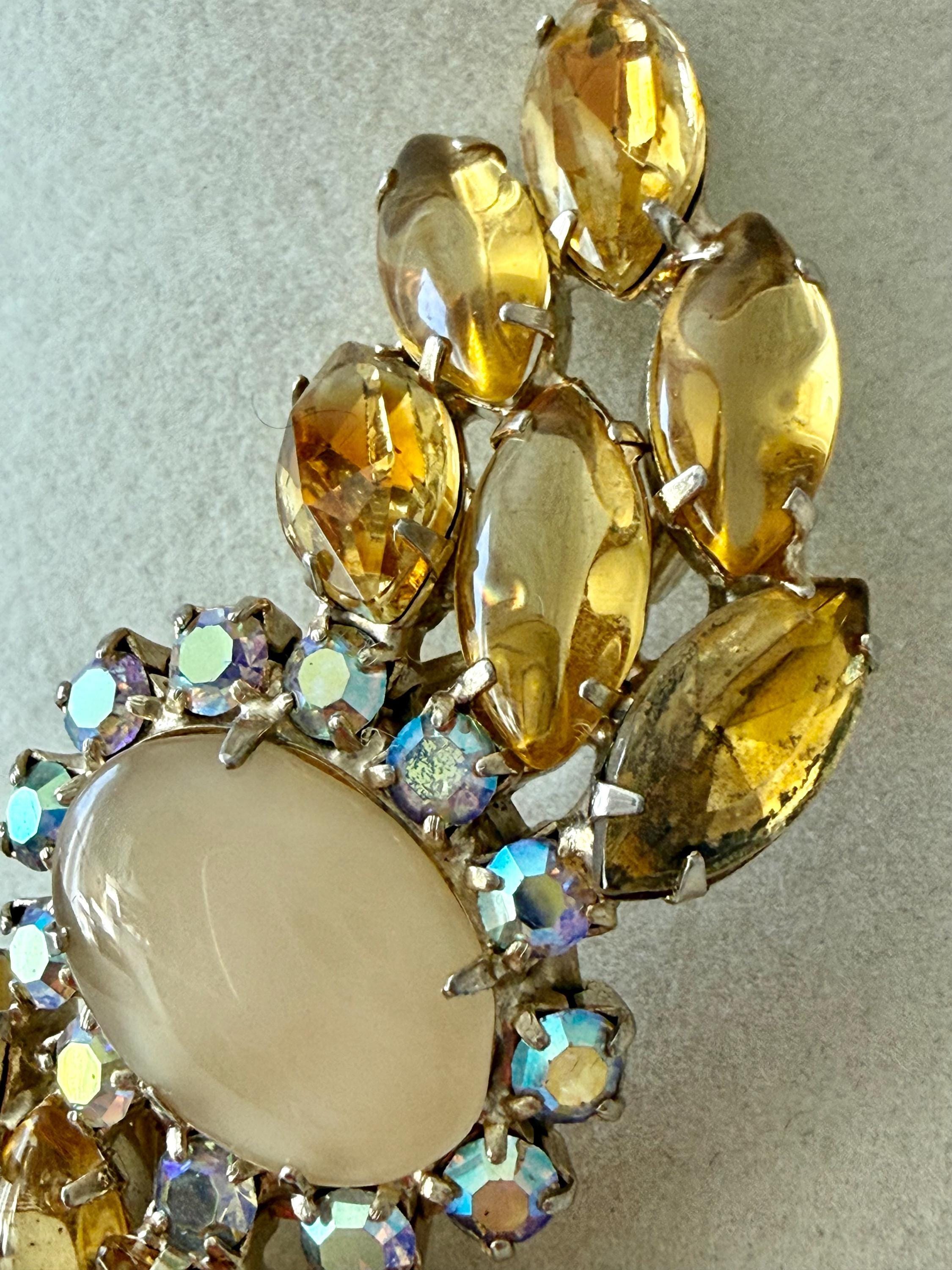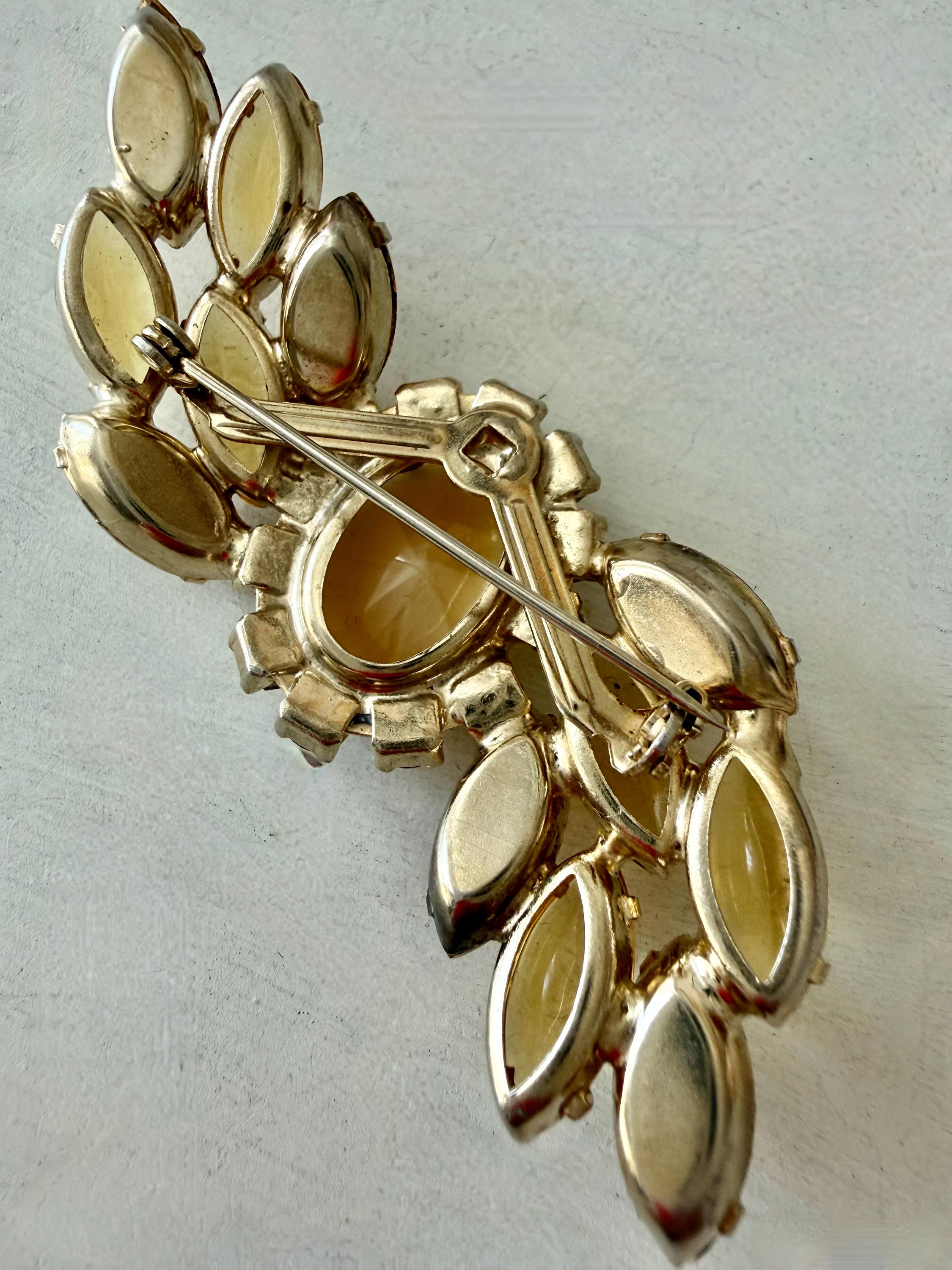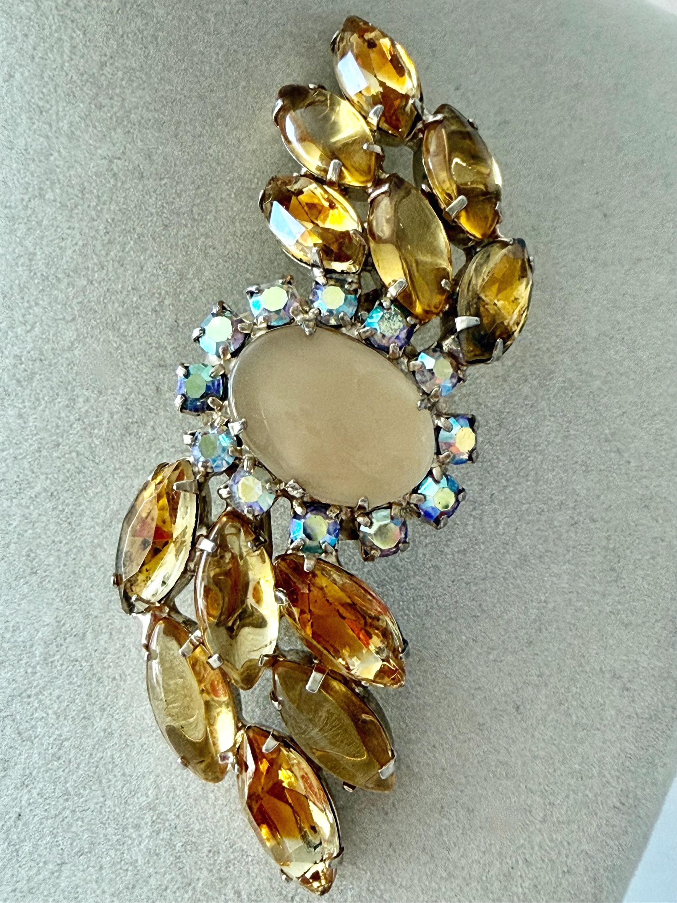 This listing is for a lovely unsigned vintage brooch. Measuring 3" wide and 1" high, the gold tone brooch features a design of wavy golden citrine marquises centered by a large pale yellow cabochon surrounded by AB stones that glow with a bit of blue. Note a bit of wear to one of the AB stones in the photos. All stones are intact, the clasp is secure. You'll love the movement and glow!