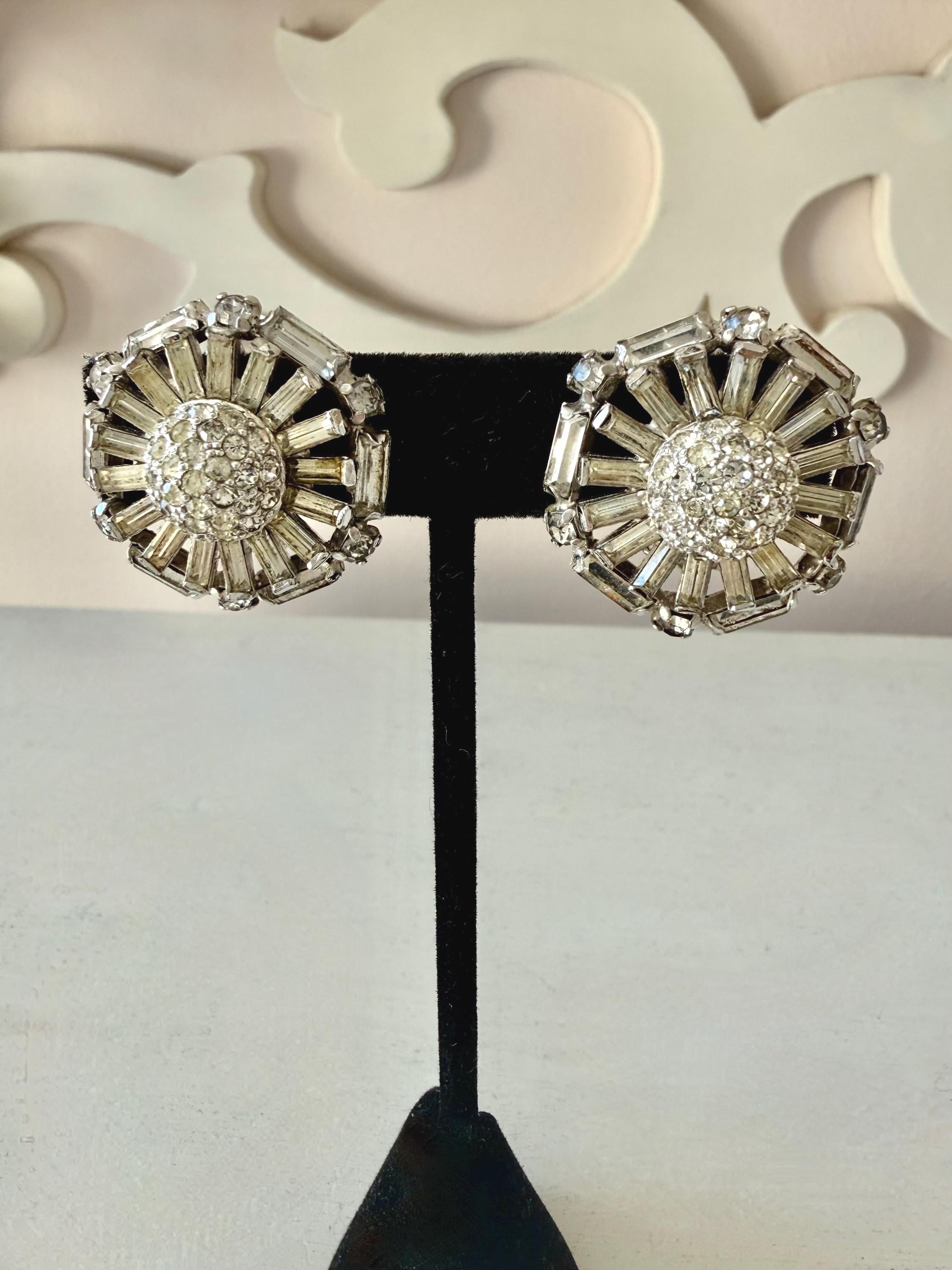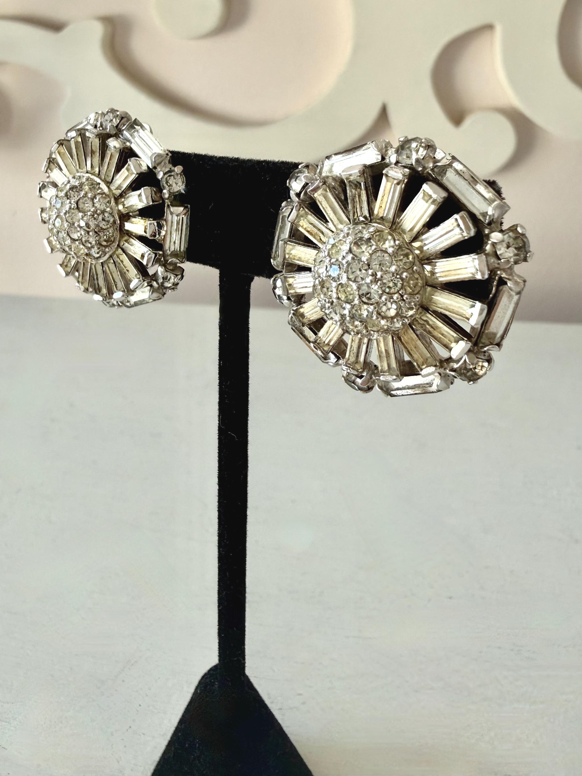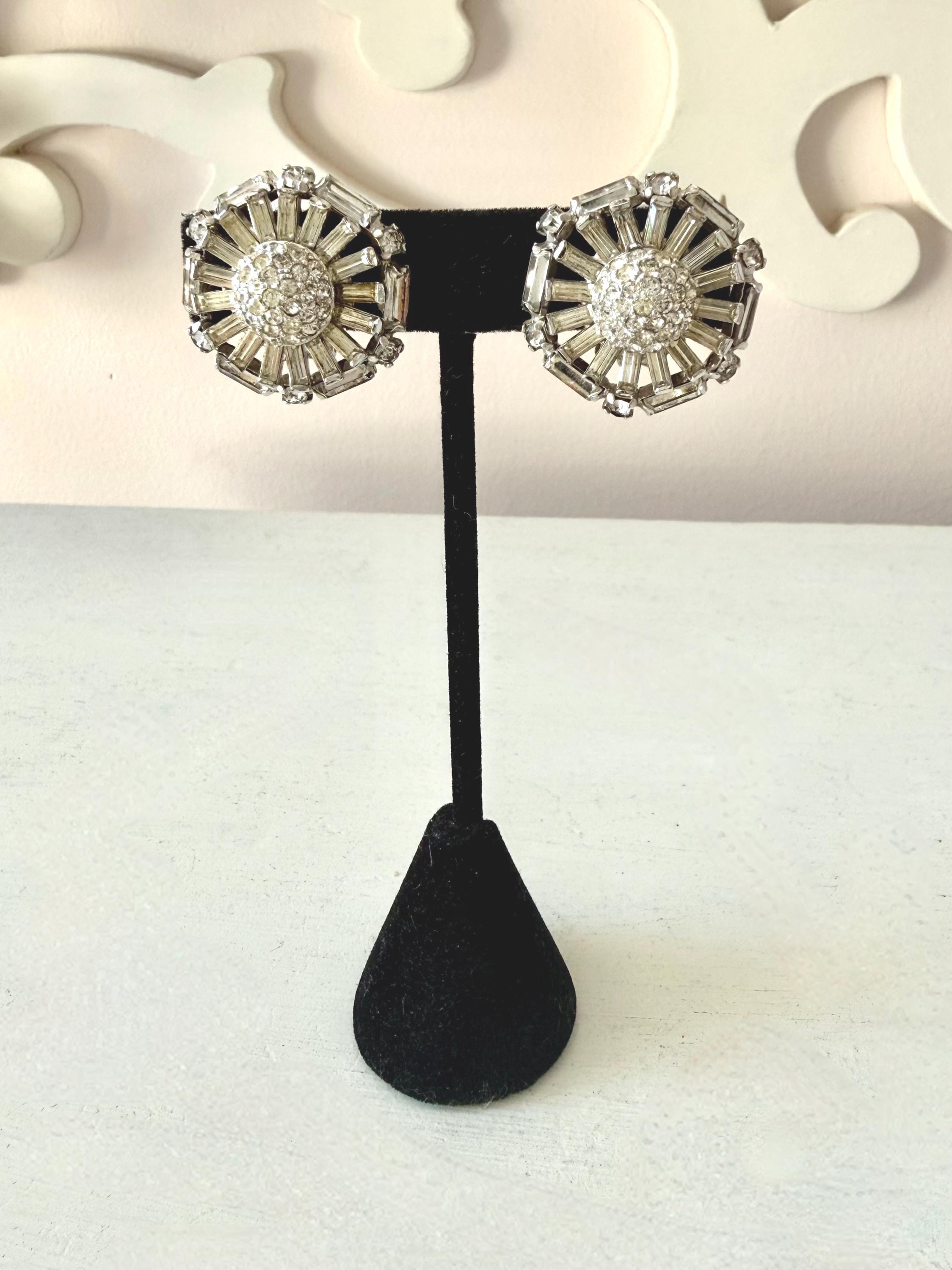 This listing is for a beautiful pair of vintage earrings by Kramer. Measuring 1" in diameter, the silver tone earrings feature clear baguettes in a starburst design edged with more baguettes. And a shimmering dome offers even more sparkle. All stones are intact, the clip backs are secure and very comfortable and they are, overall, in very good condition. Just lovely!