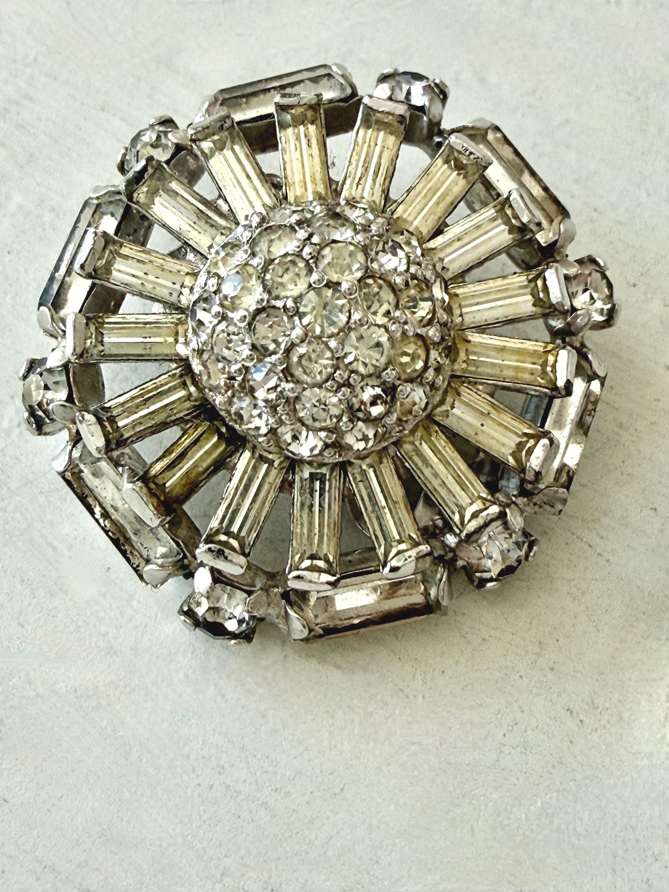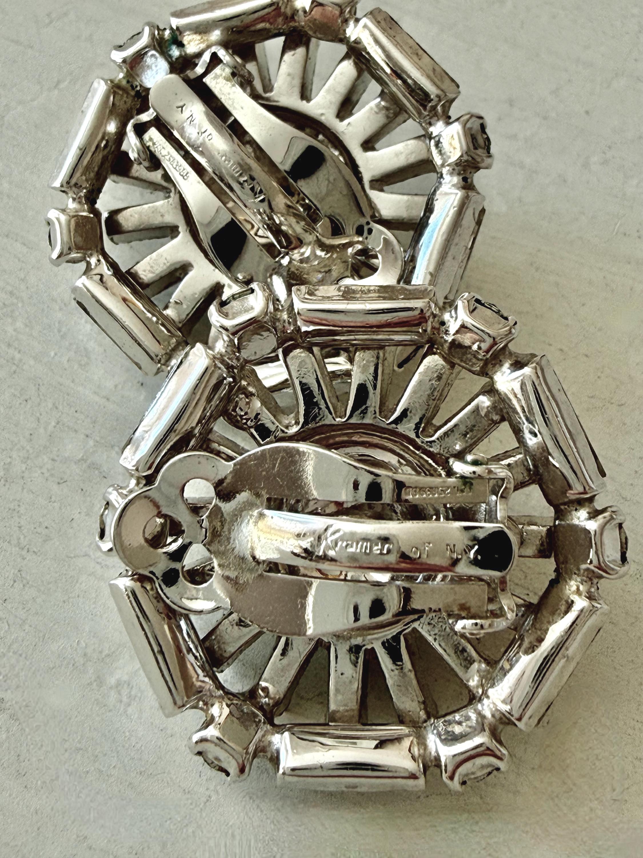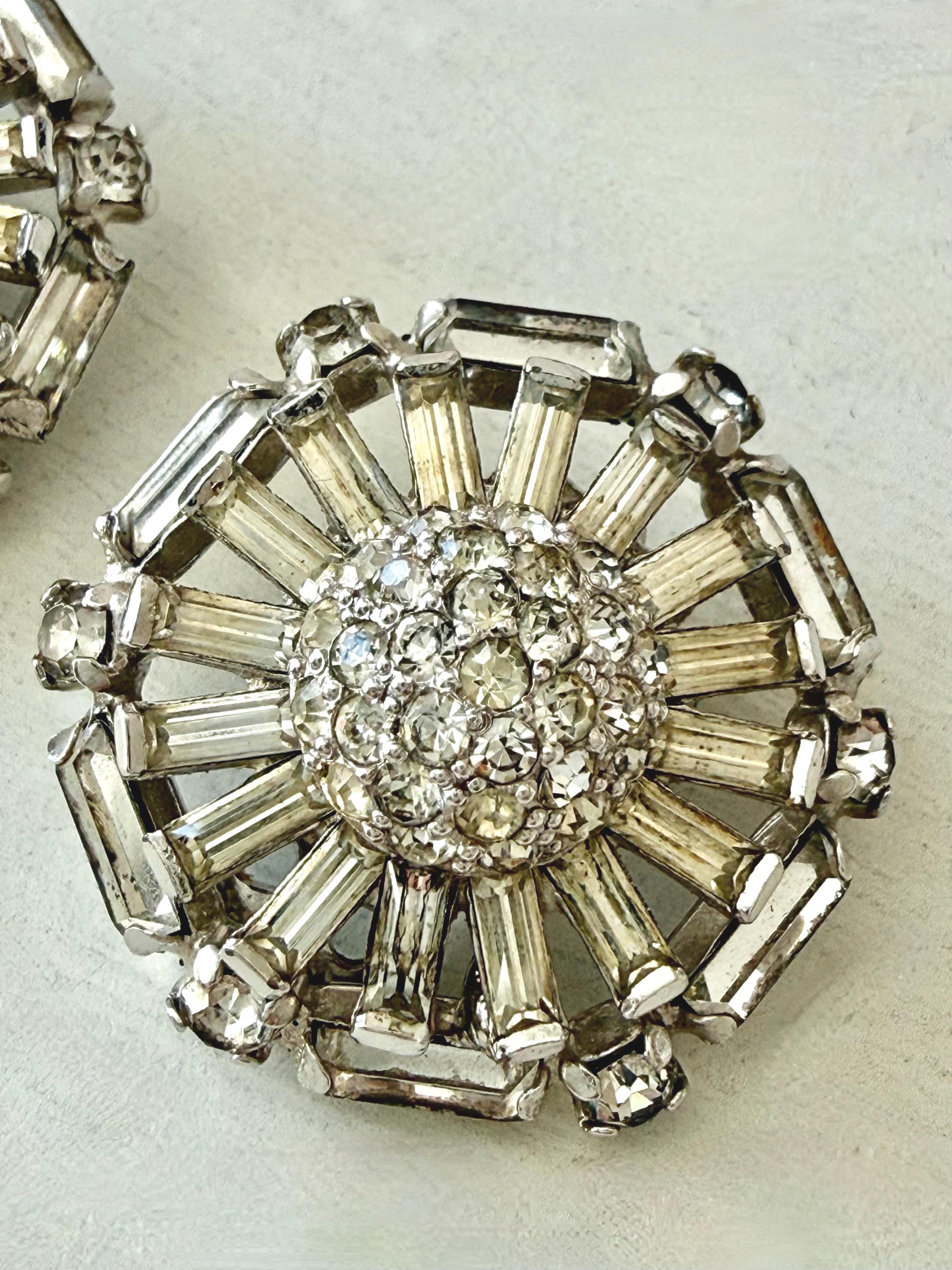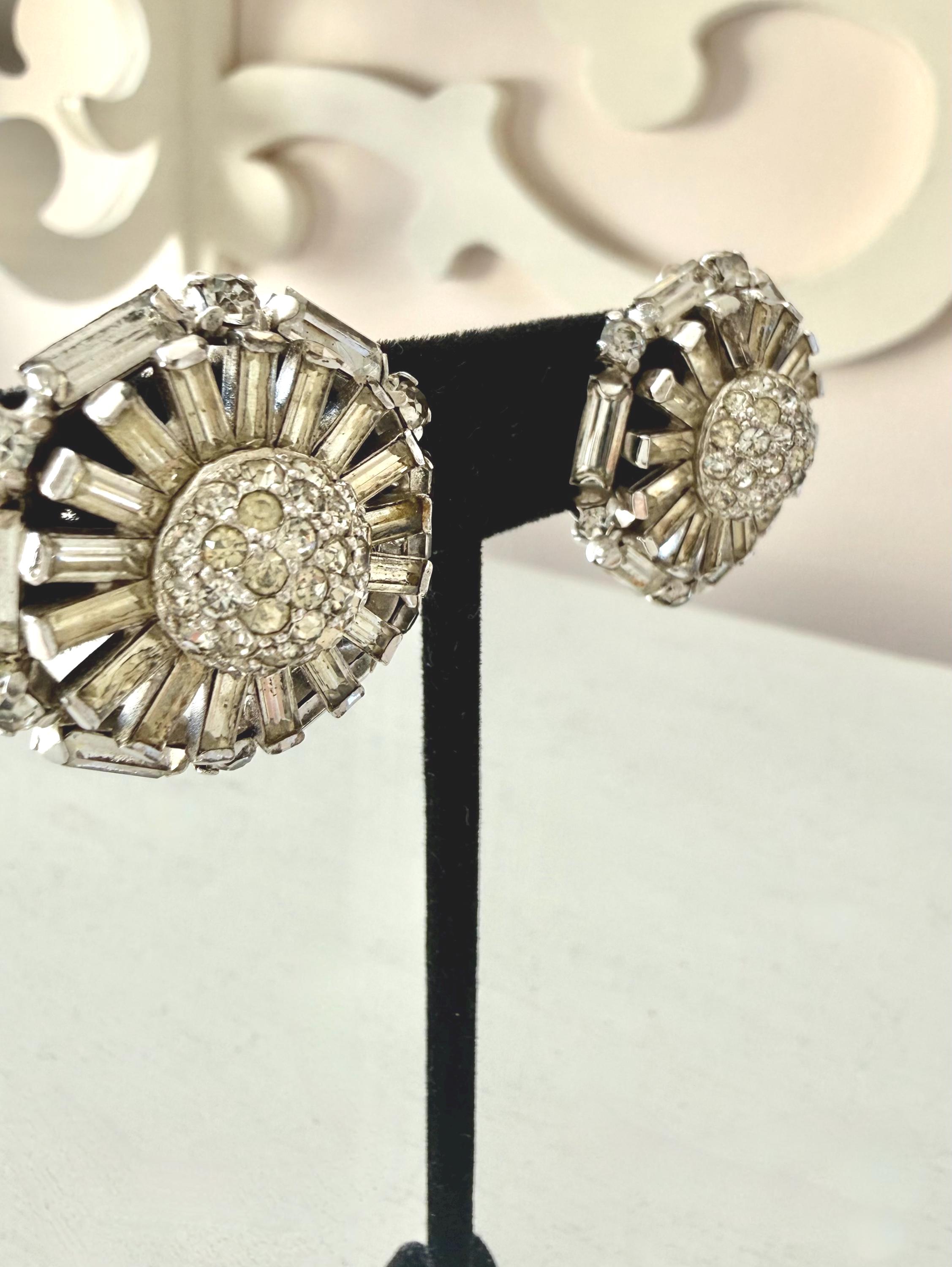 This listing is for a beautiful pair of vintage earrings by Kramer. Measuring 1" in diameter, the silver tone earrings feature clear baguettes in a starburst design edged with more baguettes. And a shimmering dome offers even more sparkle. All stones are intact, the clip backs are secure and very comfortable and they are, overall, in very good condition. Just lovely!