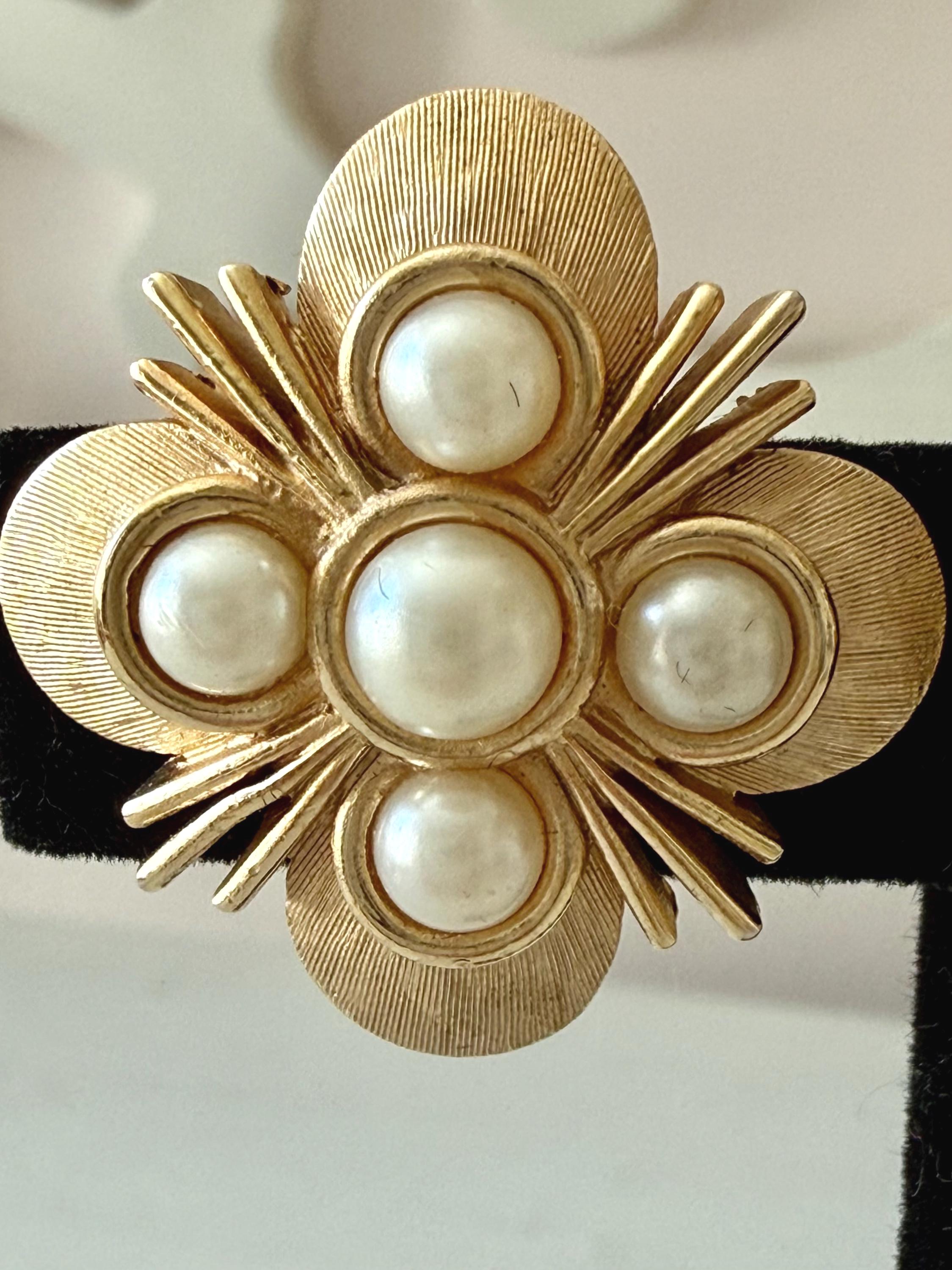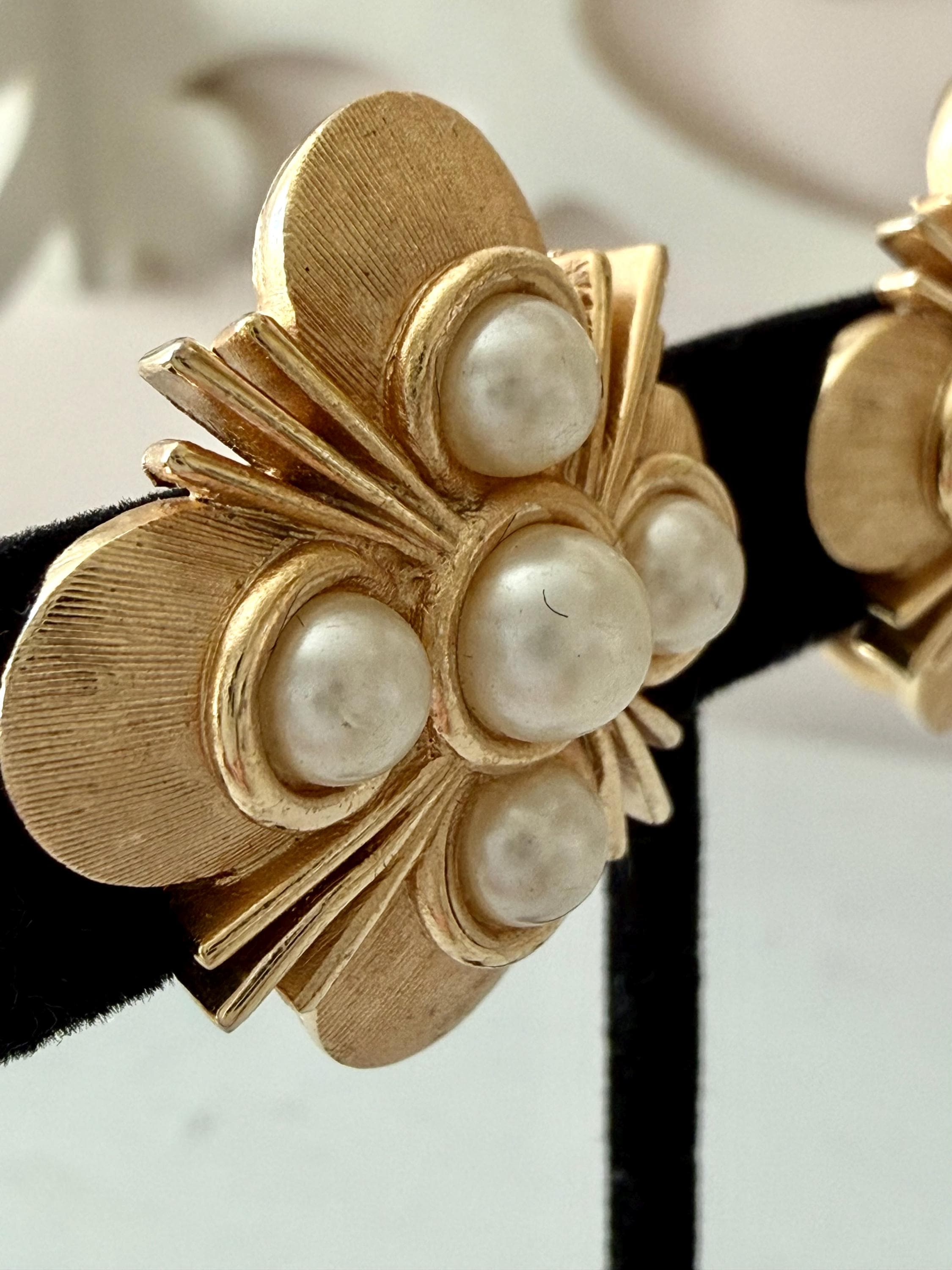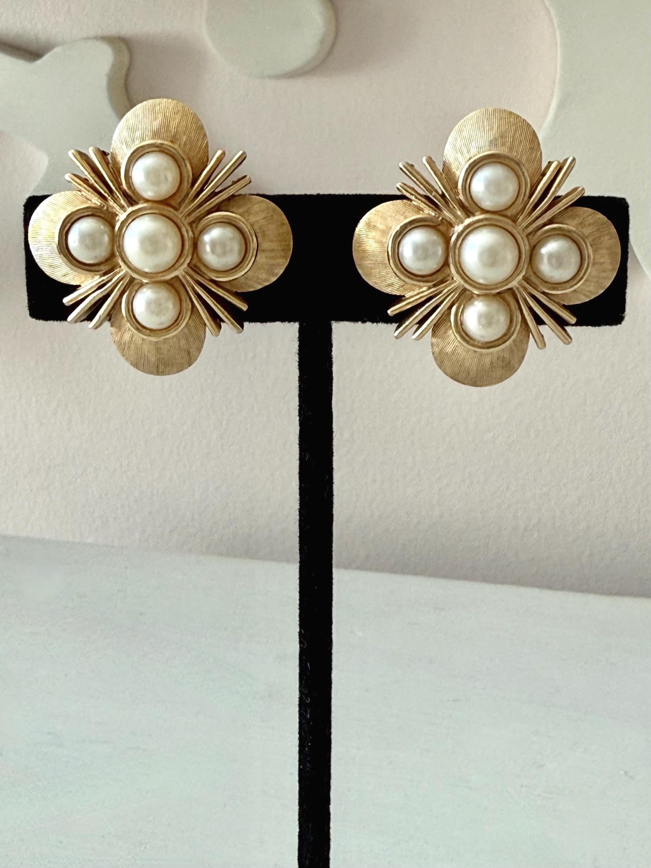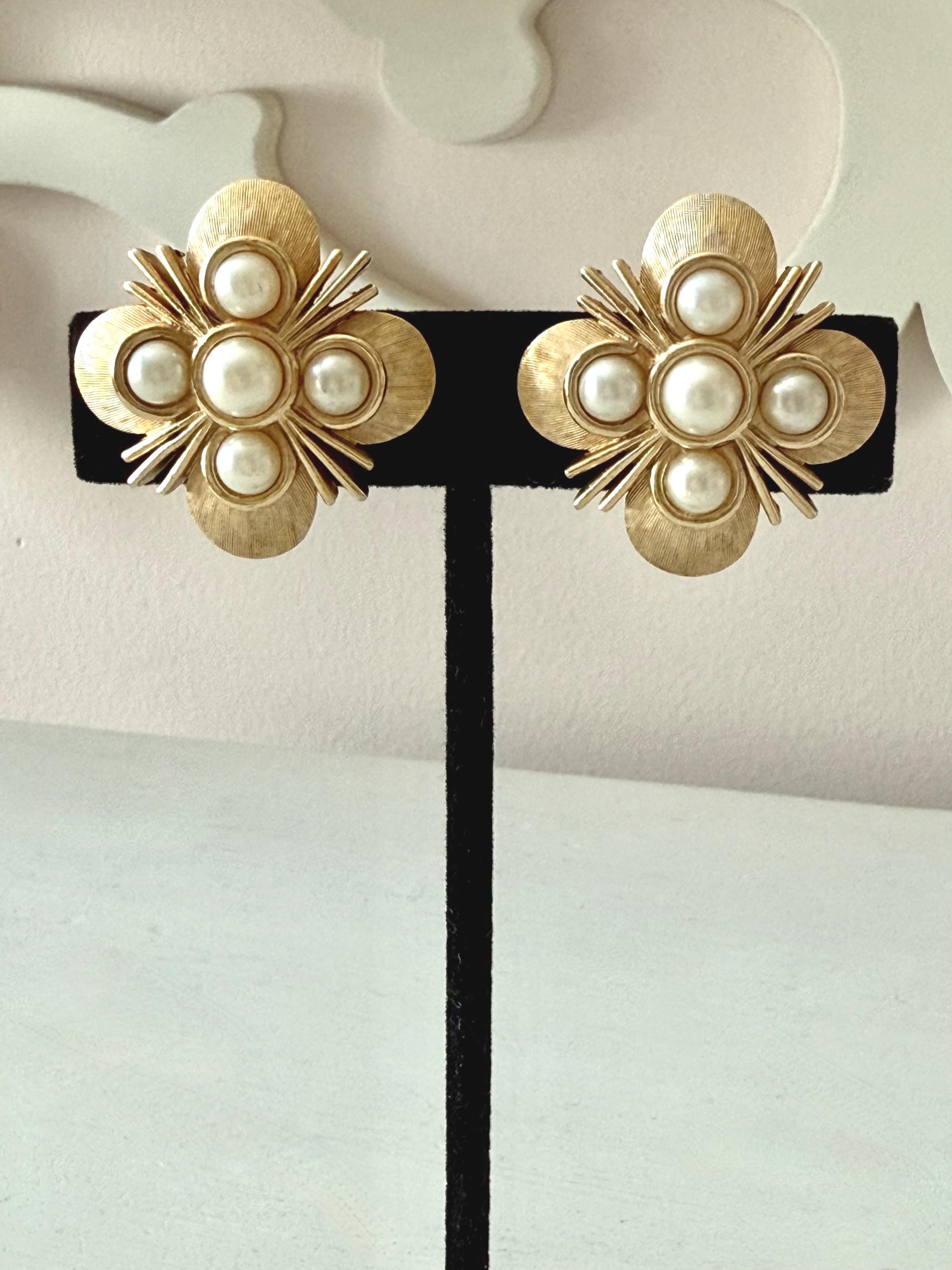 This listing is for a lovely pair of earrings by Trifari. The floral design earrings of brushed and polished gold tone measure 1" in diameter and feature five faux pearls. The clip backs are secure and comfortable and they are, overall, in excellent vintage condition. These can easily go from day to evening!