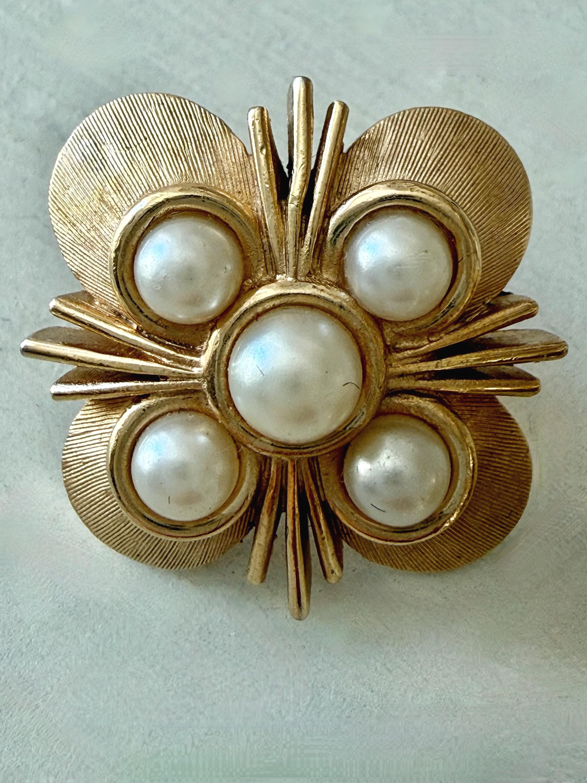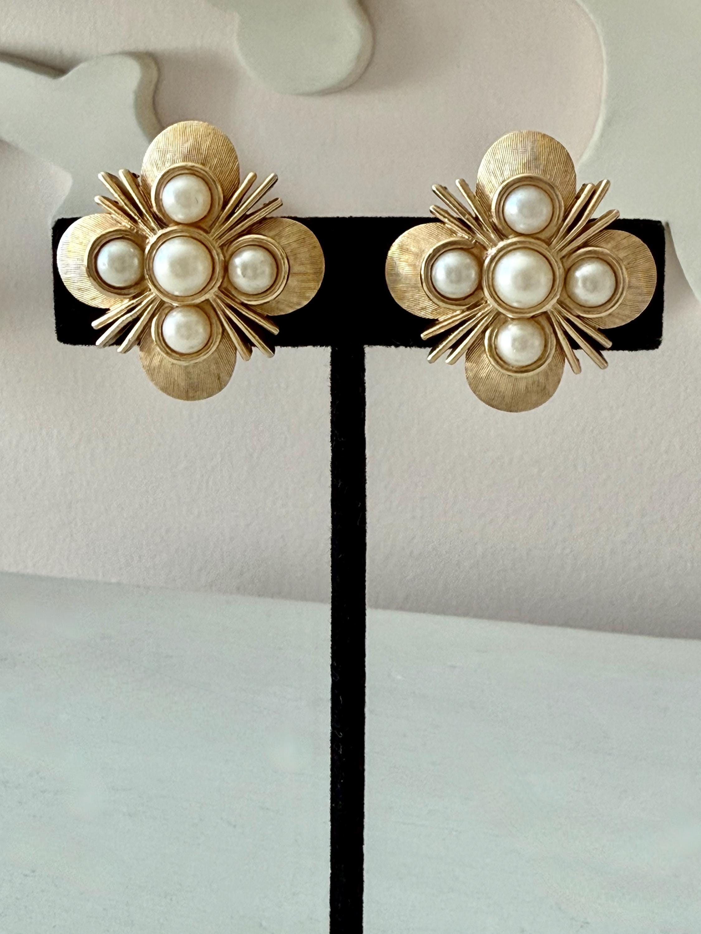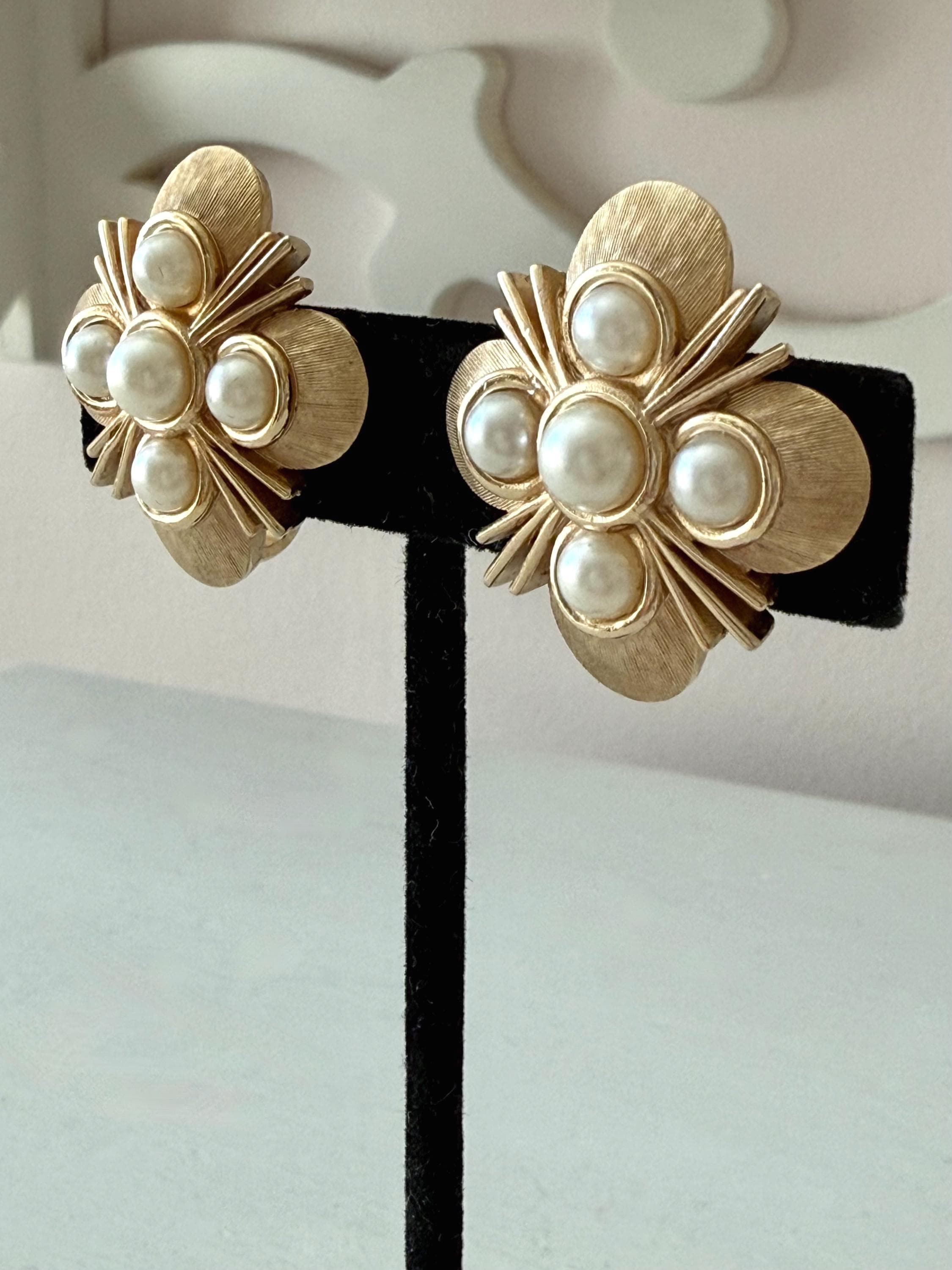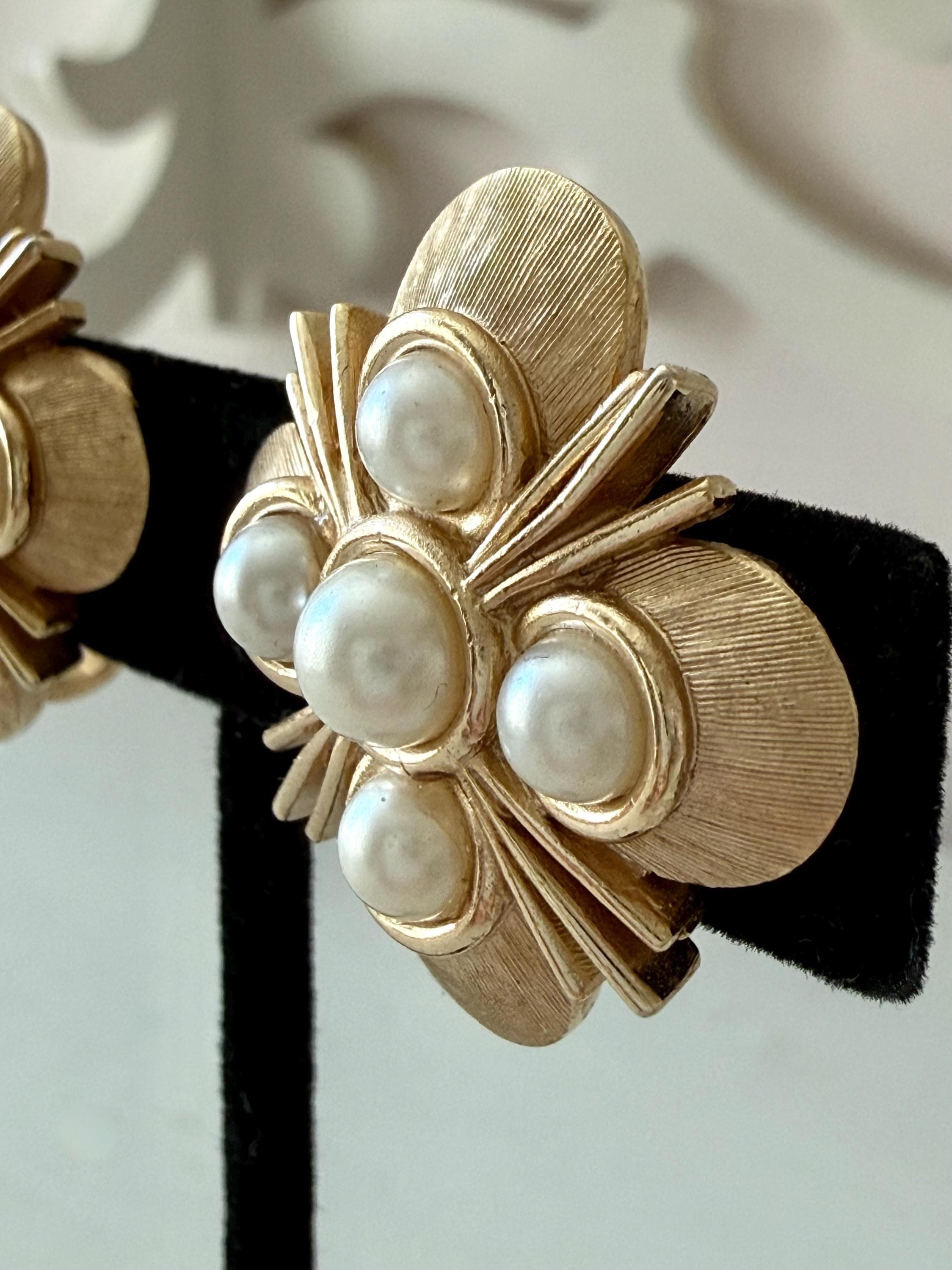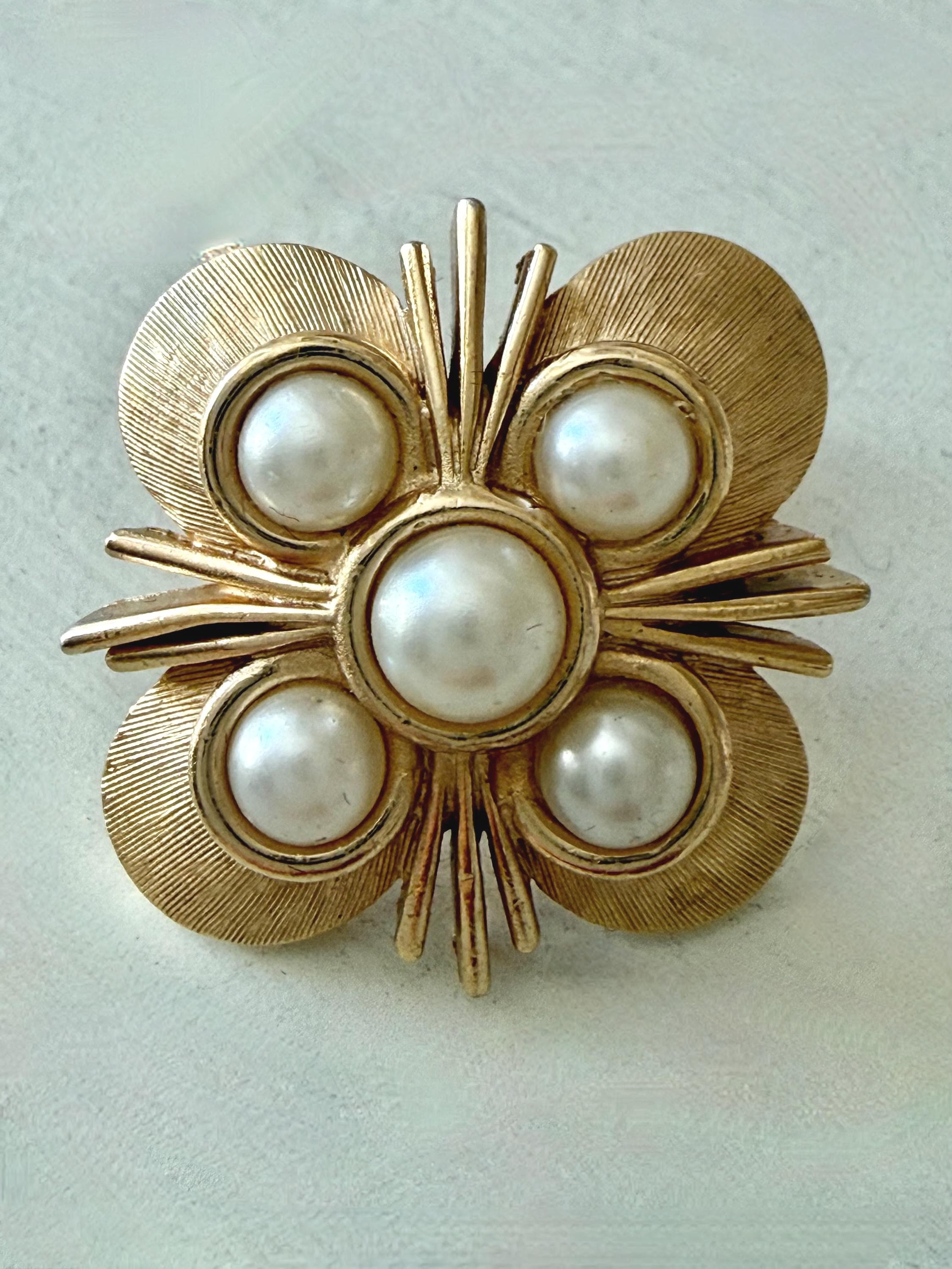 This listing is for a lovely pair of earrings by Trifari. The floral design earrings of brushed and polished gold tone measure 1" in diameter and feature five faux pearls. The clip backs are secure and comfortable and they are, overall, in excellent vintage condition. These can easily go from day to evening!