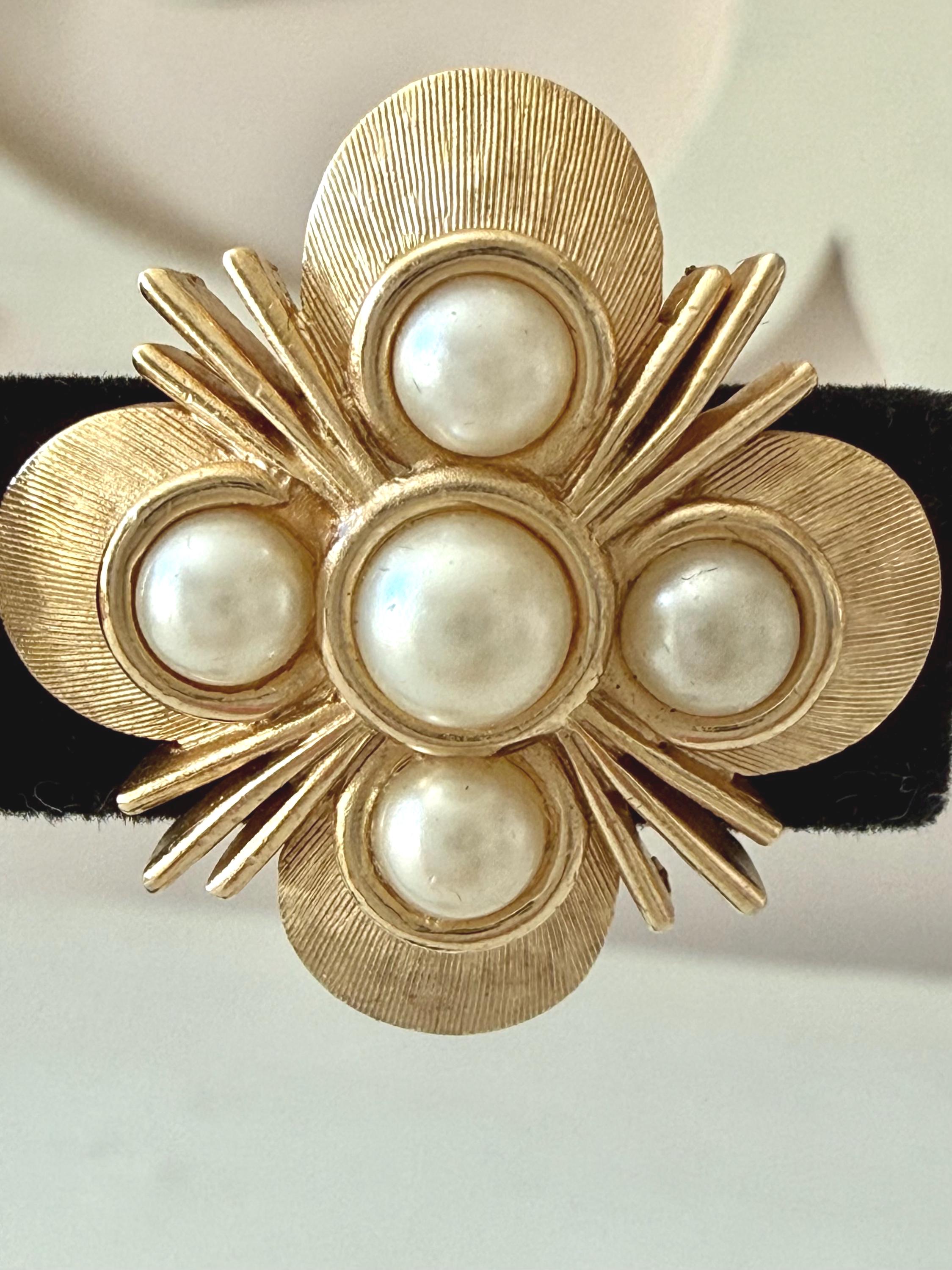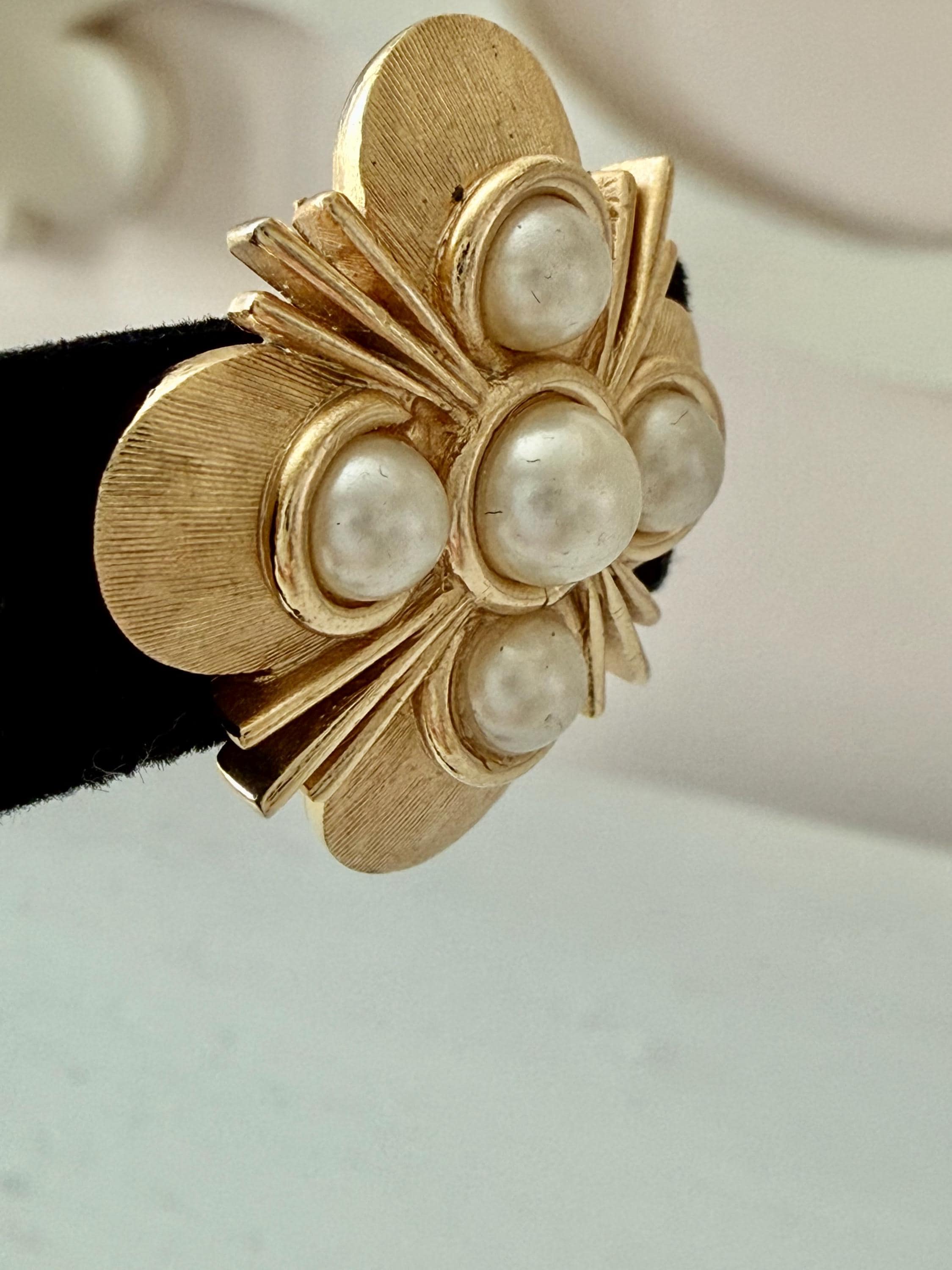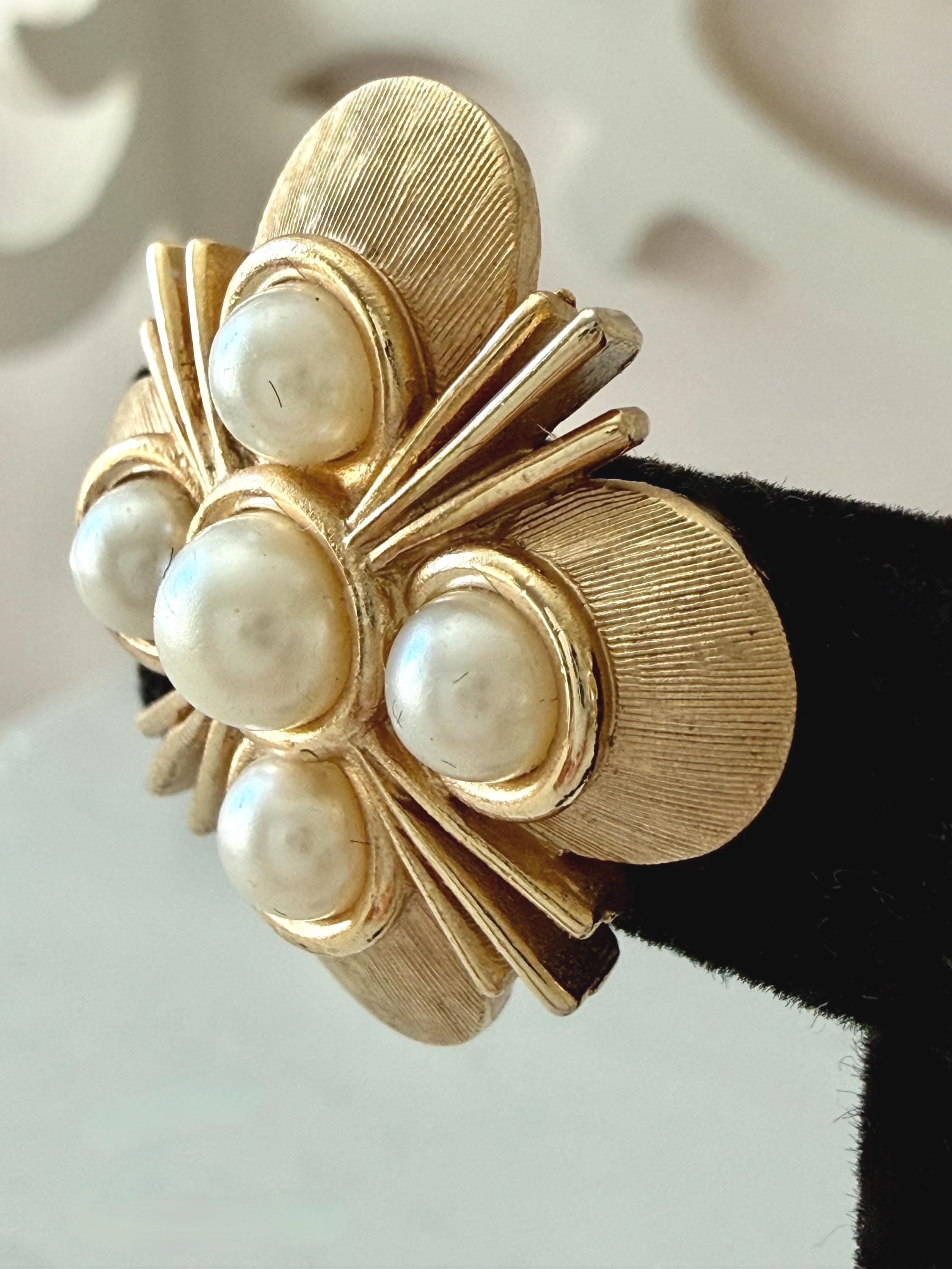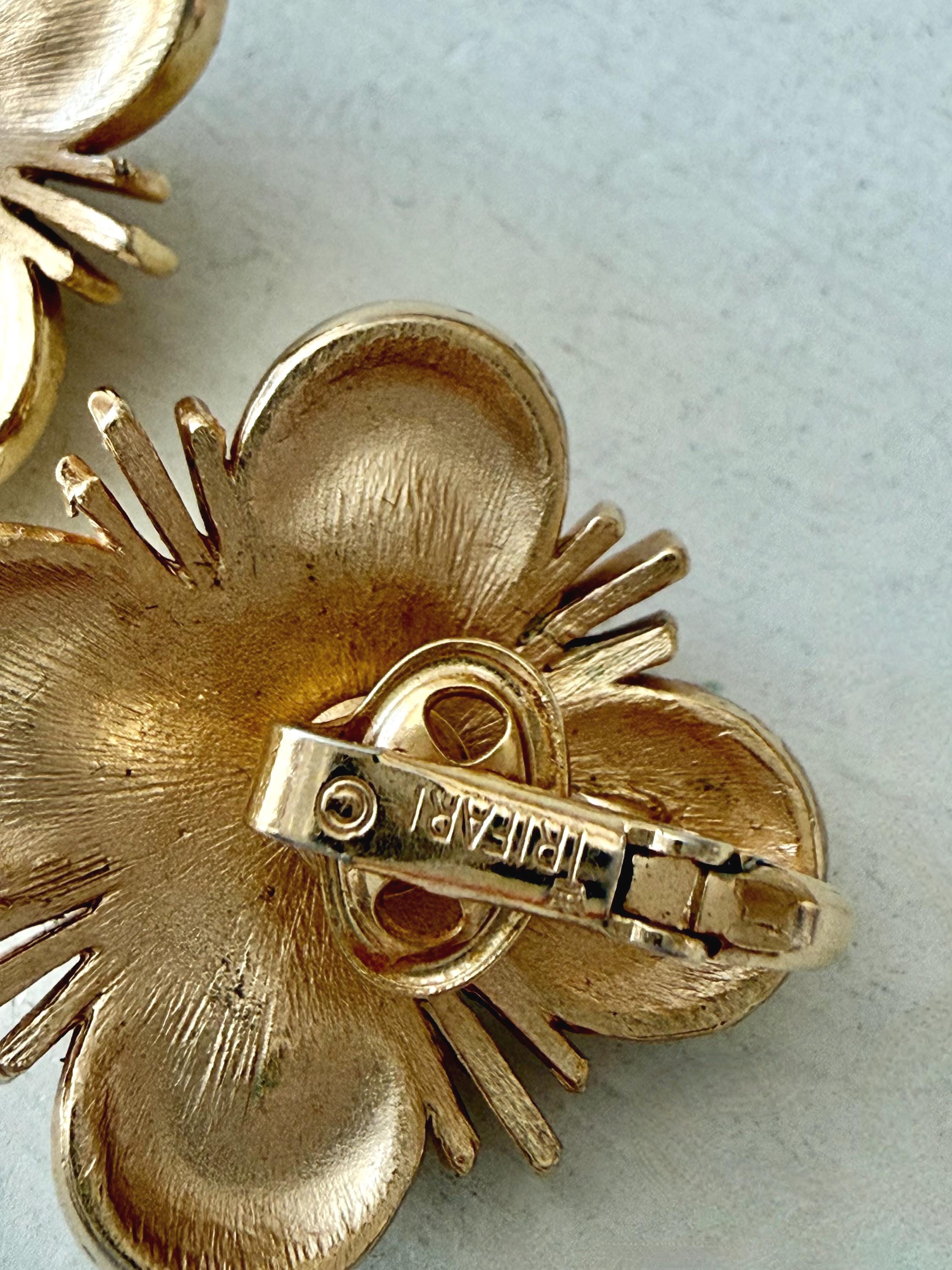 This listing is for a lovely pair of earrings by Trifari. The floral design earrings of brushed and polished gold tone measure 1" in diameter and feature five faux pearls. The clip backs are secure and comfortable and they are, overall, in excellent vintage condition. These can easily go from day to evening!