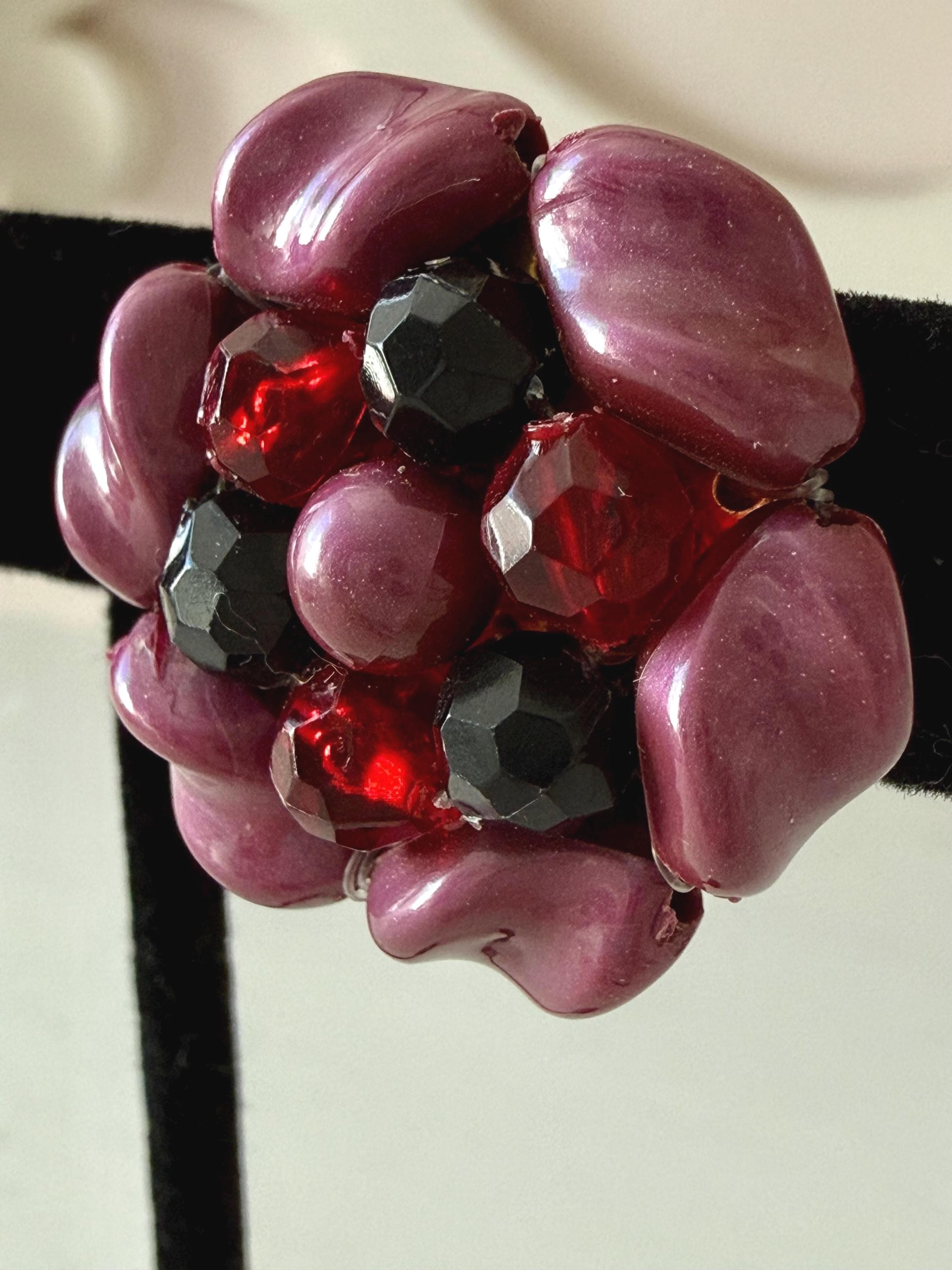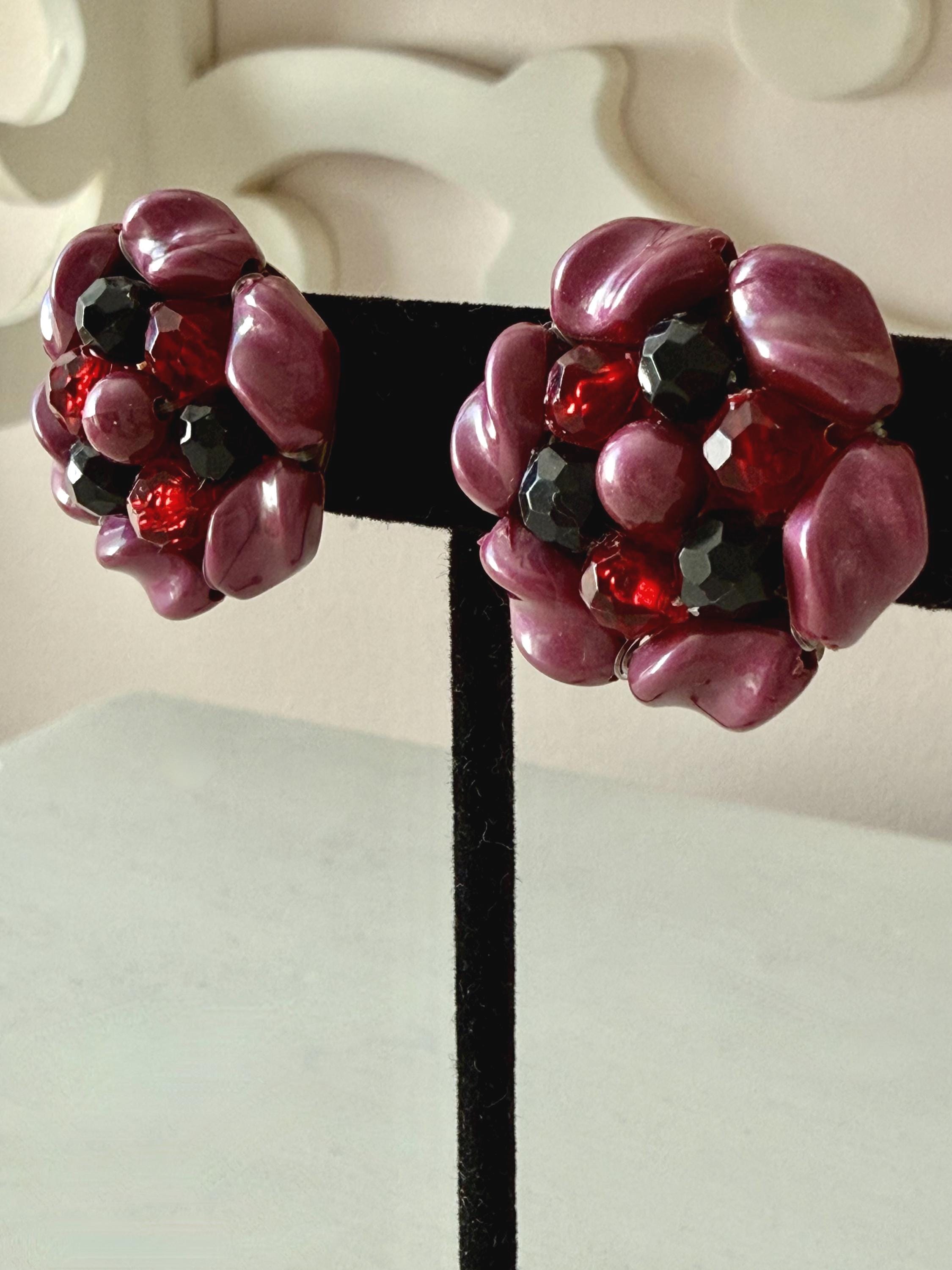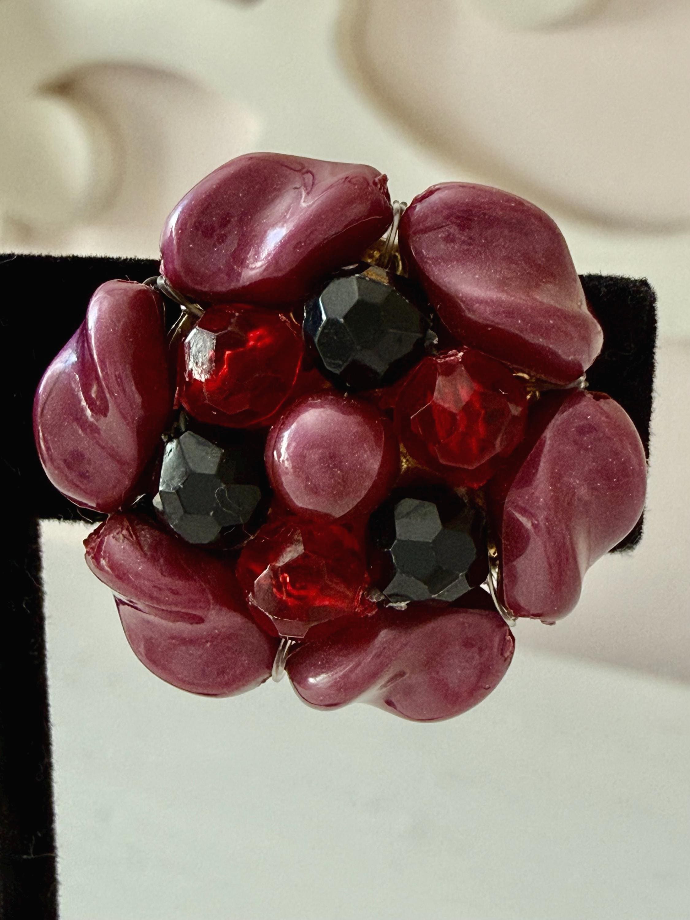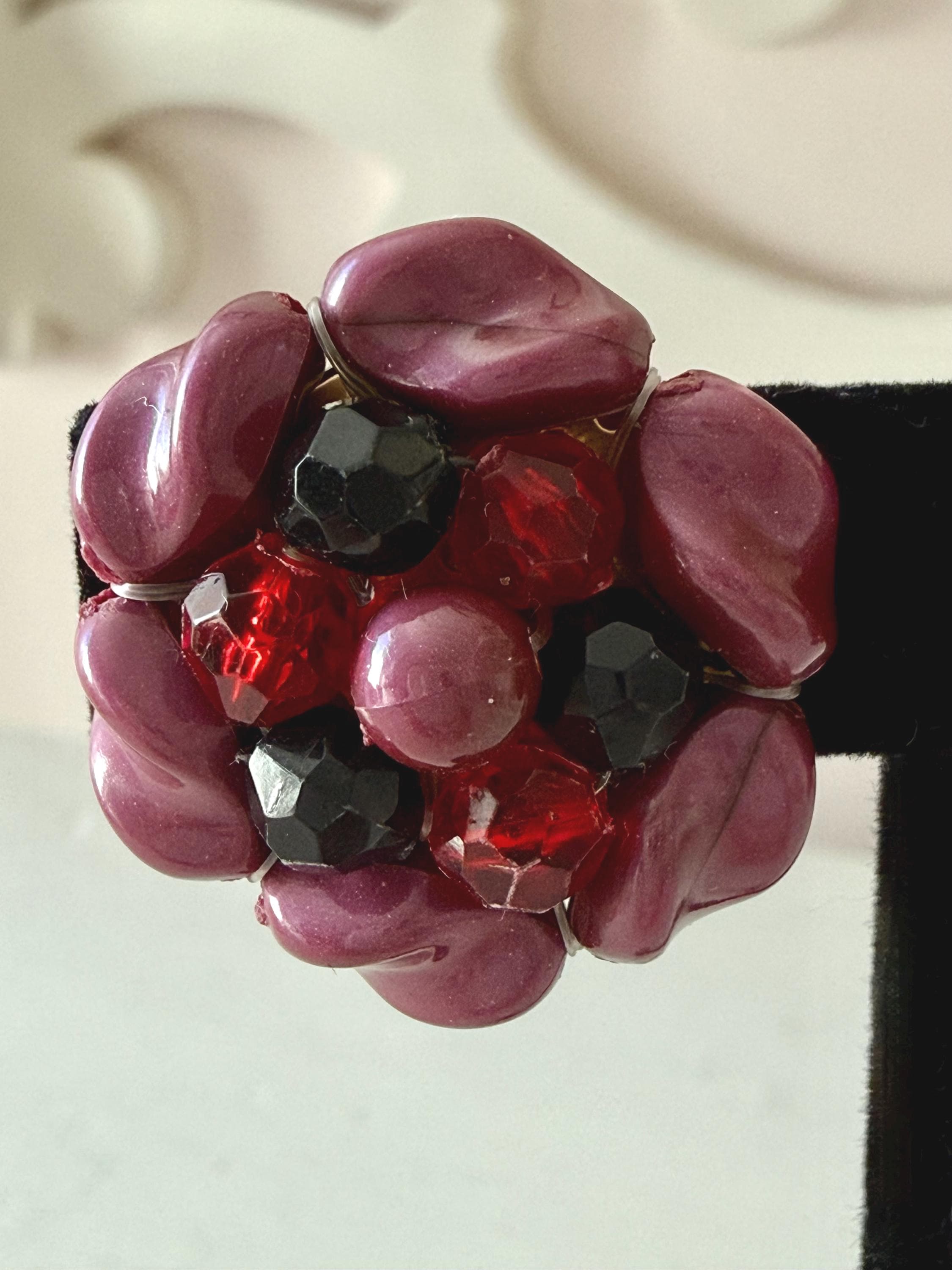 This listing is for a very pretty pair of vintage earrings from West Germany. Measuring 1" in diameter, the clip on earrings are a cluster of acrylic beads in terrific coordinating colors of purple, red, and black. All beads are intact, the clip backs are secure and comfortable, and they are in very good condition. The combination of colors is so unique and really sets these apart!